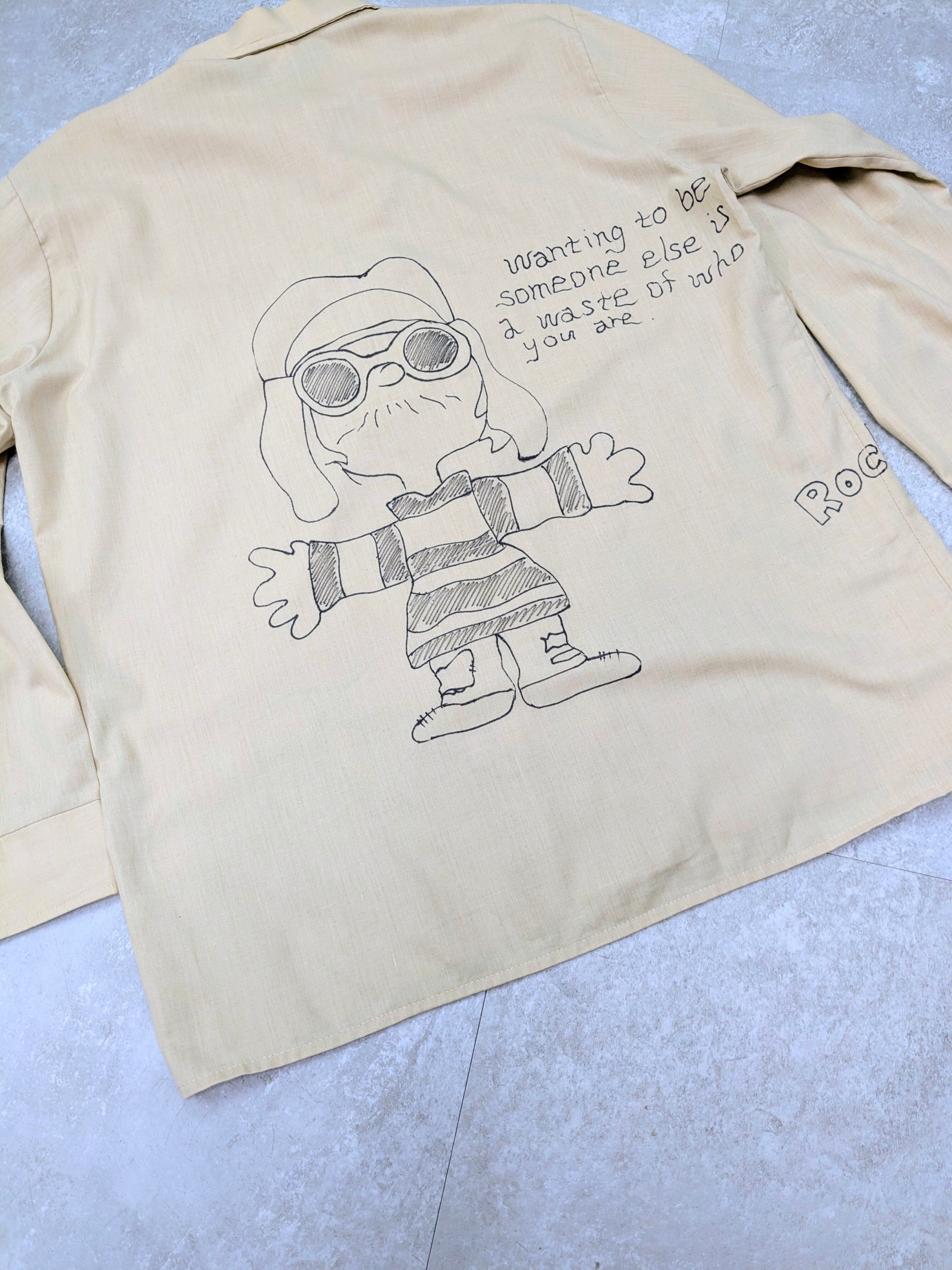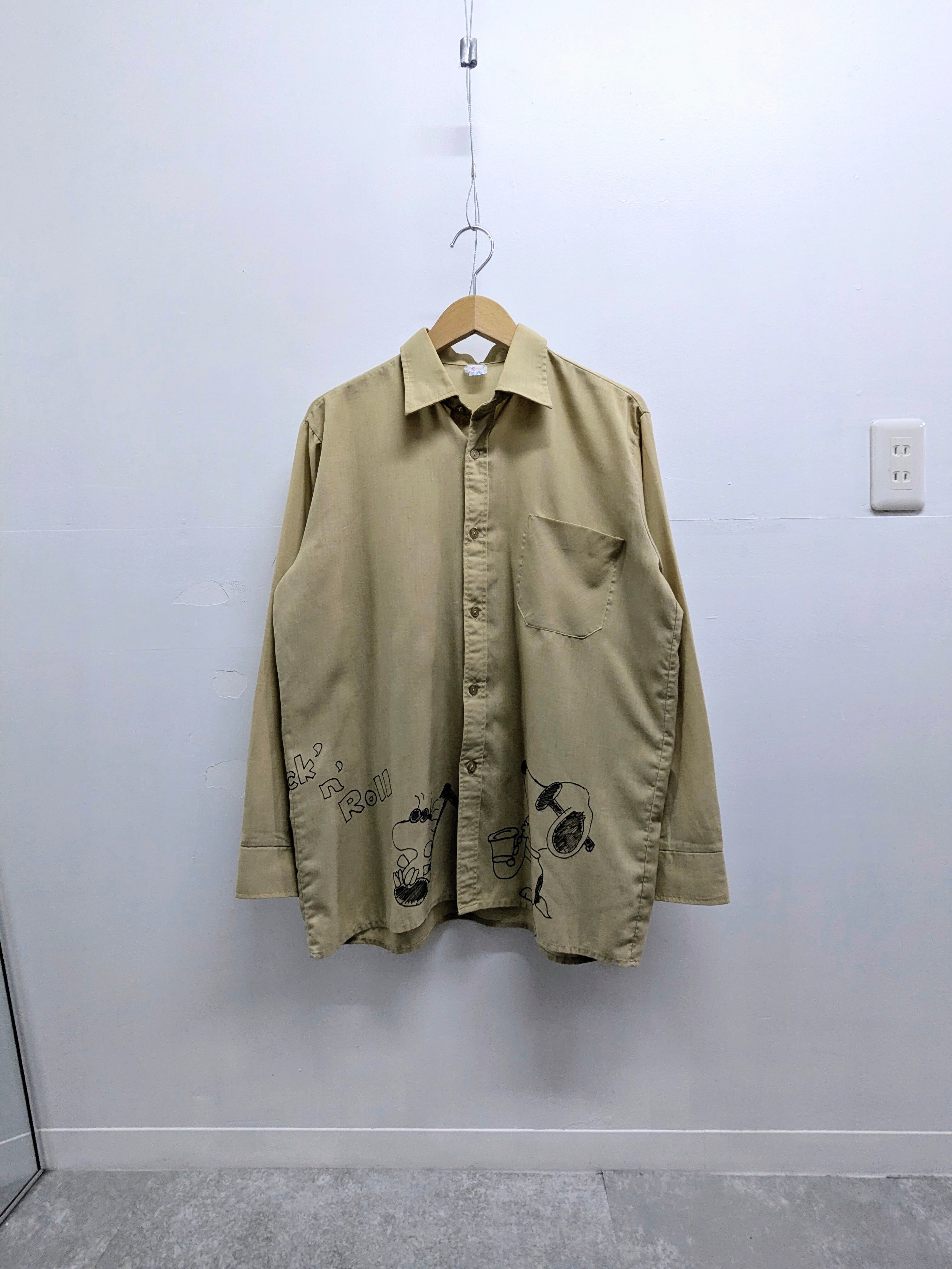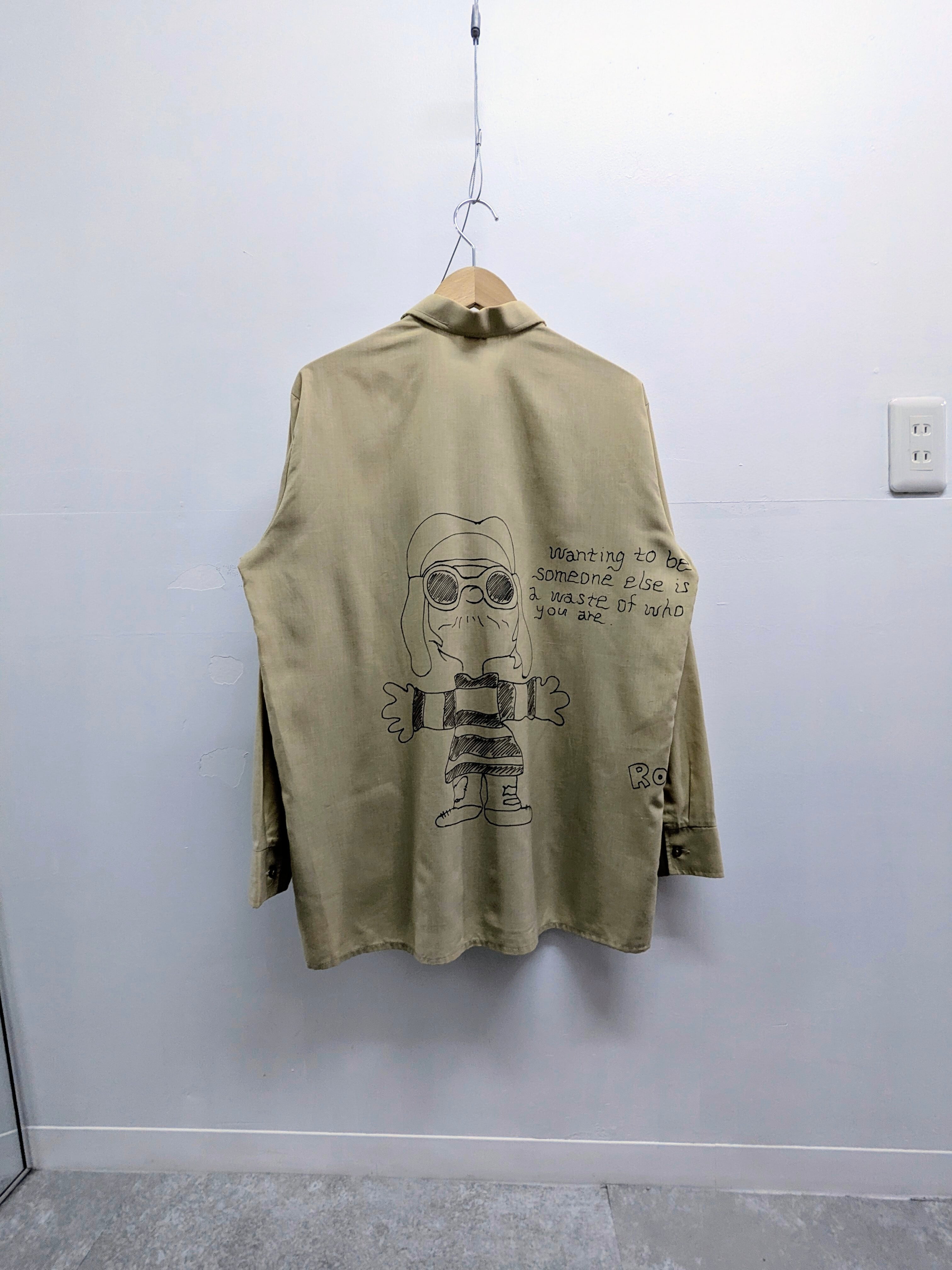 今回はユーロヴィンテージのシャツの背中に大きく、どこか見たことあるようなミュージシャンがイラストされています。全て手描きなので、一点物となります。キズあり。