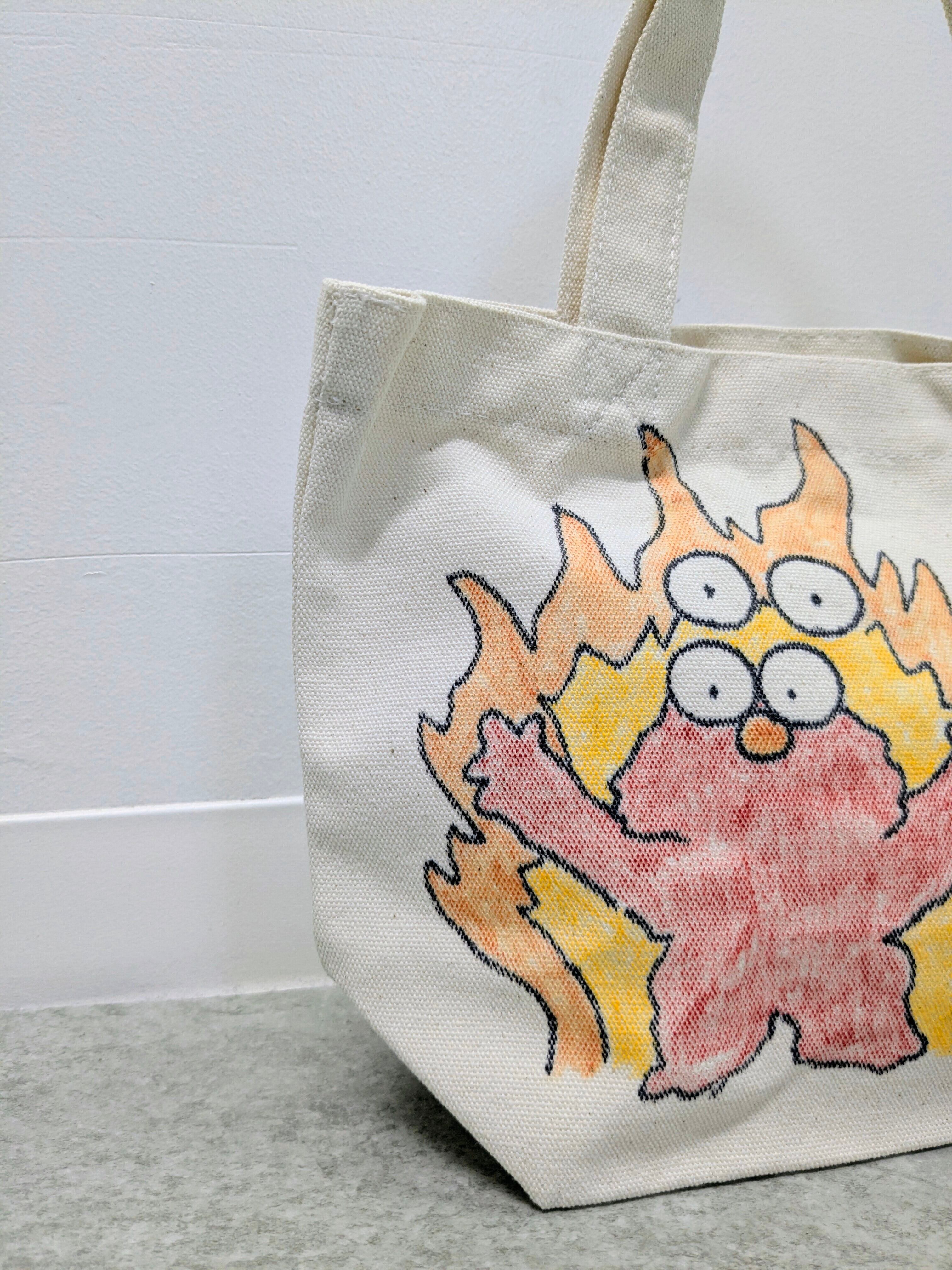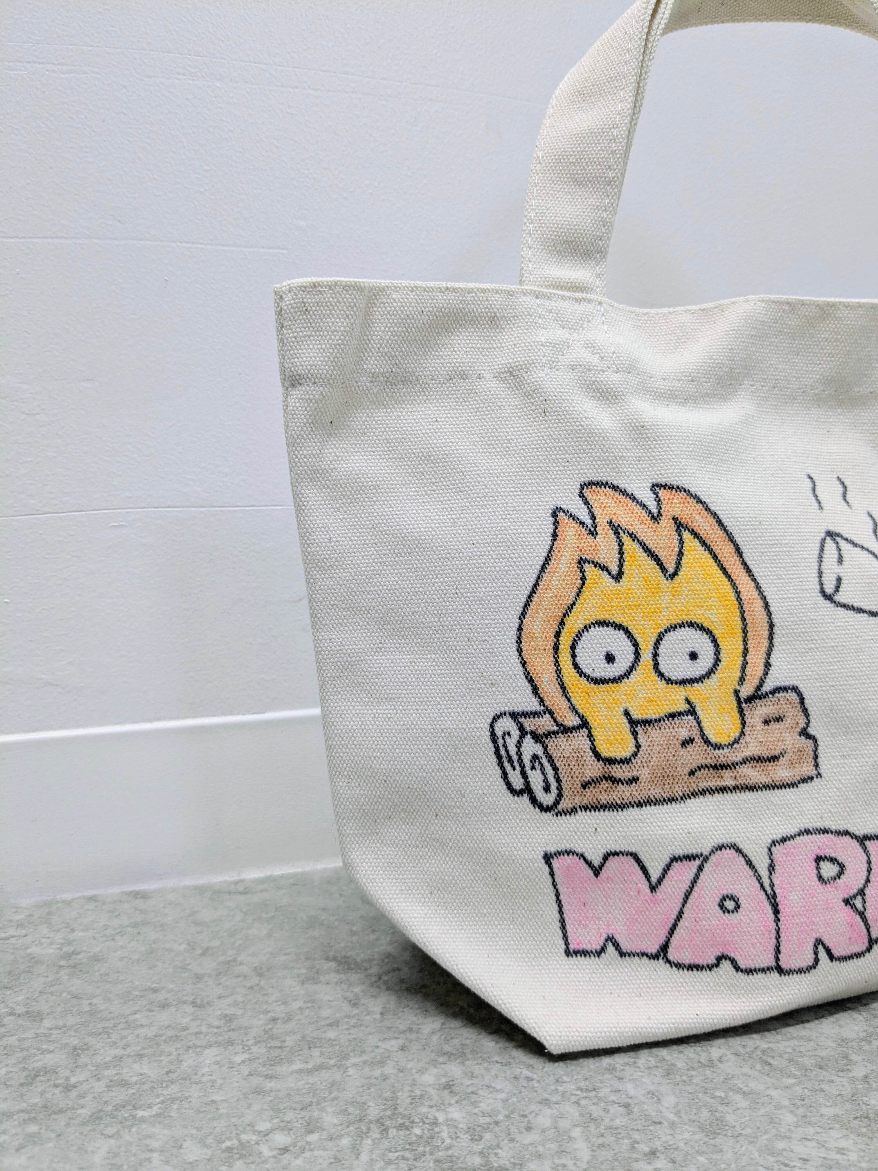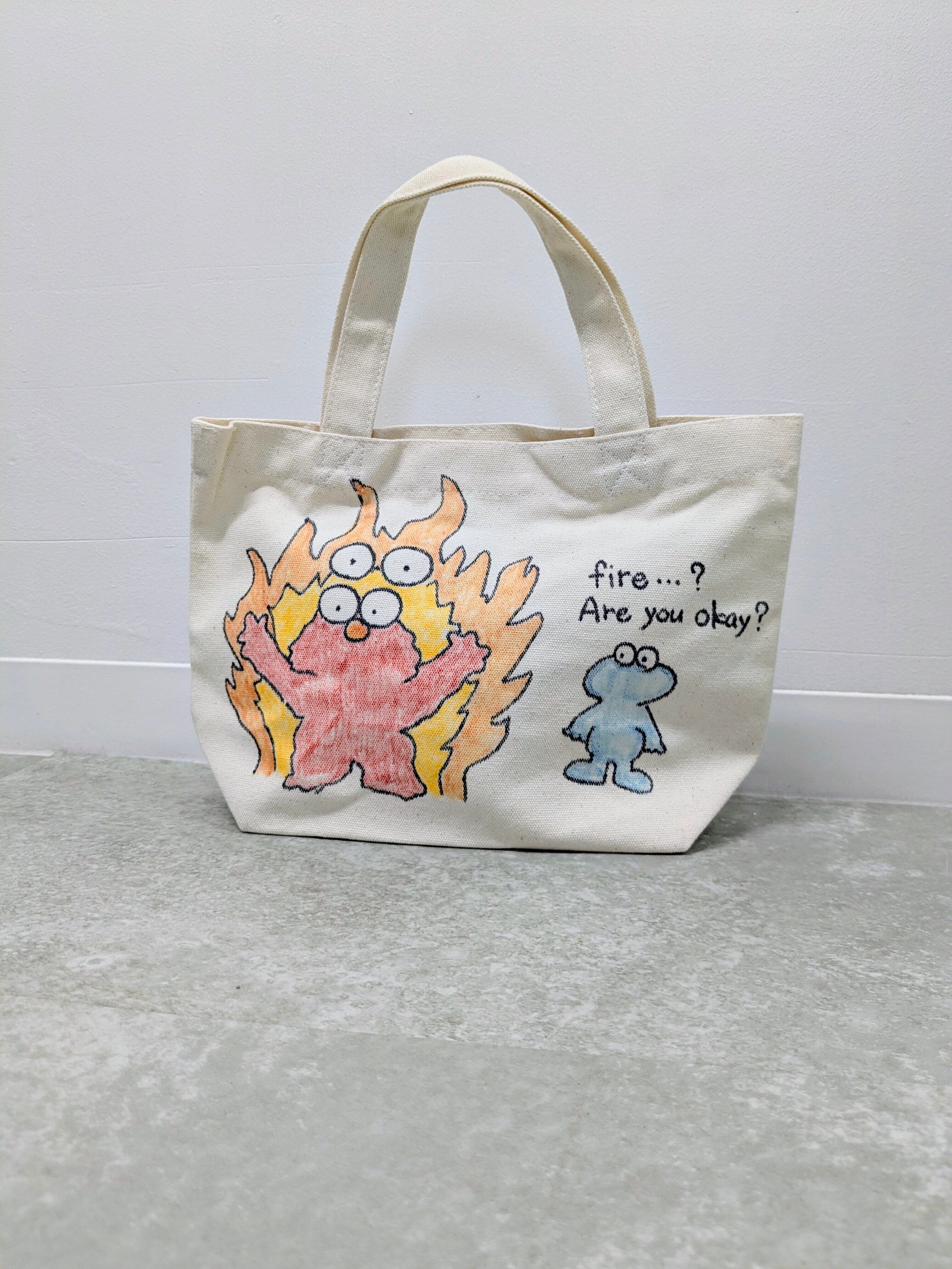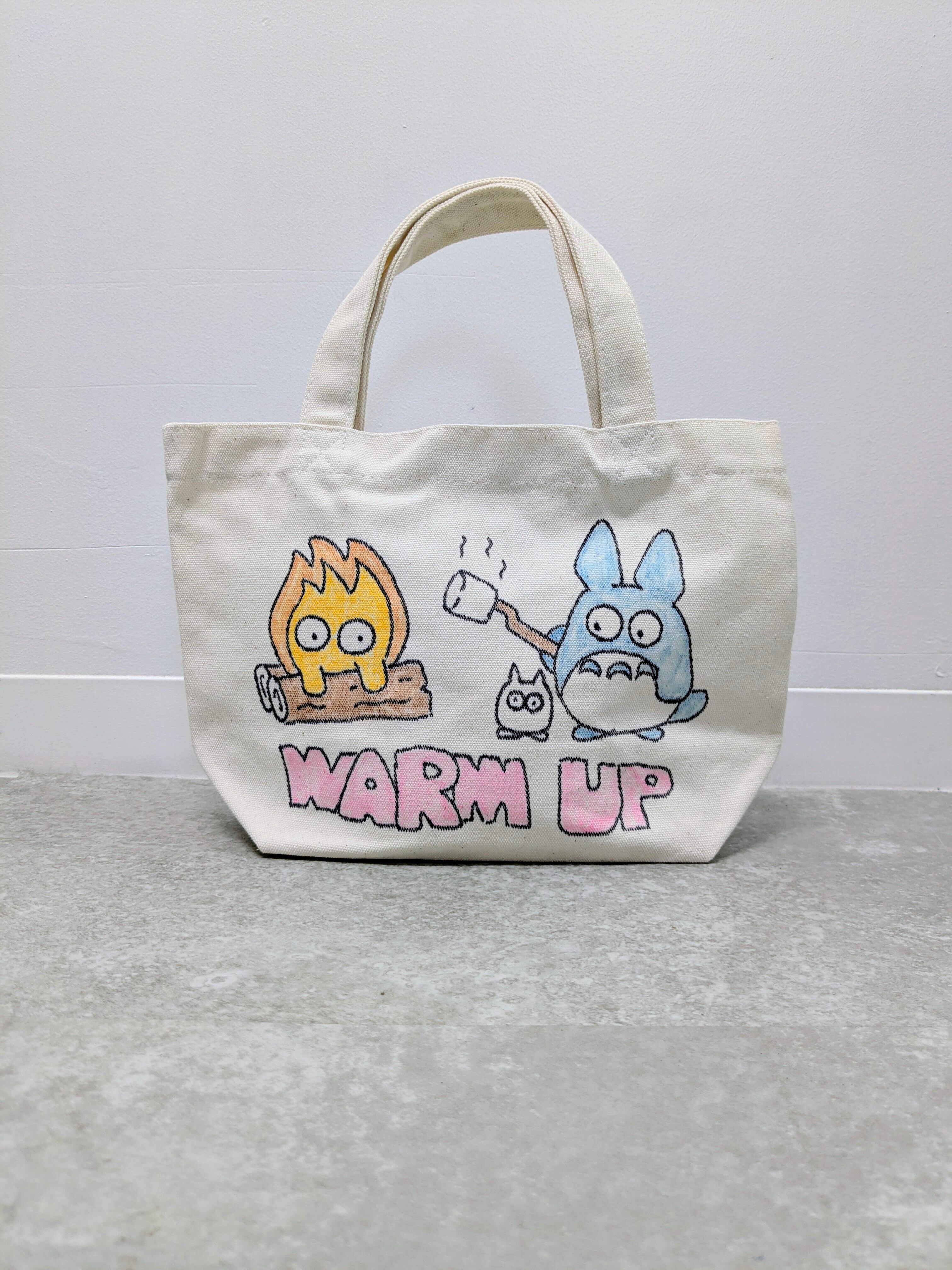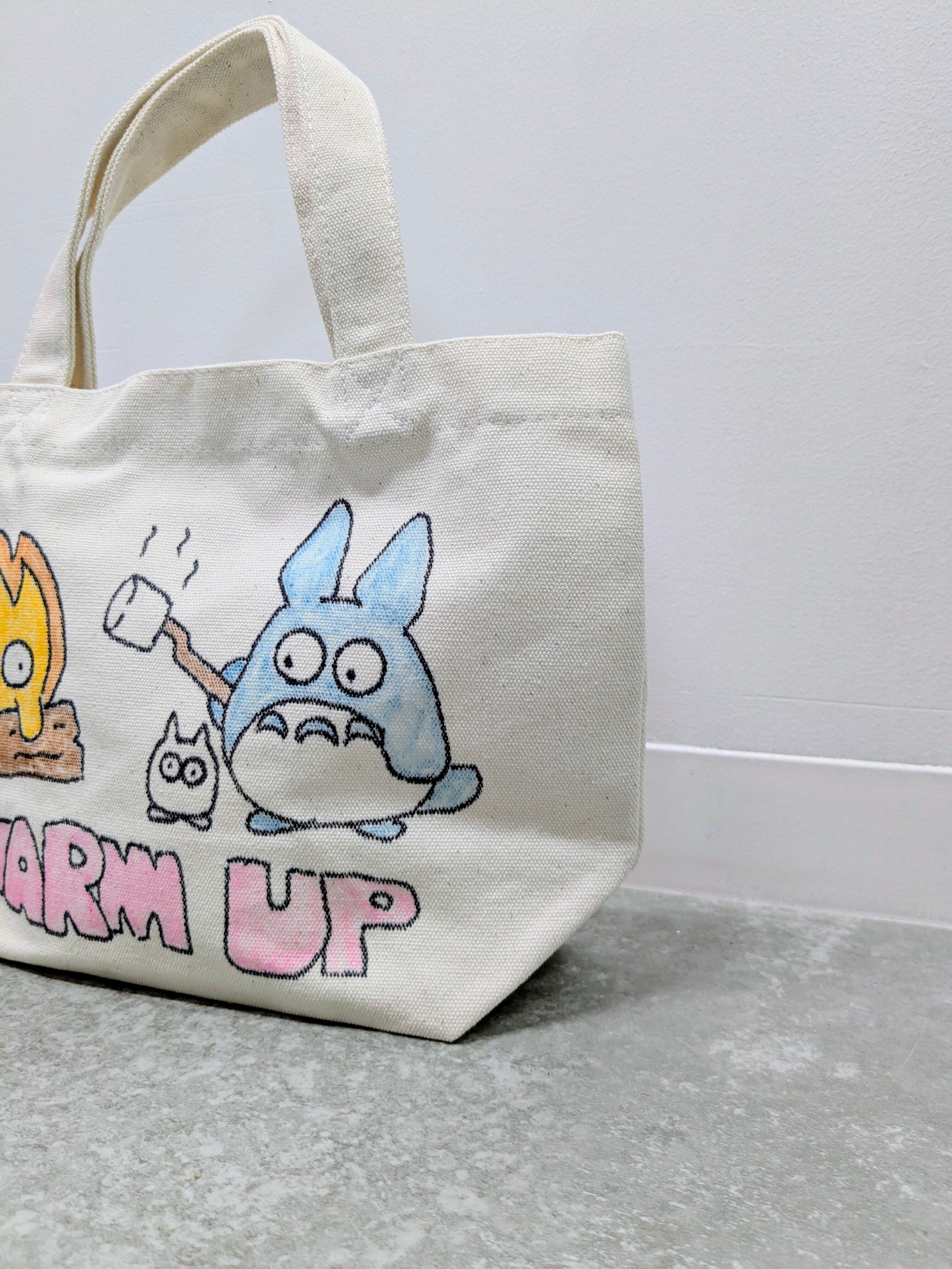 キャンバスのトートバッグにイラストを加えています。メモリアルの要素があり、どこか見たことあるキャラクターがいたりと、とにかく可愛いアイテム。全て手作業になるので、唯一無二の一点物となります。