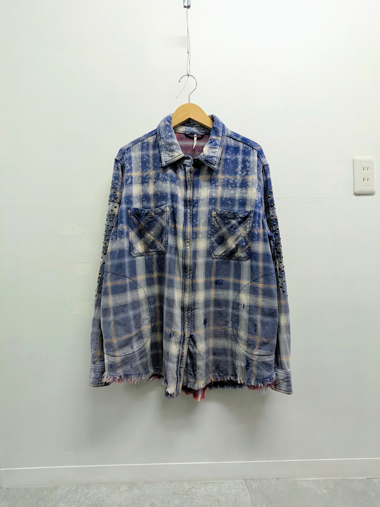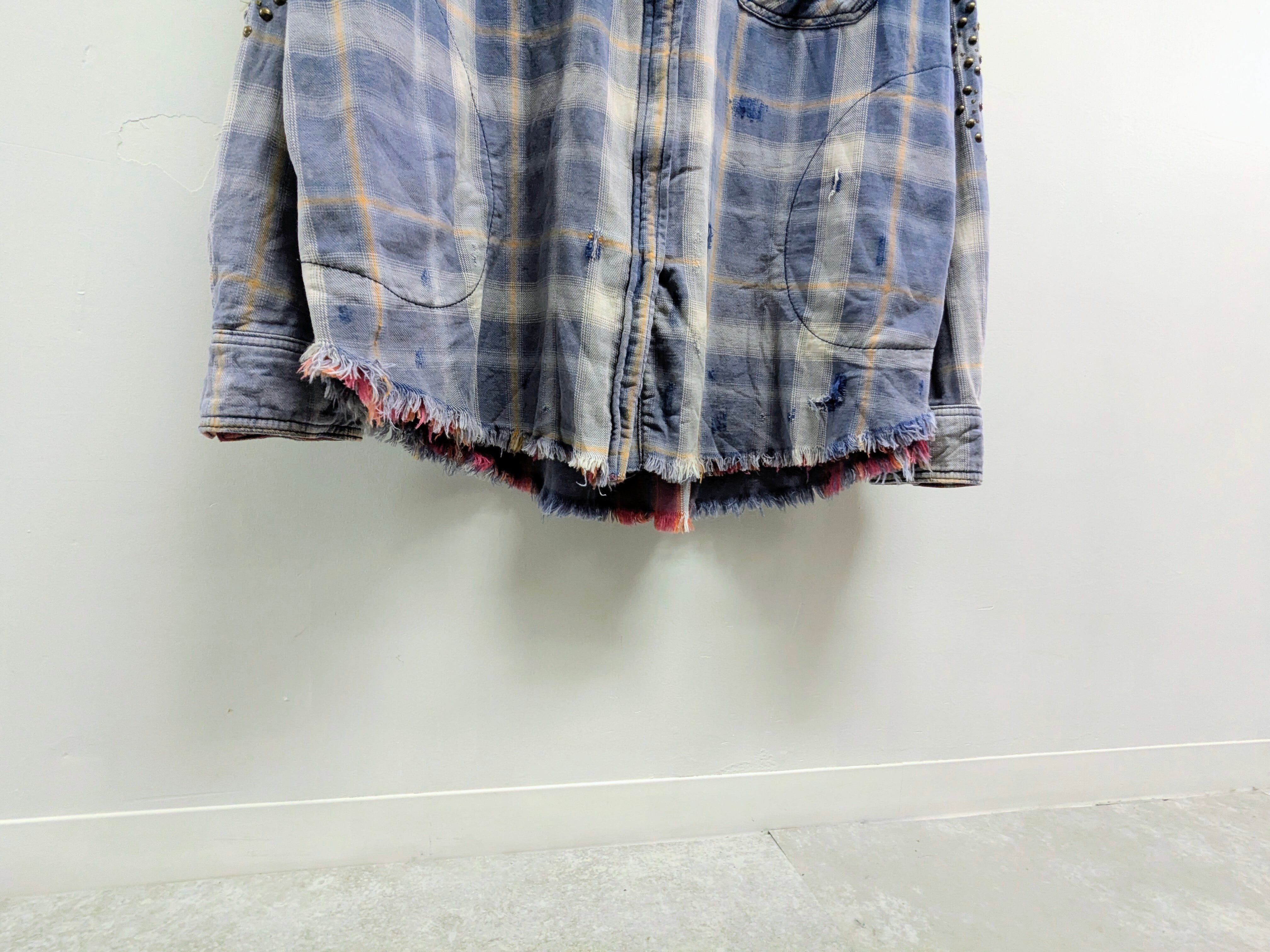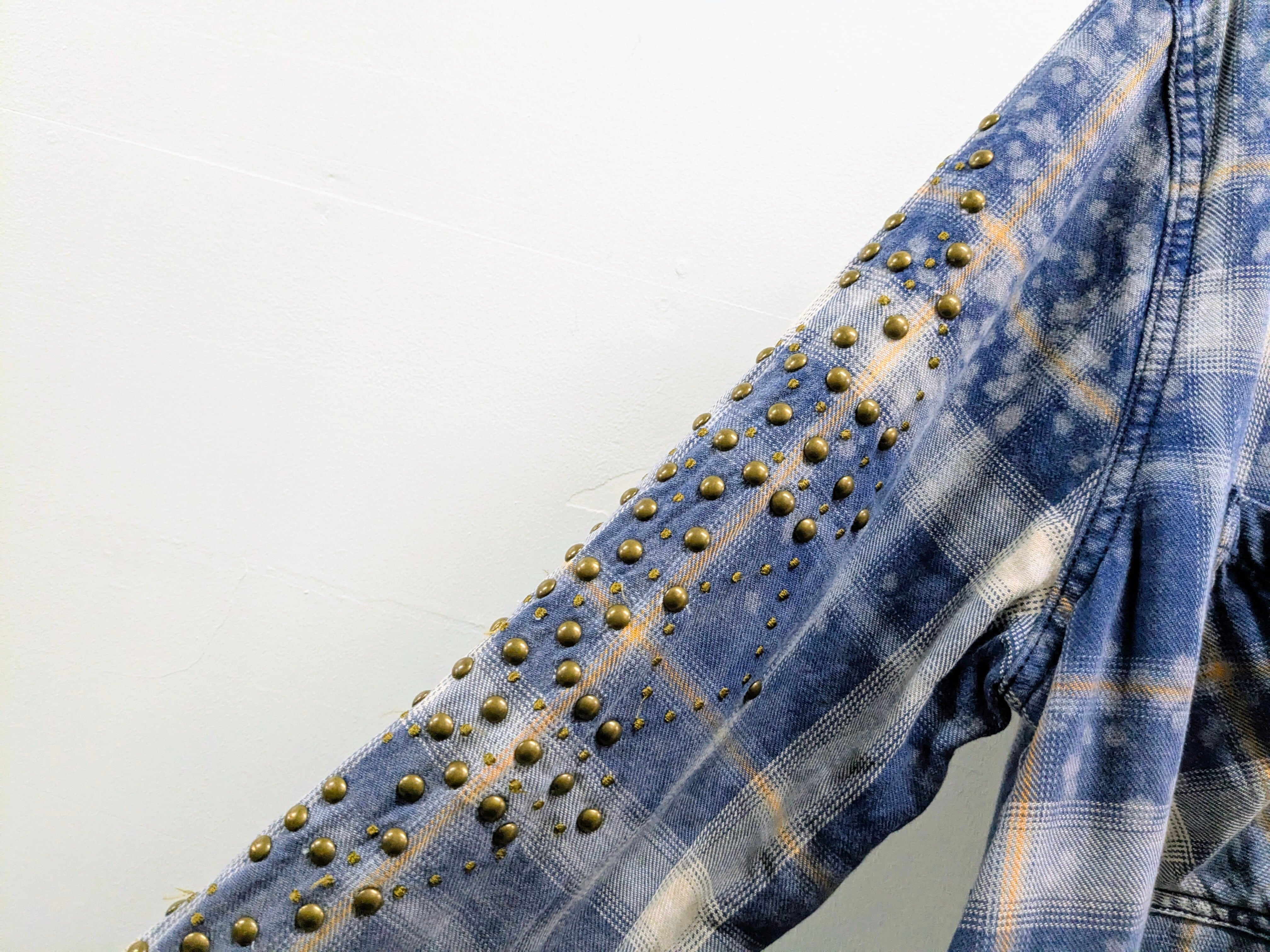 全体的にフェードしたデザイン、ダメージ、腕にはスタッズが付いていたりなどデザインのバランスがとてもいい一着。ダブルフェイスなので、裏地の赤が袖をまくった時、裾のフリンジ部分からチラっと覗くのもカッコいいです。
