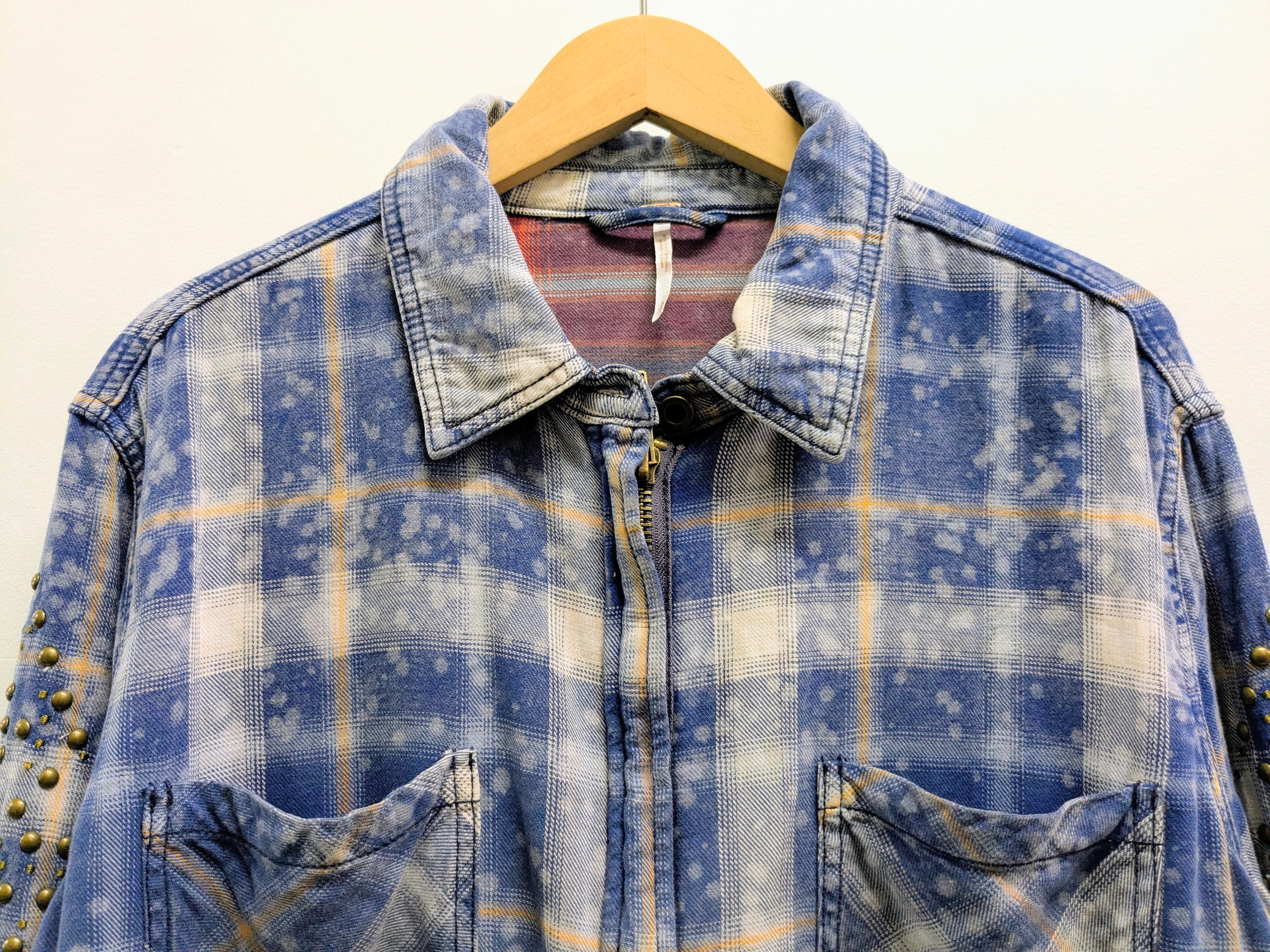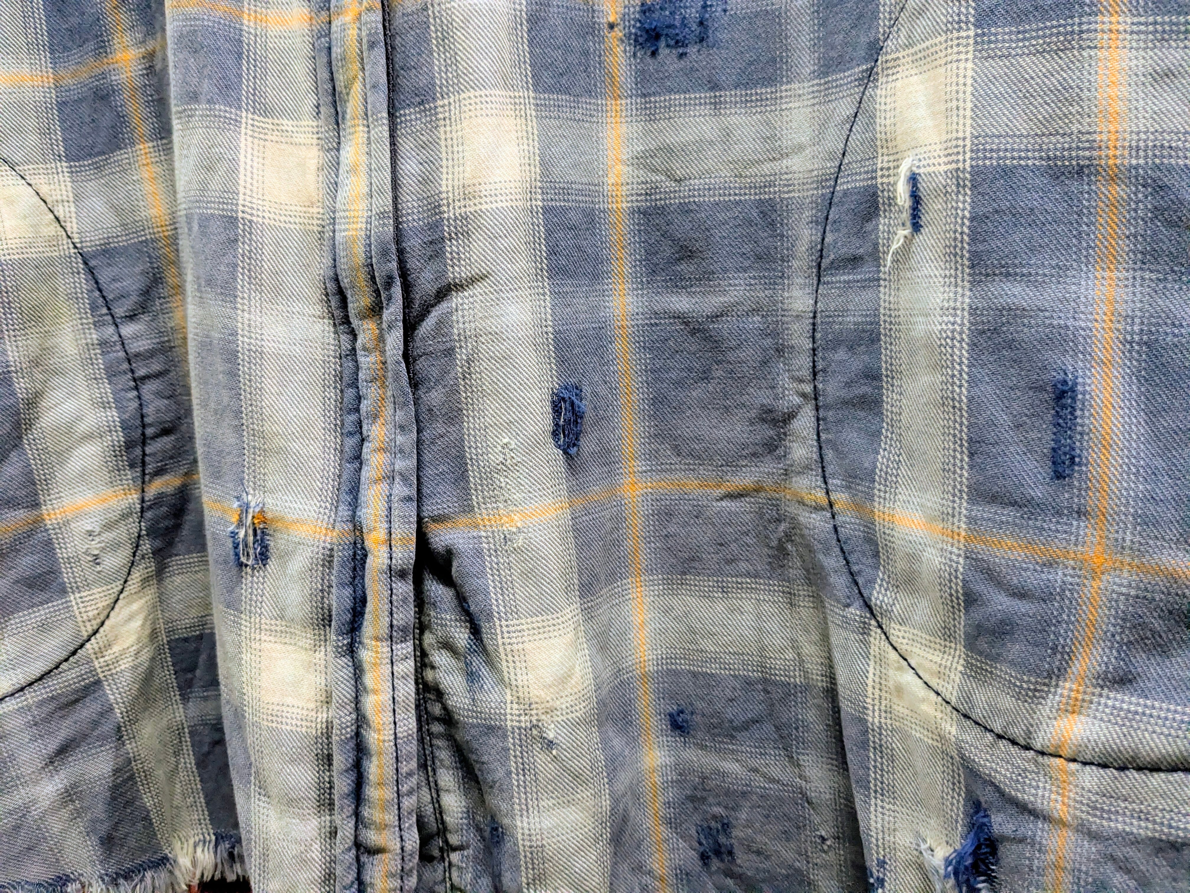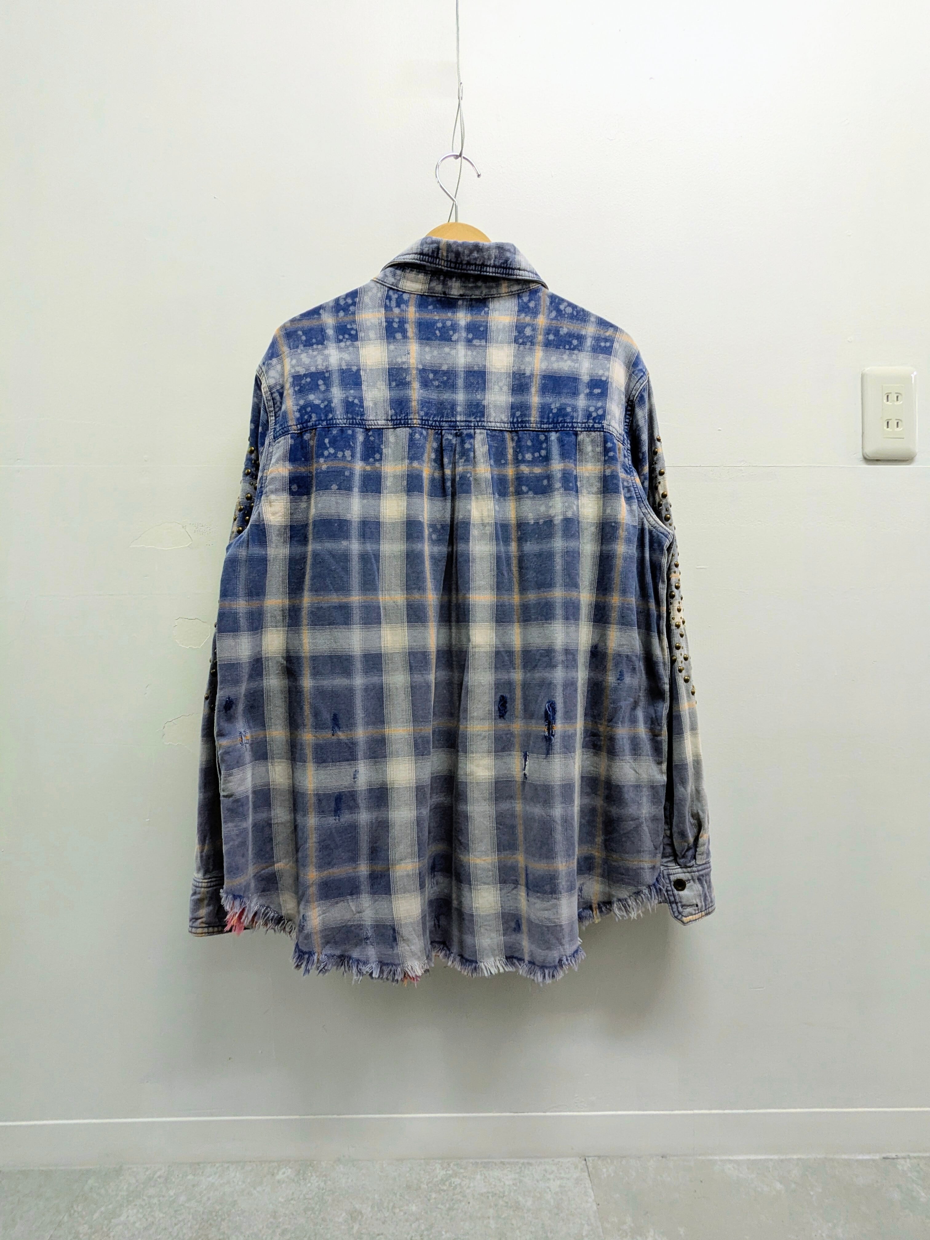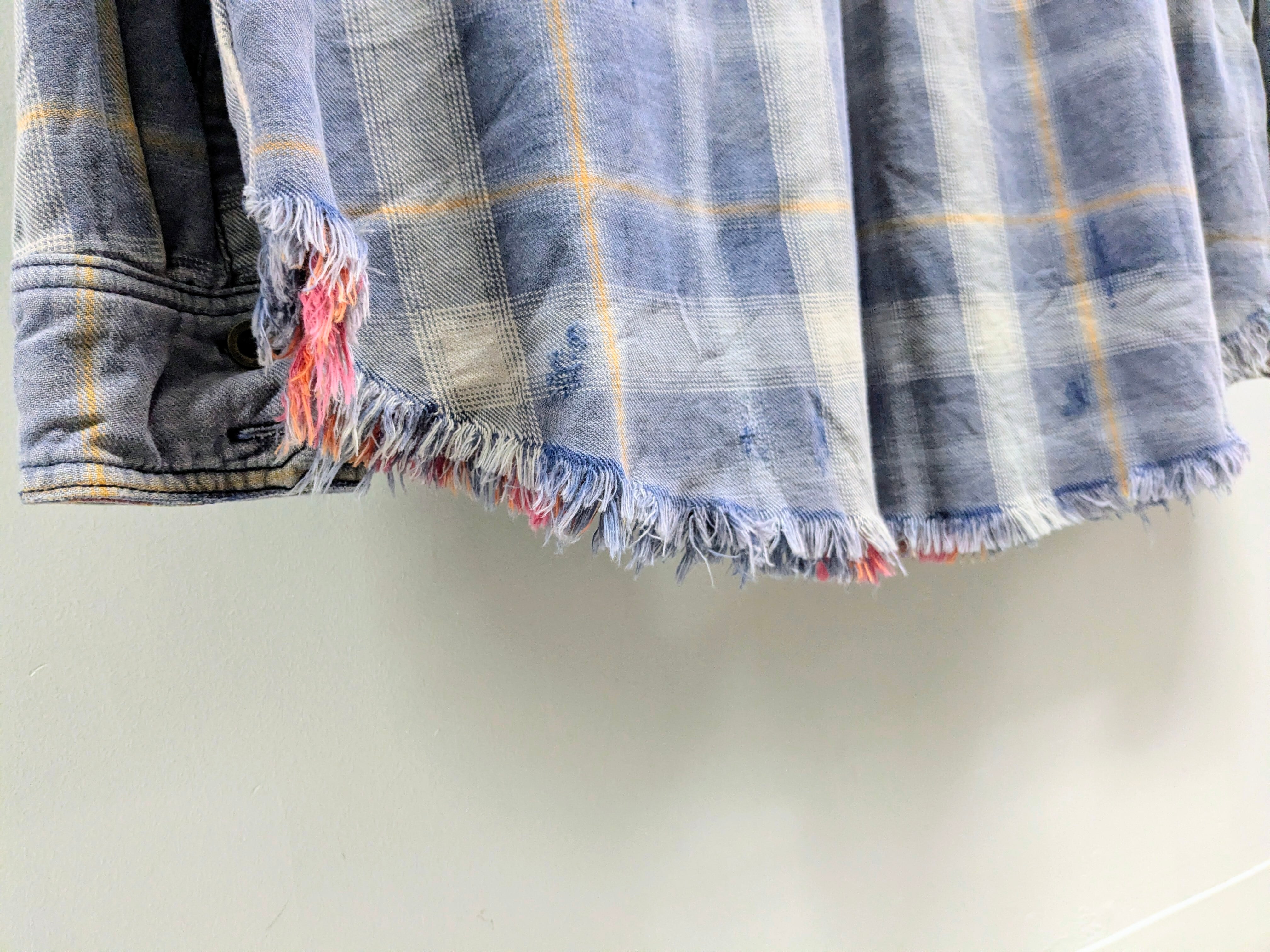 全体的にフェードしたデザイン、ダメージ、腕にはスタッズが付いていたりなどデザインのバランスがとてもいい一着。ダブルフェイスなので、裏地の赤が袖をまくった時、裾のフリンジ部分からチラっと覗くのもカッコいいです。