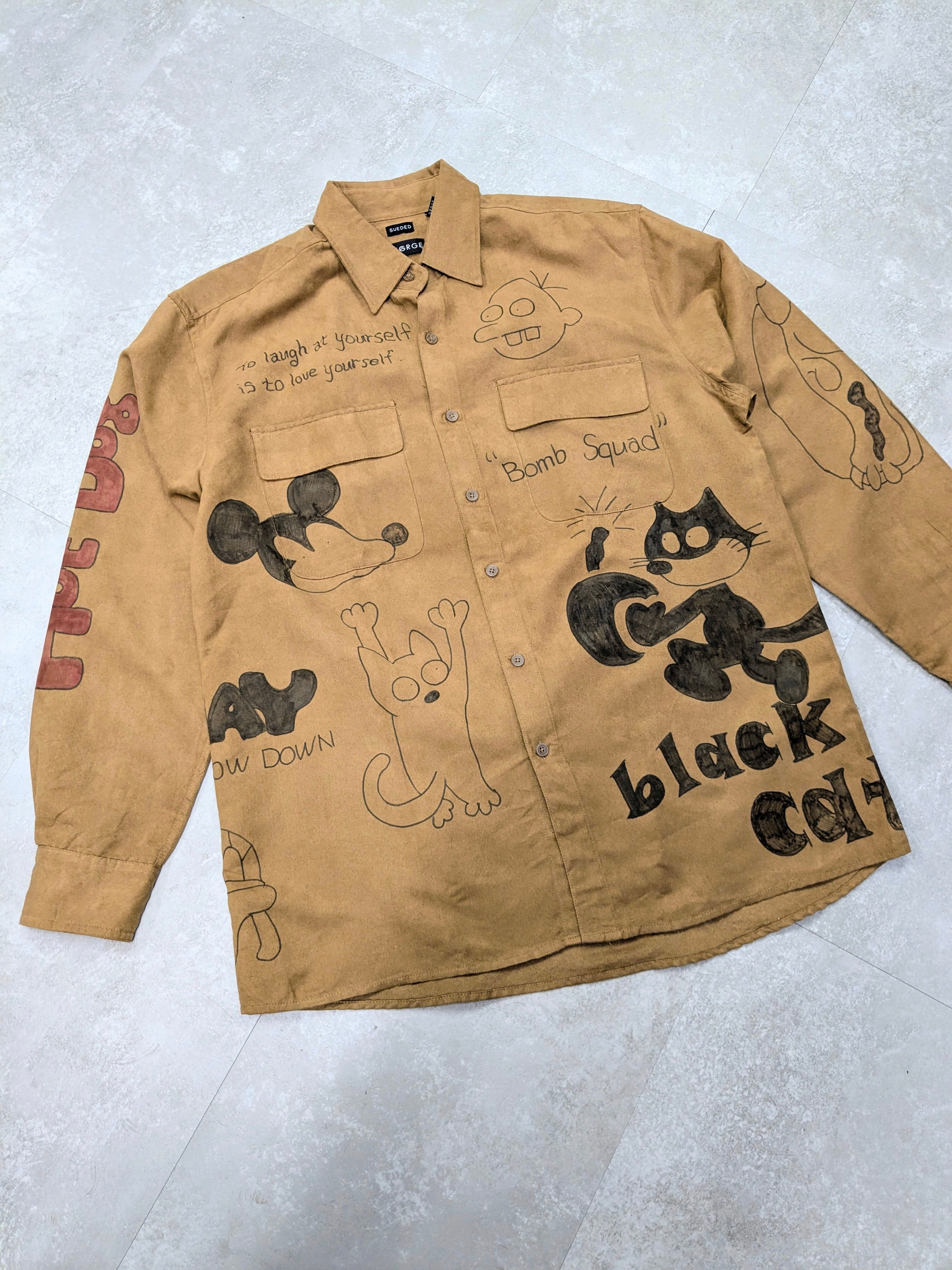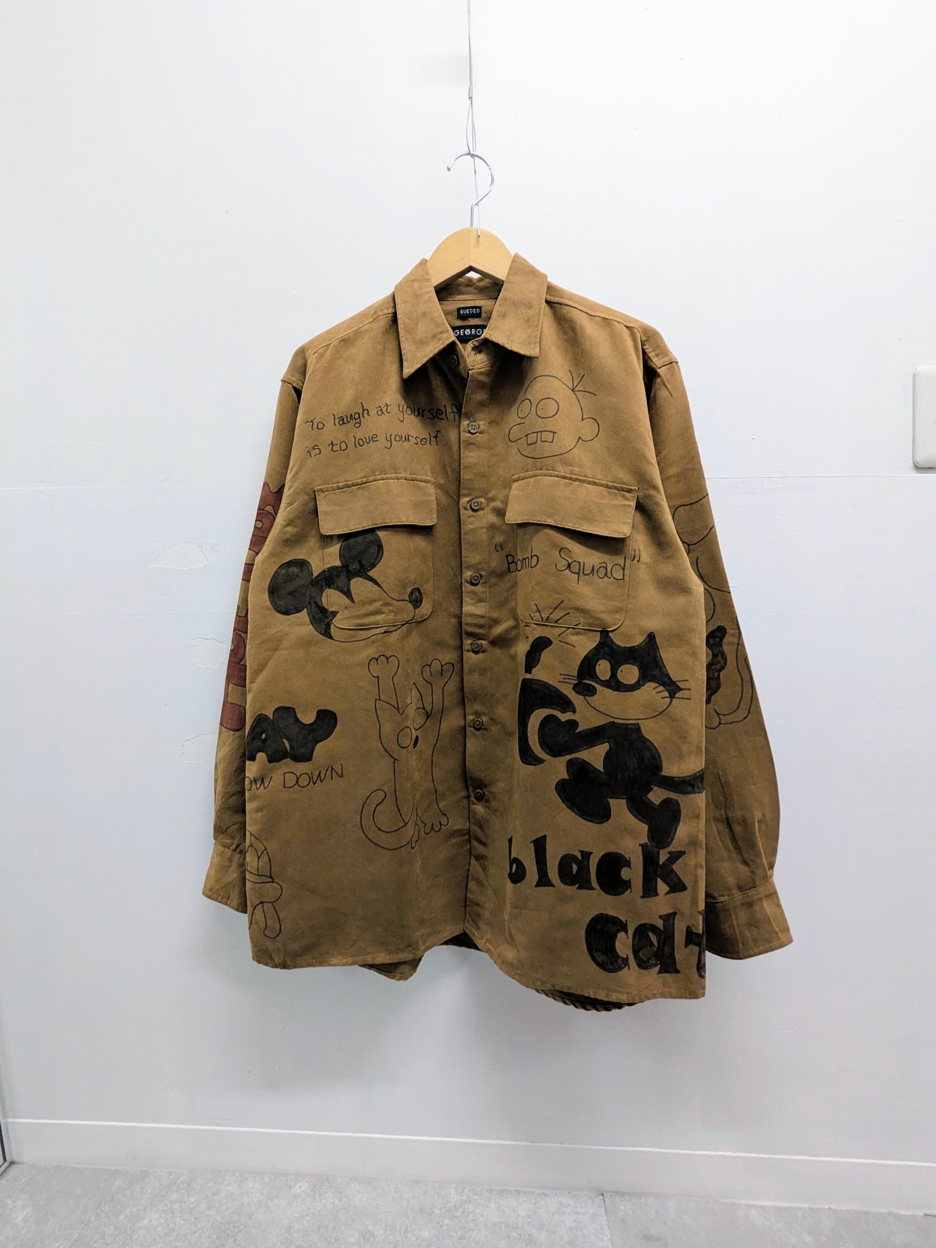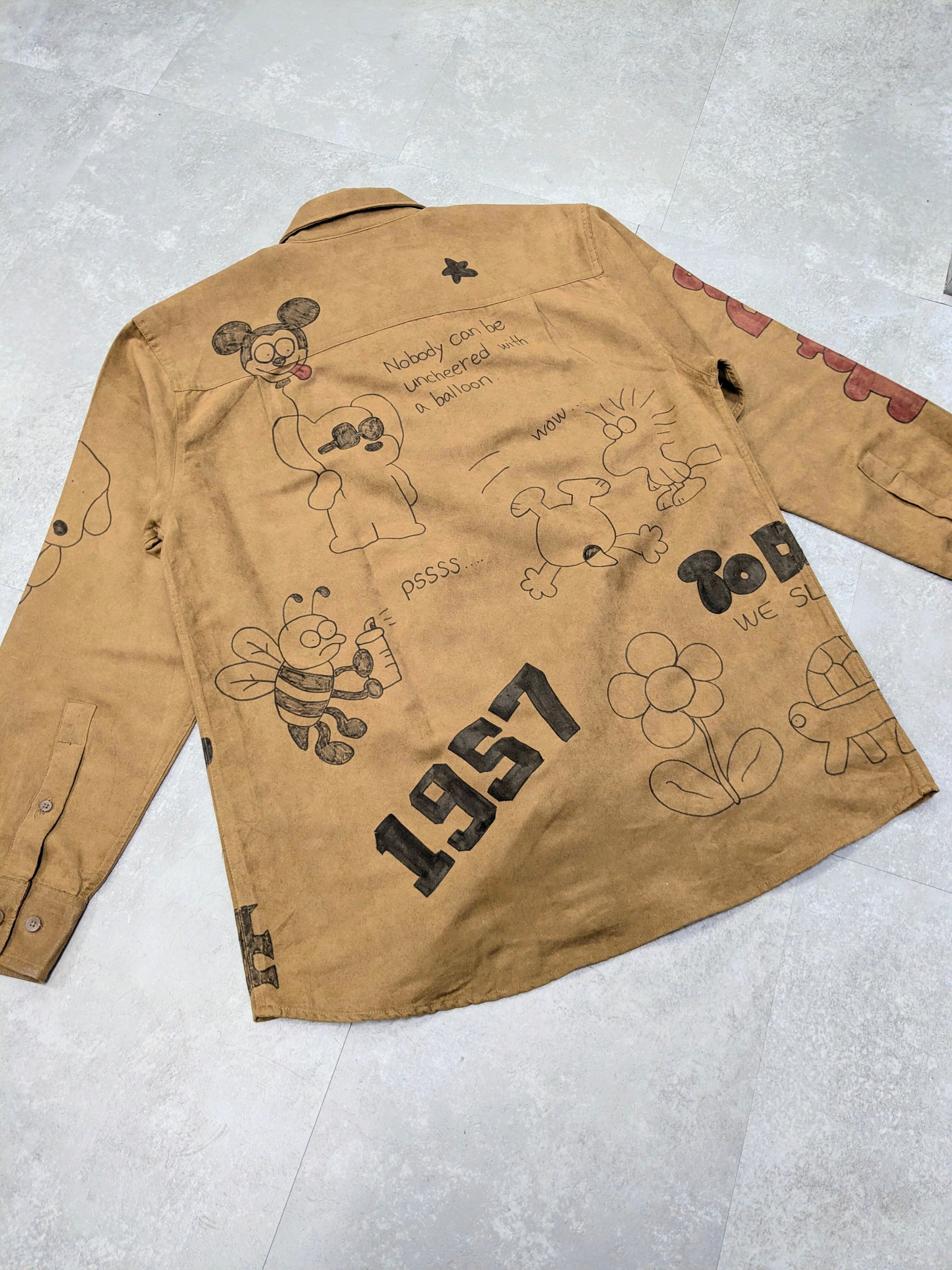 フェイクスウェードのシャツにイラストを加えています。メモリアルの要素もありつつ、どこか見たことあるようなキャラクターがいたりと可愛い一着。全て手描きのため唯一無二の一点物となっております。