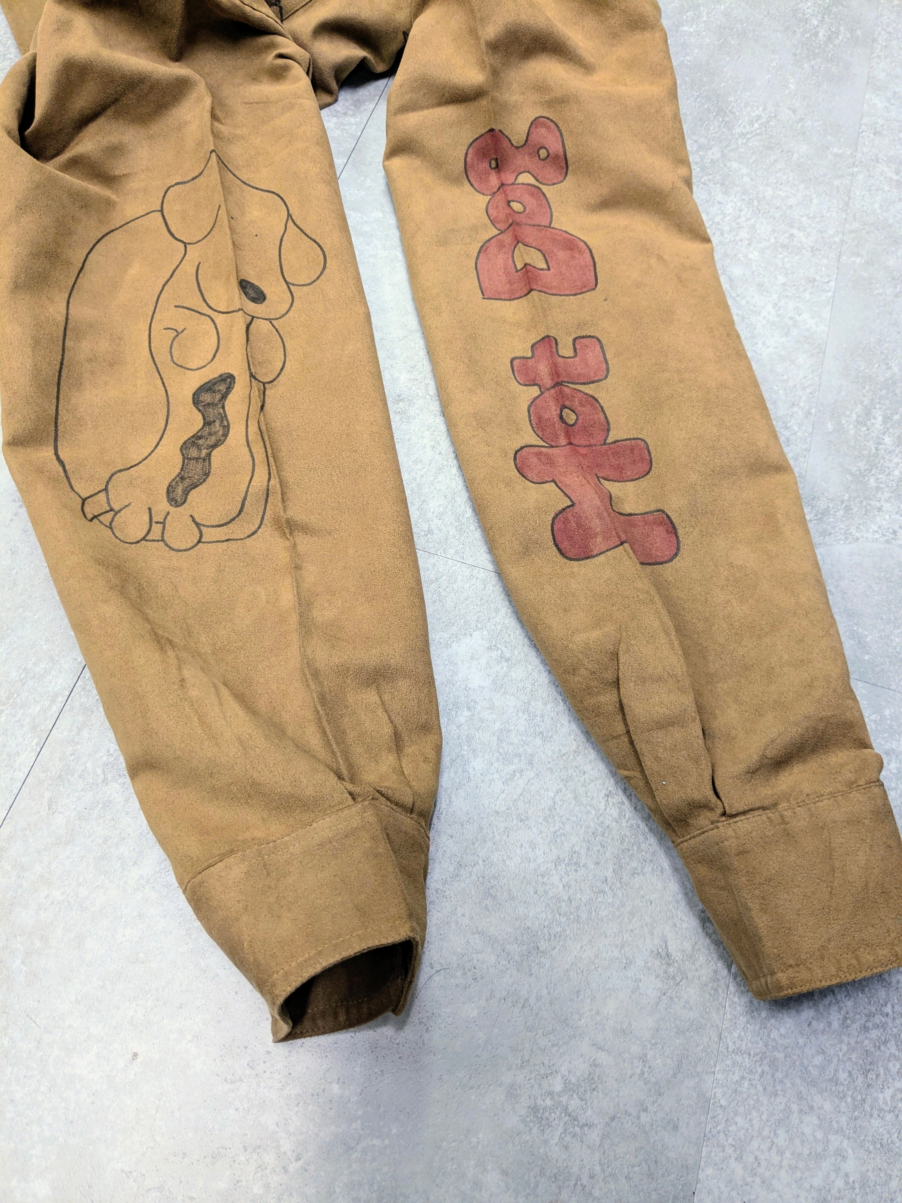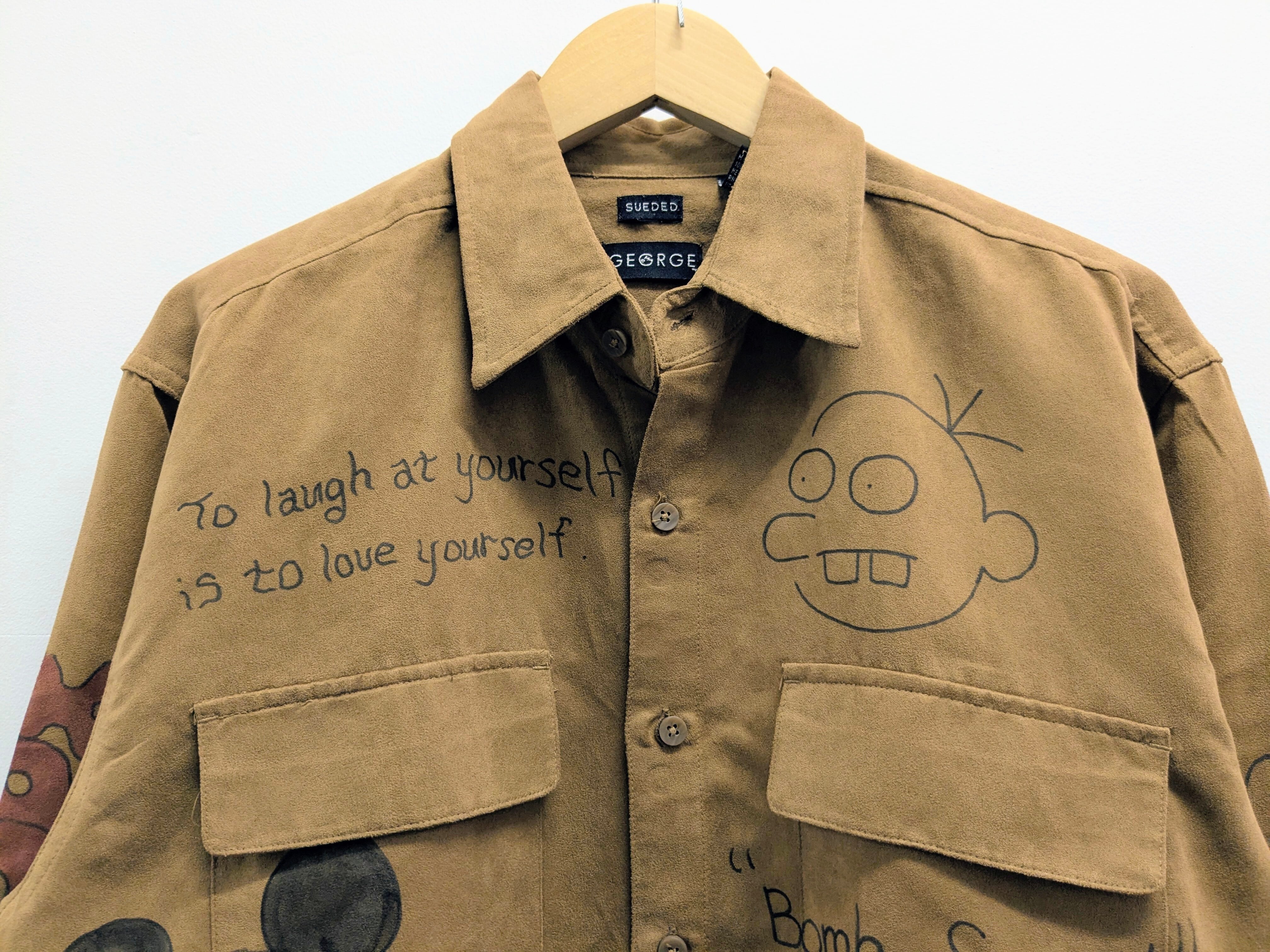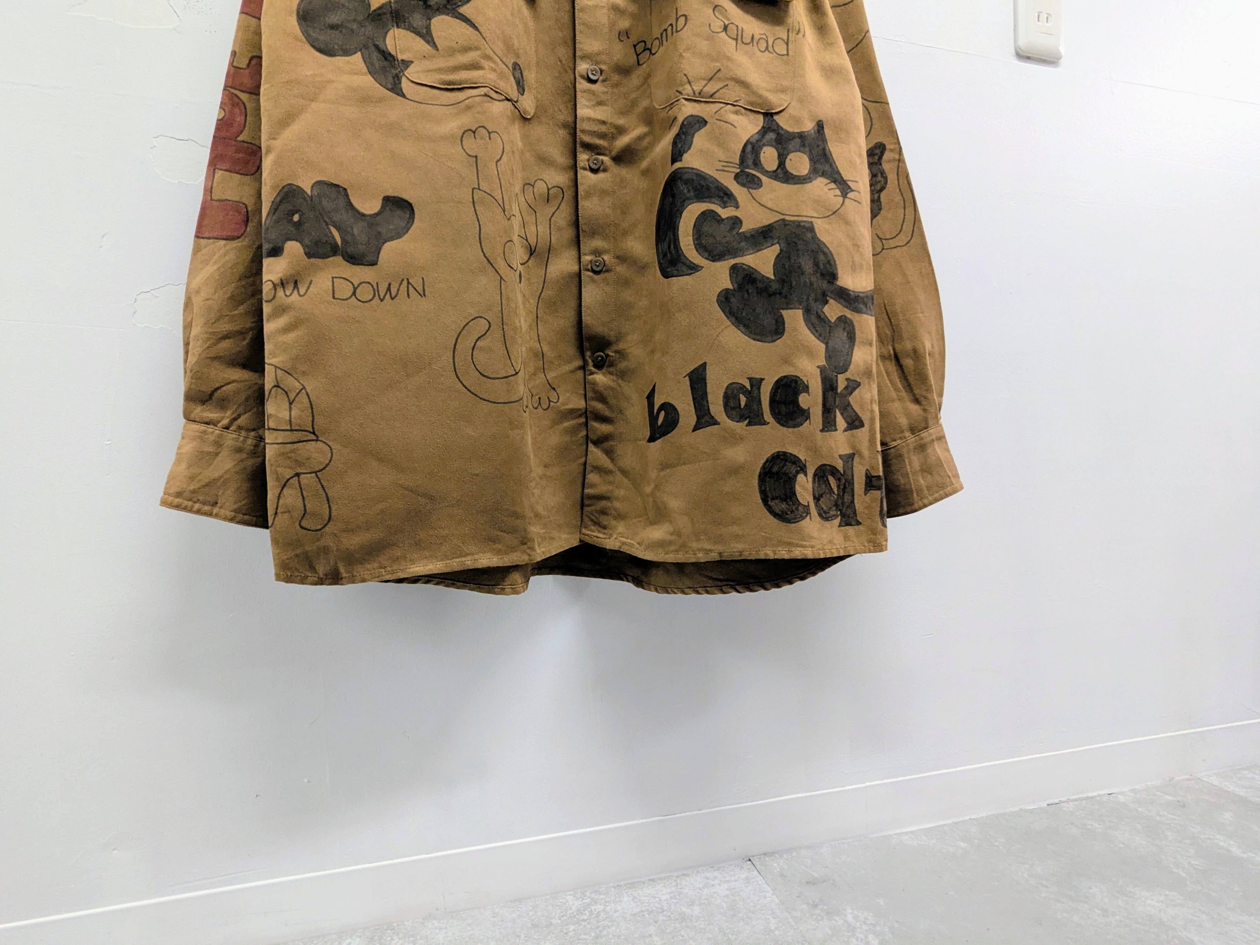 フェイクスウェードのシャツにイラストを加えています。メモリアルの要素もありつつ、どこか見たことあるようなキャラクターがいたりと可愛い一着。全て手描きのため唯一無二の一点物となっております。