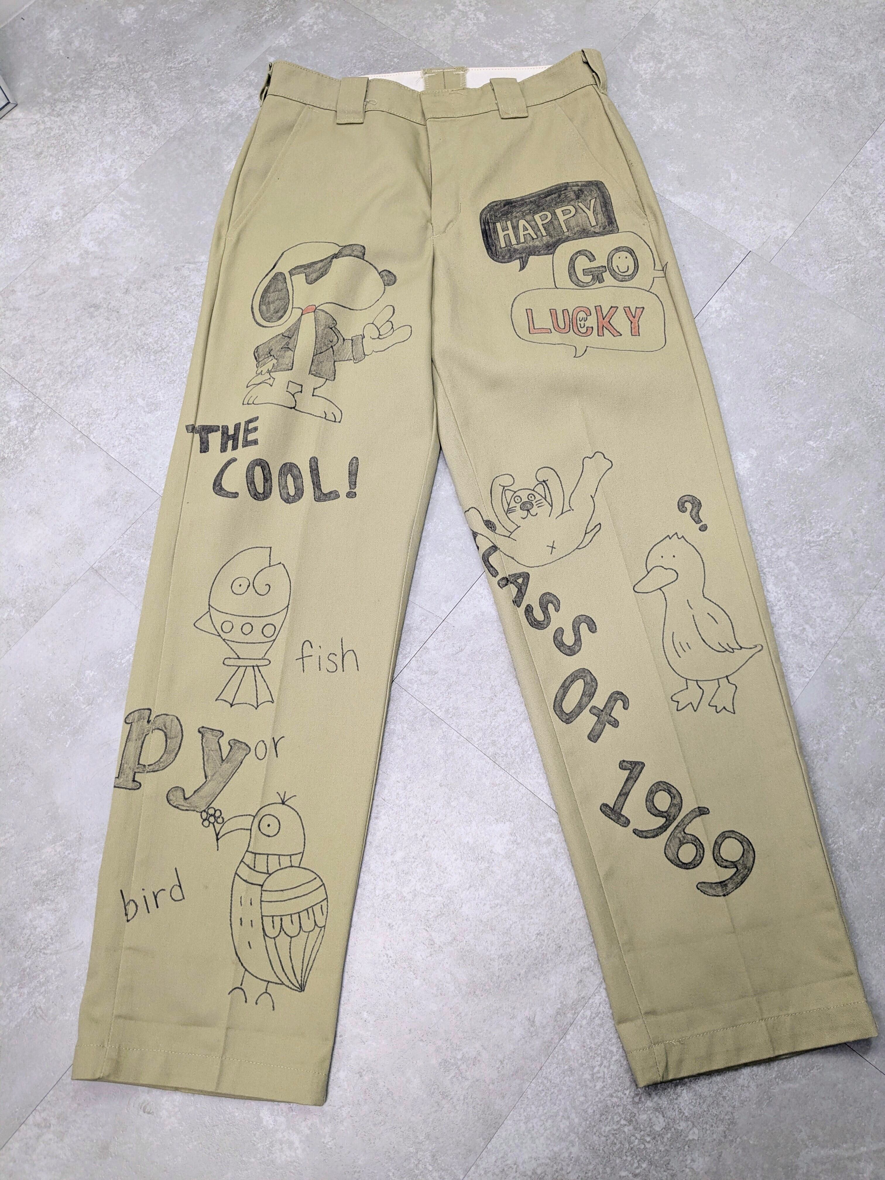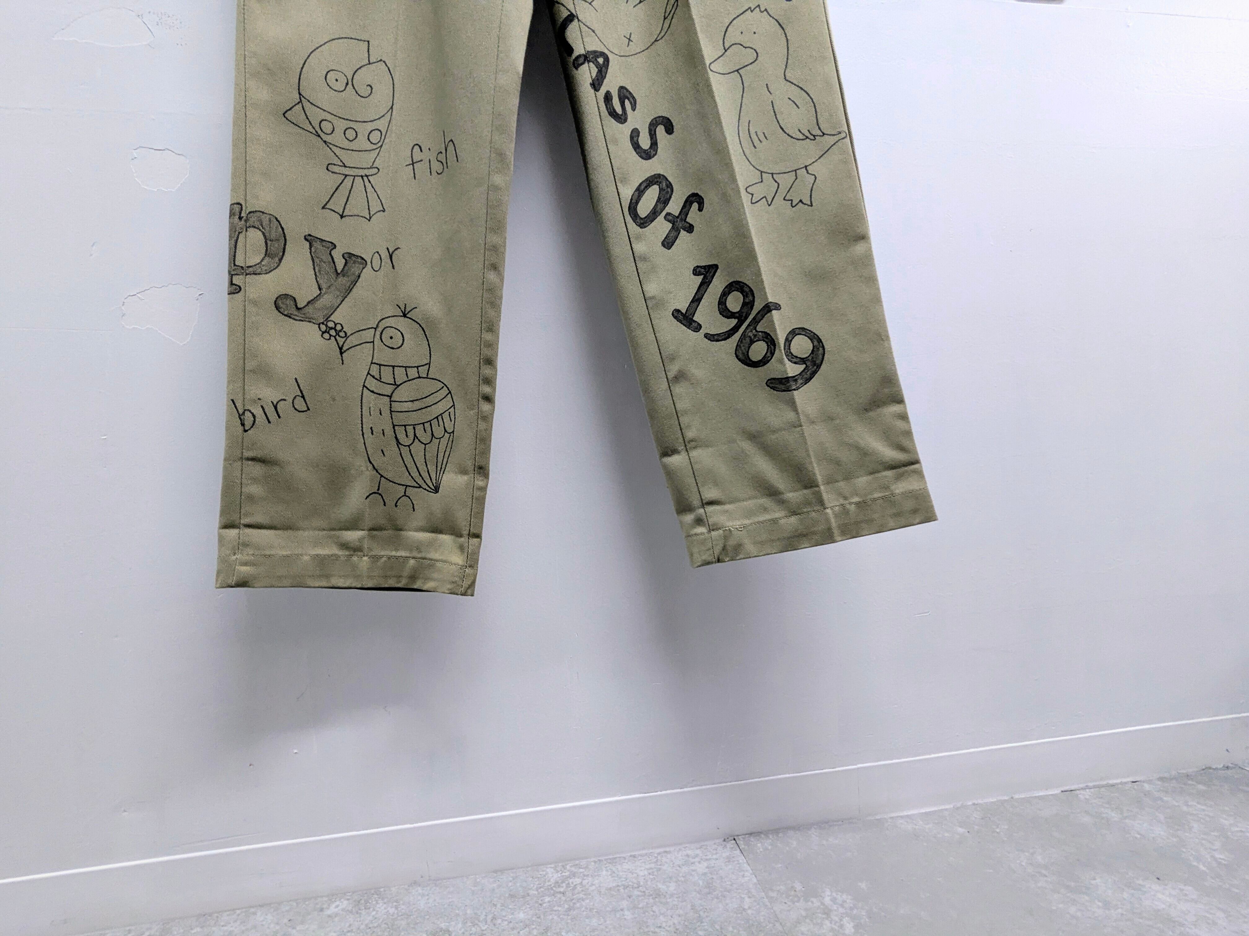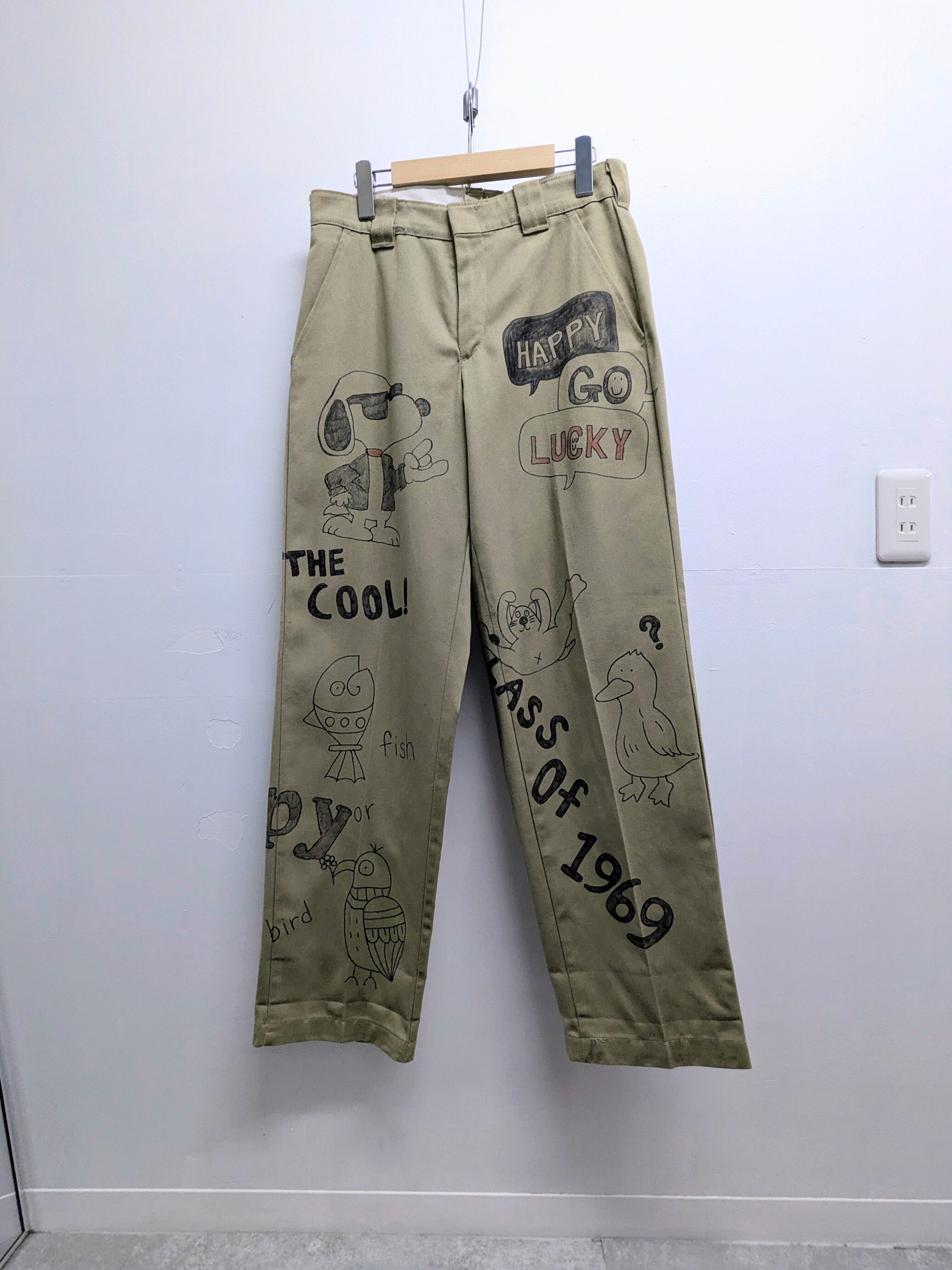Red Capのボディにイラストを加えています。メモリアルパンツをベースに、どこか見たことあるようなキャラクターがいたりととにかく可愛いアイテム。ルーズなシルエットがちょうどいい。唯一無二の一点物となります。