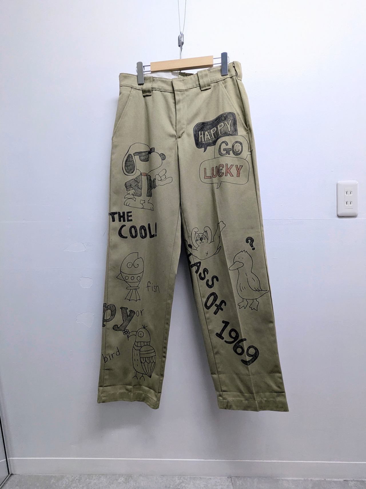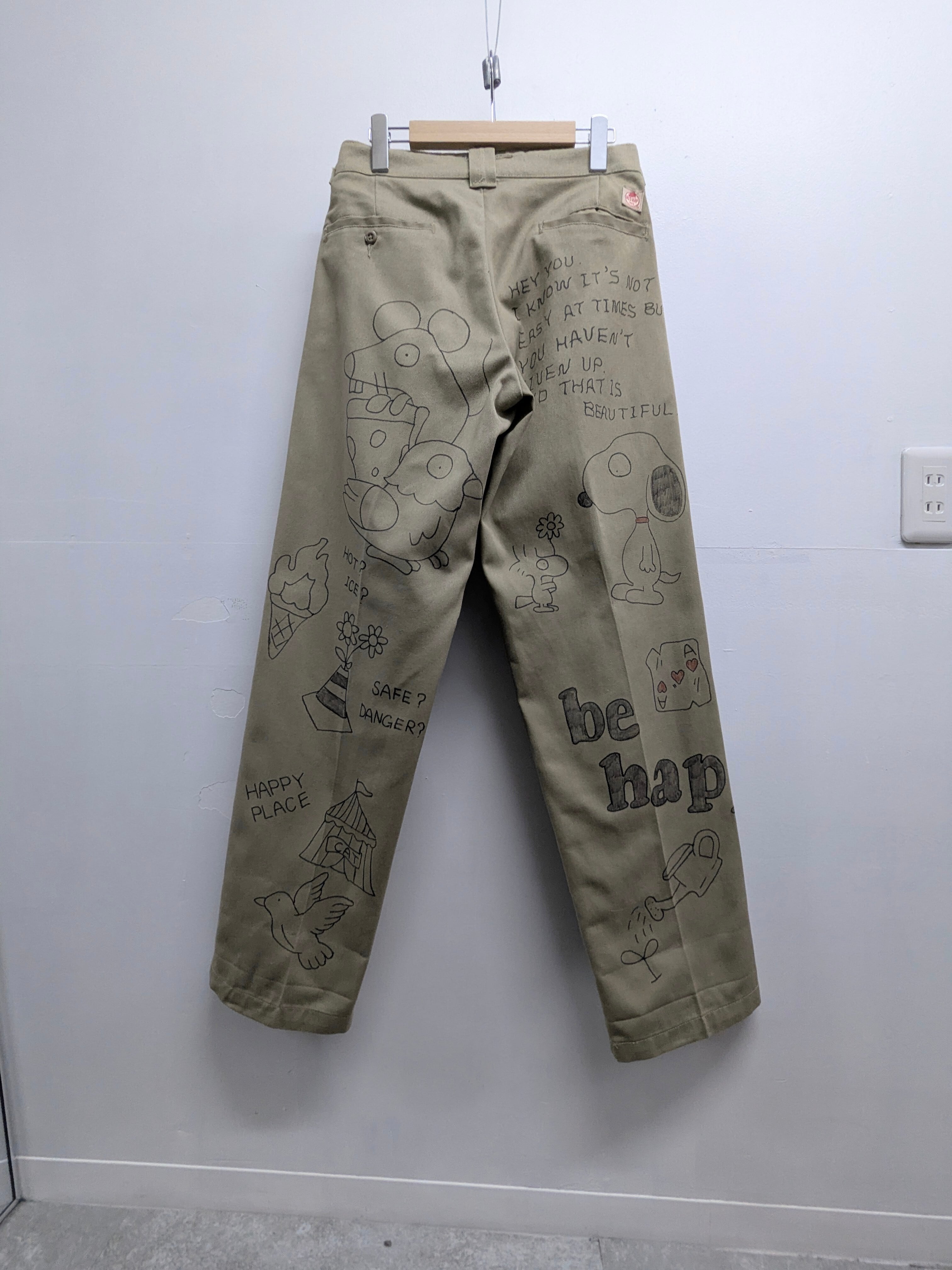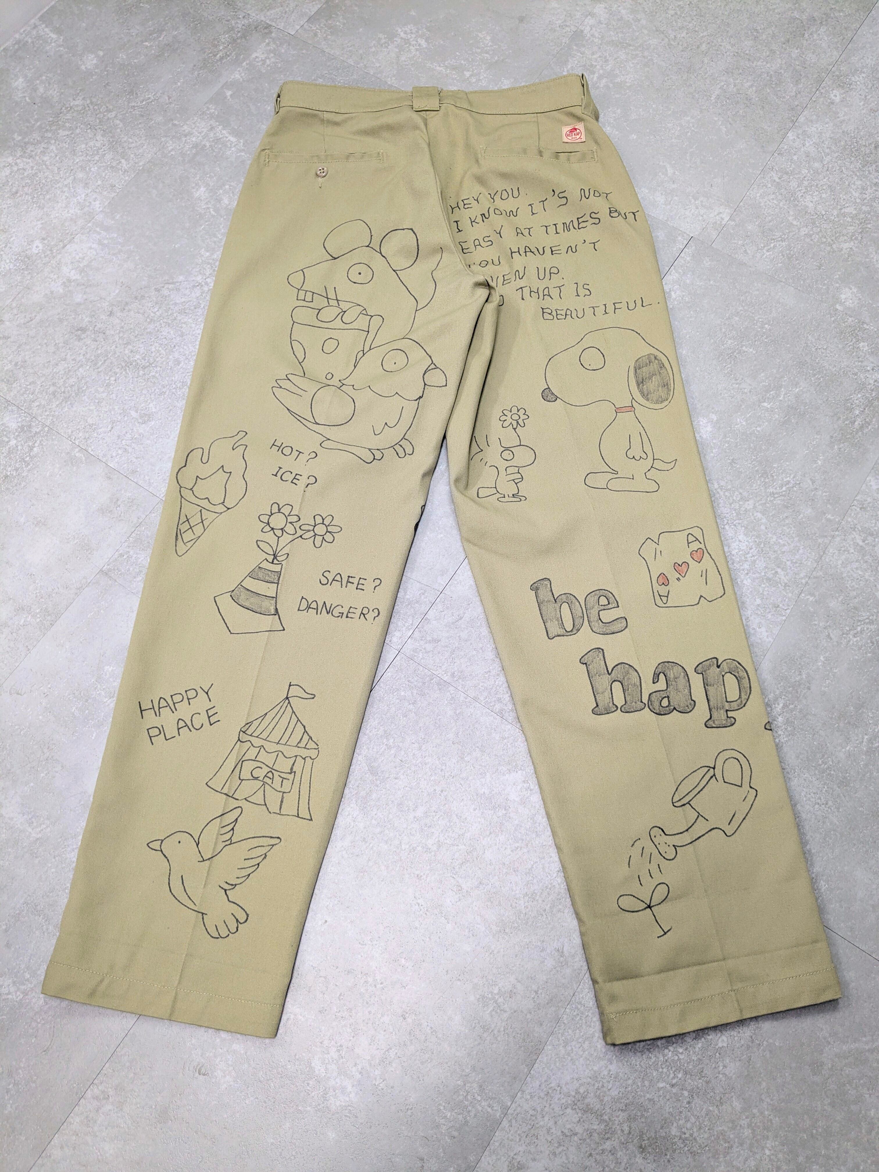 Red Capのボディにイラストを加えています。メモリアルパンツをベースに、どこか見たことあるようなキャラクターがいたりととにかく可愛いアイテム。ルーズなシルエットがちょうどいい。唯一無二の一点物となります。