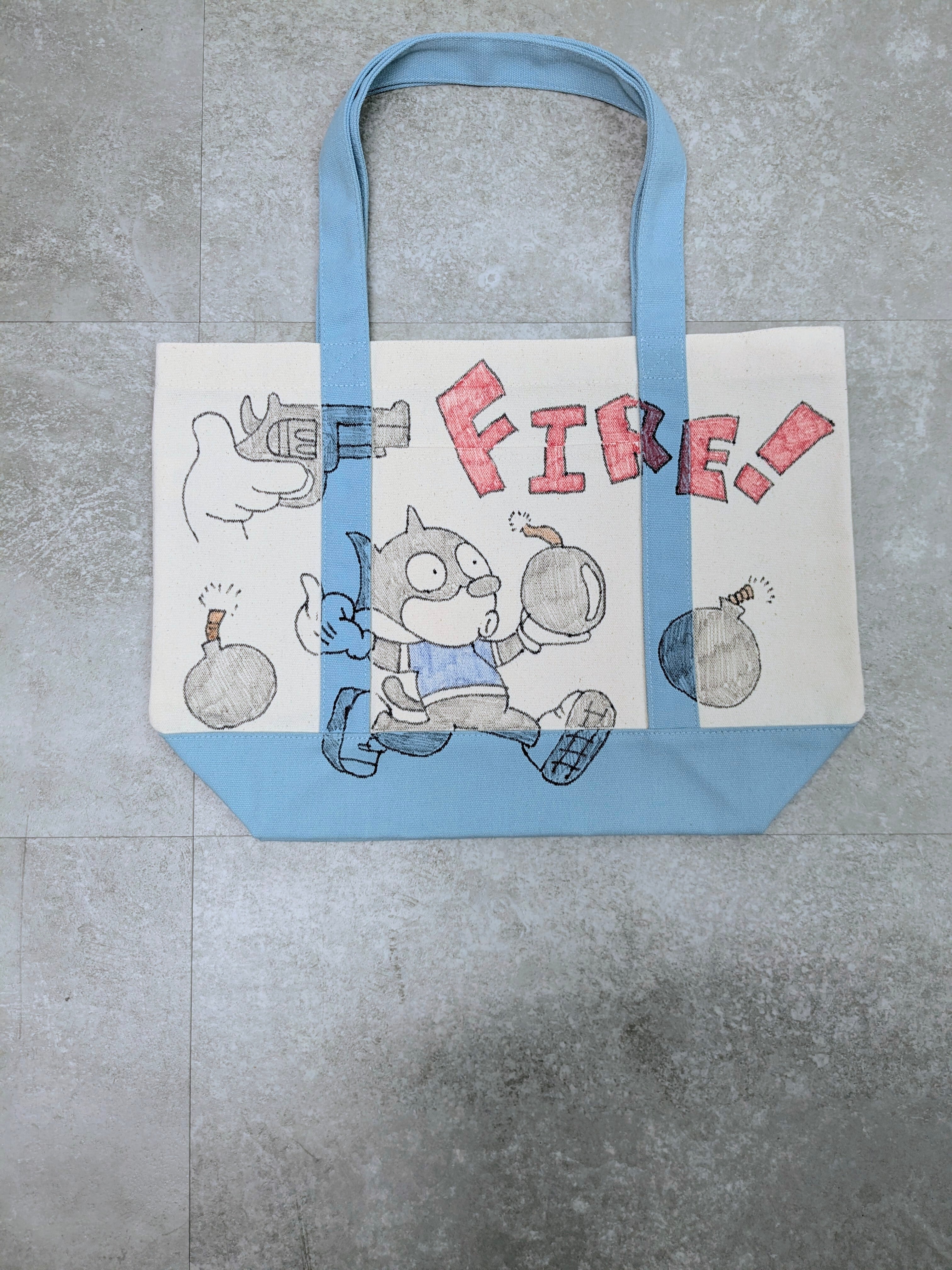 キャンバスのトートバッグにイラストを加えています。メモリアルの要素があり、どこか見たことあるキャラクターがいたりと、とにかく可愛いアイテム。全て手作業になるので、唯一無二の一点物となります。