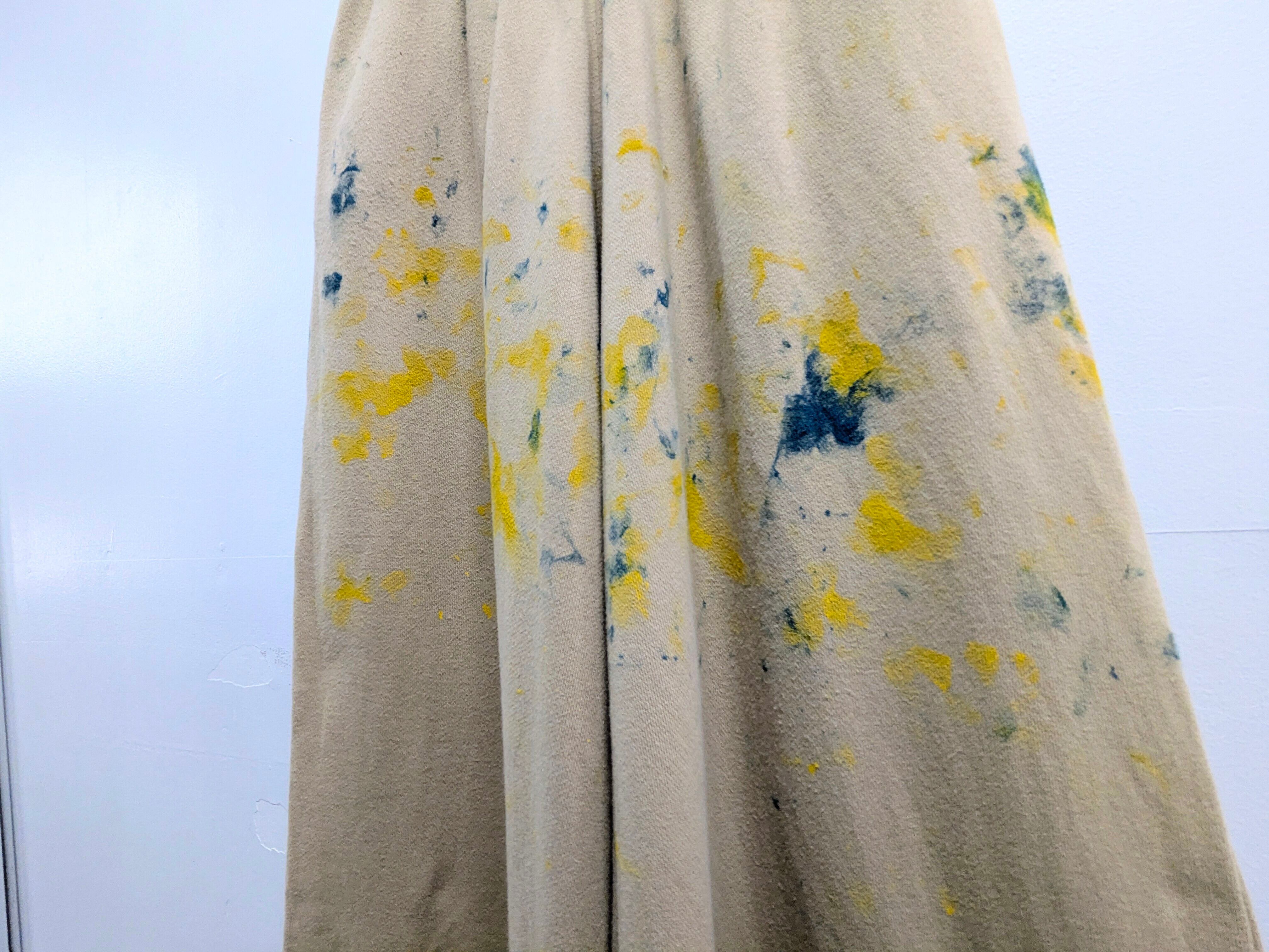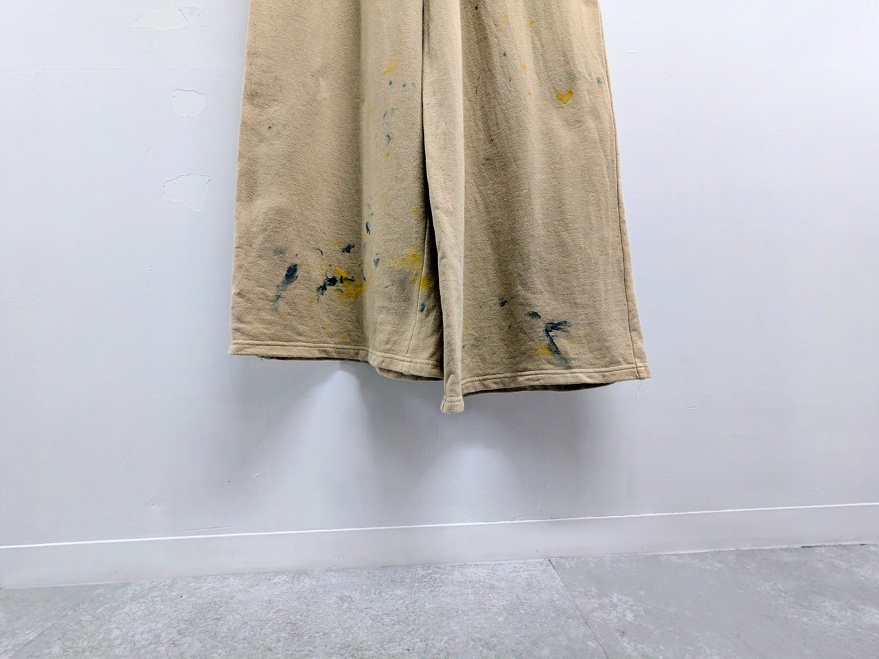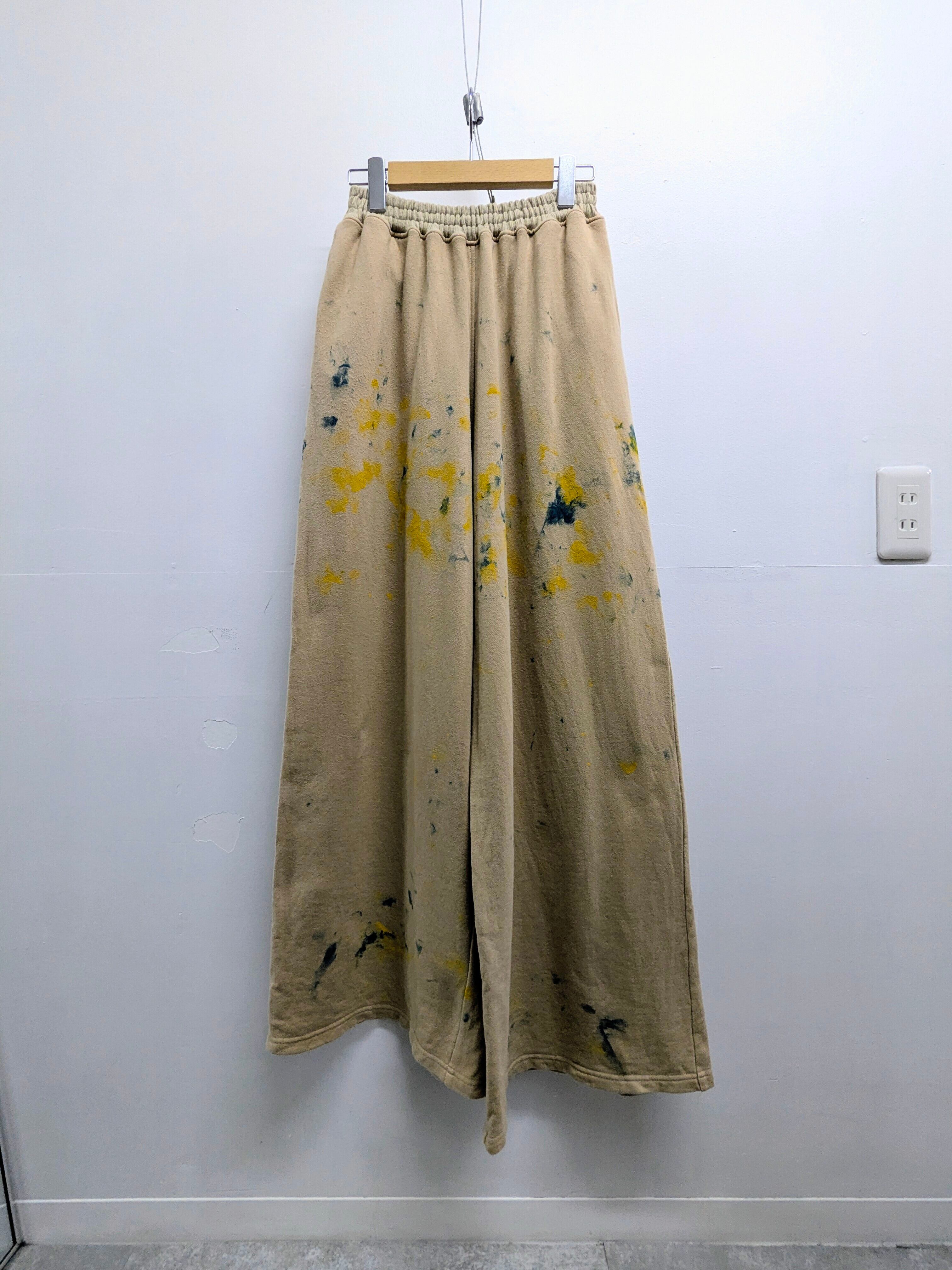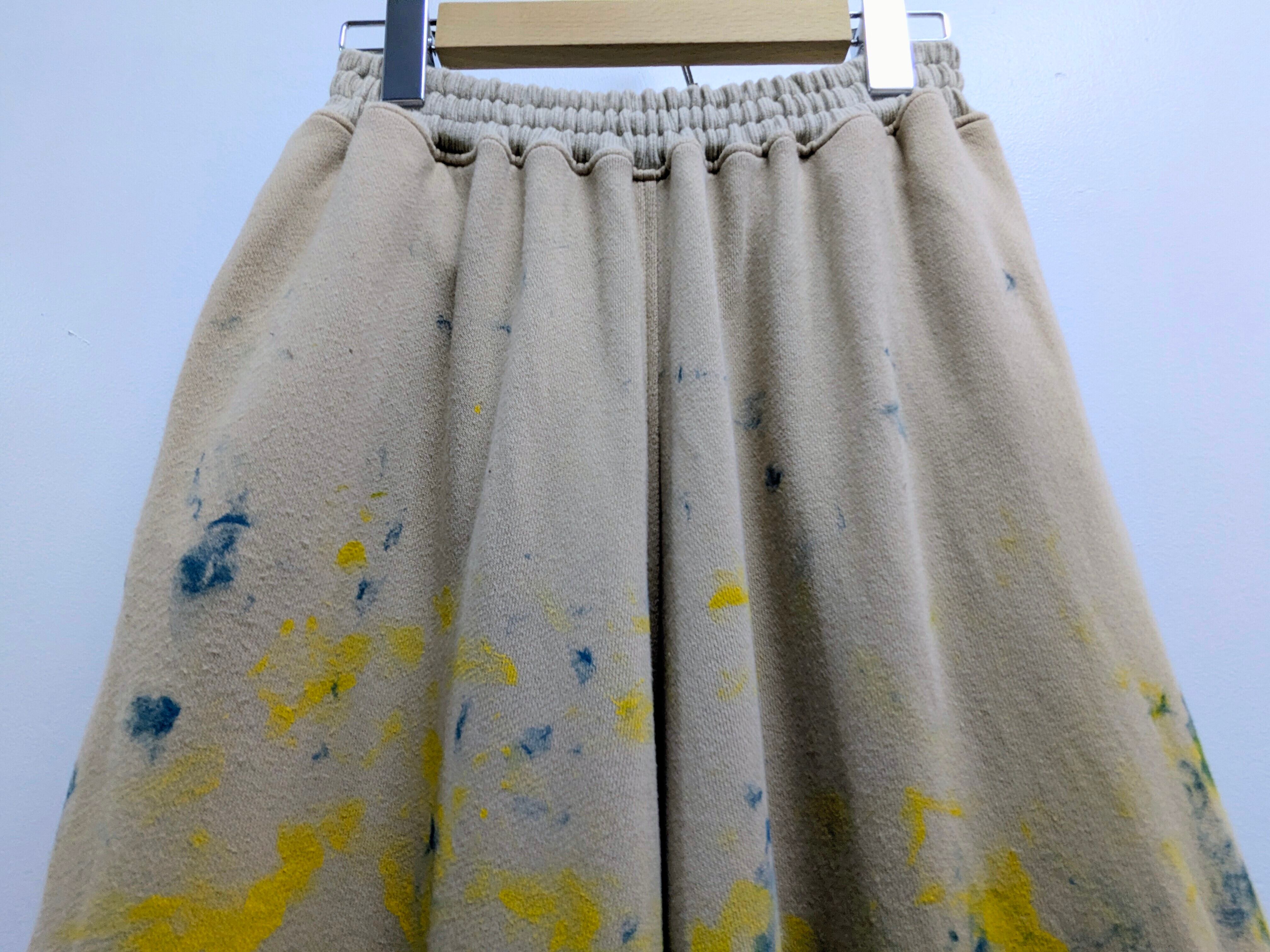 汚れたようなペイントが施してあるスウェットパンツ。名前にも付けたように、とても太めな、スーパーワイドなパンツ。スウェットパンツとしても最高な形なうえに、ペイントのデザイン性も兼ね備えた人気な一着。