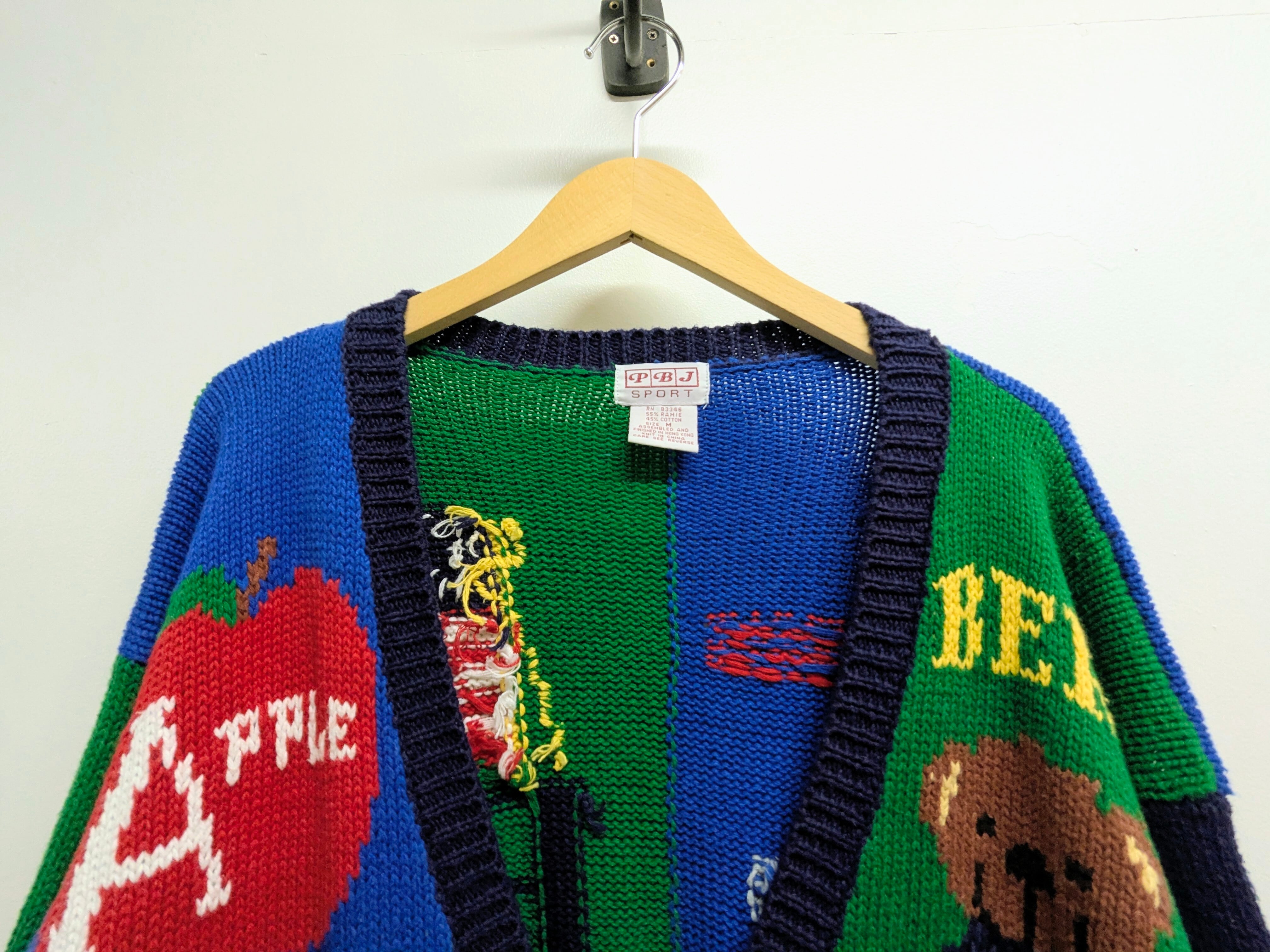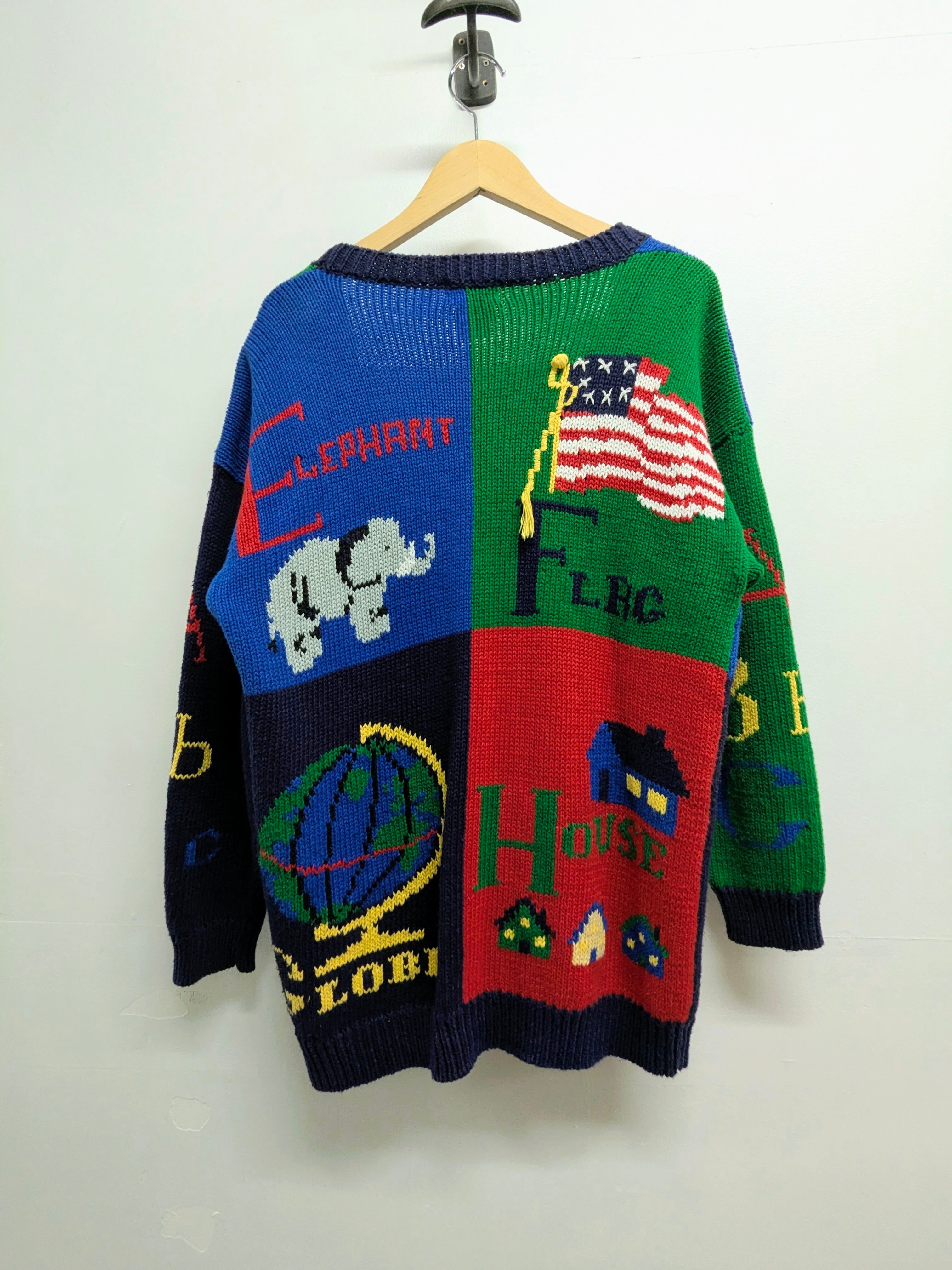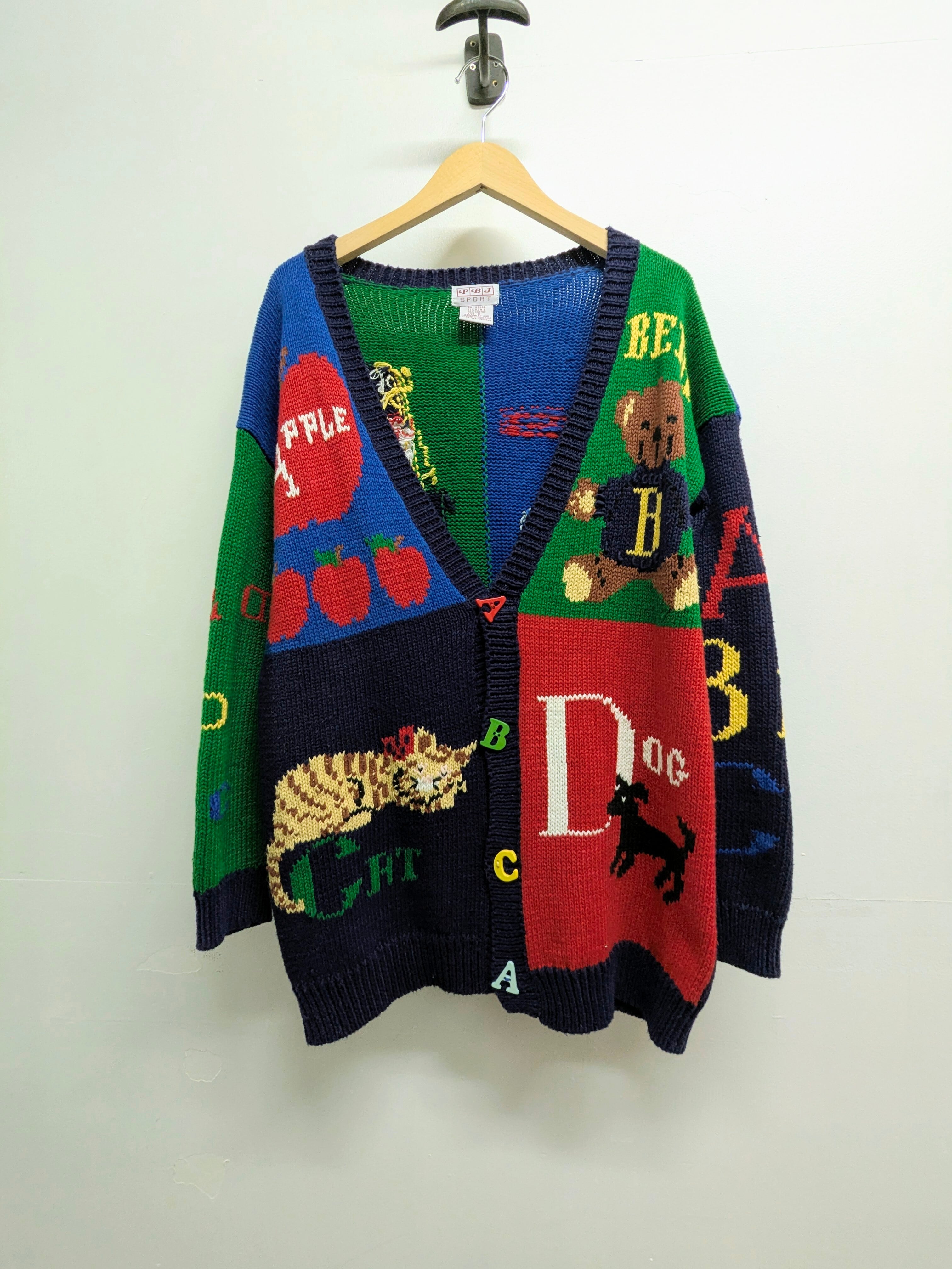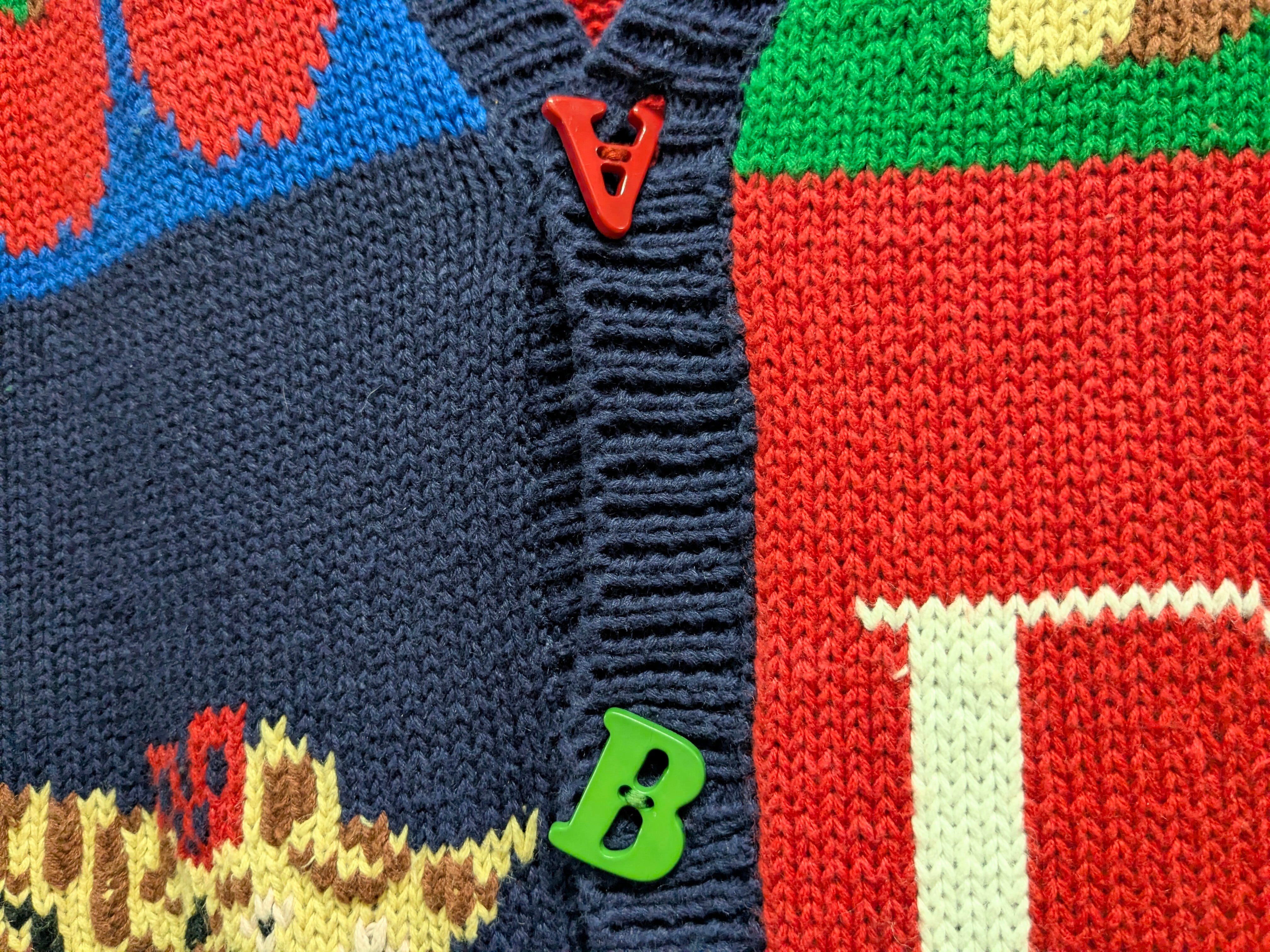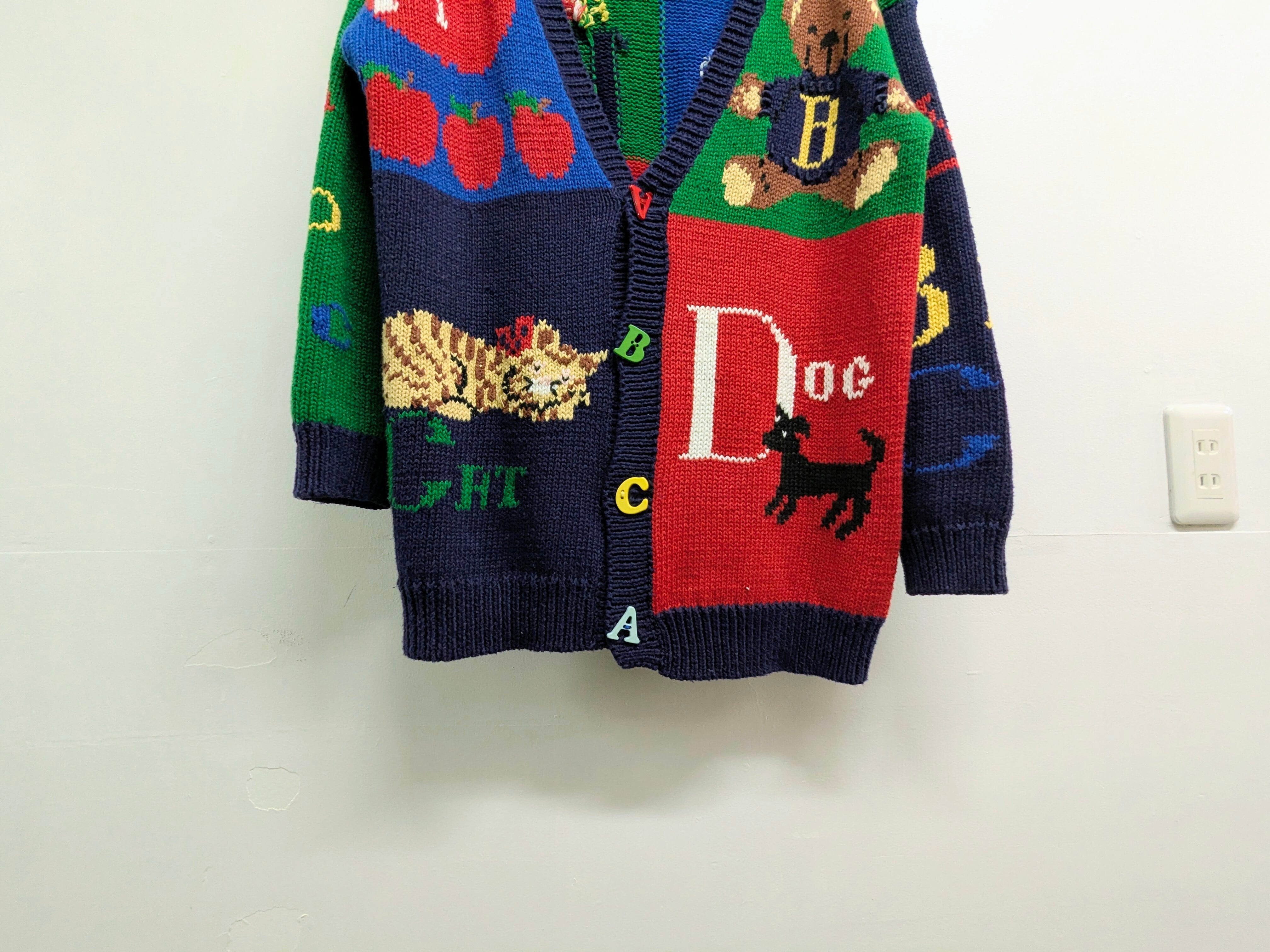 英語の勉強、教科書のようなデザインのカーディガン。A〜Hまでの単語がそれぞれ書いてあり、ボタンもアルファベットになっています。ラミー、コットンの素材でほぼ通年お使いいただけます。