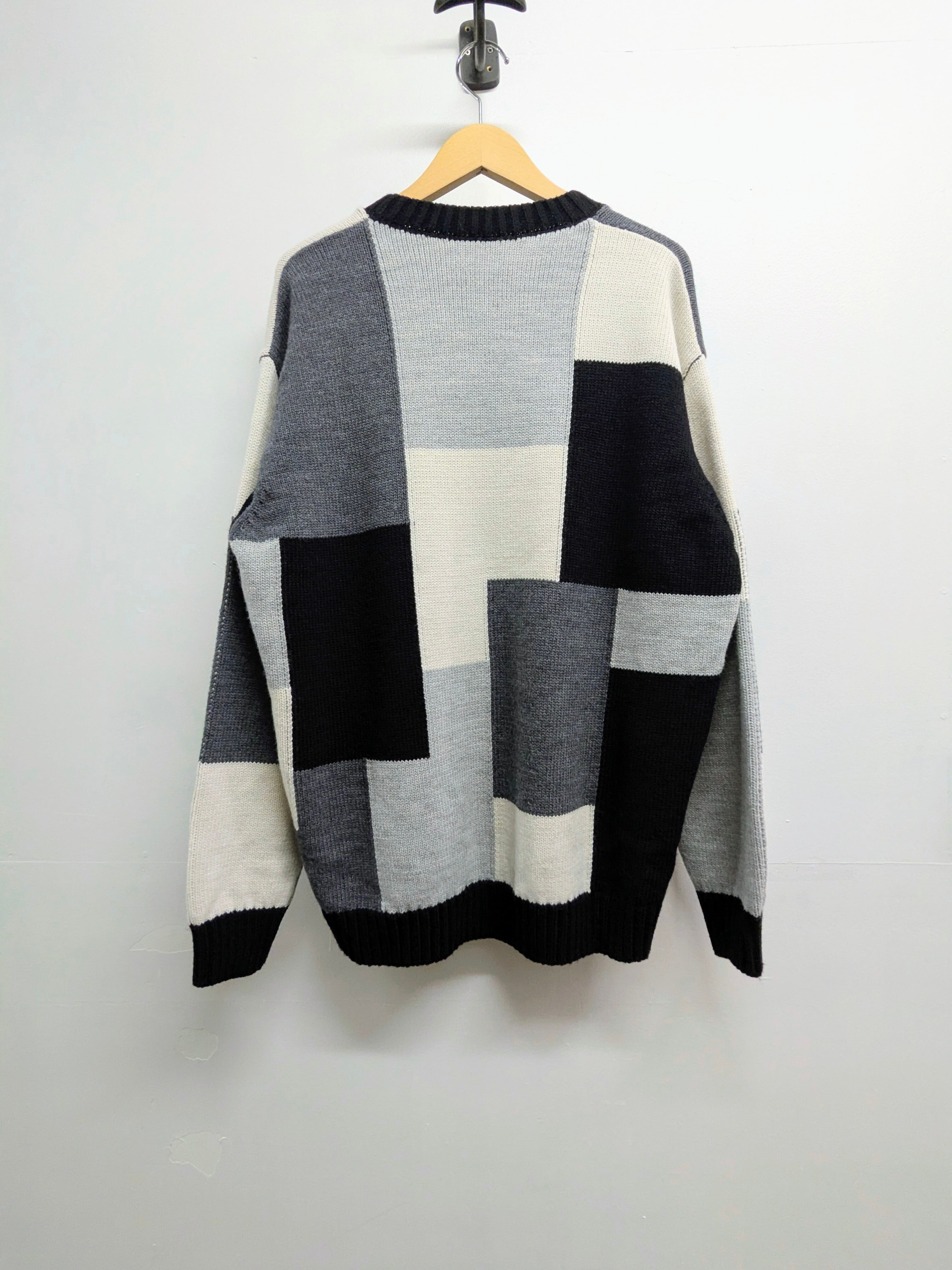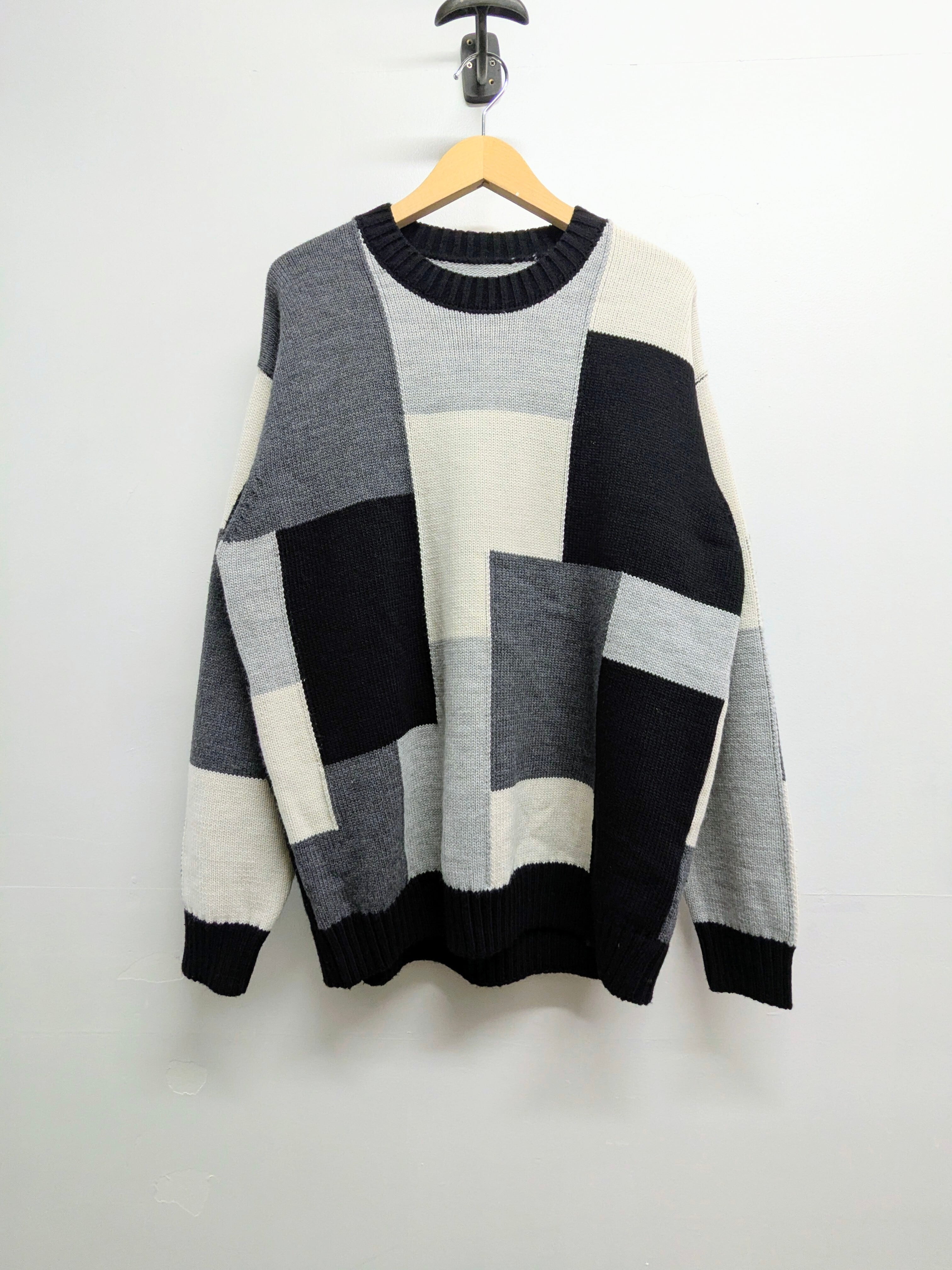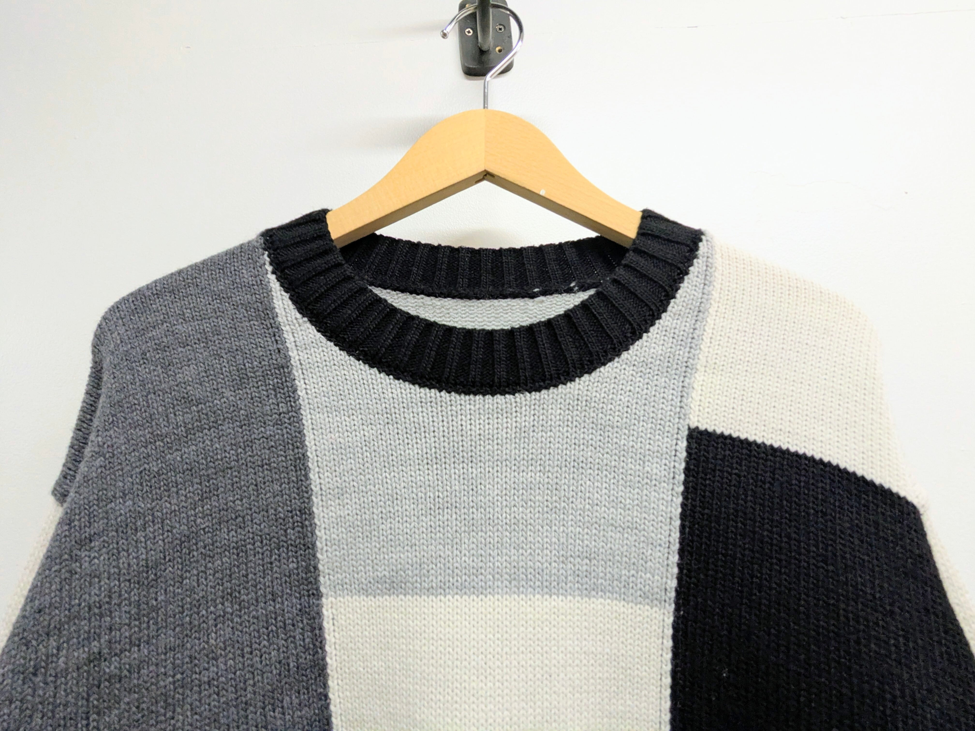 ホワイト、グレー、ブラックの無彩色で構成されたデザインニット。色のトーンが落ち着いているので、派手すぎない使いやすいデザインニット。ゆったりとしたサイズ感。
