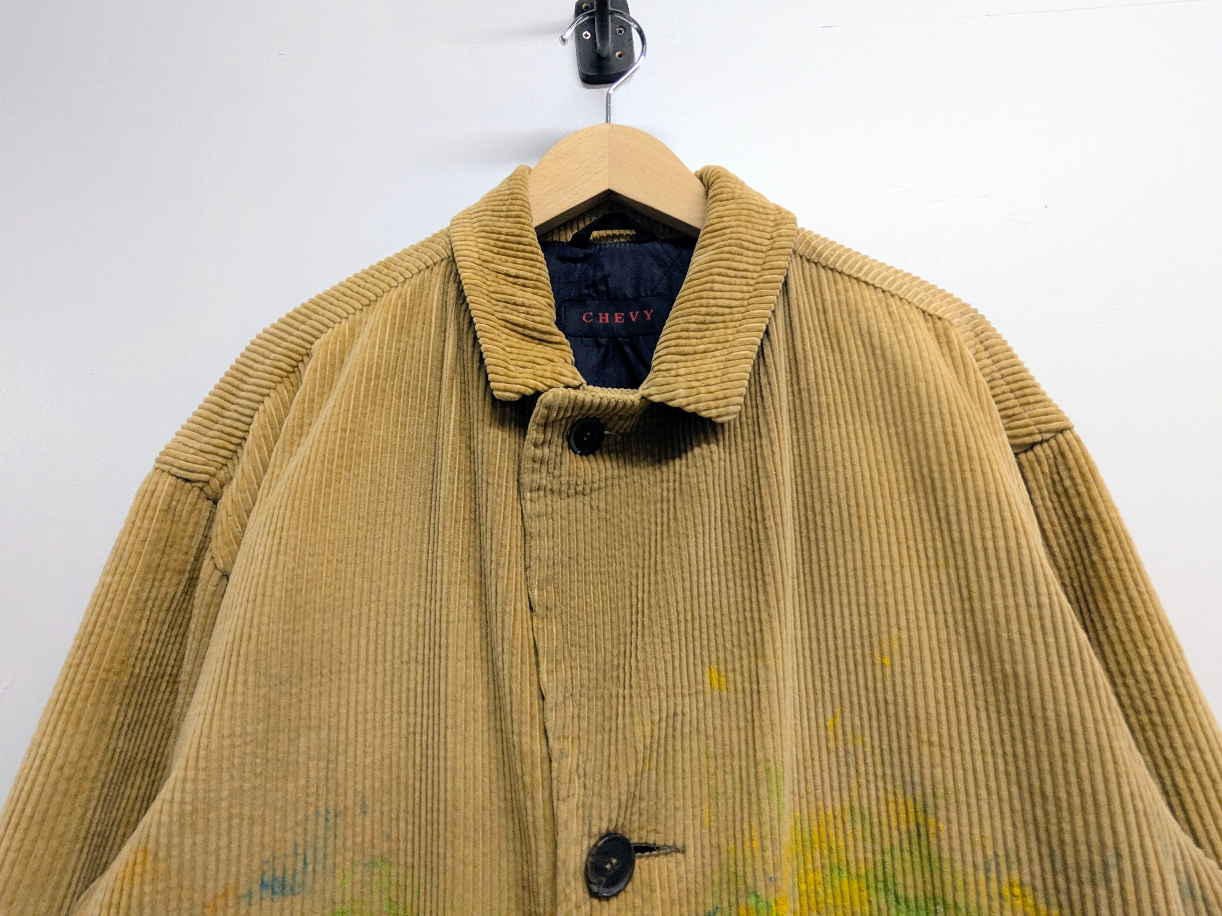 まるで画家さんが使っていたかのようなデザインのカバーオール。太畝のコーデュロイが柔らかさ、温かさ、凹凸感の表面変化などいいところづくめ。キルティングとなっています。保温性面も抜群です。ボタン裏の生地が一カ所傷んでいます。