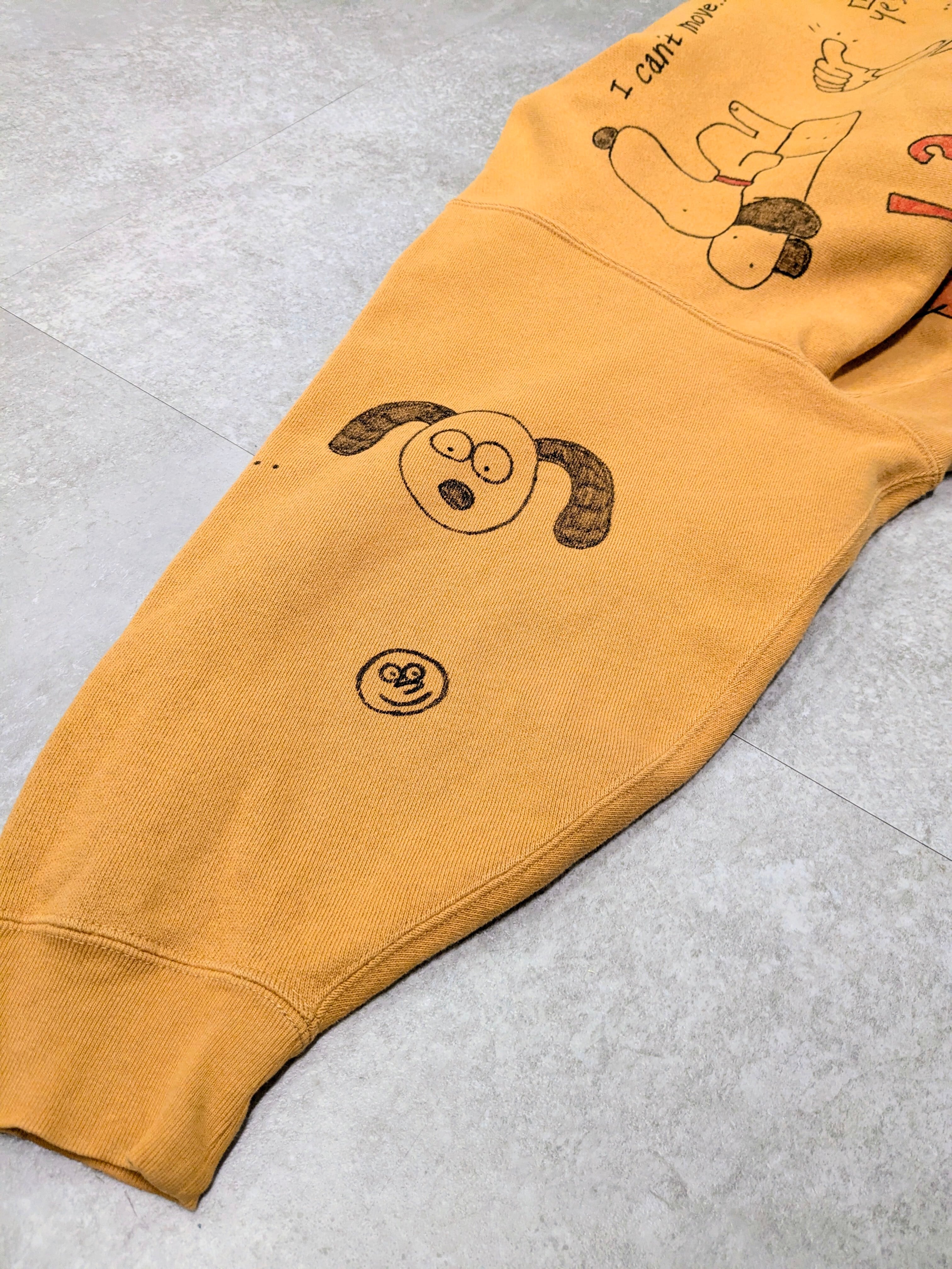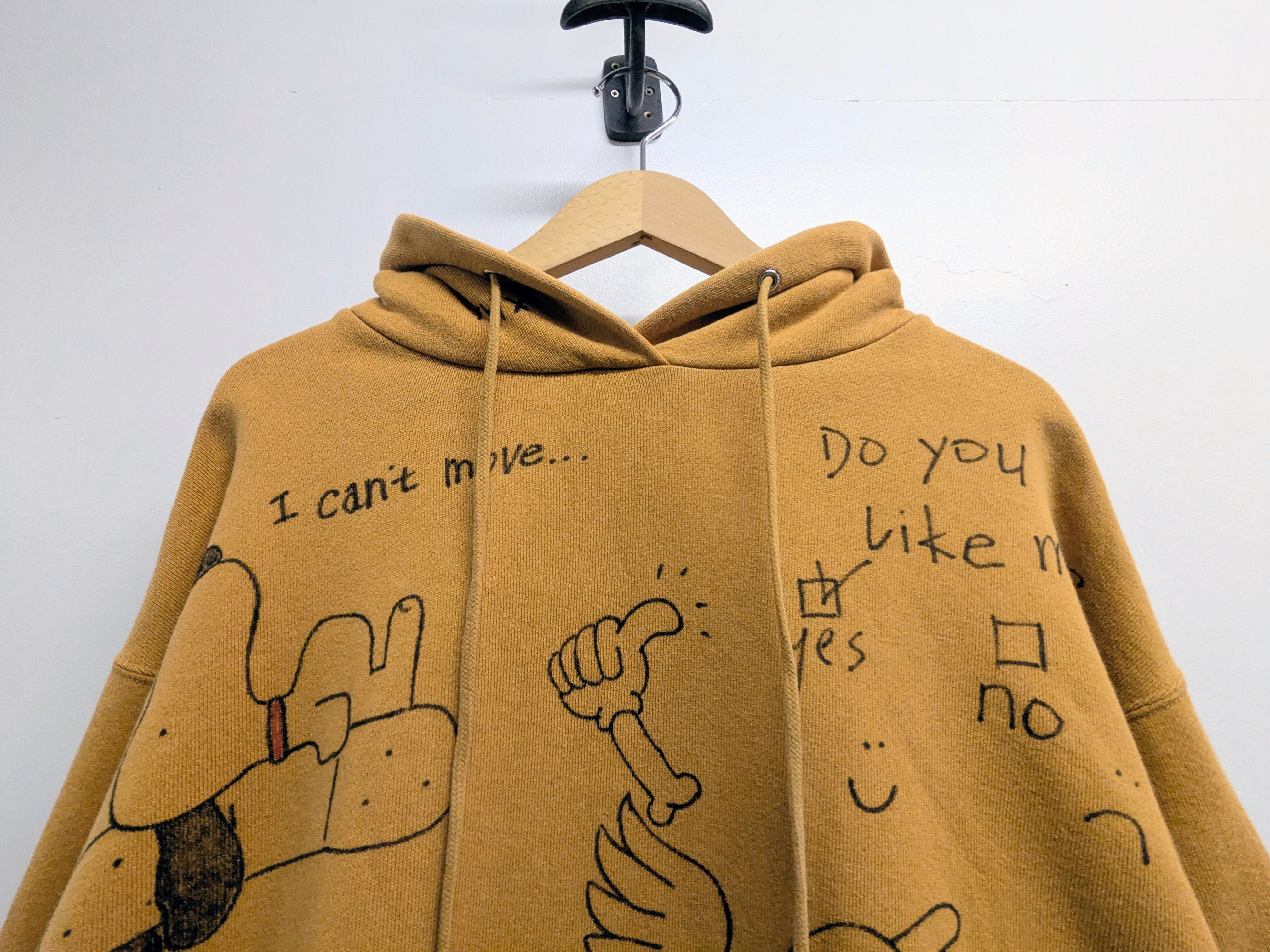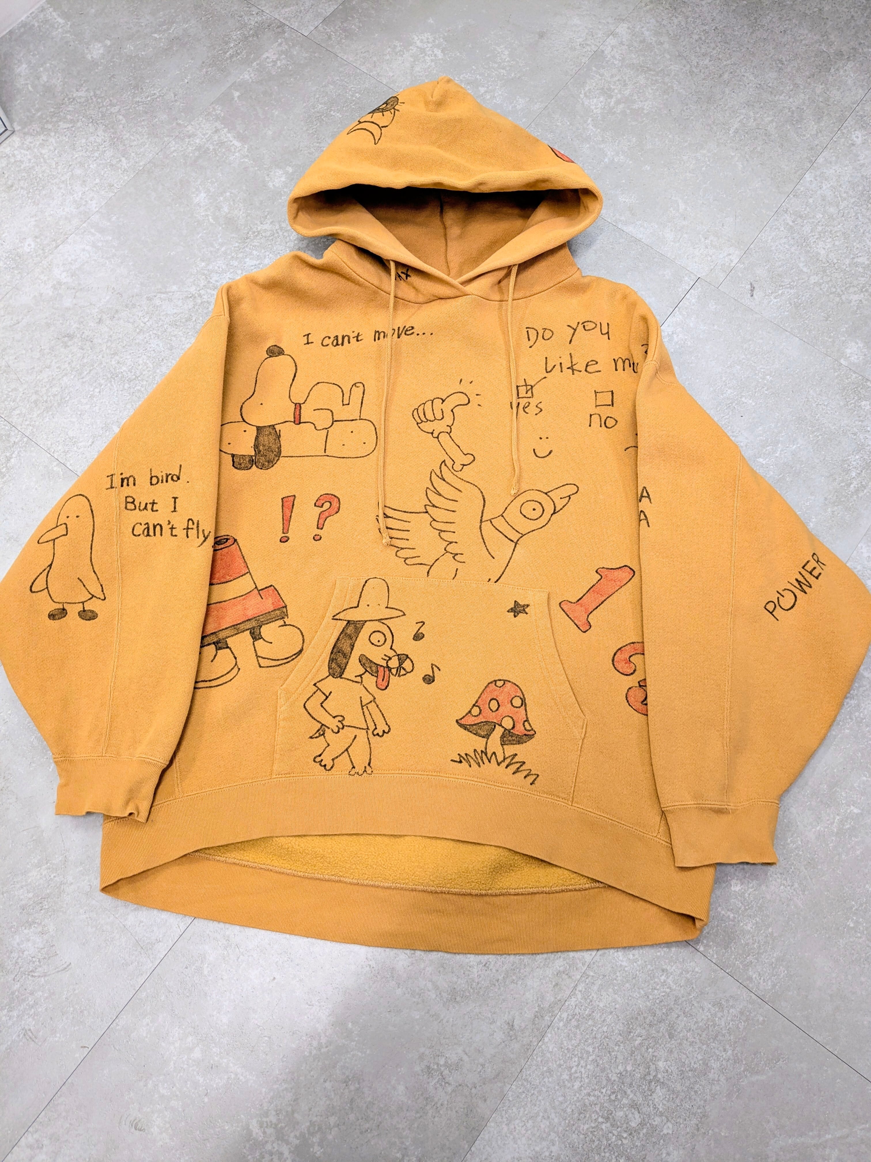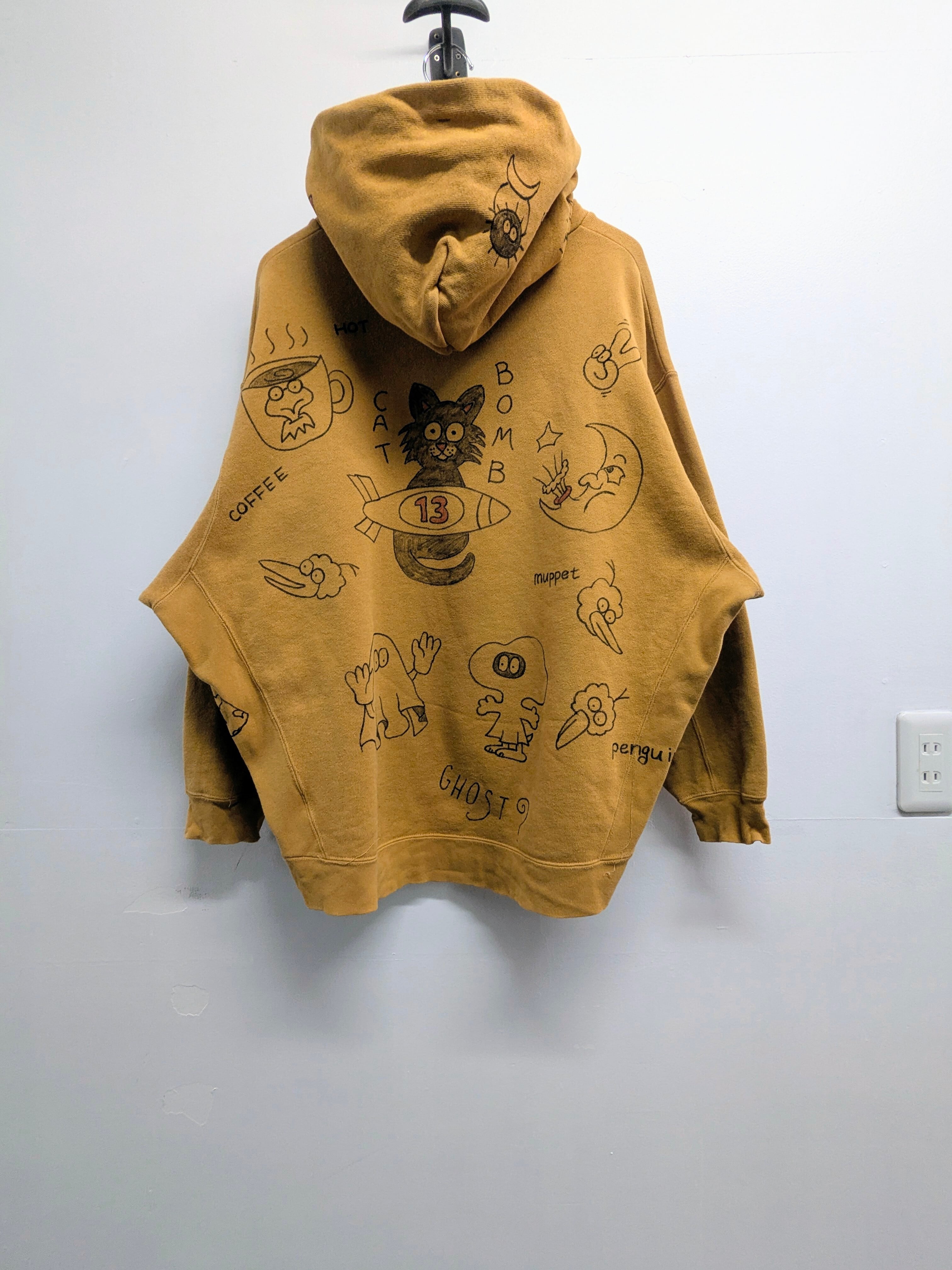 リバースウィーブ型のスウェットパーカーを使用したアイテム。ガッシリとした素材感となっています。丈は短め、身幅とアームホールは太めでシルエットがとても綺麗。メモリアル要素もあり、どこか見たことあるようなキャラクターがいたりととても可愛い一着。唯一無二の一点物となります。