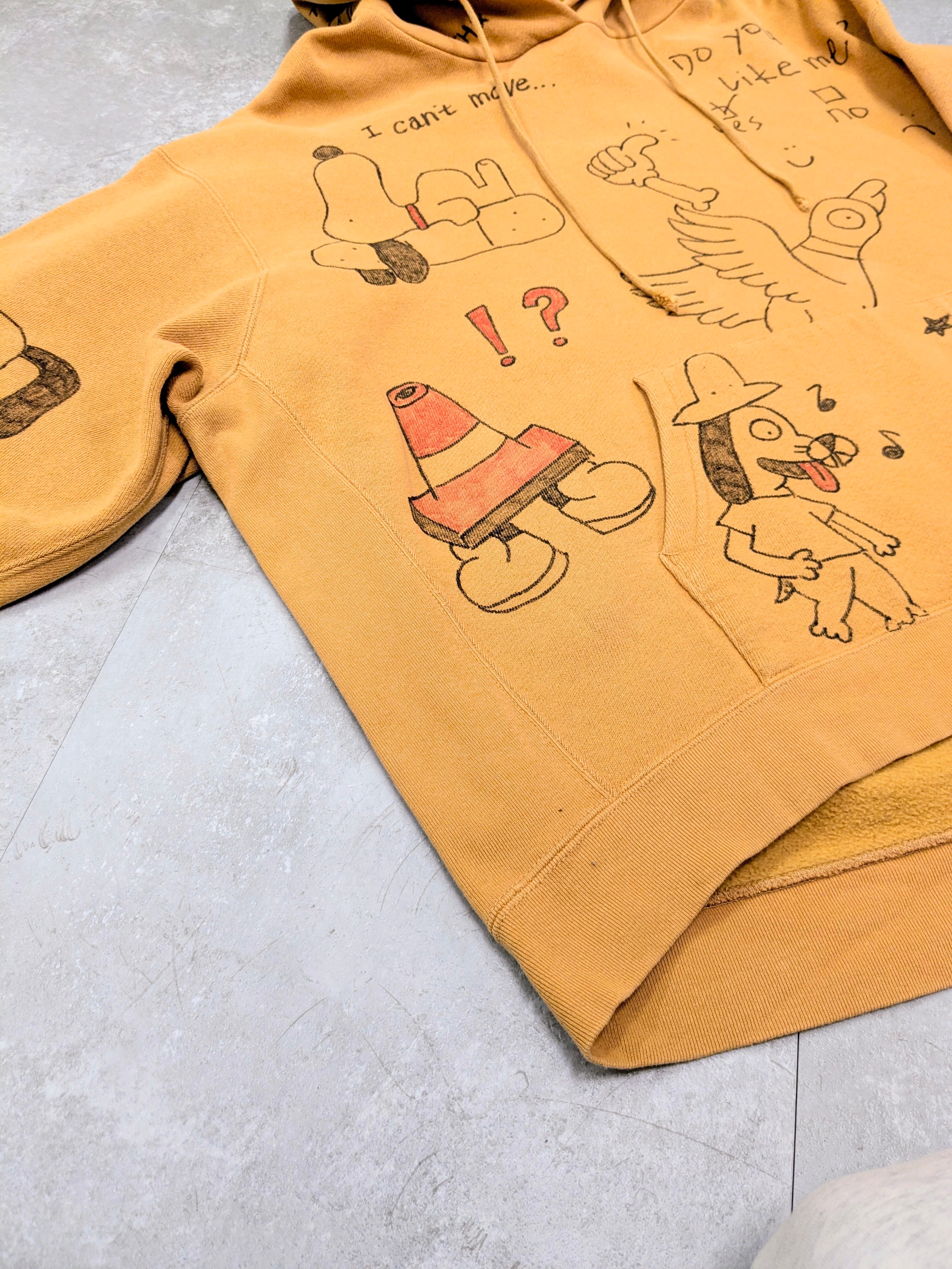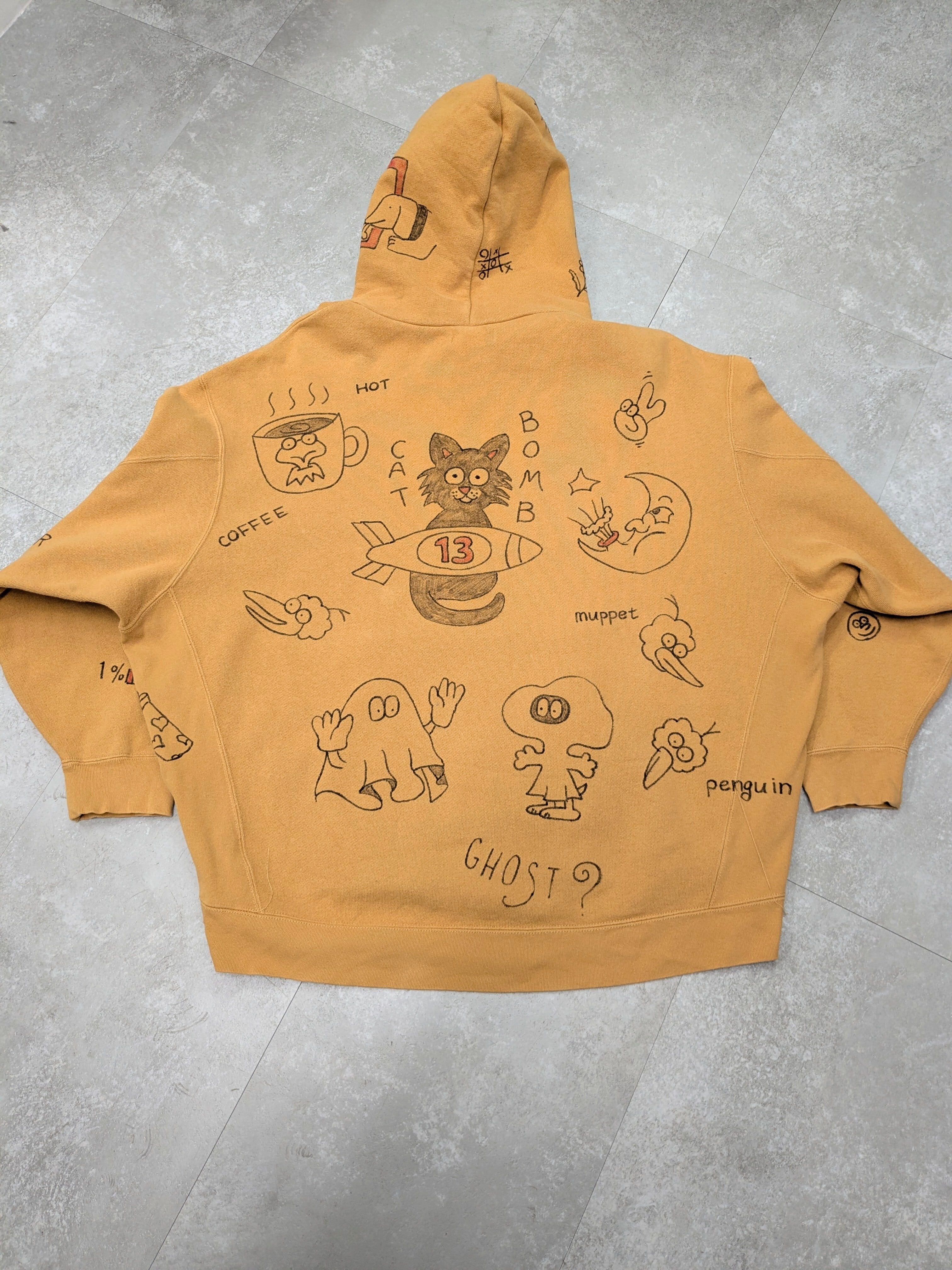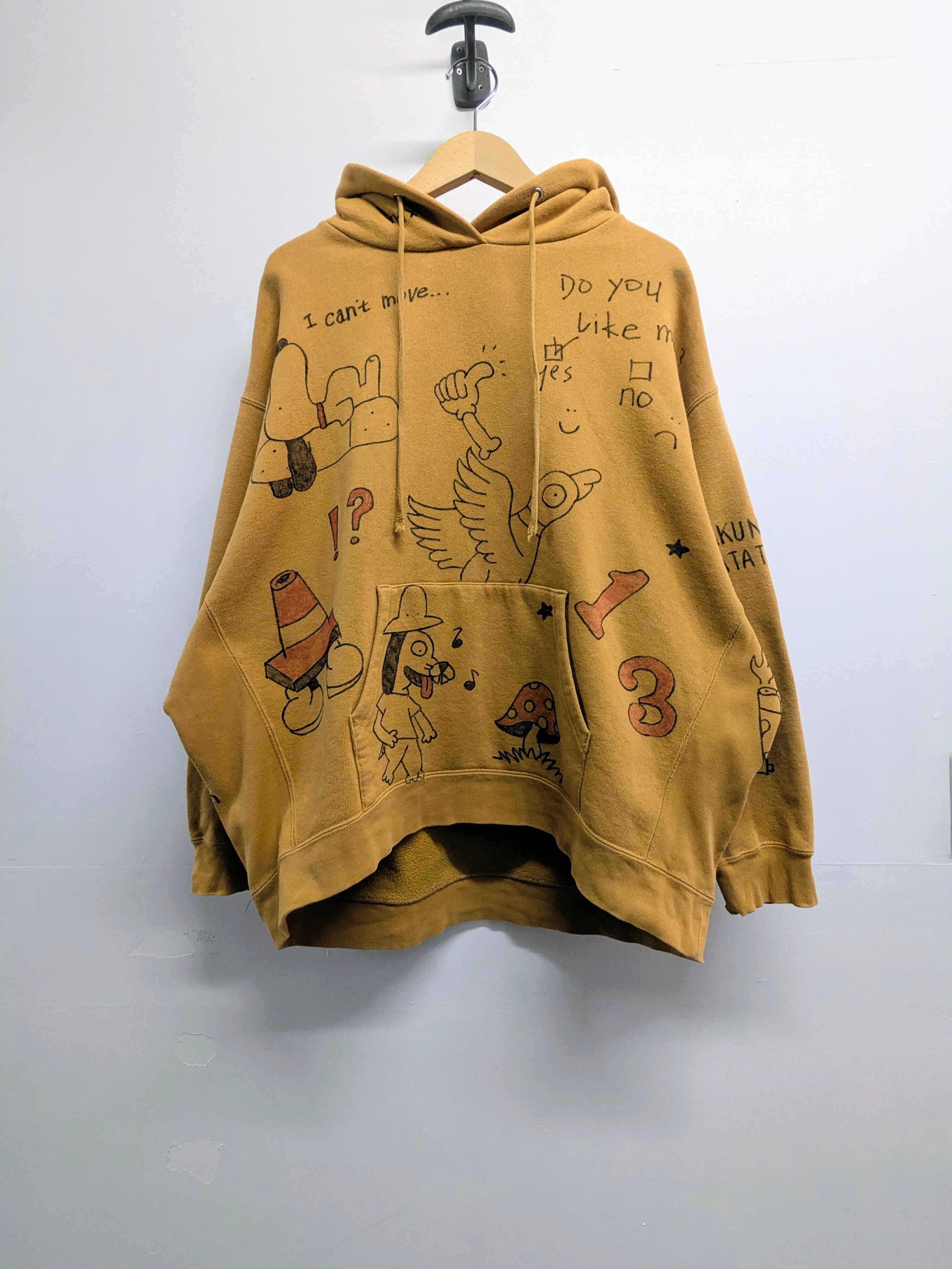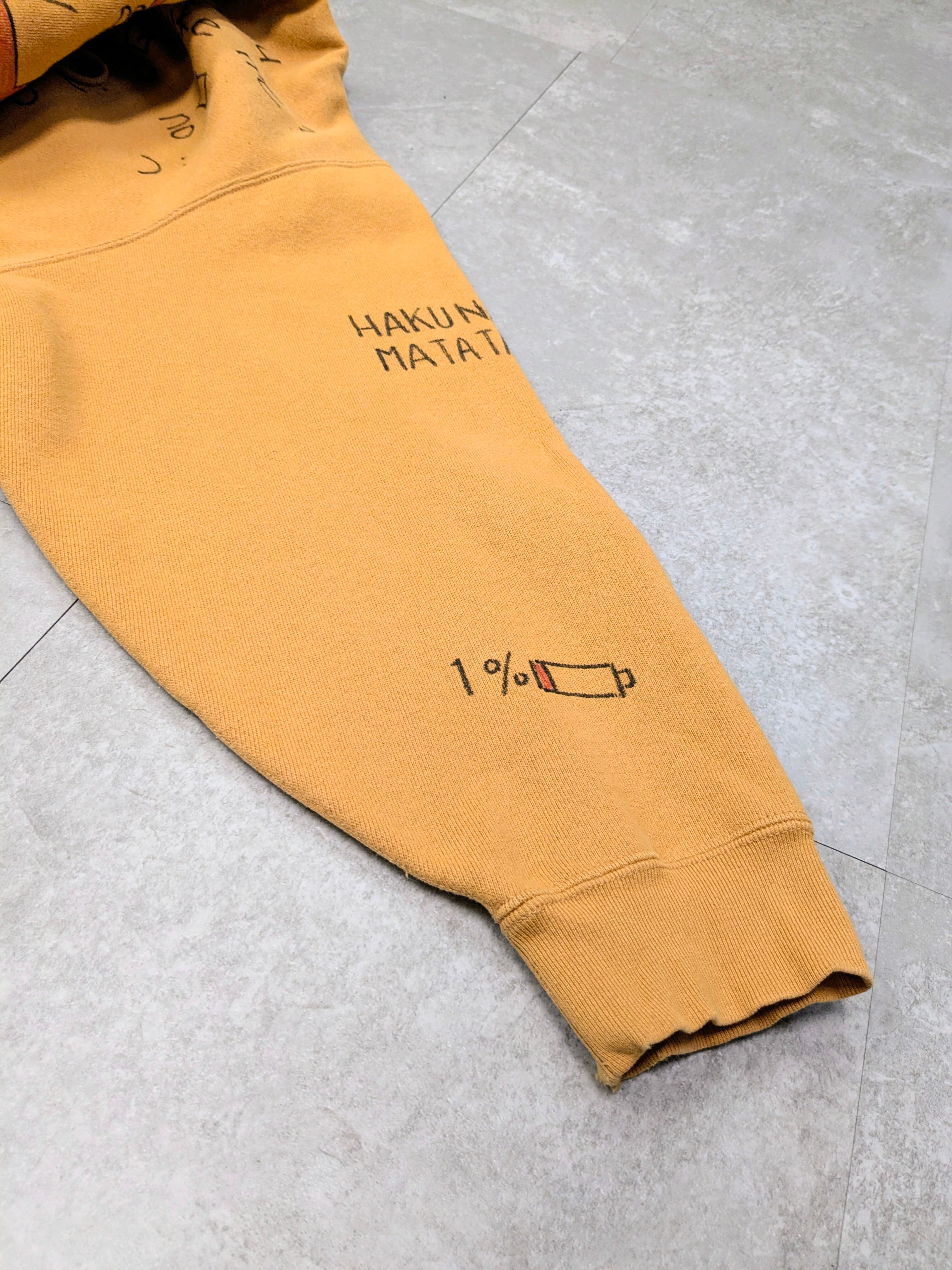 リバースウィーブ型のスウェットパーカーを使用したアイテム。ガッシリとした素材感となっています。丈は短め、身幅とアームホールは太めでシルエットがとても綺麗。メモリアル要素もあり、どこか見たことあるようなキャラクターがいたりととても可愛い一着。唯一無二の一点物となります。