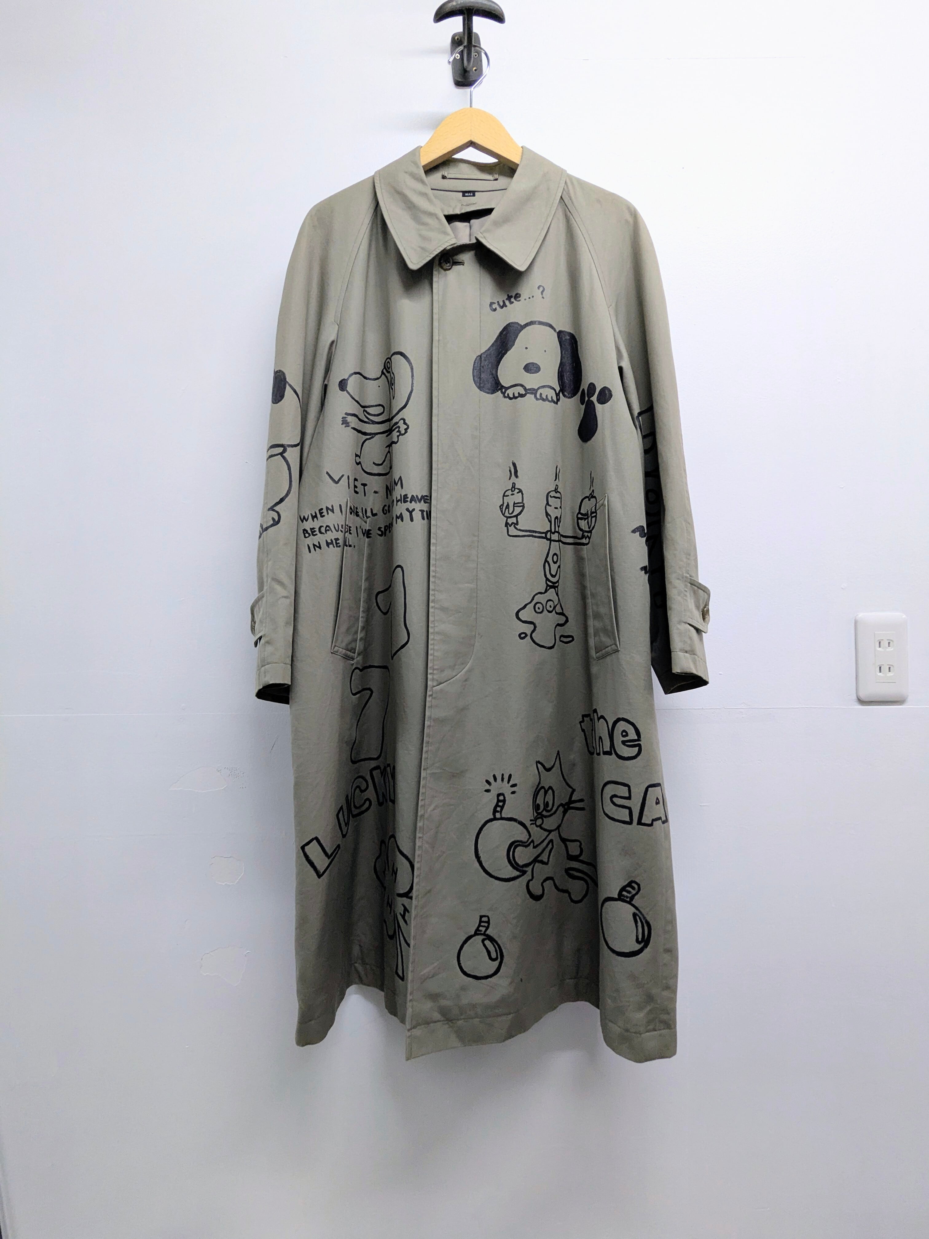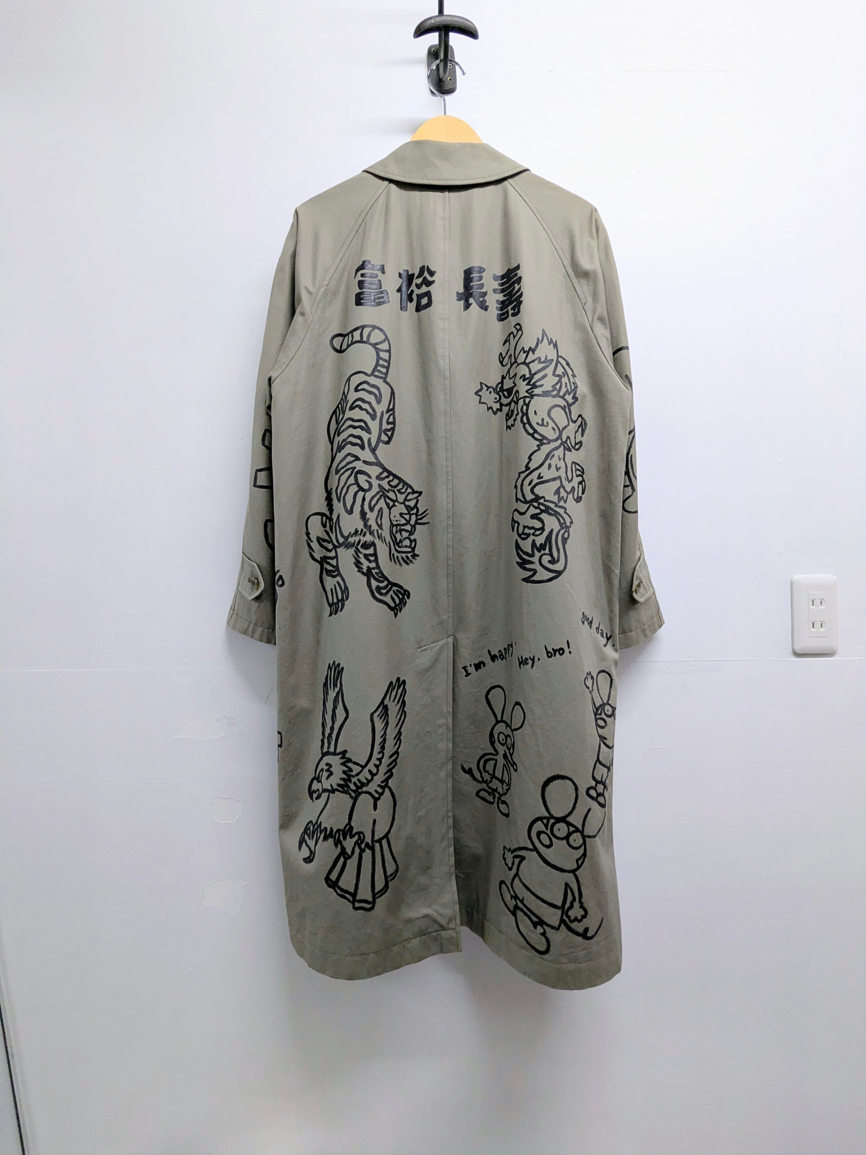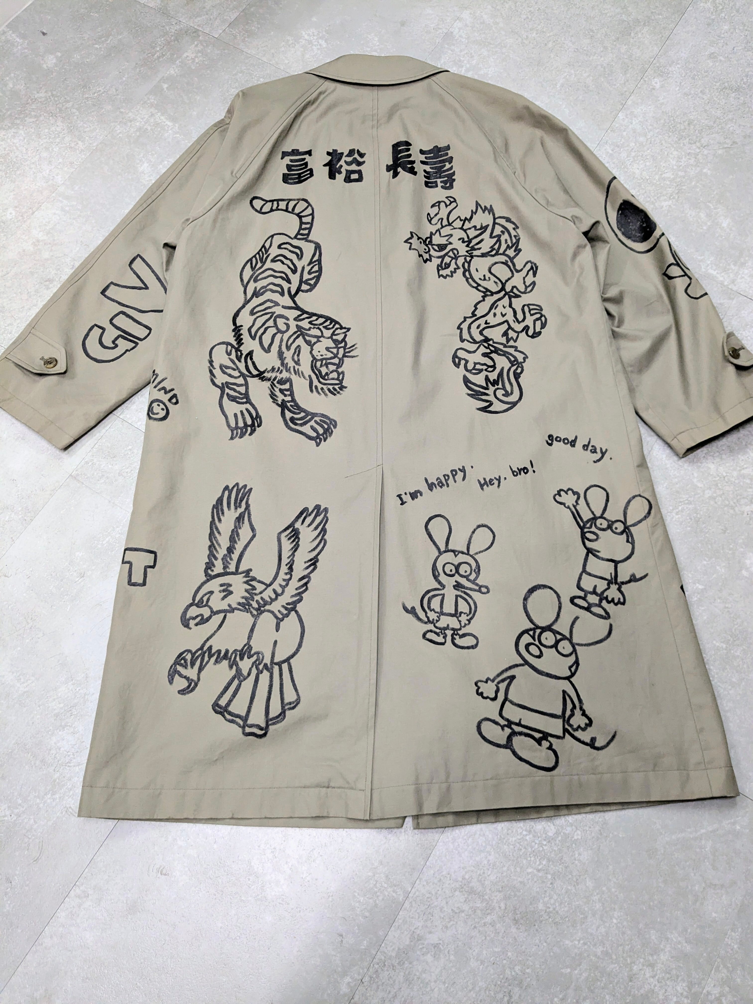 ライナー付きステンカラーコートにイラストを加えています。メモリアル要素もありつつ、どこか見たことあるようなキャラクターがいたりととても可愛い1枚。あえて少しカスレさせることで、墨で描いた雰囲気で日本画の感じも彷彿させるデザイン。ライナー取り外し可能のため、3シーズンと長い期間お使いいただけます。手描きのため唯一無二の一点物となります。