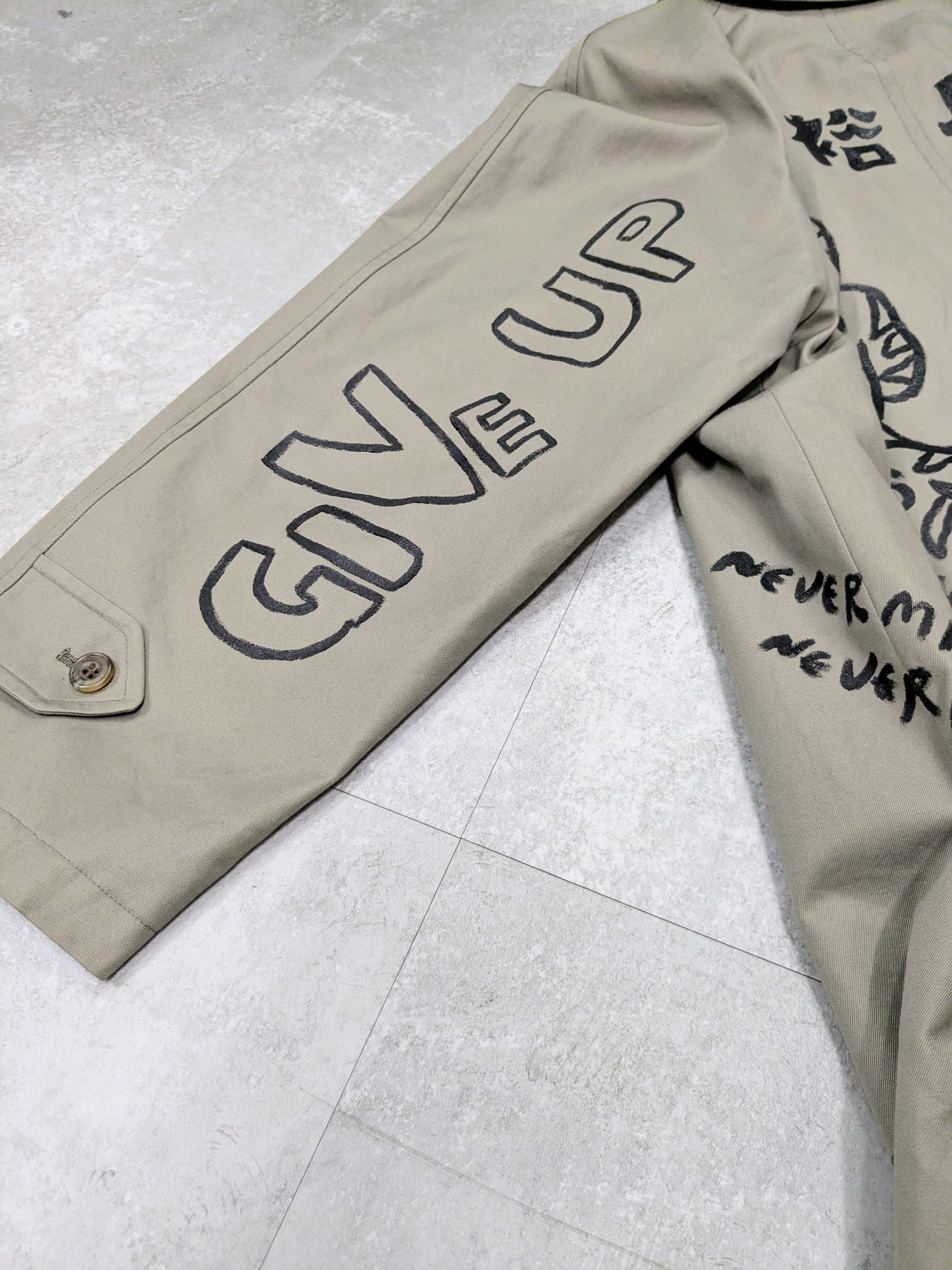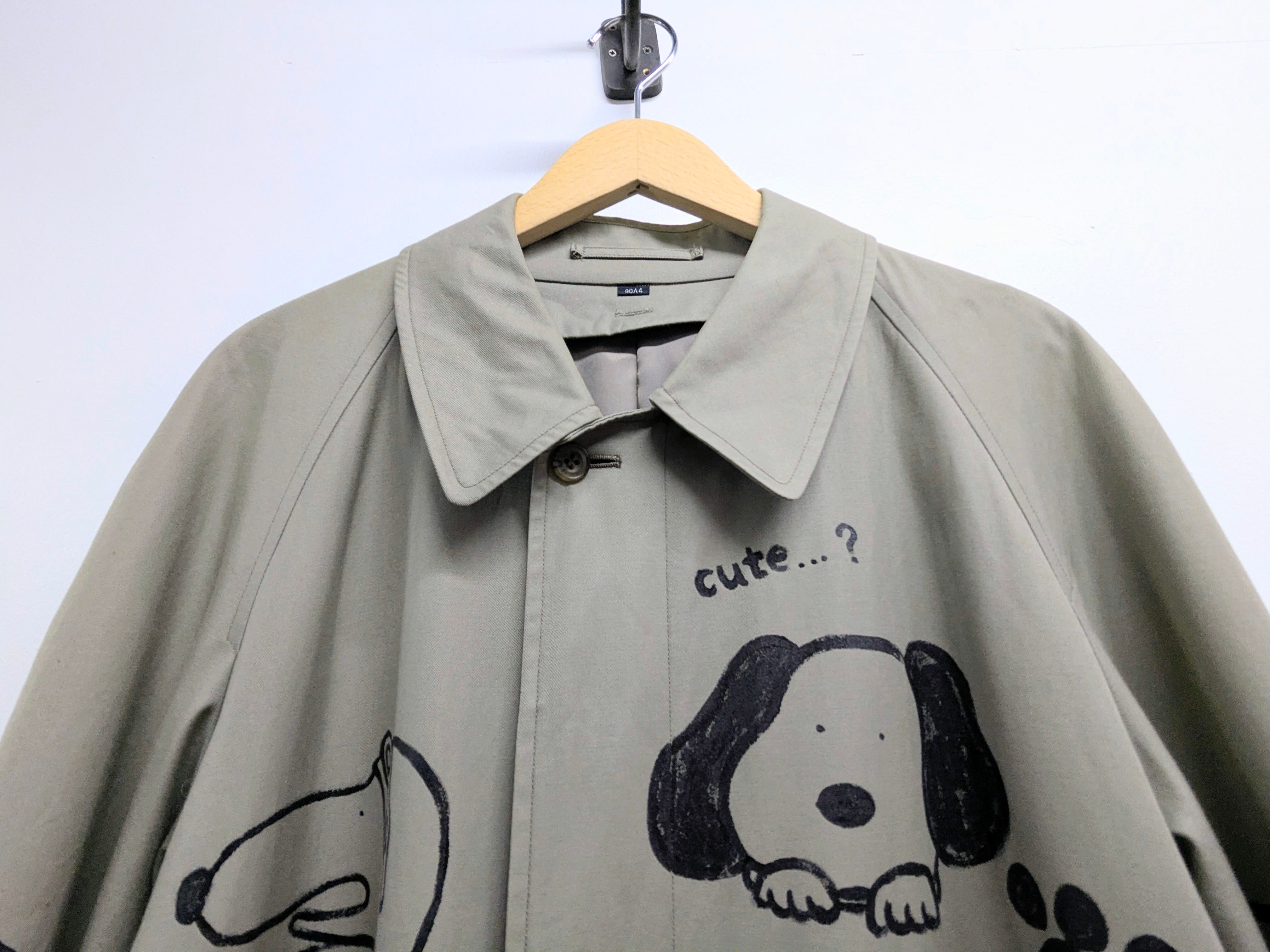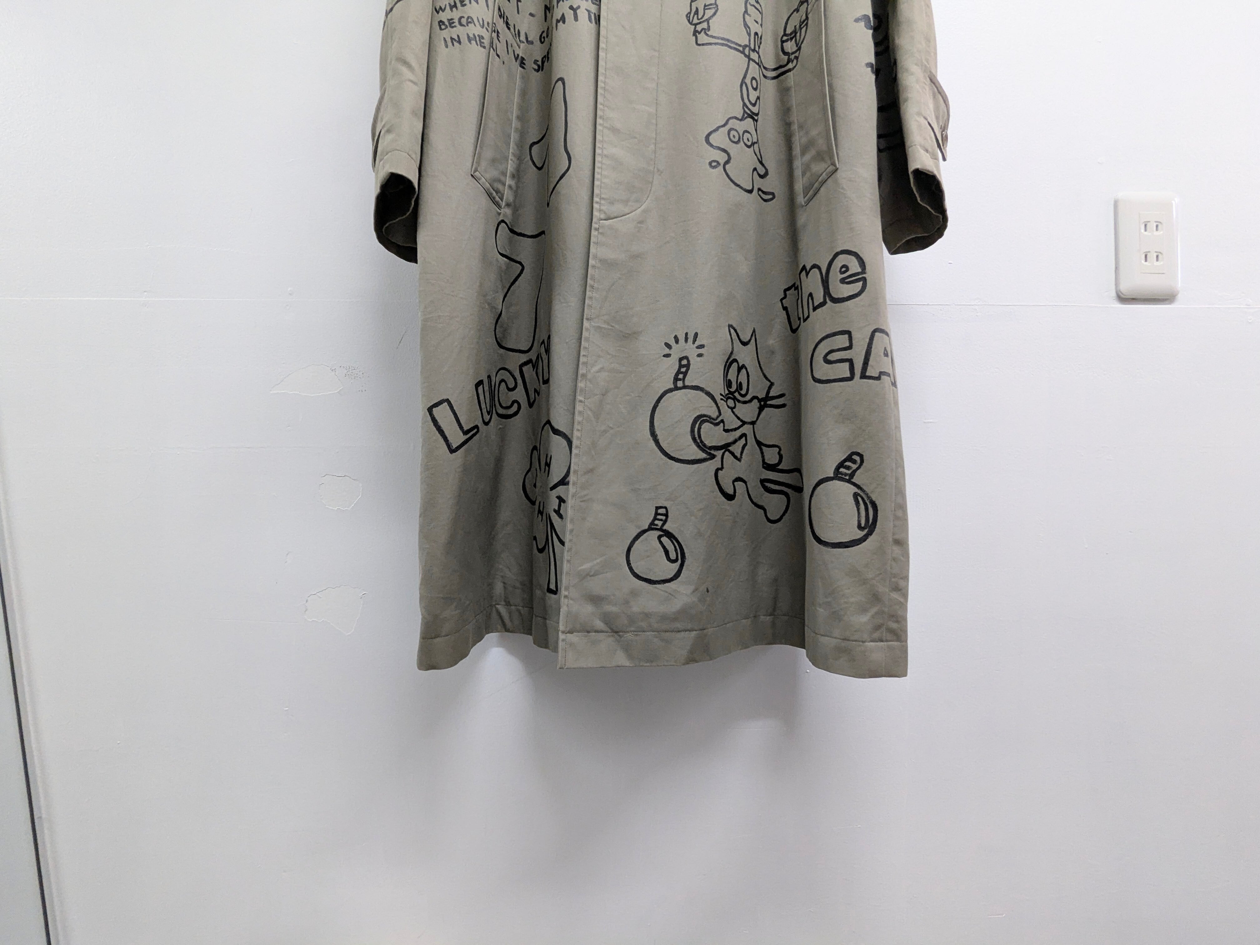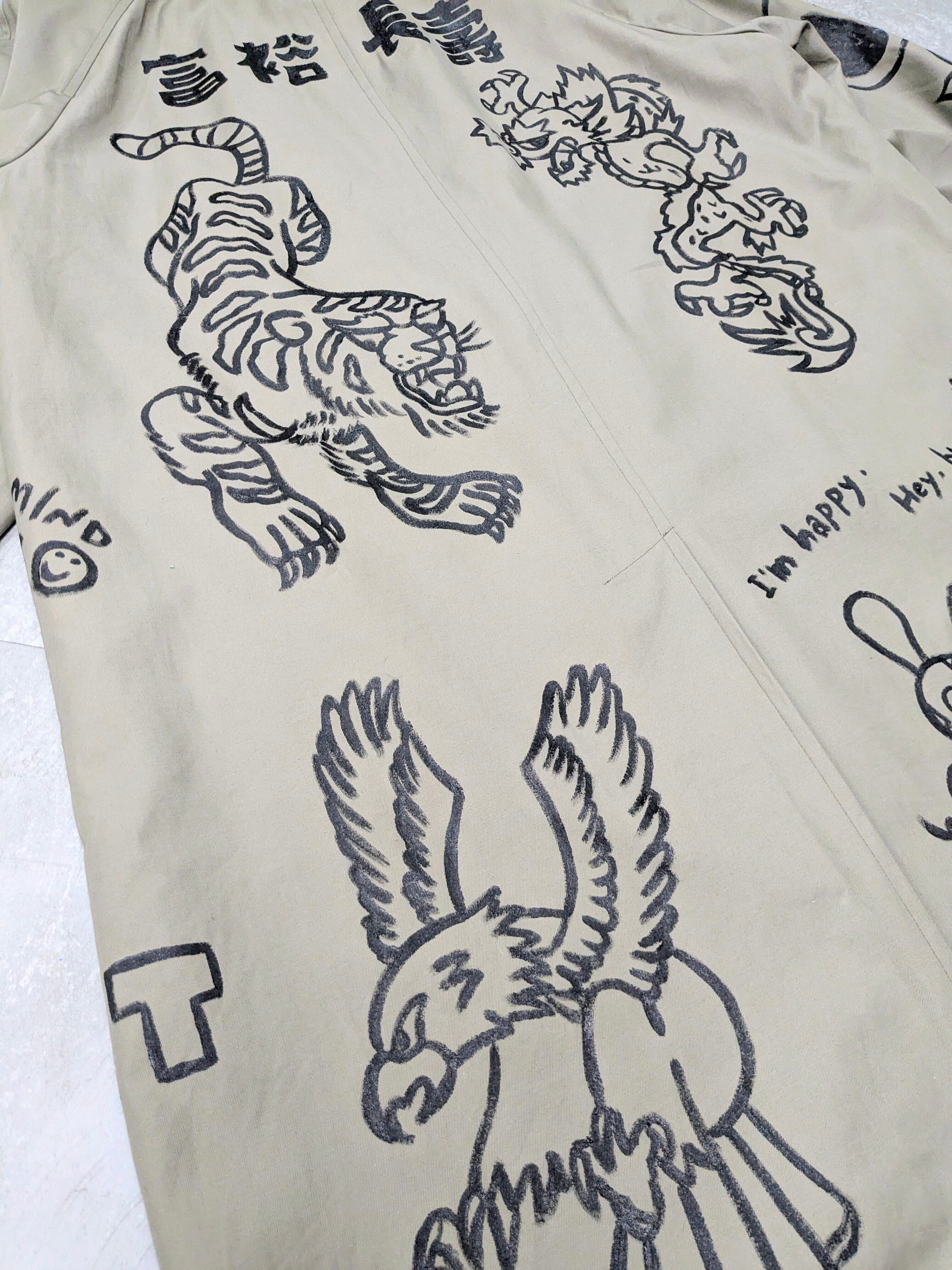 ライナー付きステンカラーコートにイラストを加えています。メモリアル要素もありつつ、どこか見たことあるようなキャラクターがいたりととても可愛い1枚。あえて少しカスレさせることで、墨で描いた雰囲気で日本画の感じも彷彿させるデザイン。ライナー取り外し可能のため、3シーズンと長い期間お使いいただけます。手描きのため唯一無二の一点物となります。