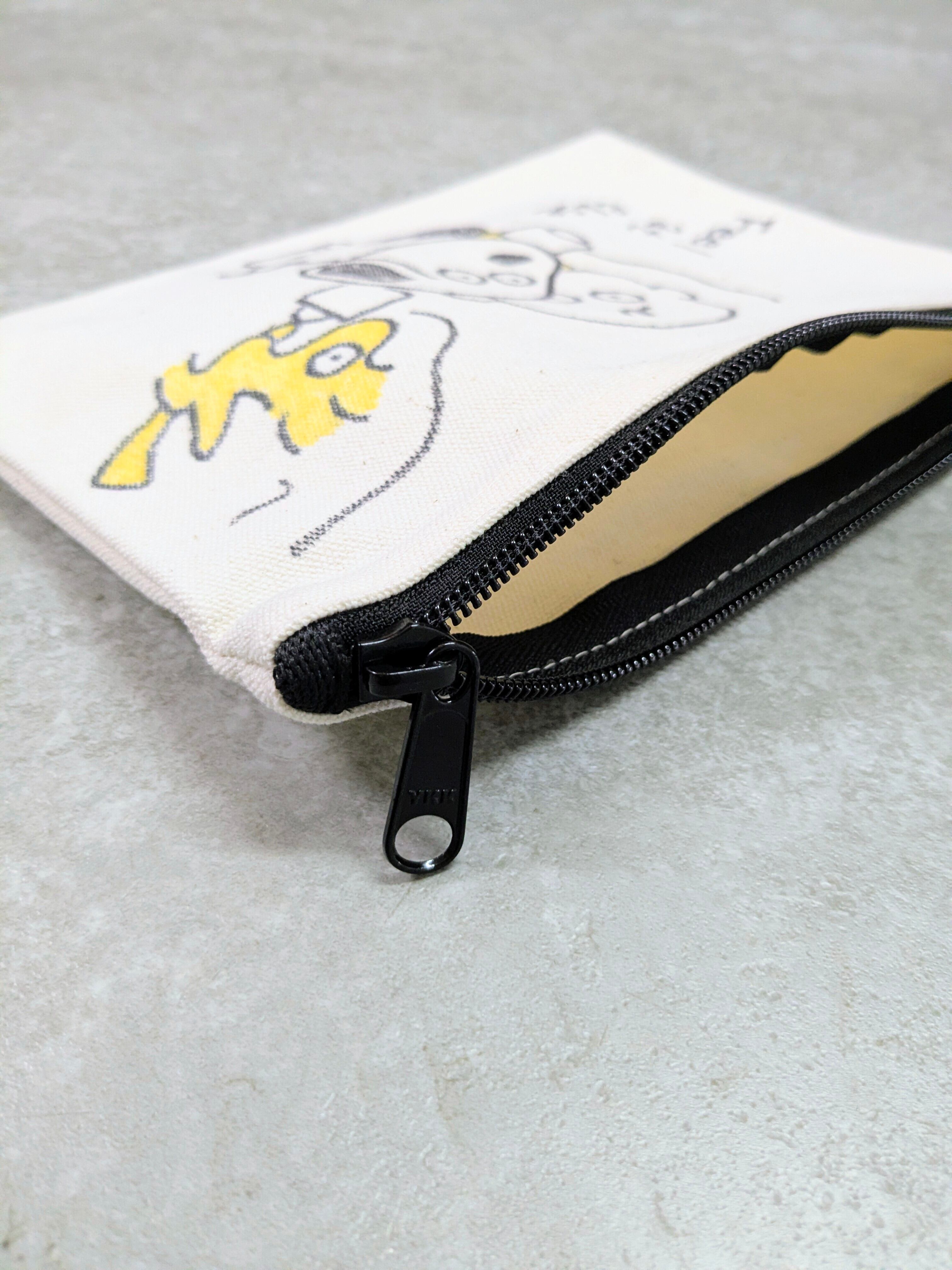 キャンバスのポーチにイラストを加えています。ジップで開閉でき、化粧品、ちょっとした小物をしまうのにちょうどいいアイテム。メモリアルの要素があり、どこか見たことあるキャラクターがいたりと、とにかく可愛いアイテム。全て手作業になるので、唯一無二の一点物となります。