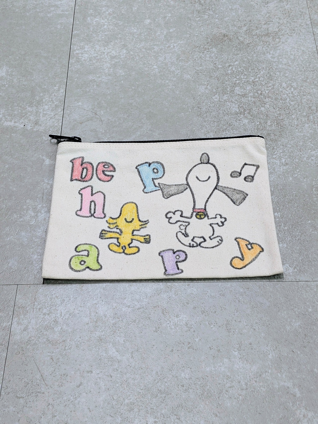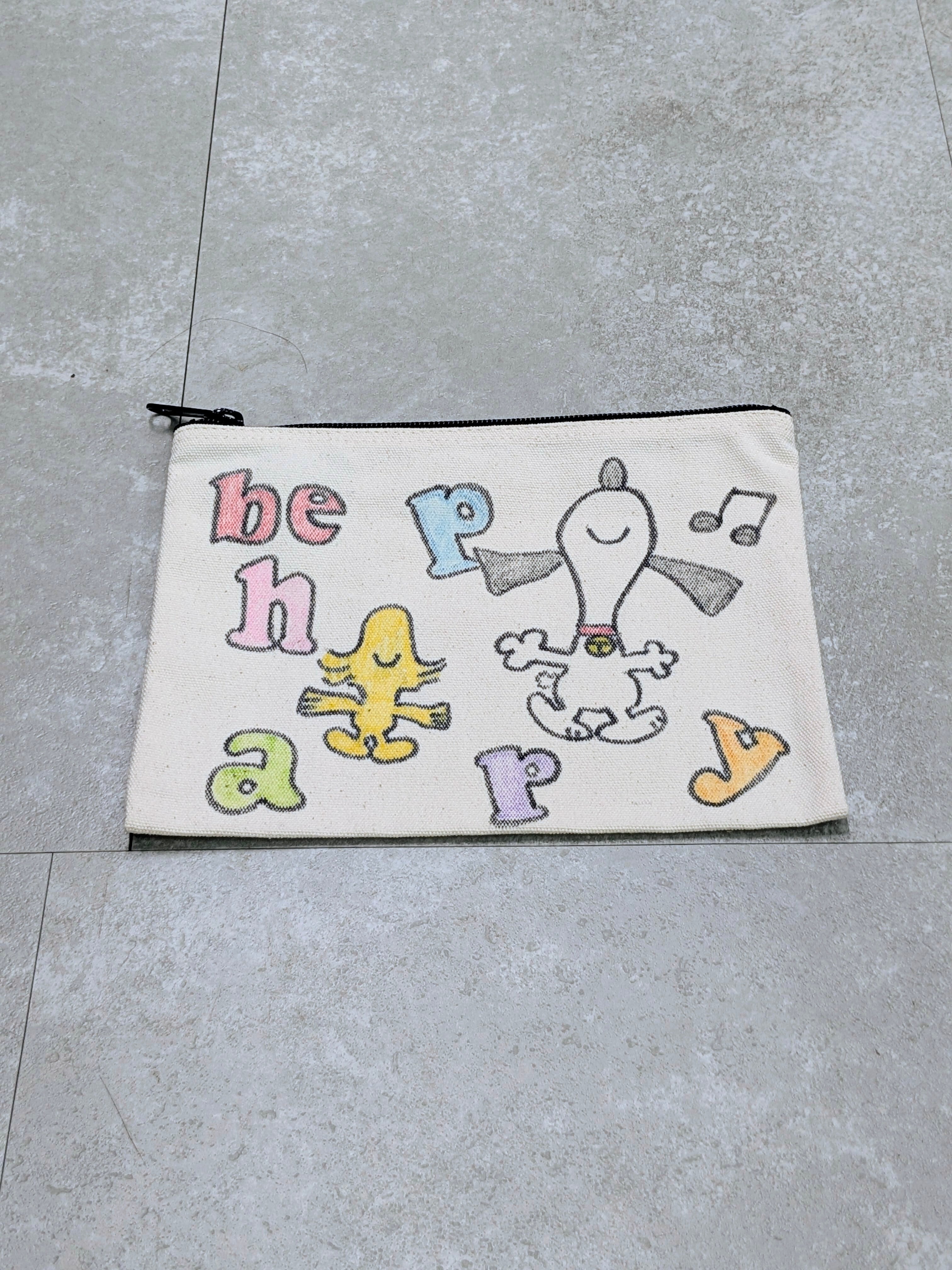 キャンバスのポーチにイラストを加えています。ジップで開閉でき、化粧品、ちょっとした小物をしまうのにちょうどいいアイテム。メモリアルの要素があり、どこか見たことあるキャラクターがいたりと、とにかく可愛いアイテム。全て手作業になるので、唯一無二の一点物となります。