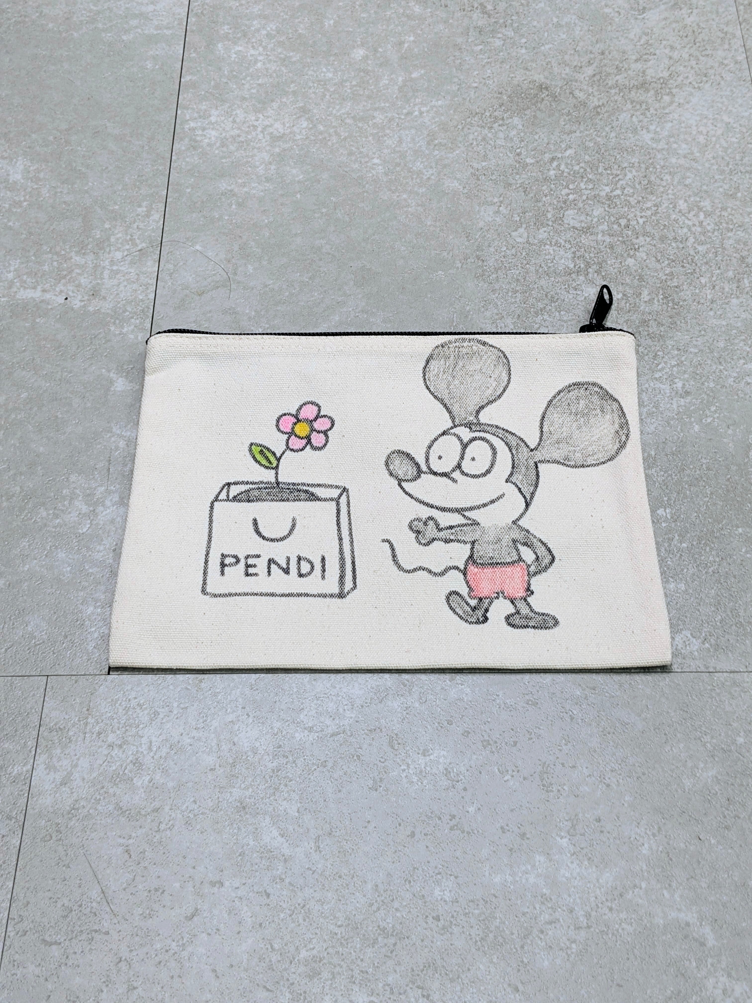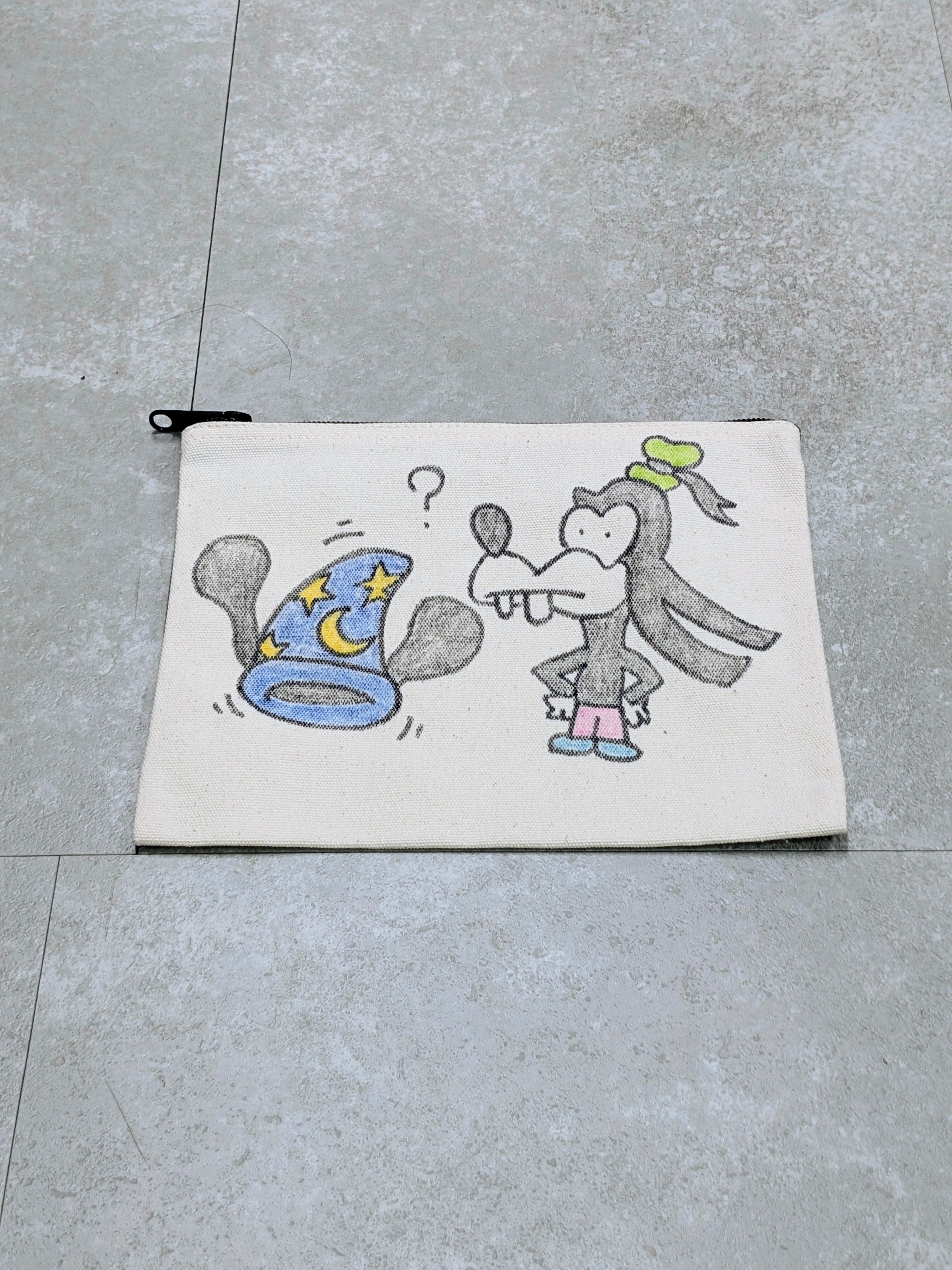キャンバスのポーチにイラストを加えています。ジップで開閉でき、化粧品、ちょっとした小物をしまうのにちょうどいいアイテム。メモリアルの要素があり、どこか見たことあるキャラクターがいたりと、とにかく可愛いアイテム。全て手作業になるので、唯一無二の一点物となります。
