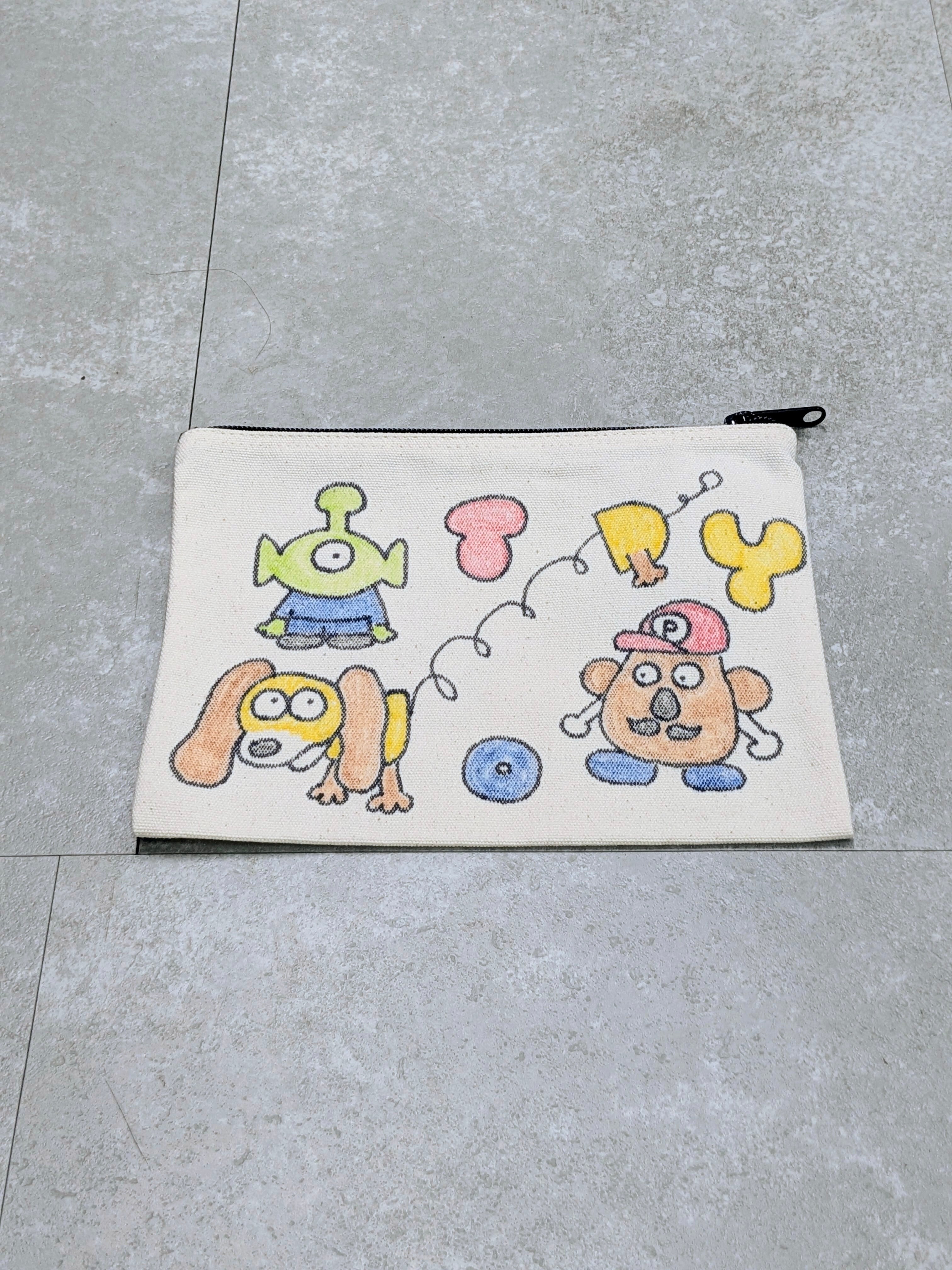キャンバスのポーチにイラストを加えています。ジップで開閉でき、化粧品、ちょっとした小物をしまうのにちょうどいいアイテム。メモリアルの要素があり、どこか見たことあるキャラクターがいたりと、とにかく可愛いアイテム。全て手作業になるので、唯一無二の一点物となります。