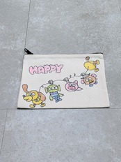 キャンバスのポーチにイラストを加えています。ジップで開閉でき、化粧品、ちょっとした小物をしまうのにちょうどいいアイテム。メモリアルの要素があり、どこか見たことあるキャラクターがいたりと、とにかく可愛いアイテム。全て手作業になるので、唯一無二の一点物となります。