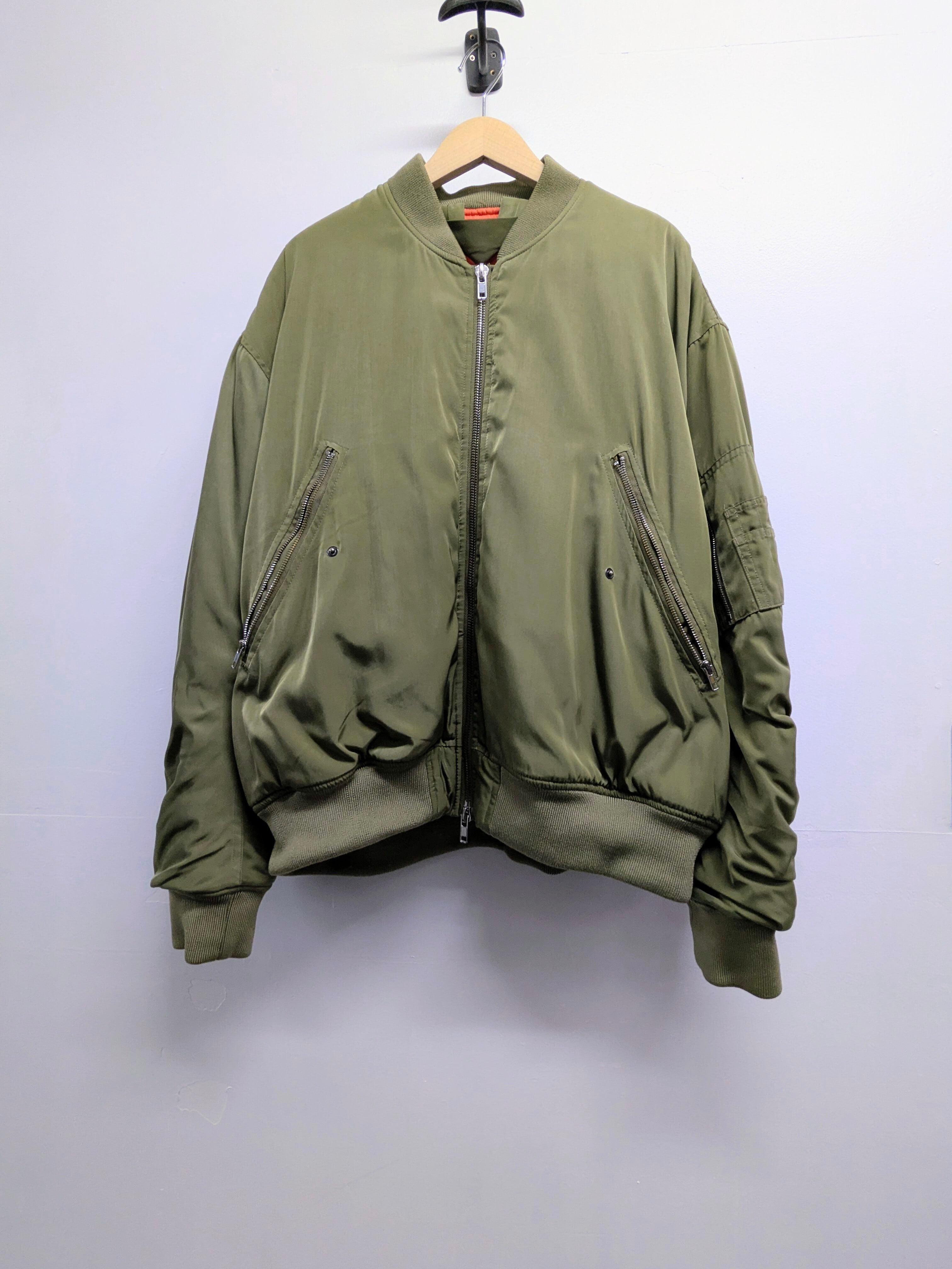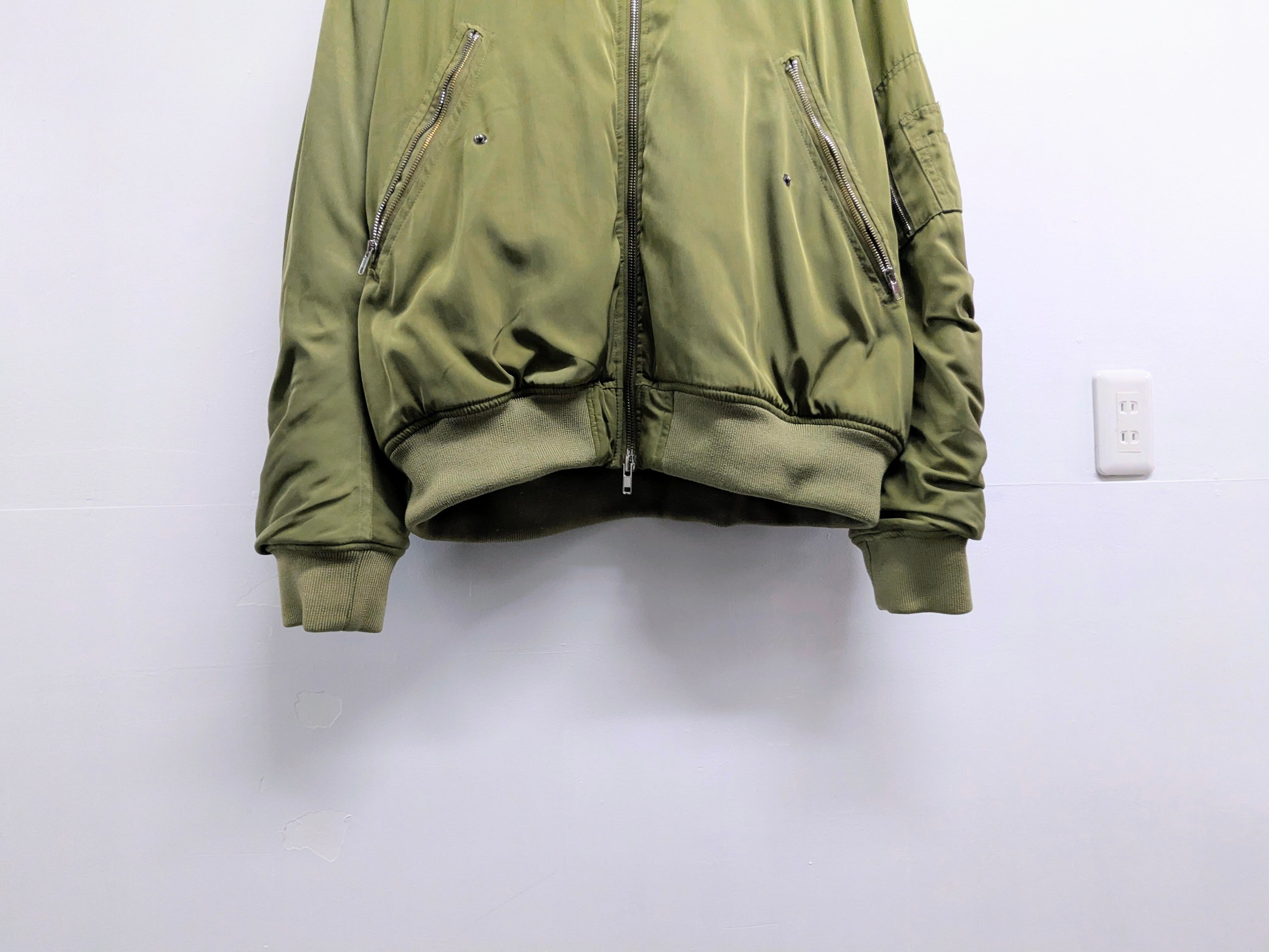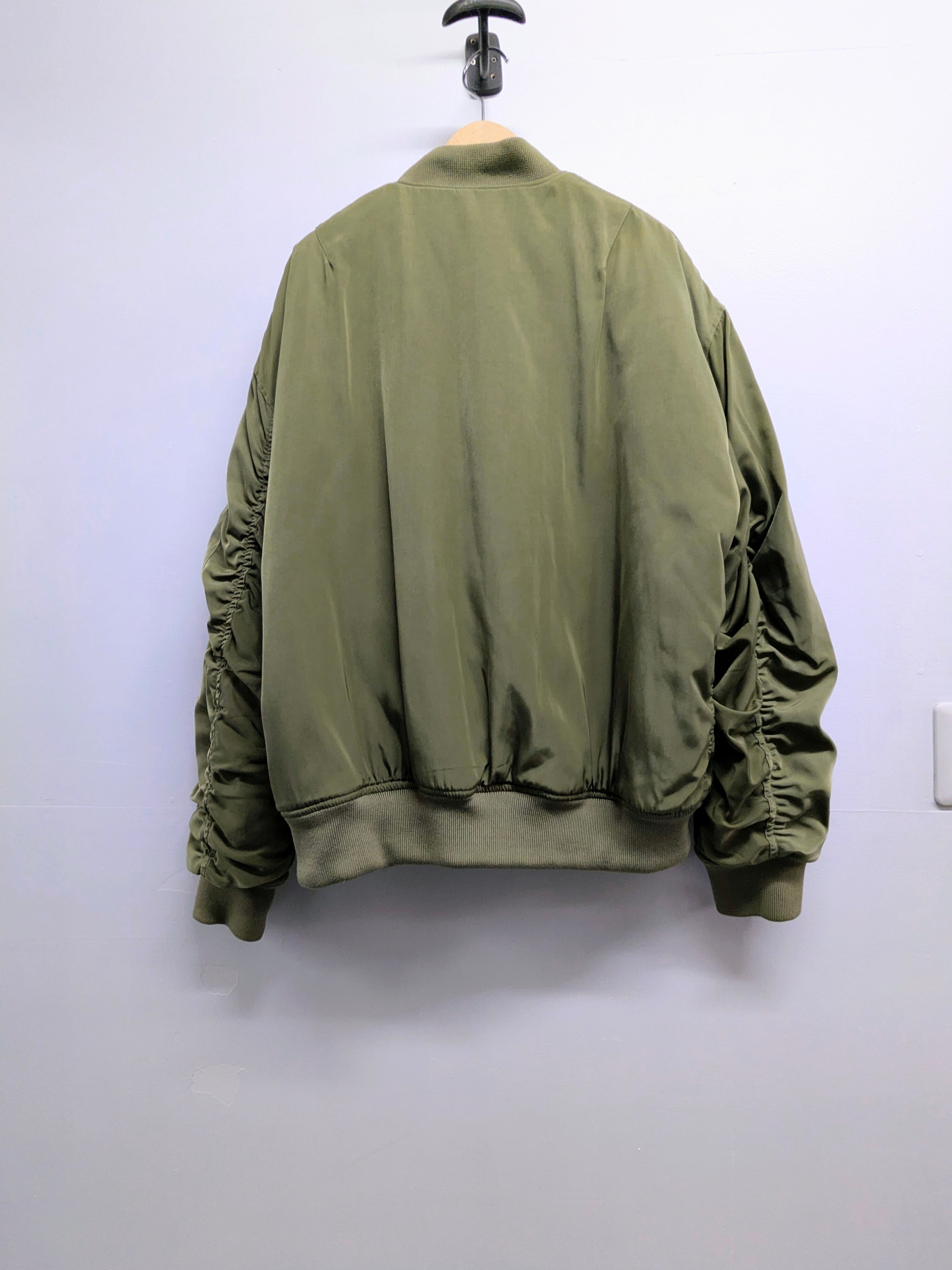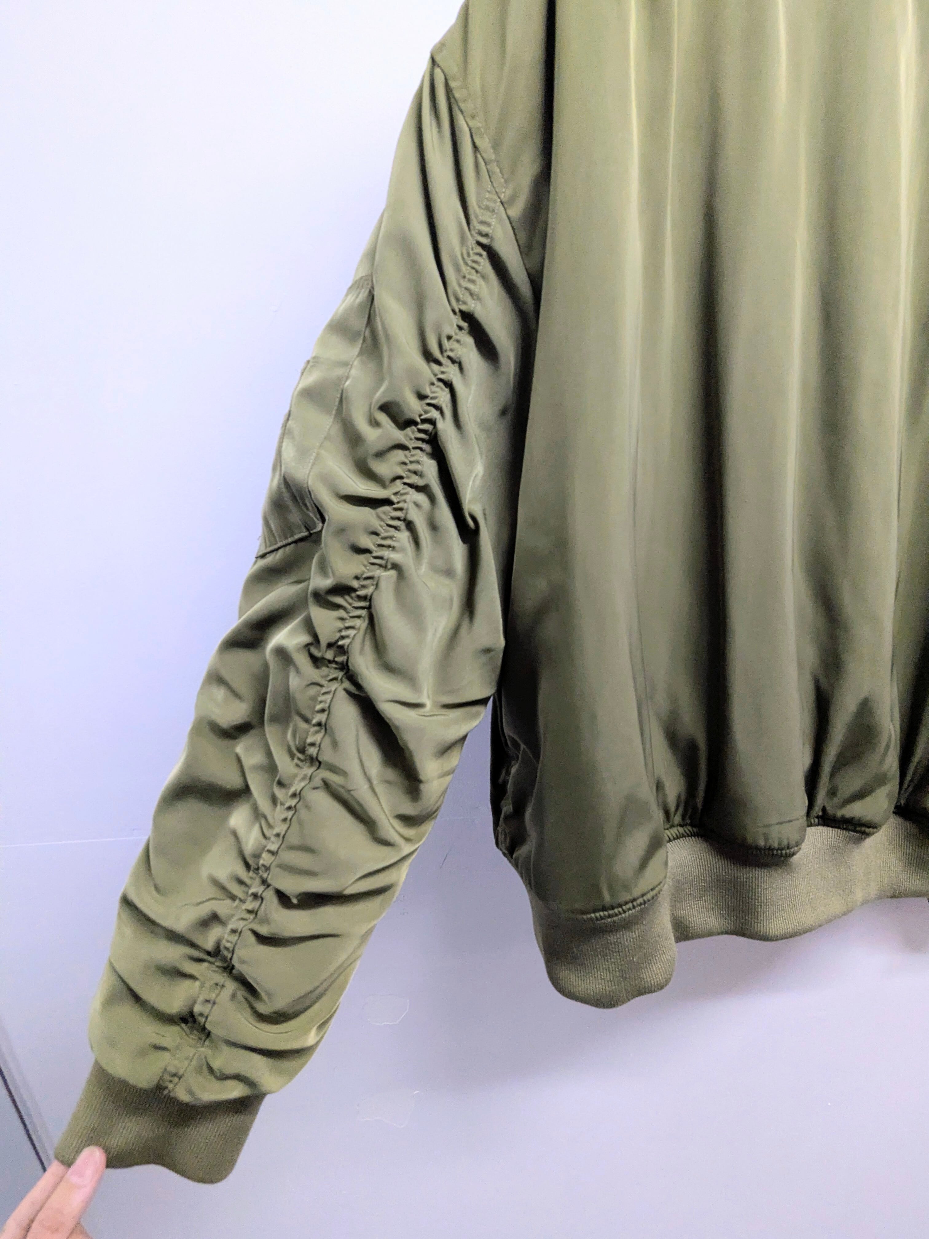 色が少し明るめのグリーンでちょっとマイルドな見た目がする一着。ゆったりとしたシルエットですが、丈が短めなのでバランスよく着ていただけます。女性がダボッと着ても可愛いかと。