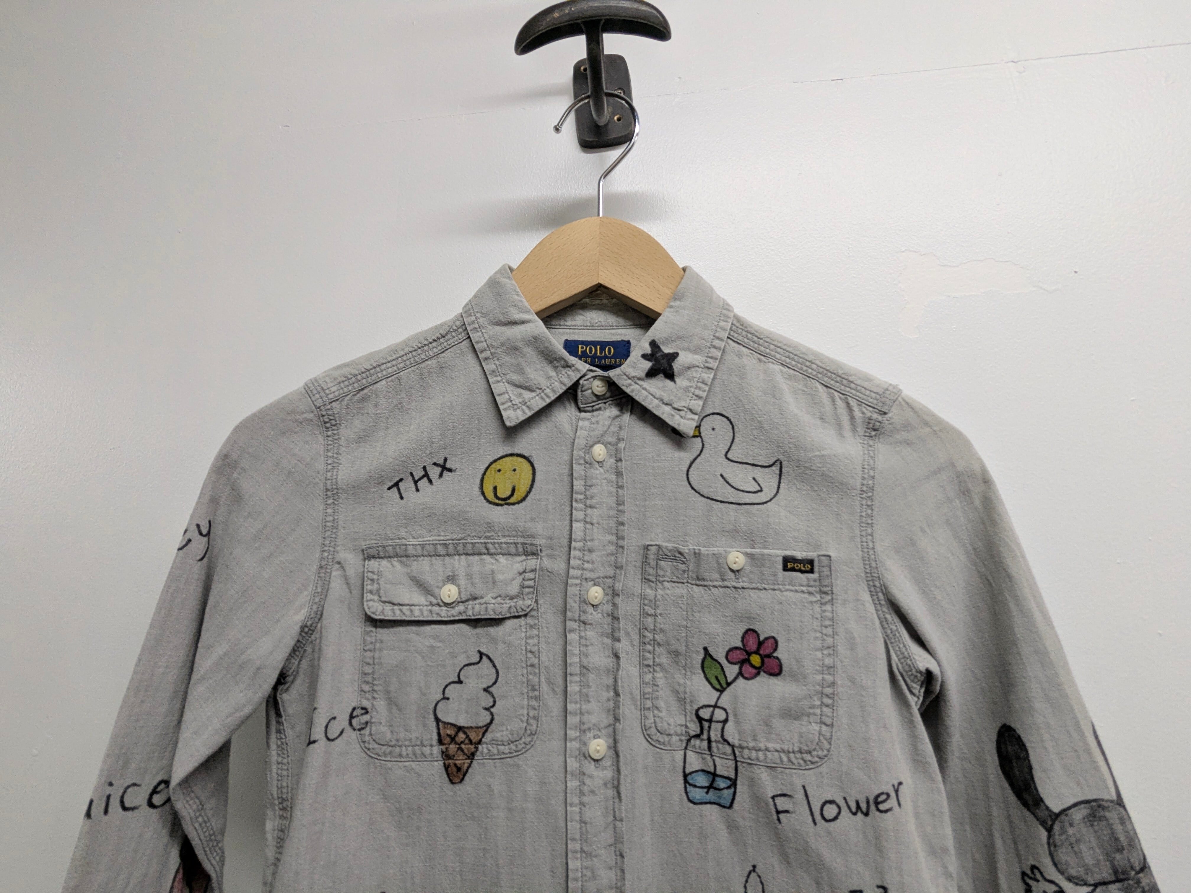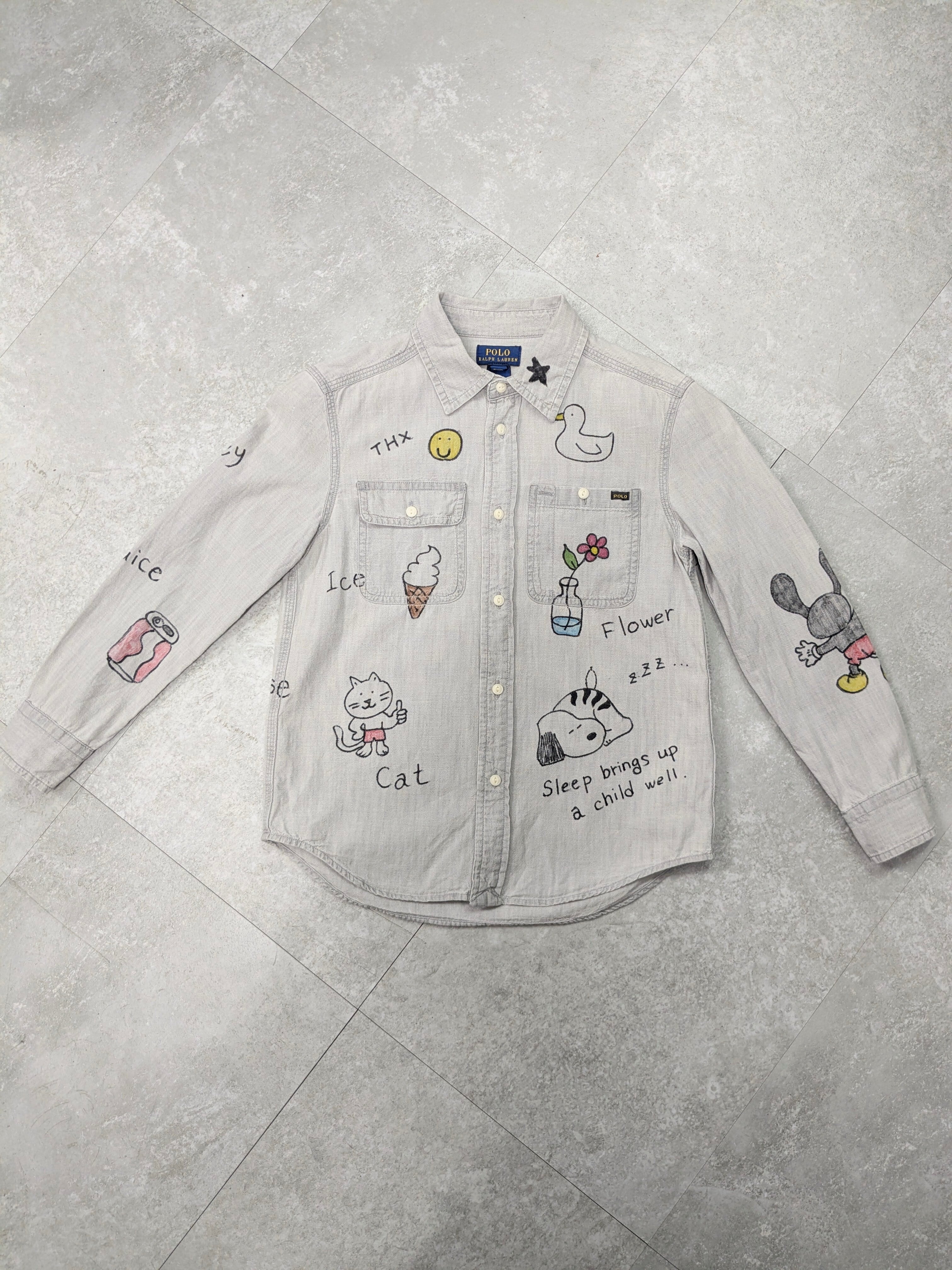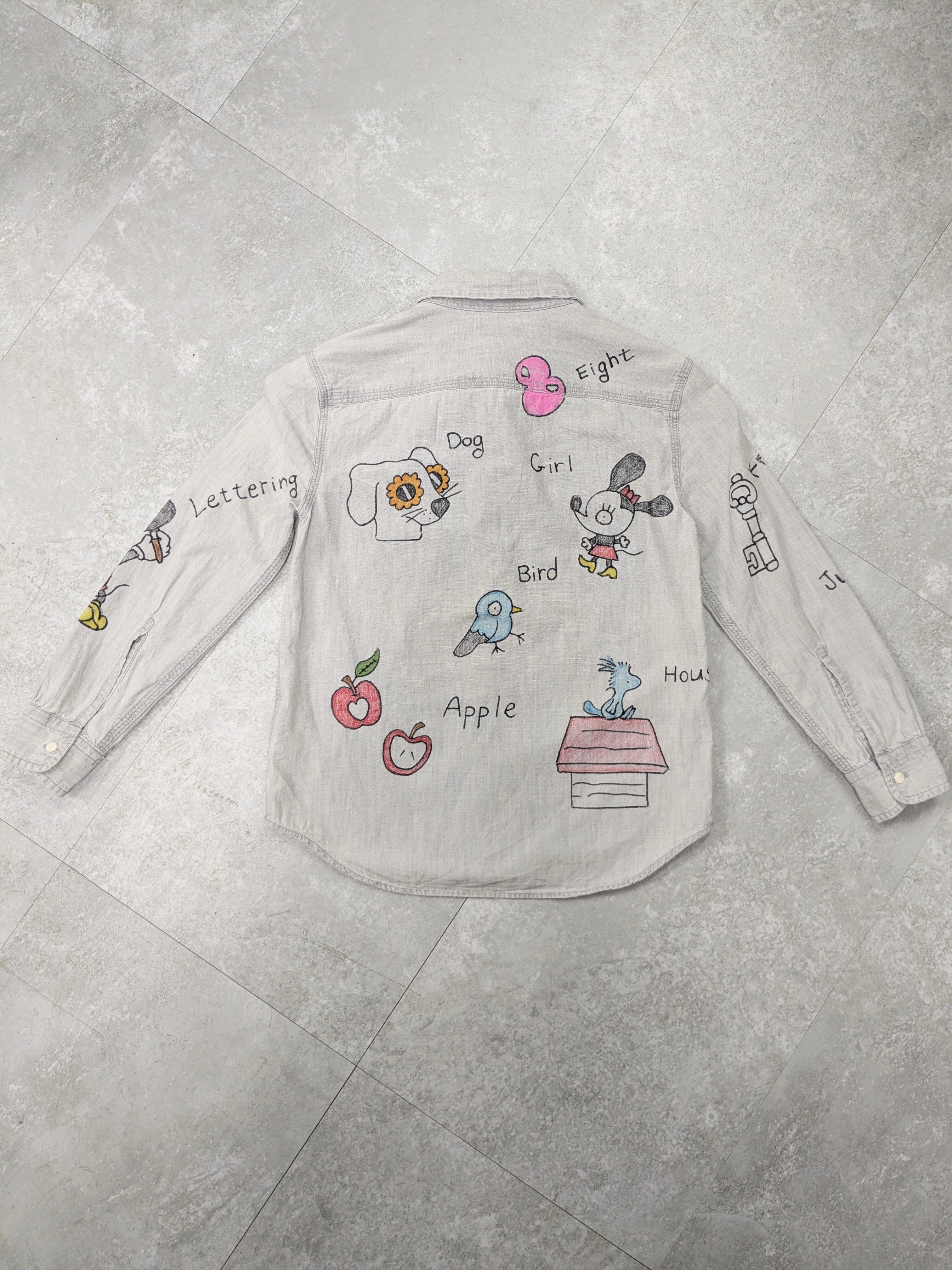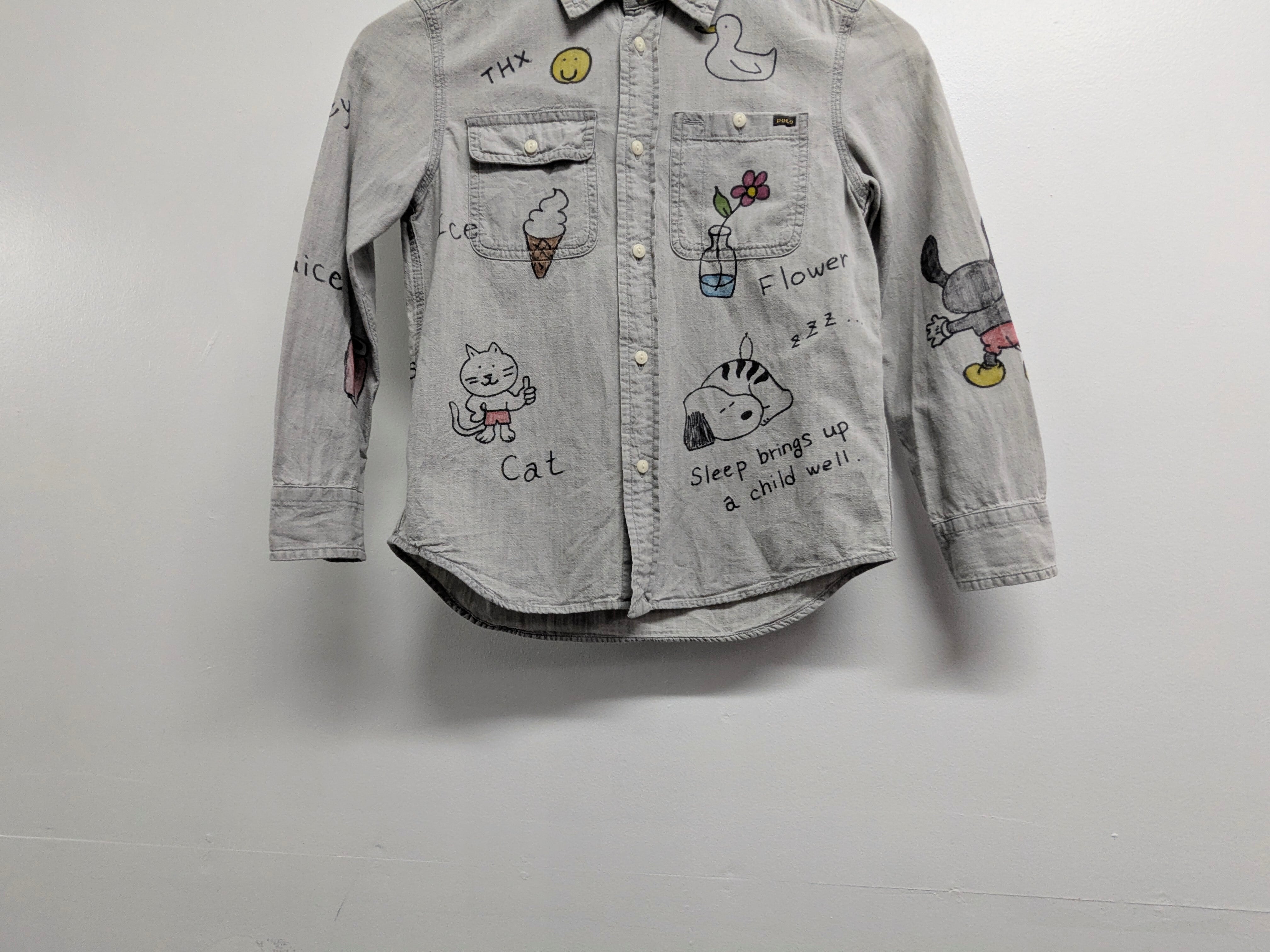 キッズサイズのラルフローレンのシャツを使用しています。1度ウォッシュをかけるためにタグを外していますが、未使用品のモノを使用しています。英単語が、A〜Lまで描いてあり、ちょっとした英語の勉強にも使える一着。唯一無二の一点物となります。