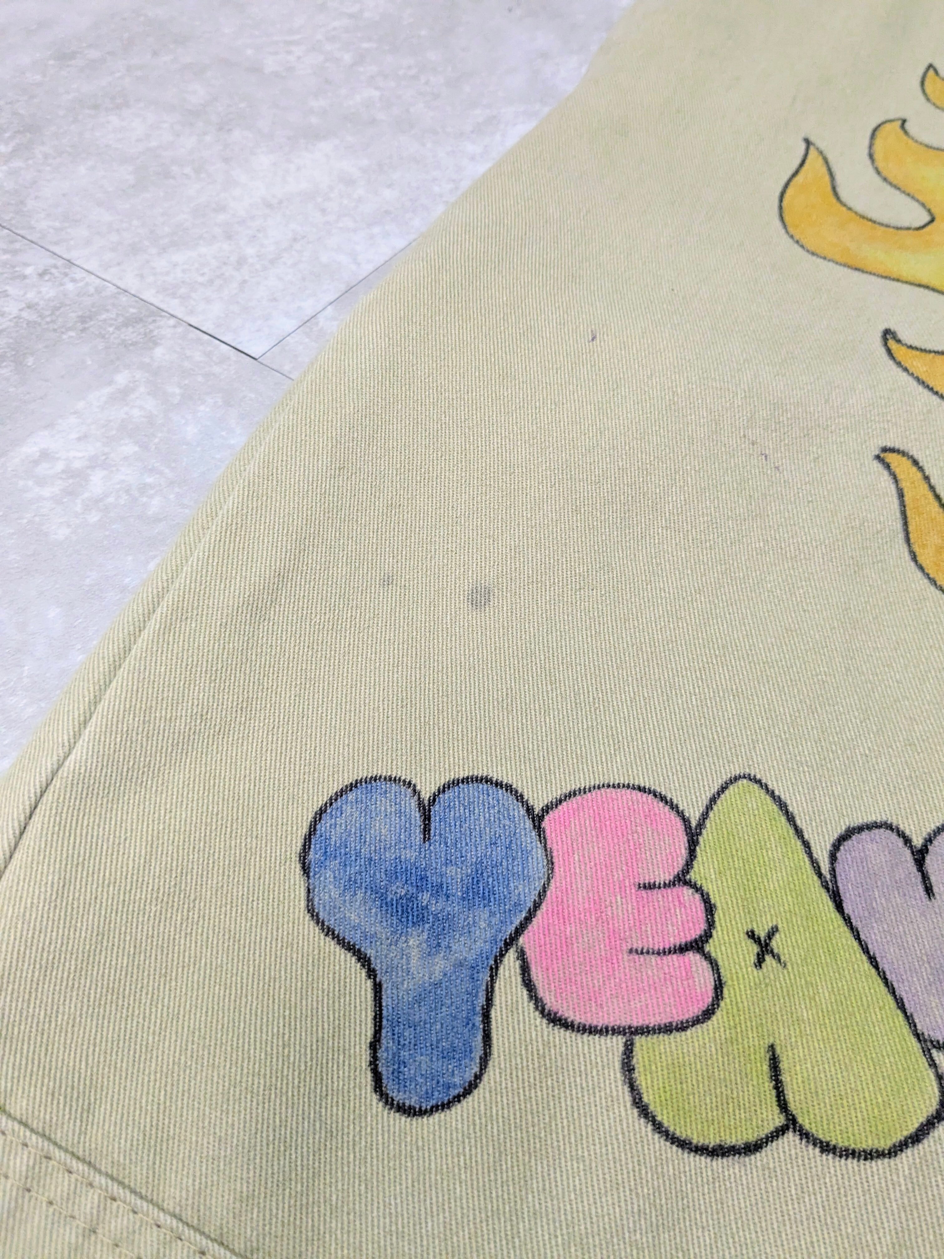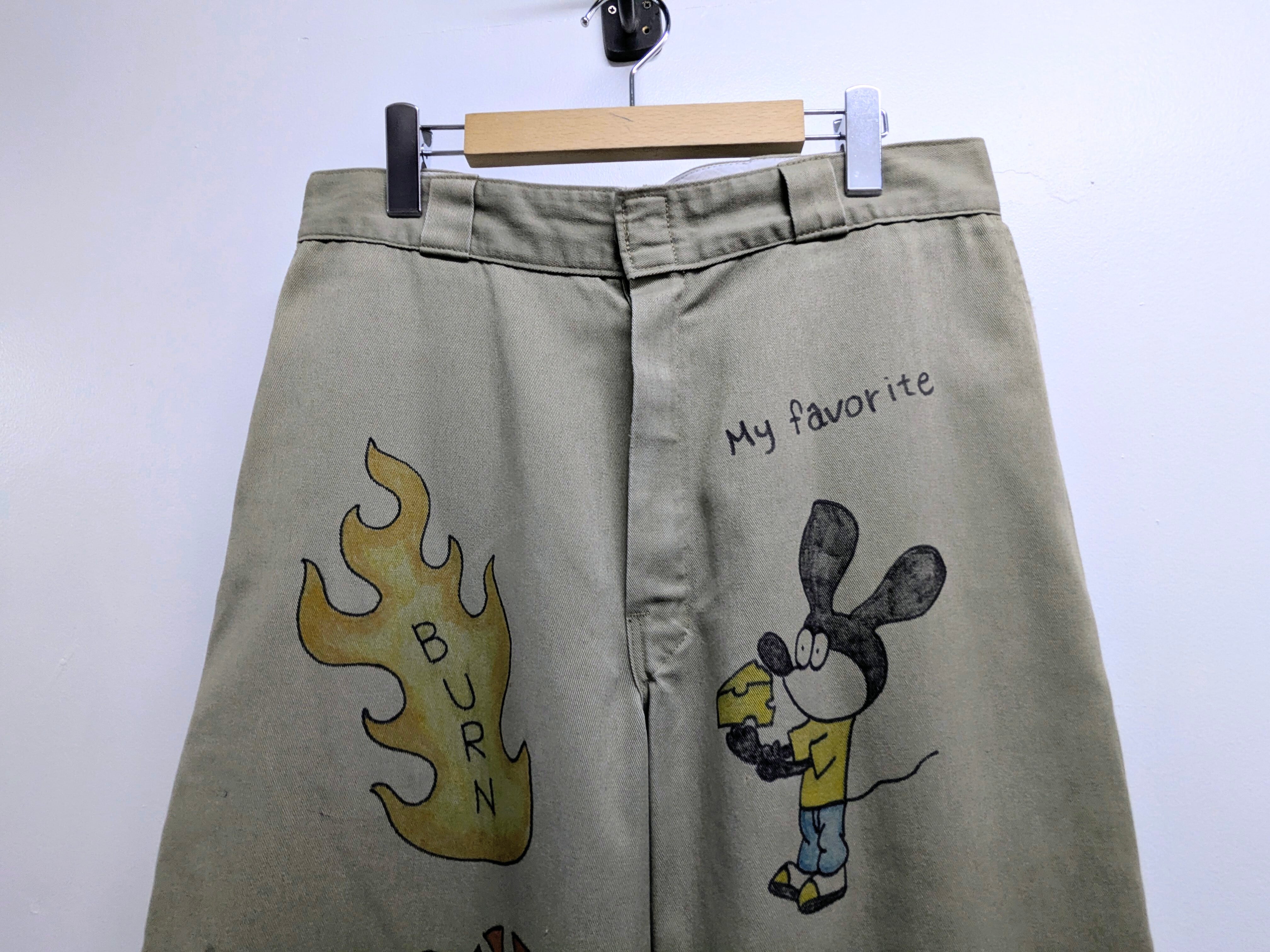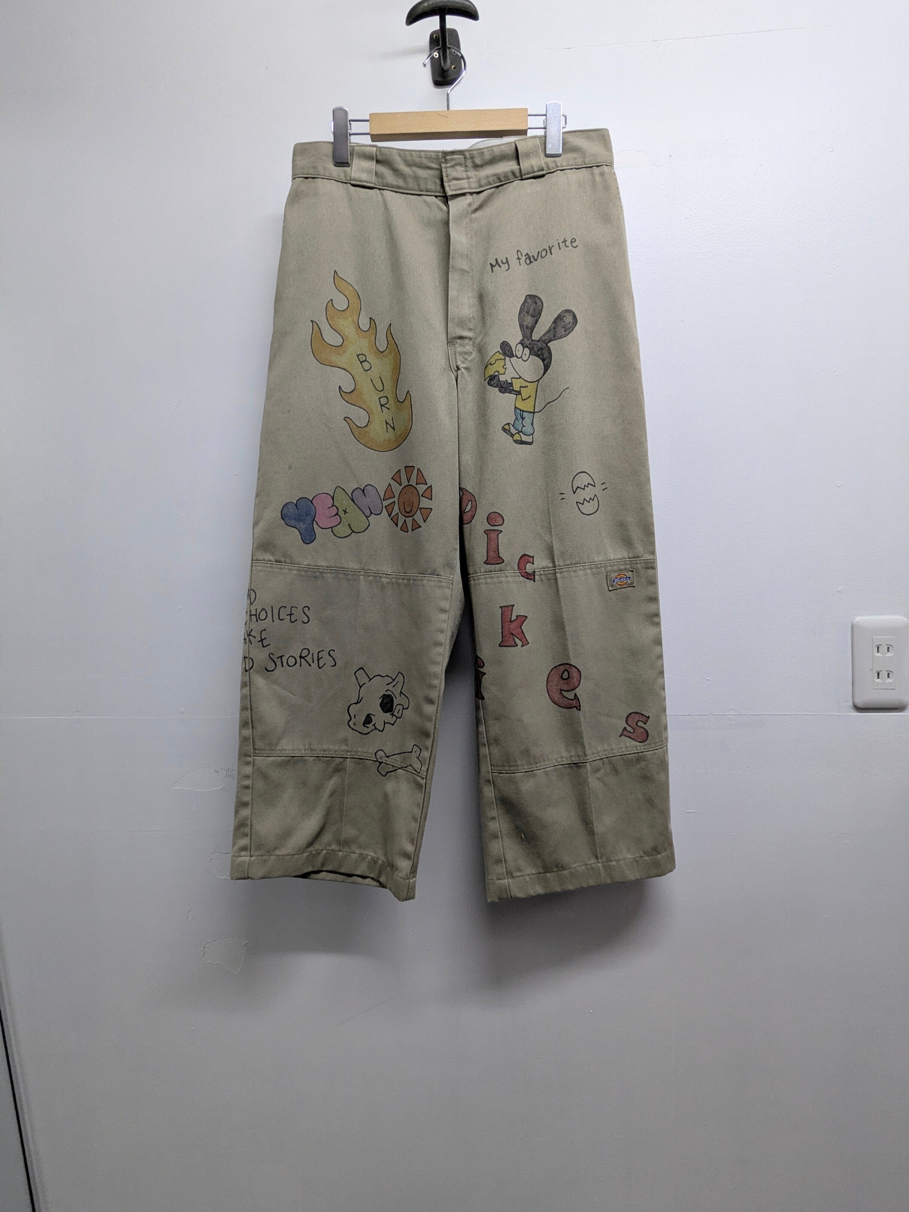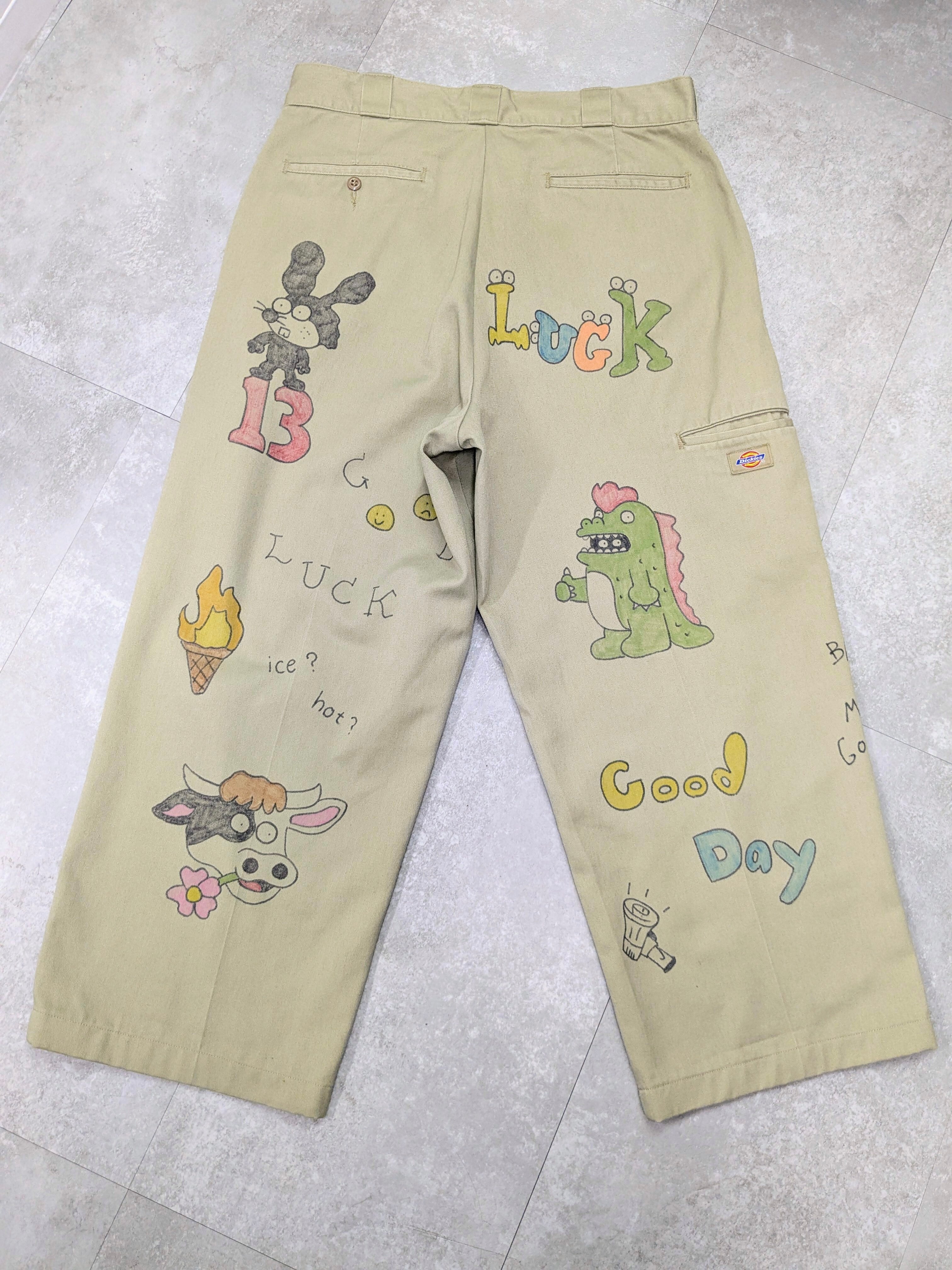 90's〜のDickiesのダブルニーのチノパンを使用しています。元々の汚れ、キズあり。裾も直されています。メモリアル要素もありつつ、どこか見たことあるようなキャラクターがいたりととても可愛いアイテム。手描きのため唯一無二、一点物となります。