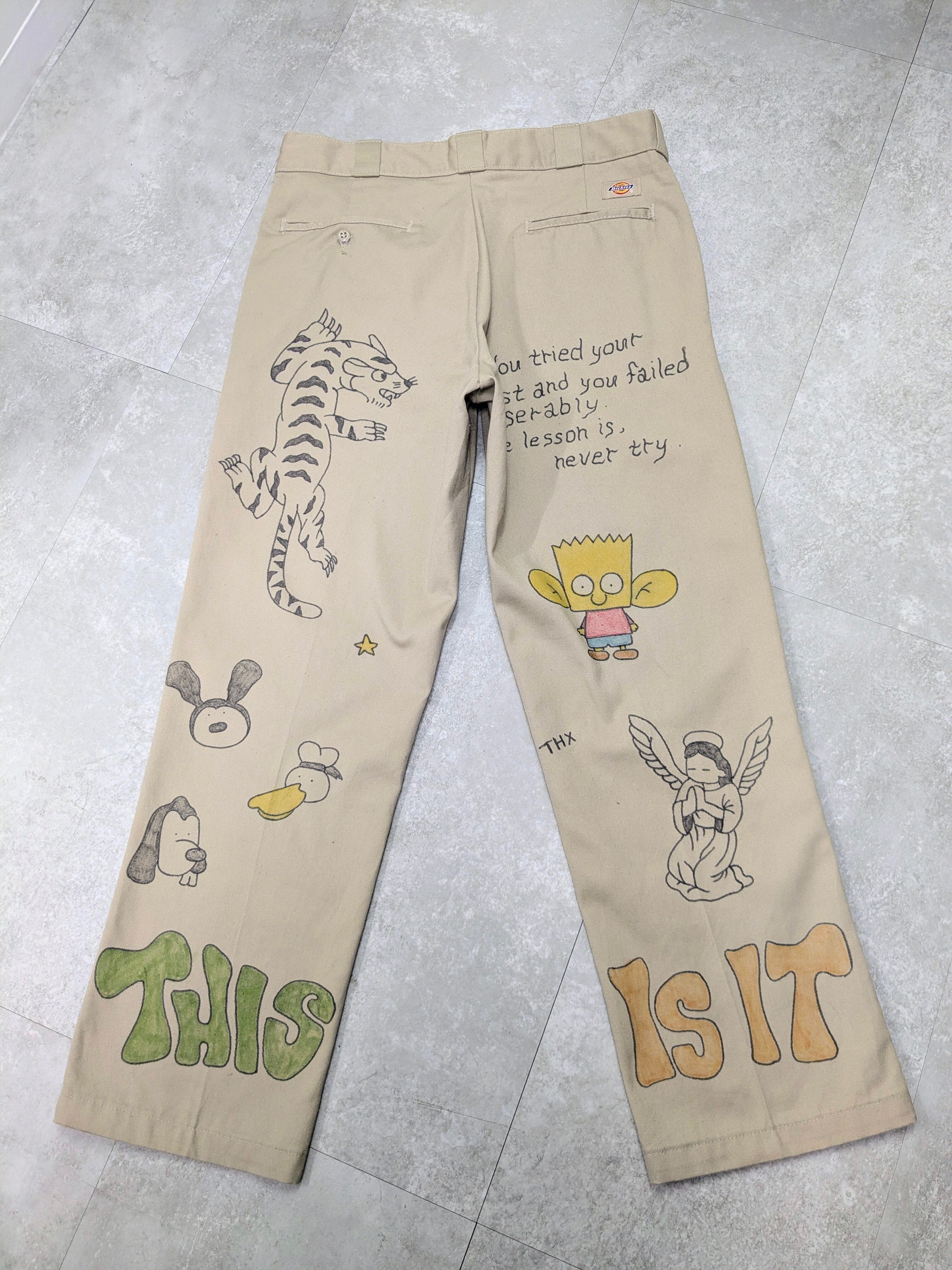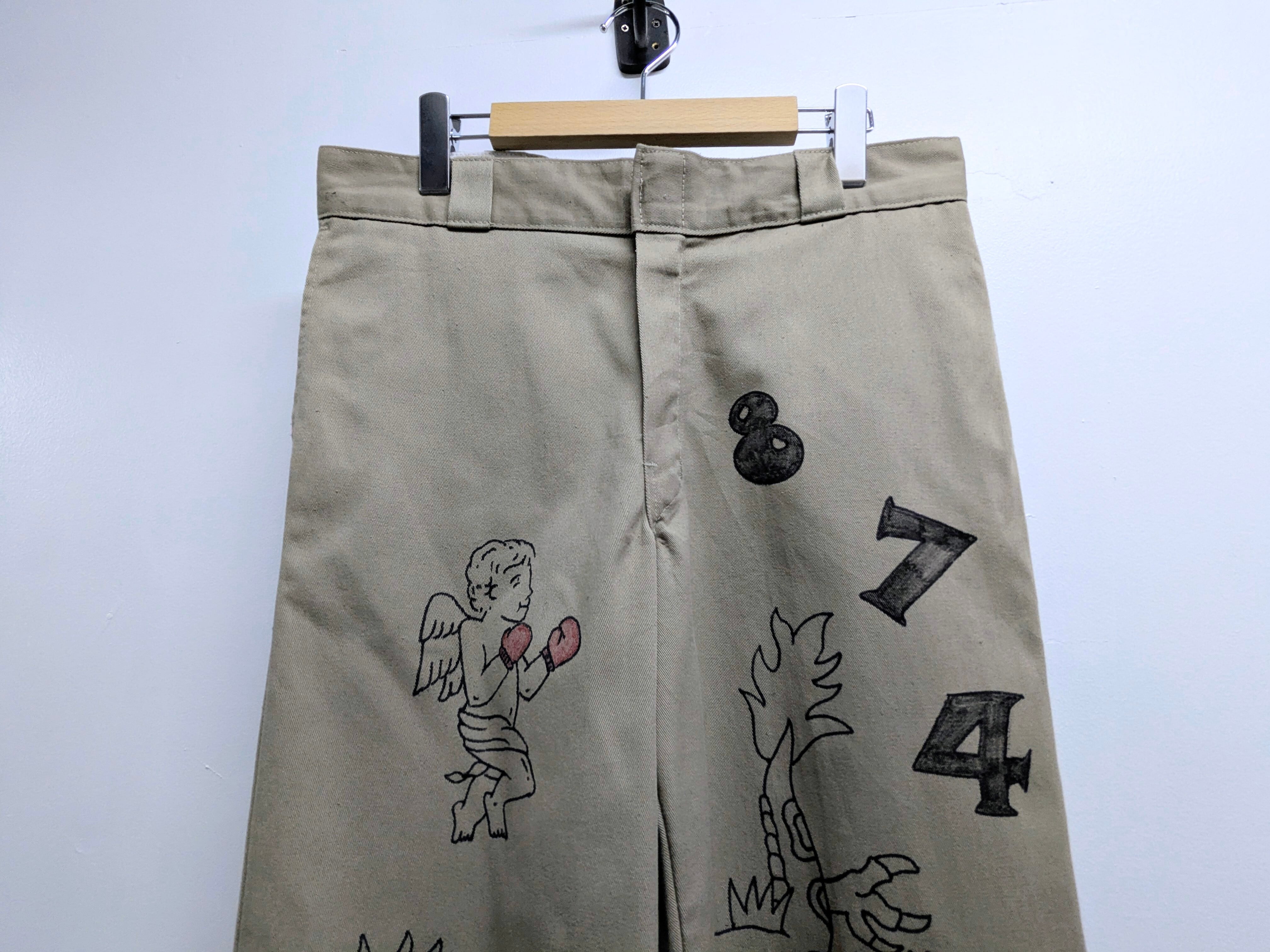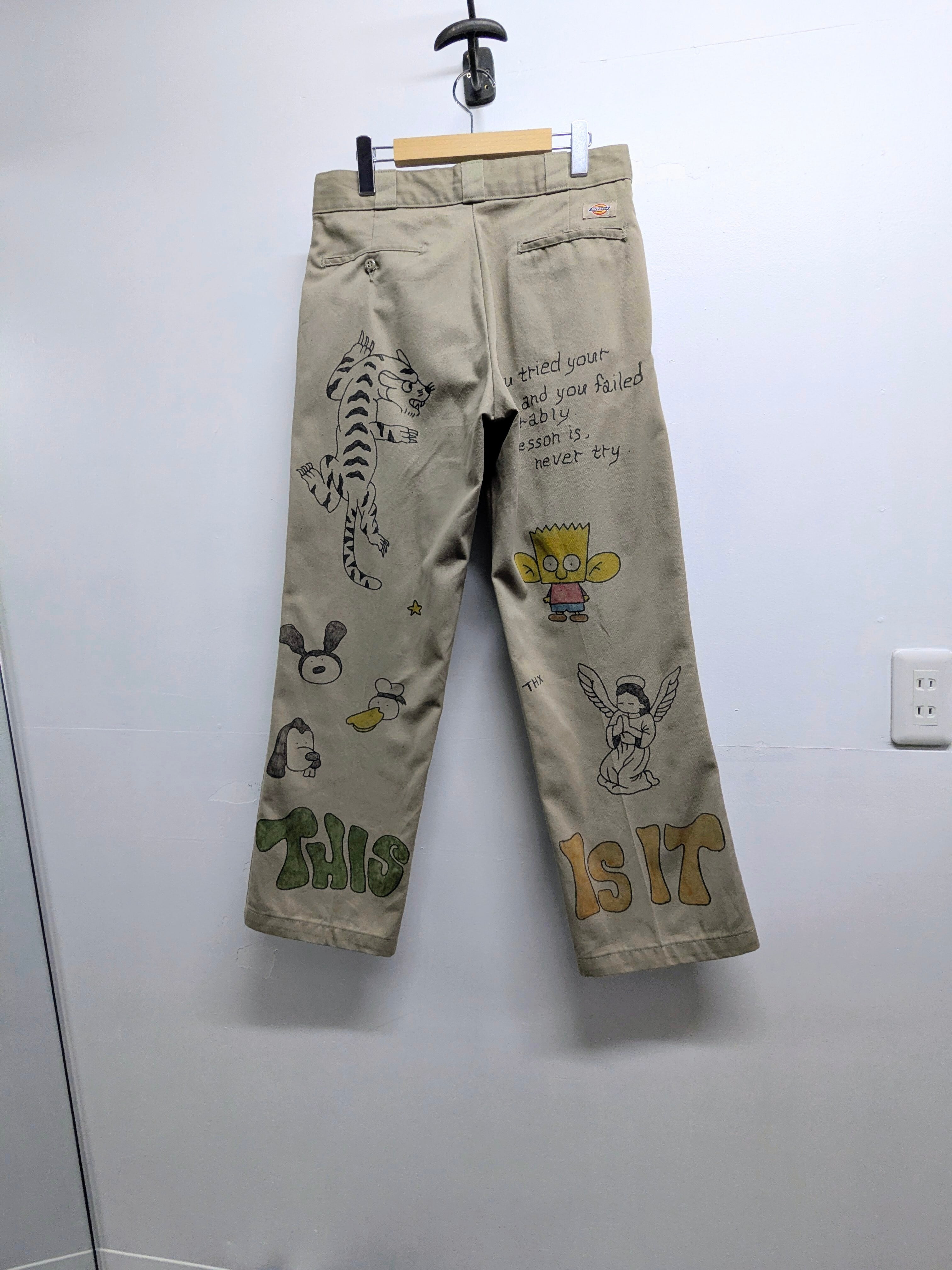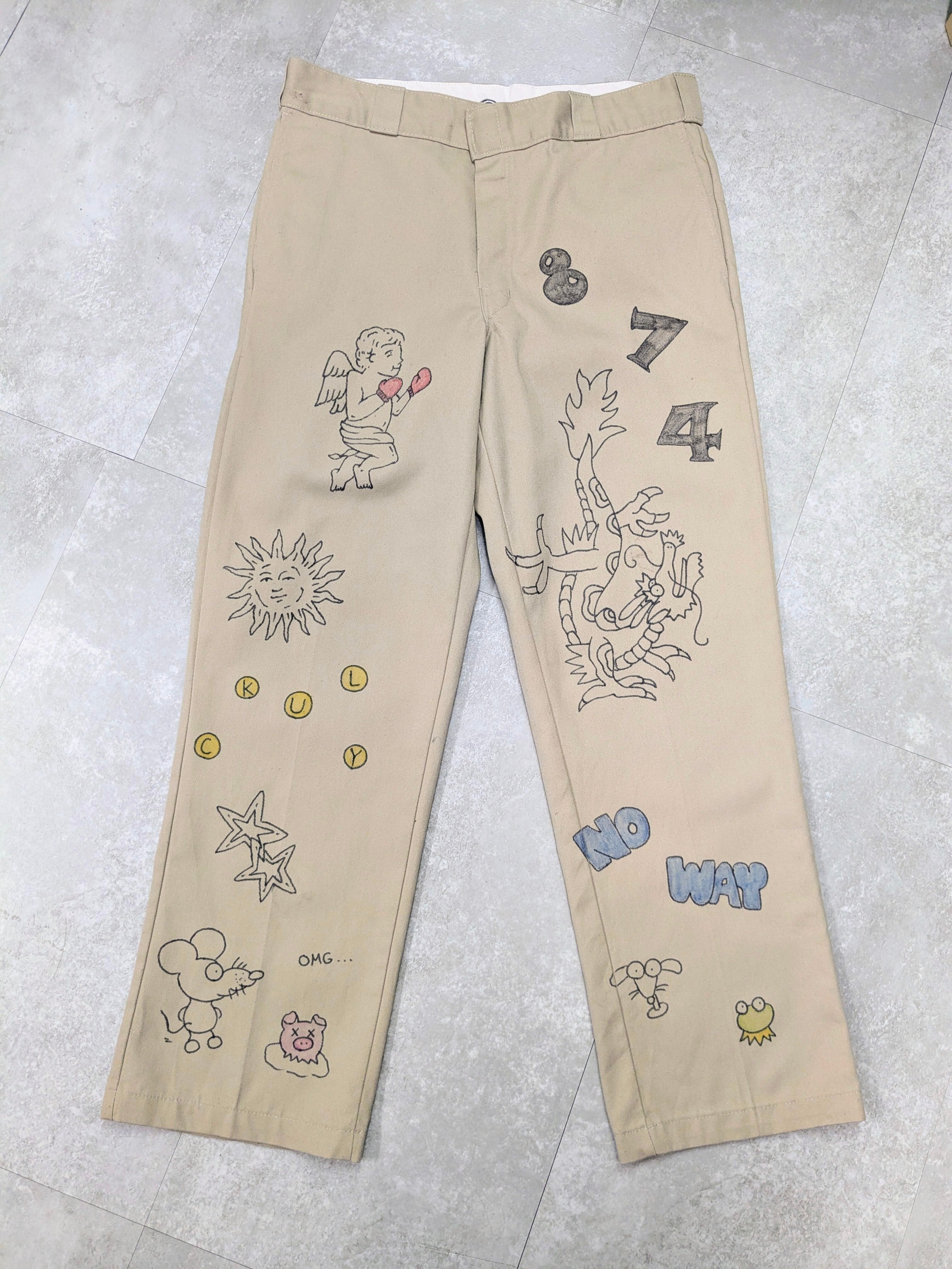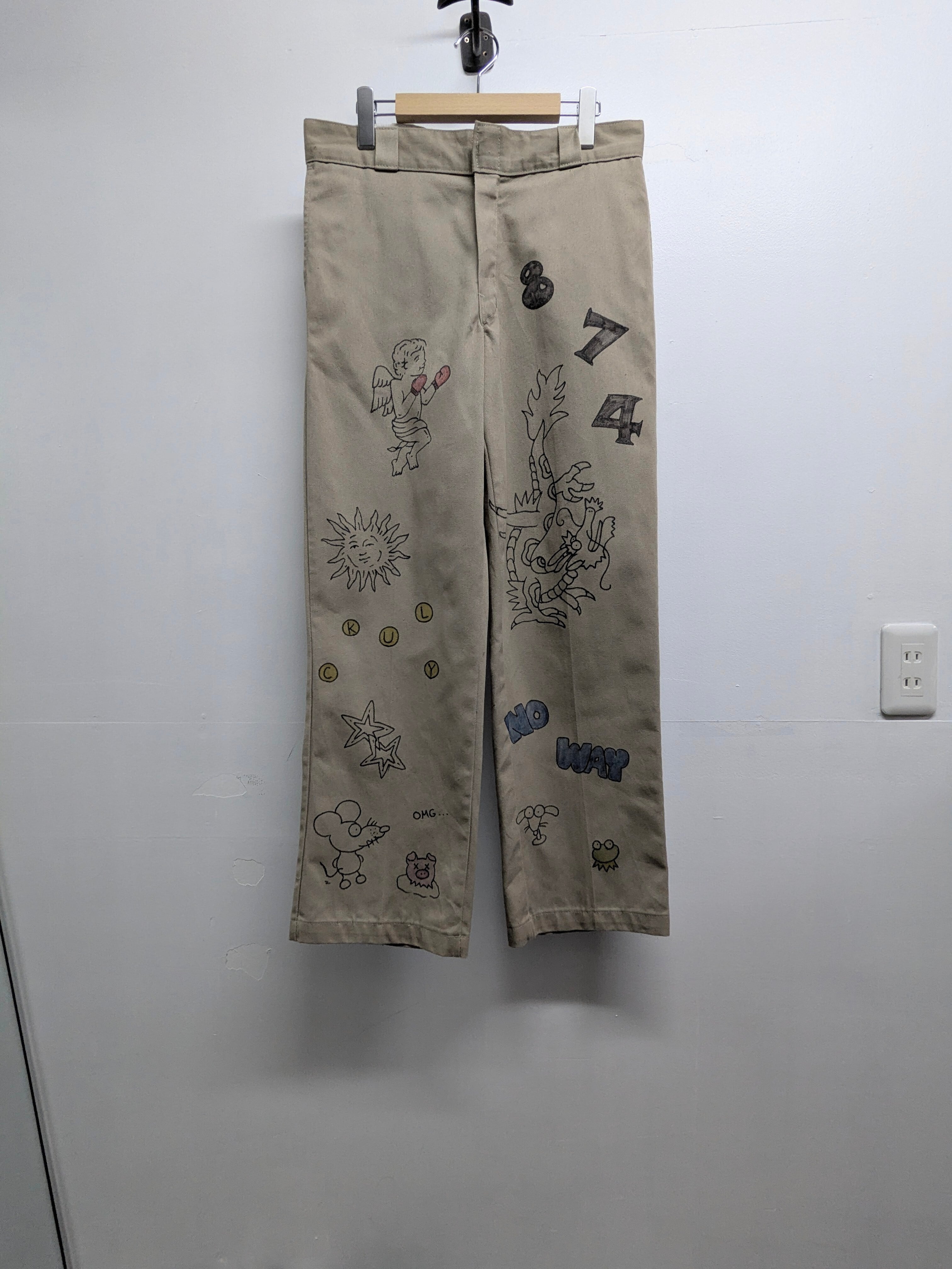 Dickiesのチノパンを使用しています。元々の汚れ、キズあり。メモリアル要素もありつつ、どこか見たことあるようなキャラクターがいたりととても可愛いアイテム。手描きのため唯一無二、一点物となります。