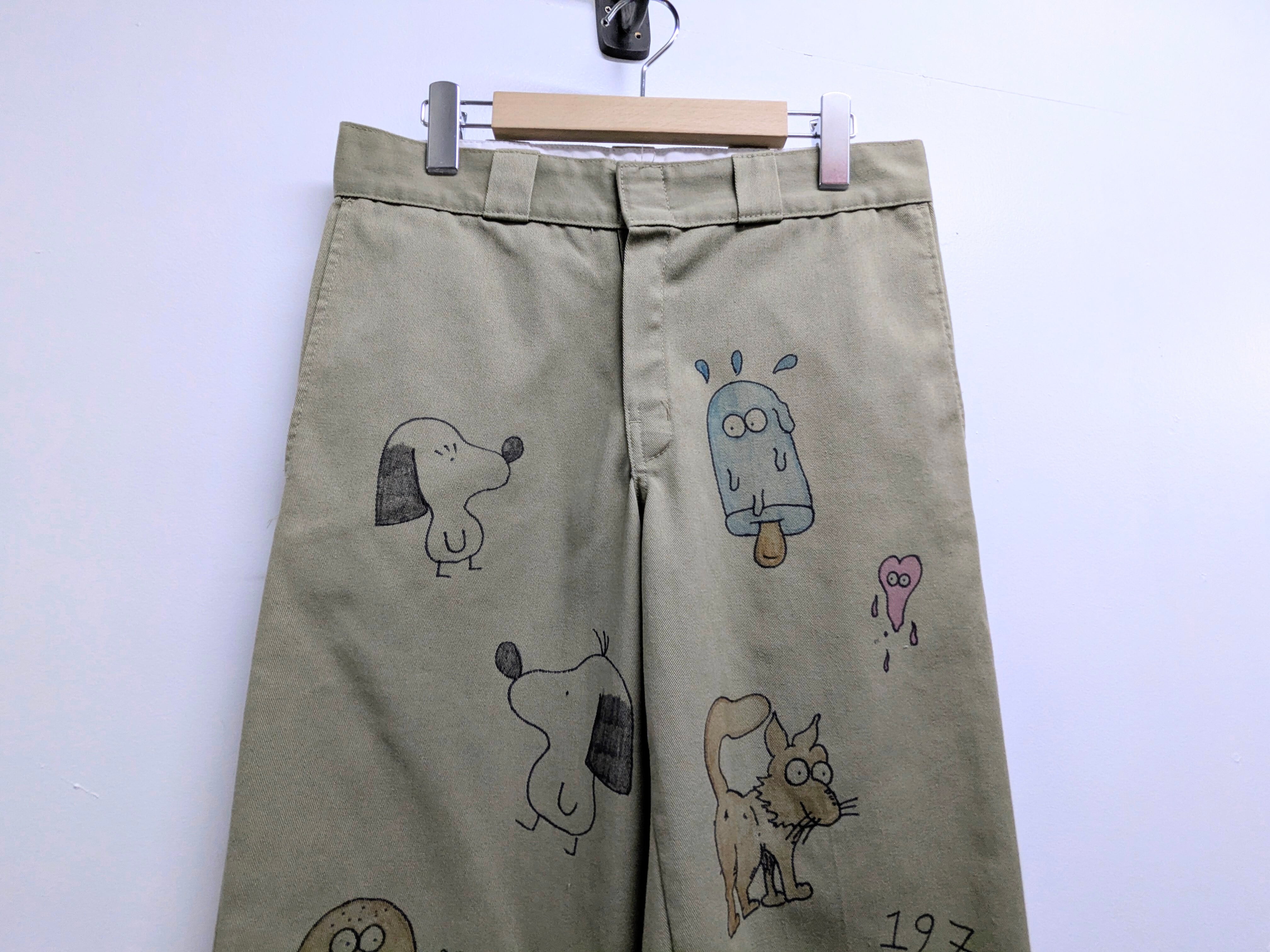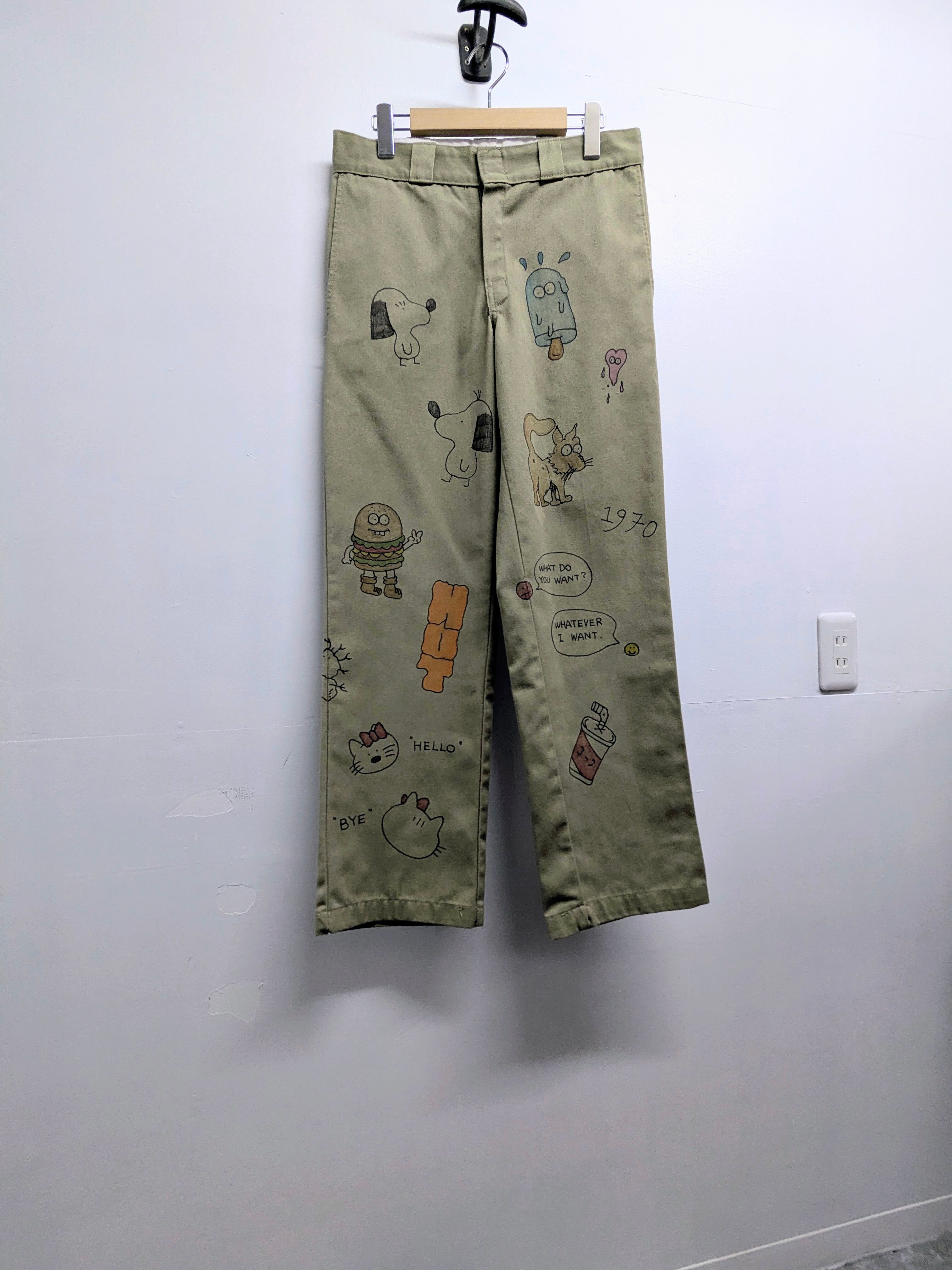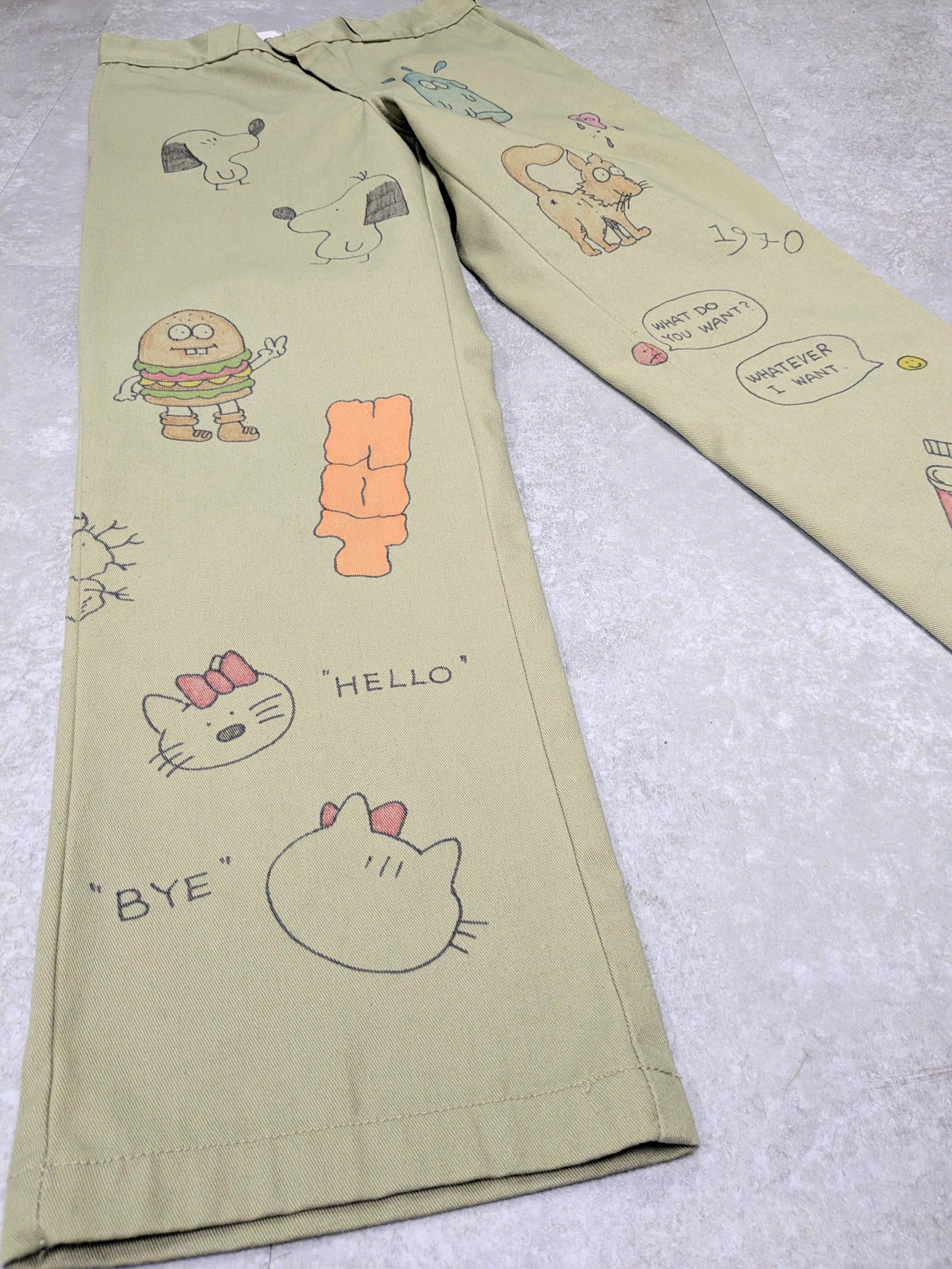90's〜Dickiesのチノパンを使用しています。元々の汚れ、キズあり。メモリアル要素もありつつ、どこか見たことあるようなキャラクターがいたりととても可愛いアイテム。手描きのため唯一無二、一点物となります。