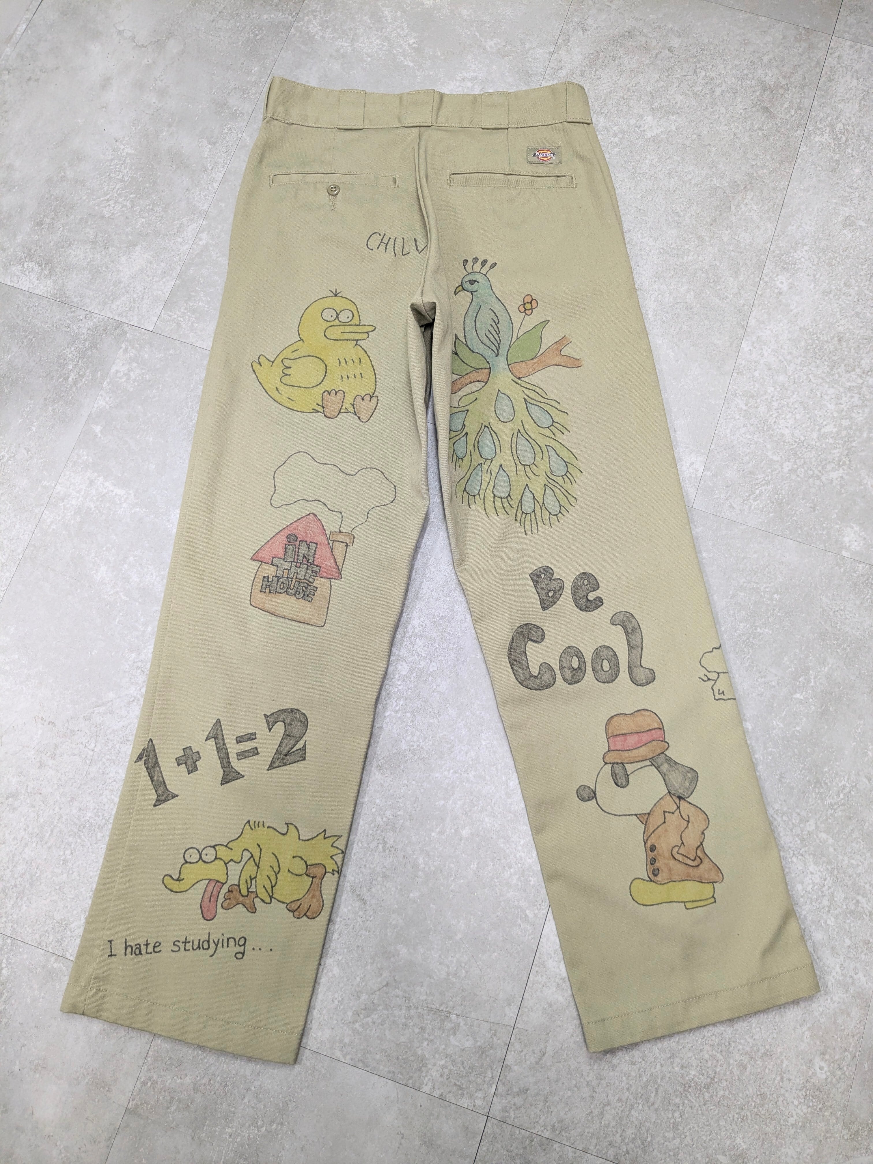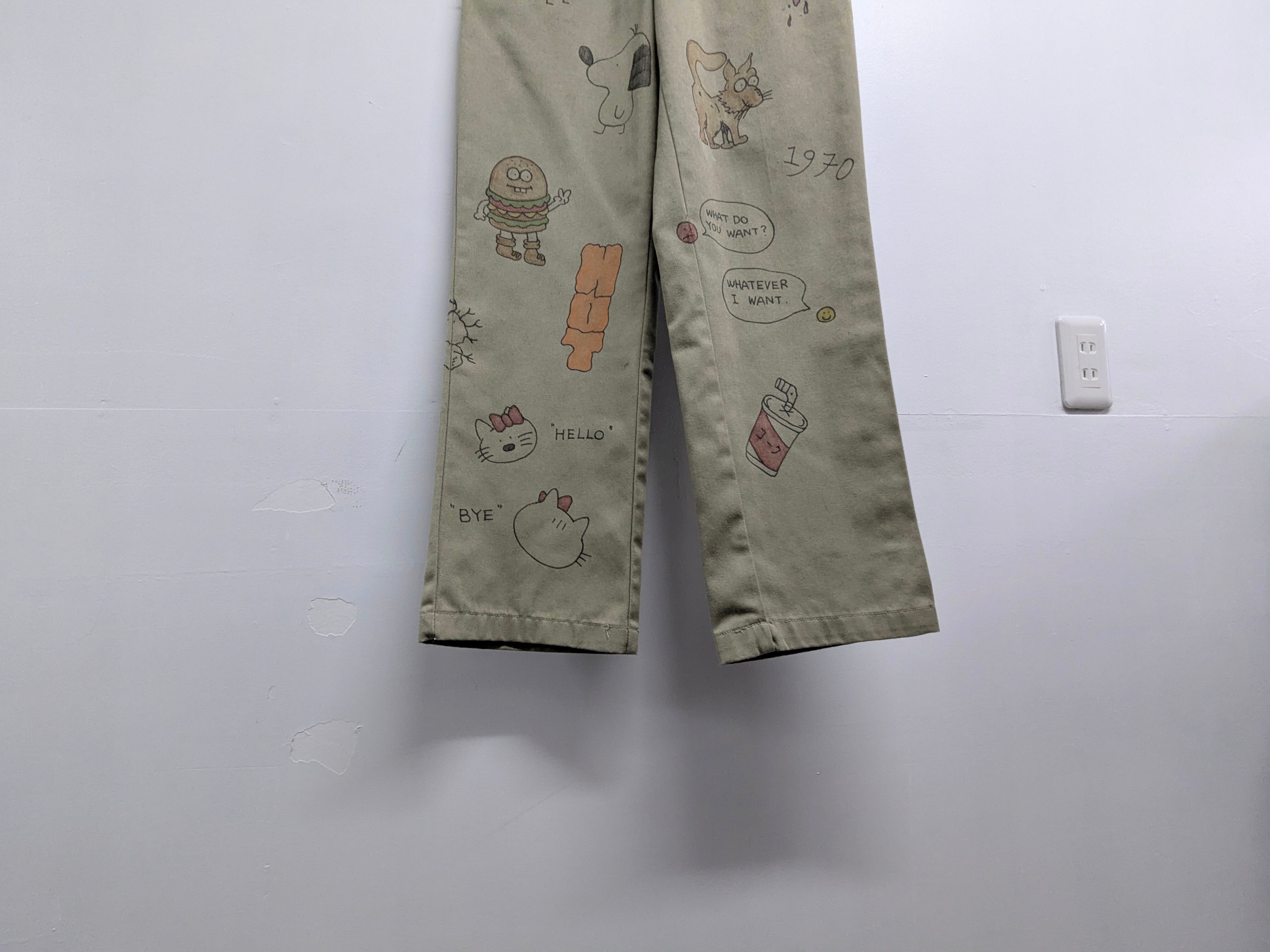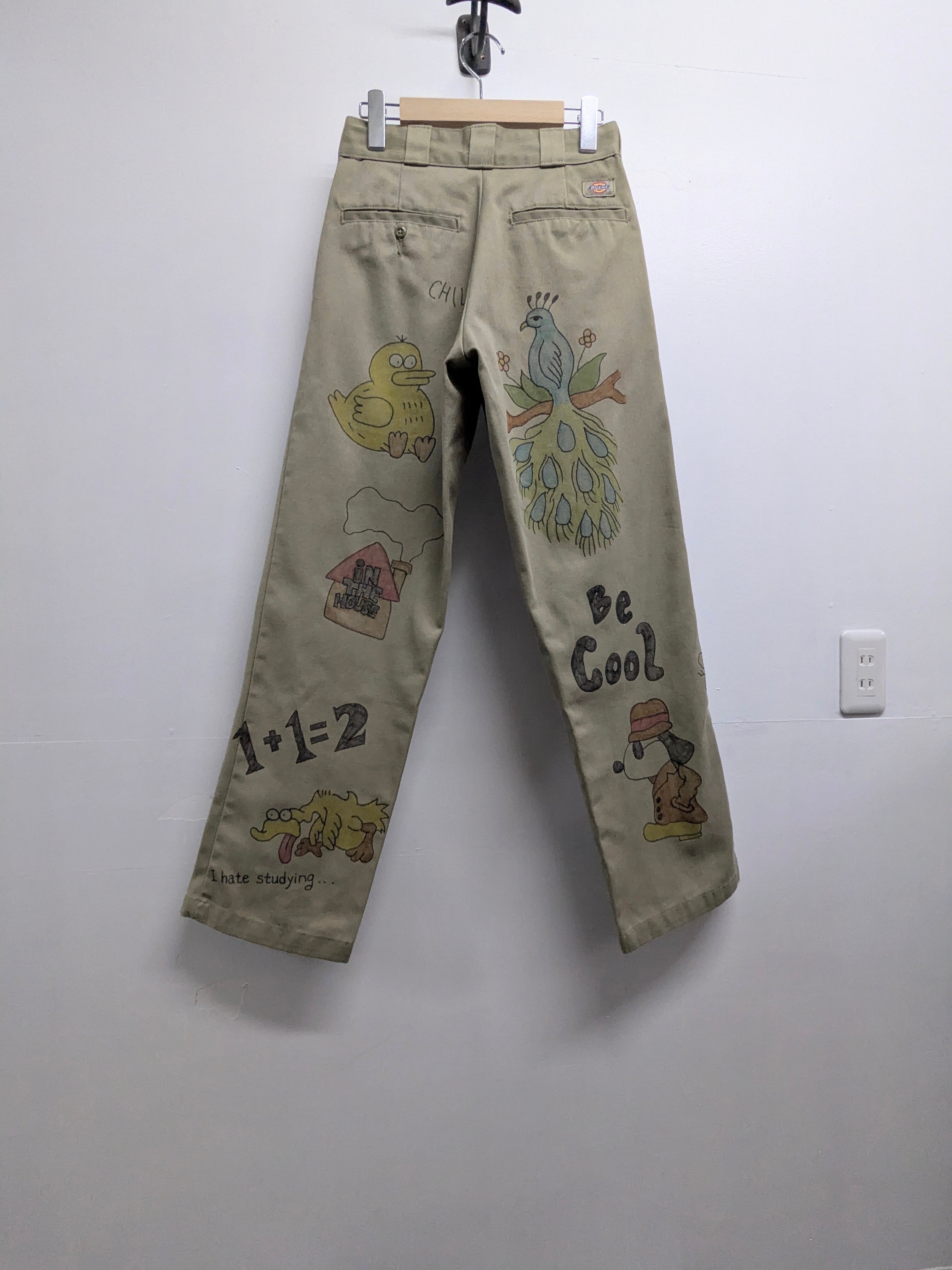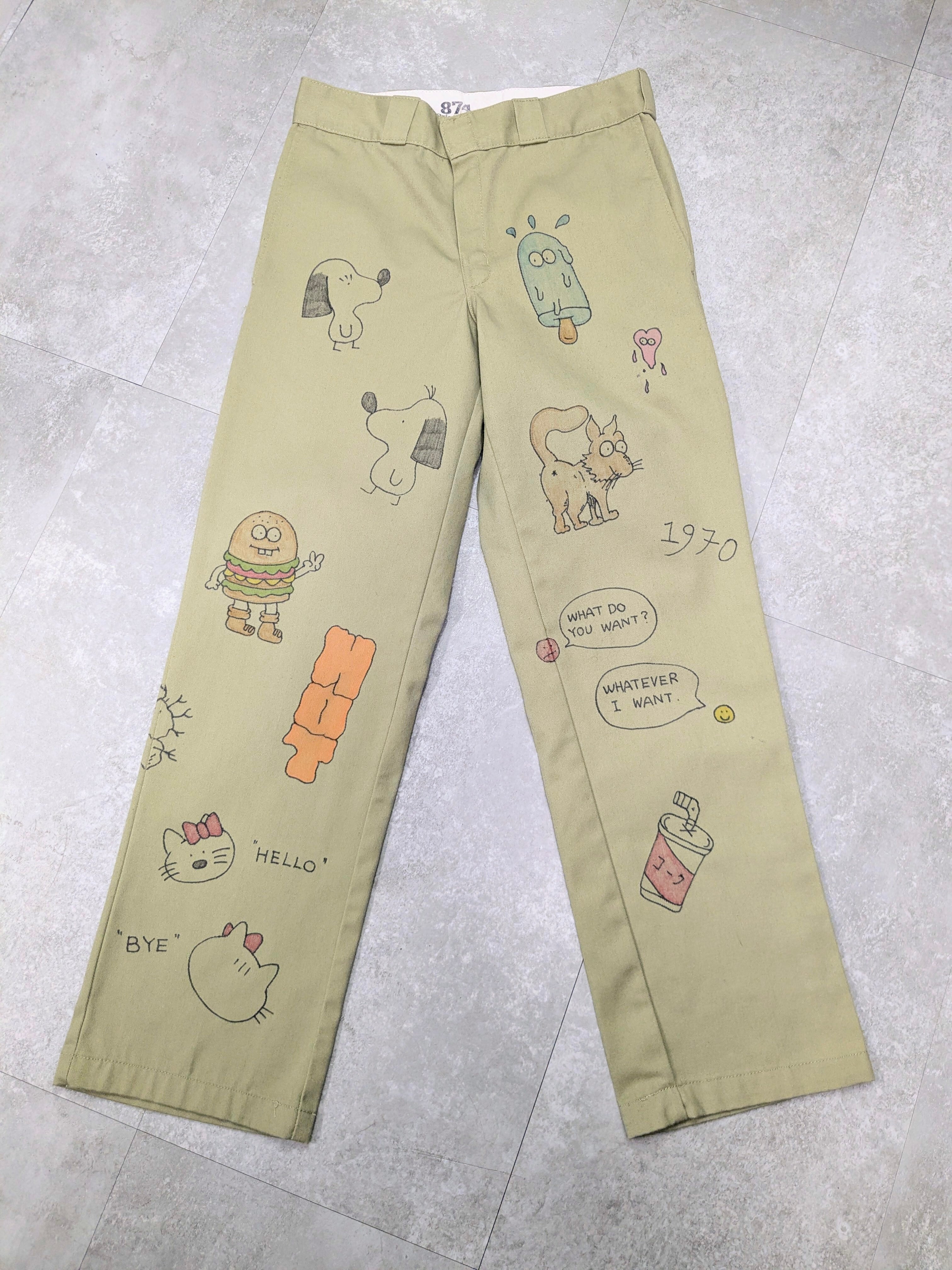 90's〜Dickiesのチノパンを使用しています。元々の汚れ、キズあり。メモリアル要素もありつつ、どこか見たことあるようなキャラクターがいたりととても可愛いアイテム。手描きのため唯一無二、一点物となります。