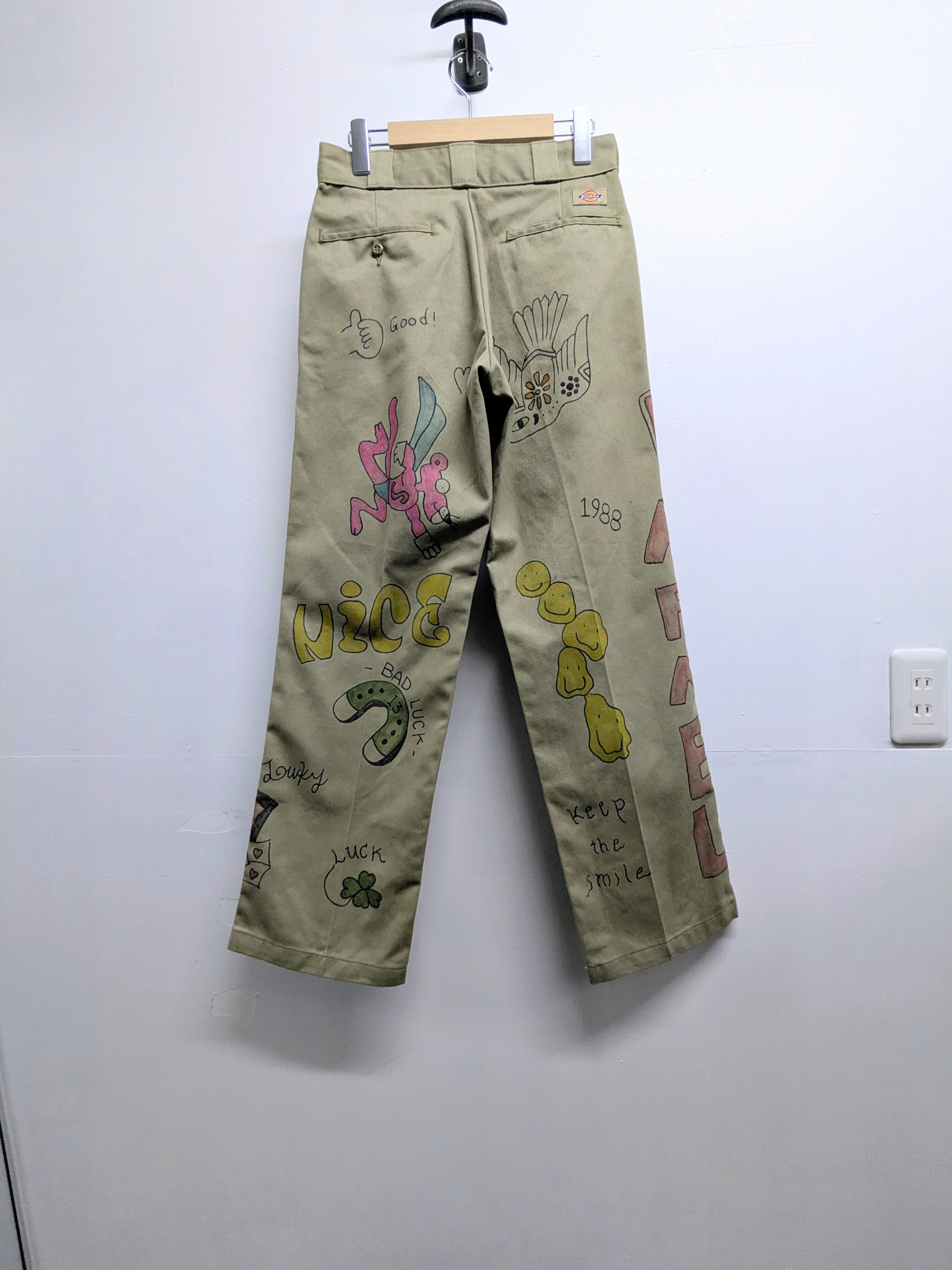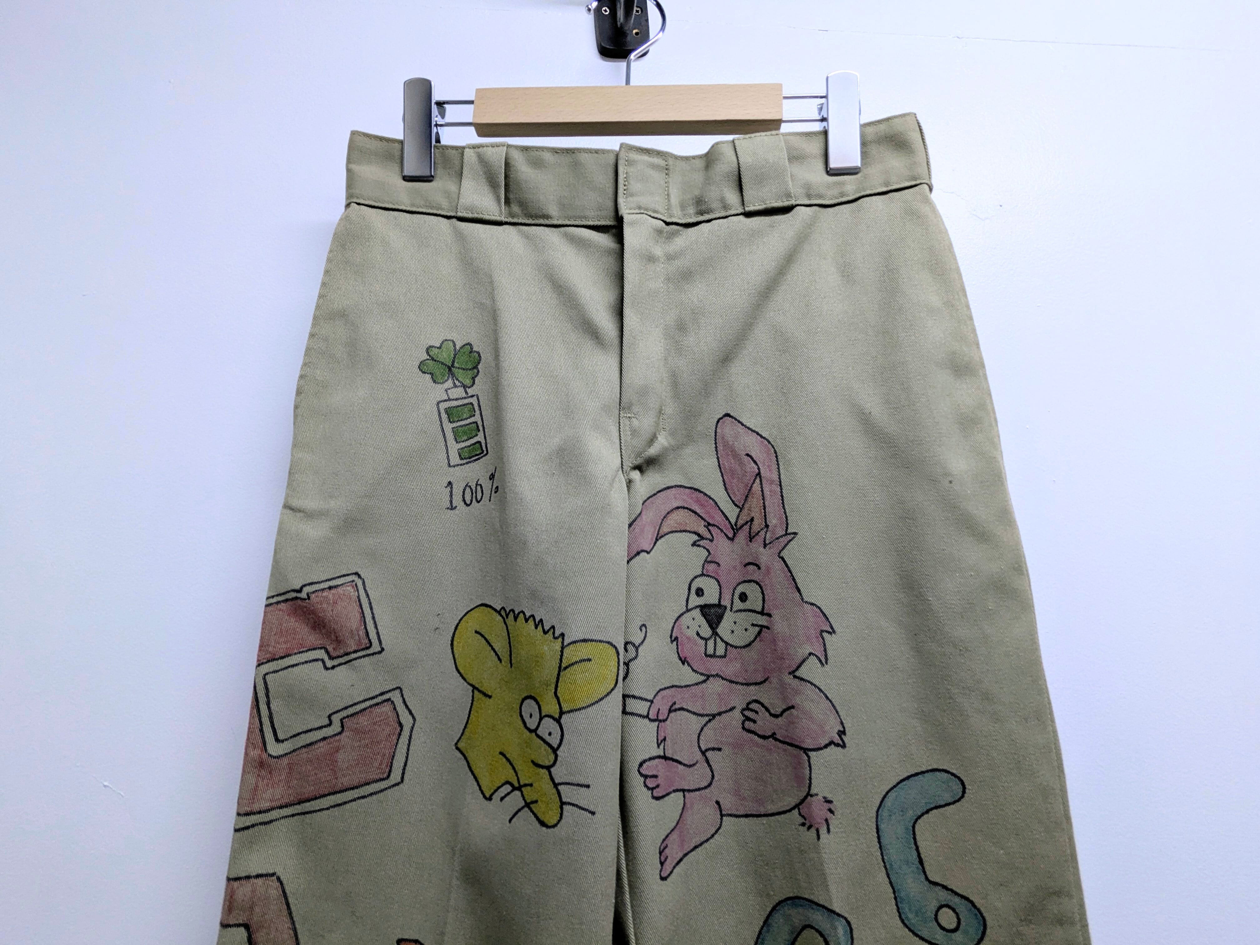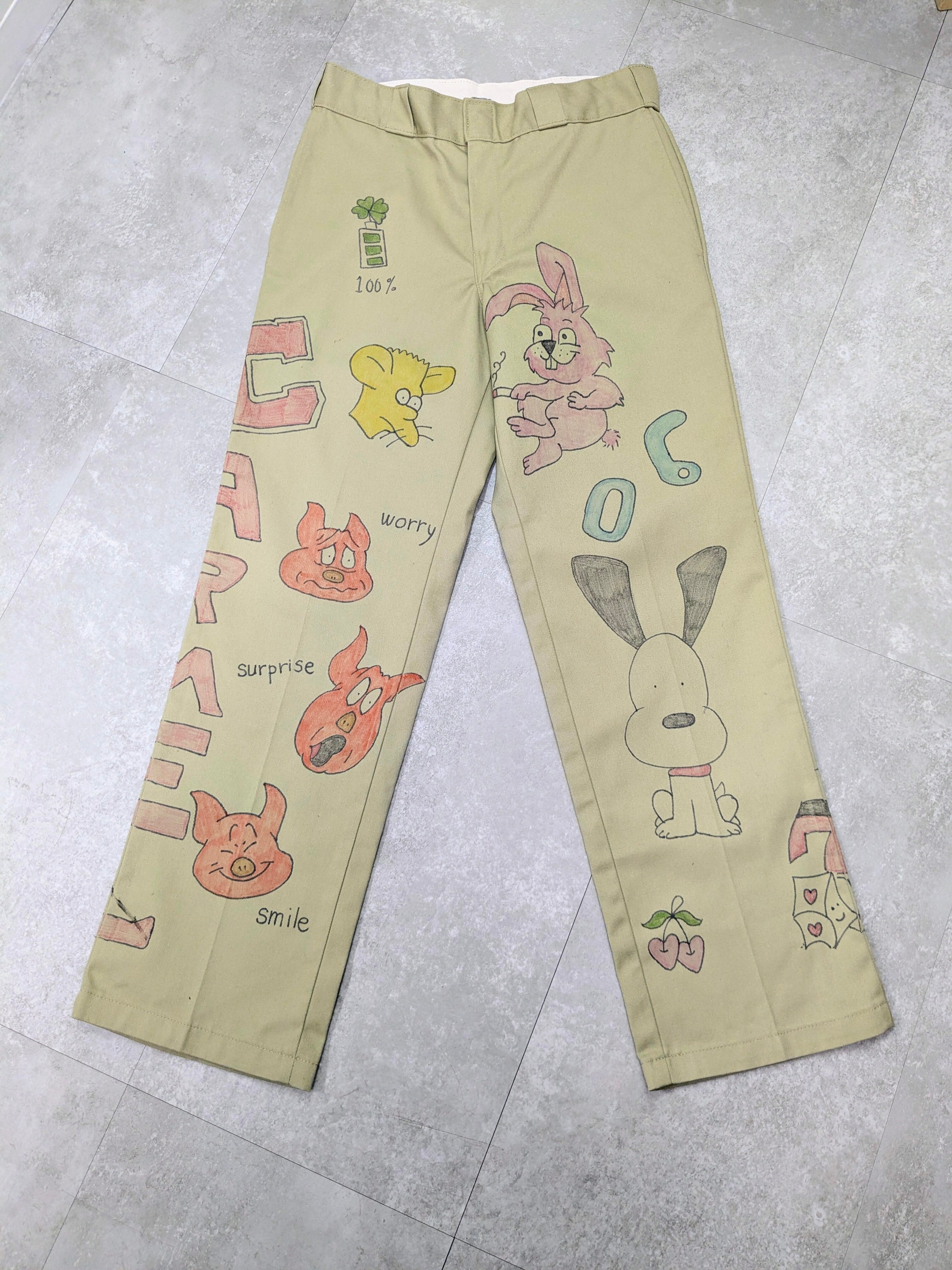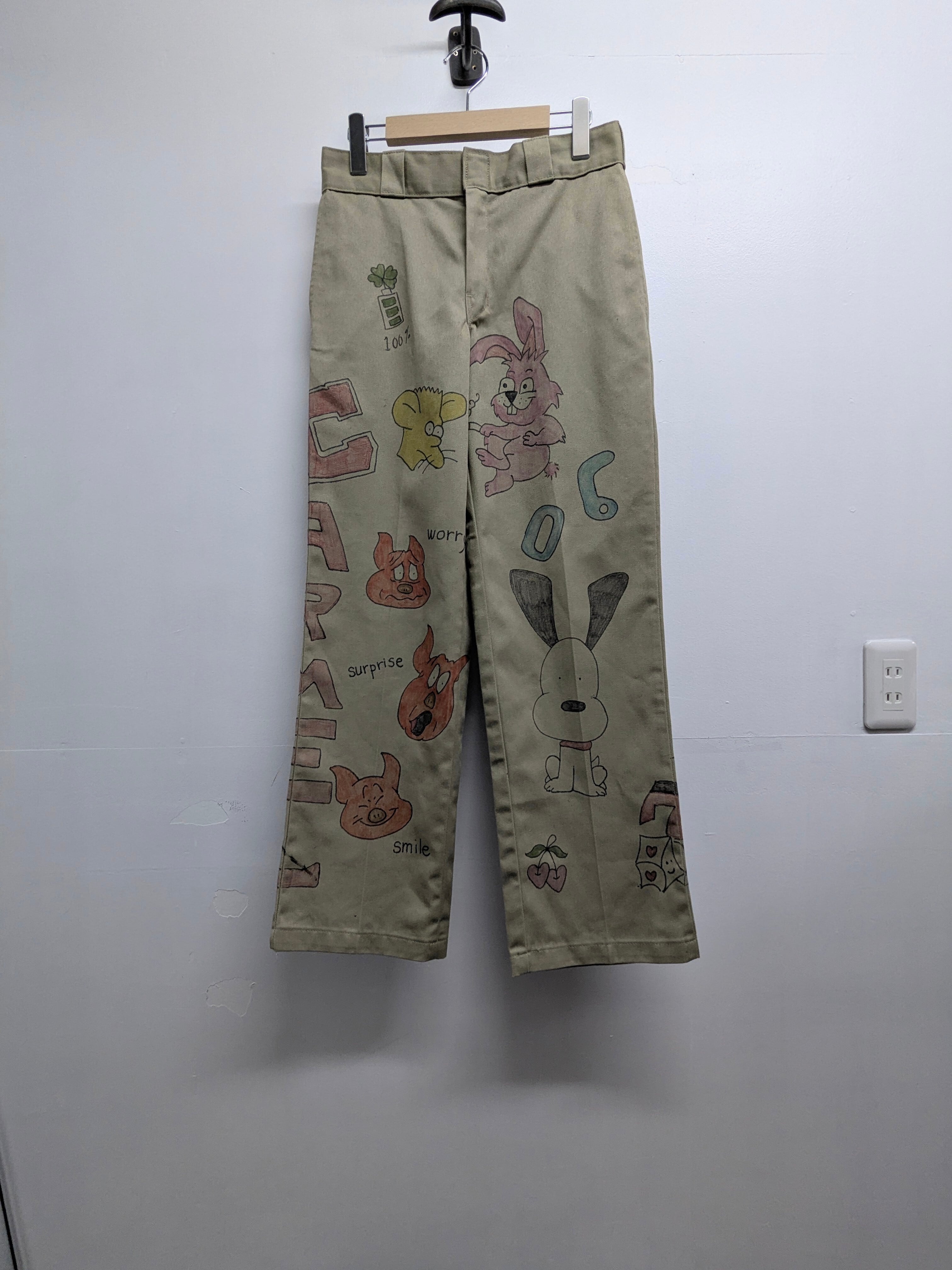 Dickiesのチノパンを使用しています。元々の汚れ、キズあり。メモリアル要素もありつつ、どこか見たことあるようなキャラクターがいたりととても可愛いアイテム。手描きのため唯一無二、一点物となります。