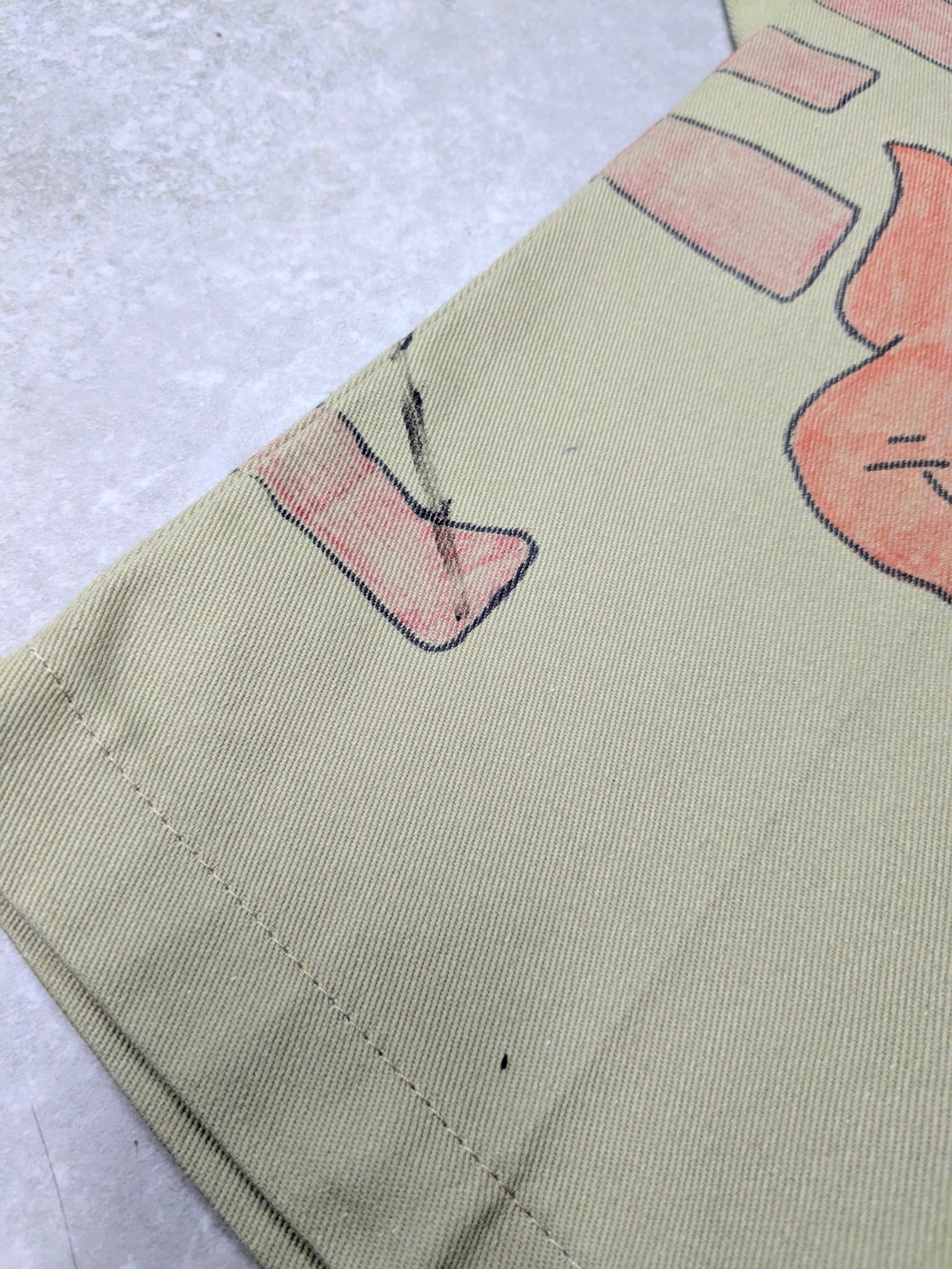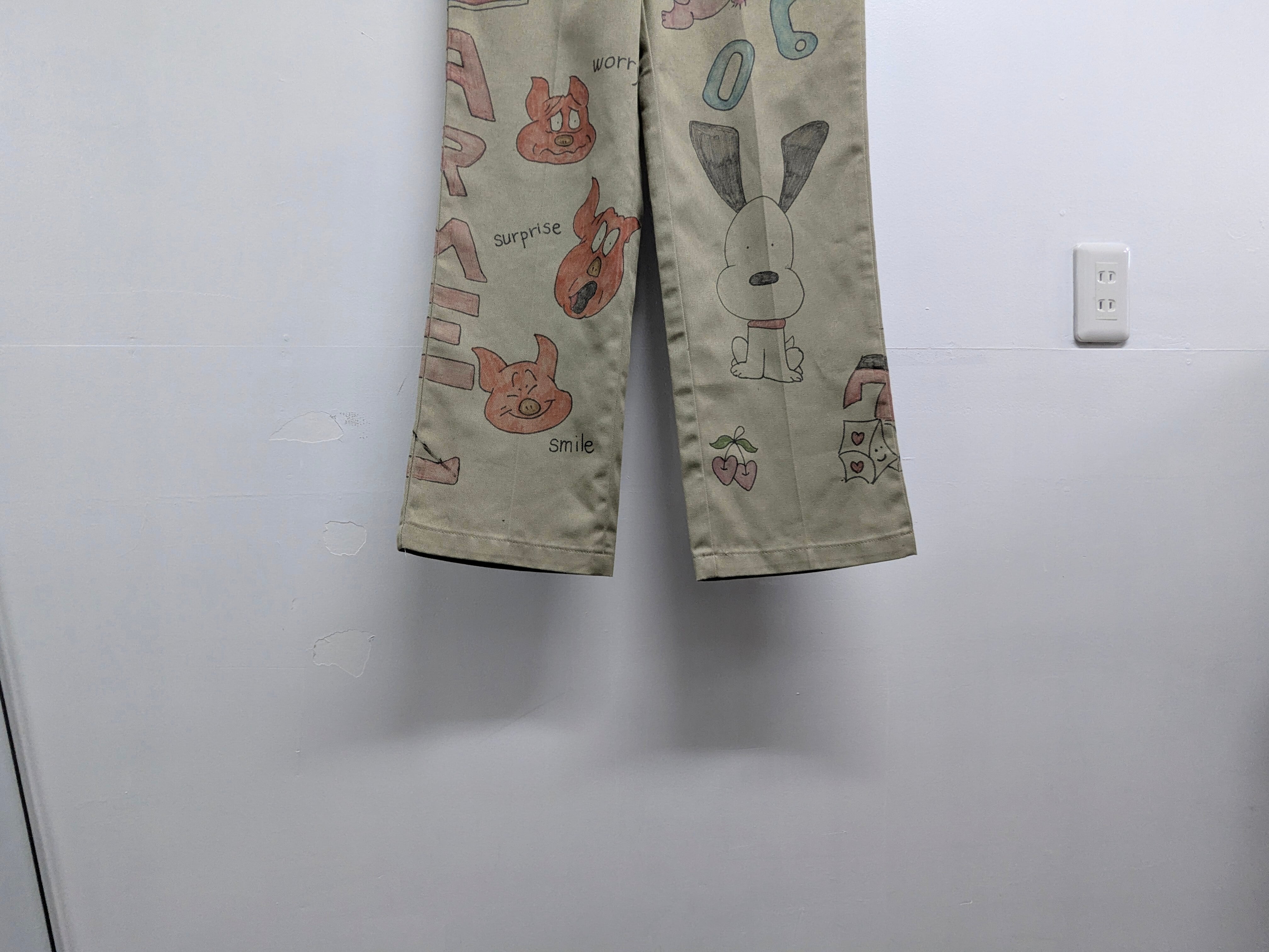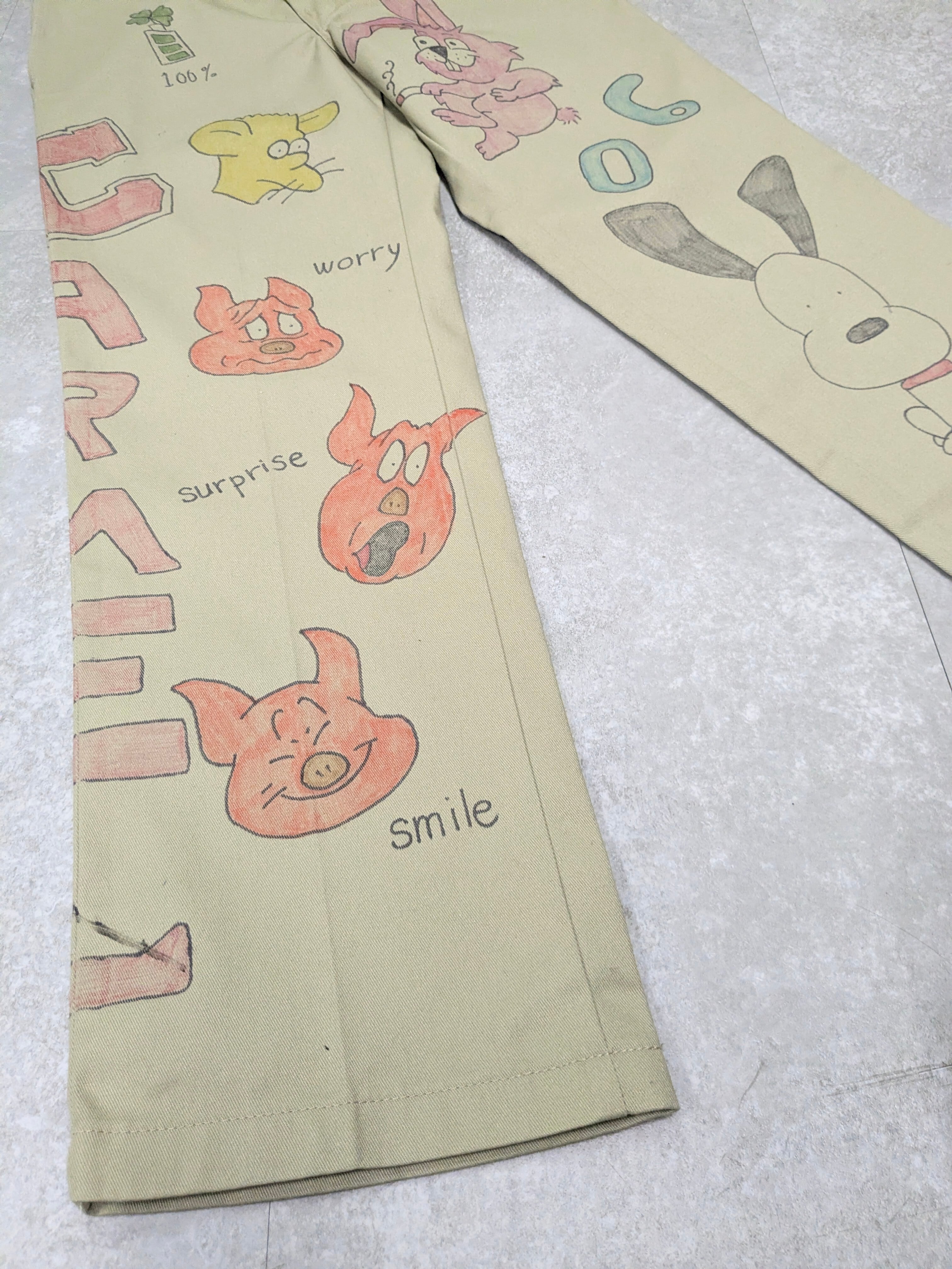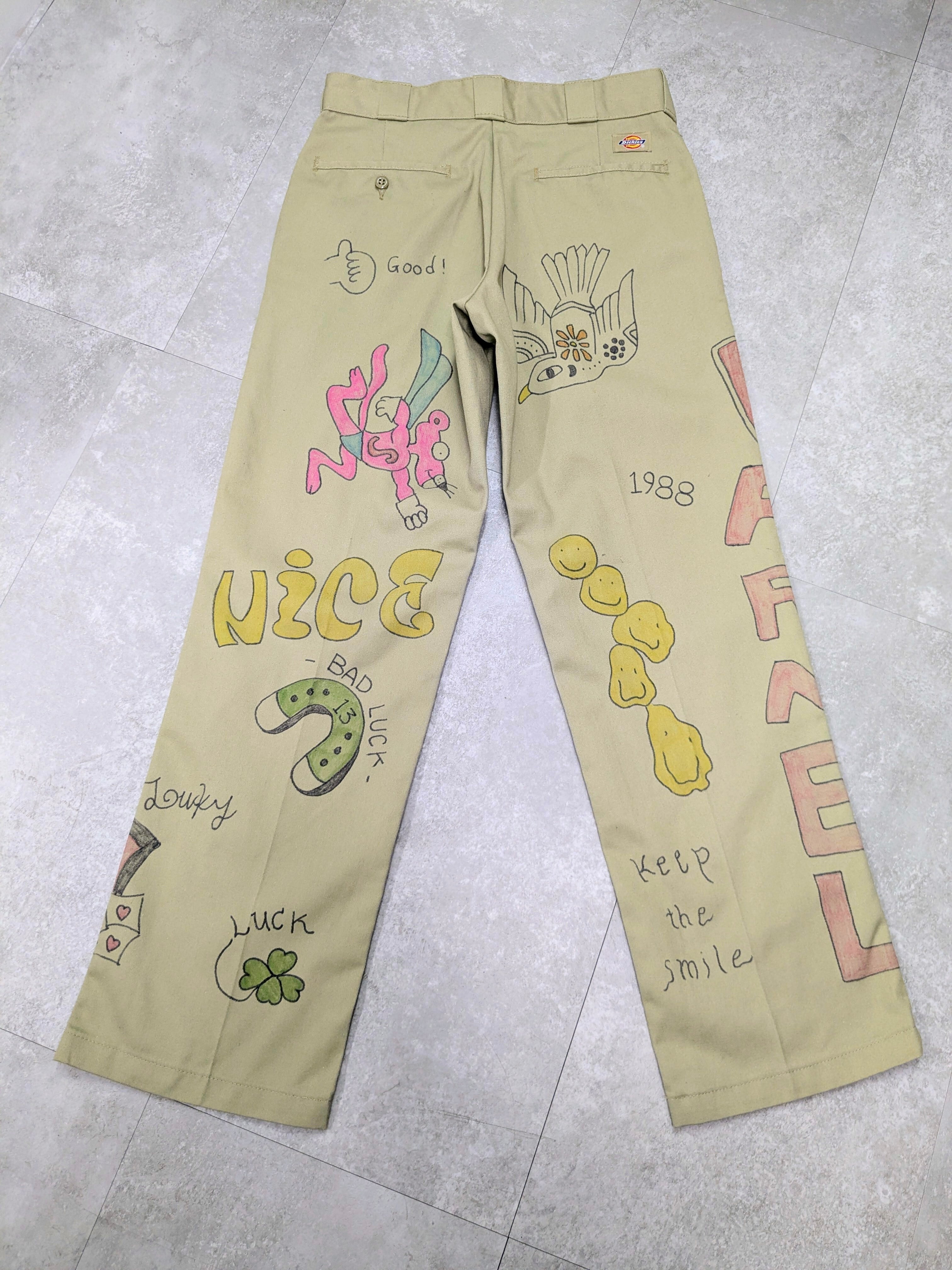 Dickiesのチノパンを使用しています。元々の汚れ、キズあり。メモリアル要素もありつつ、どこか見たことあるようなキャラクターがいたりととても可愛いアイテム。手描きのため唯一無二、一点物となります。