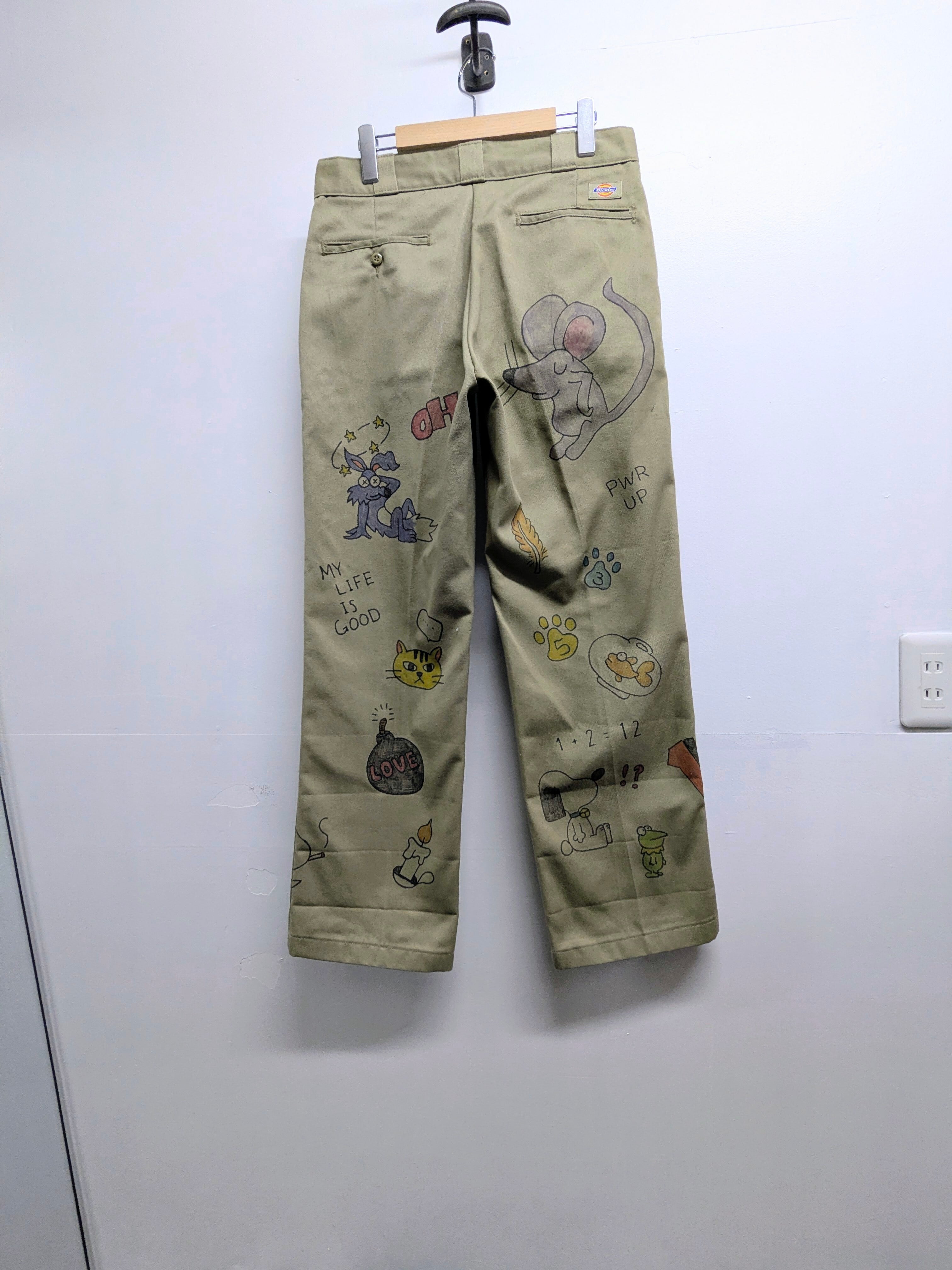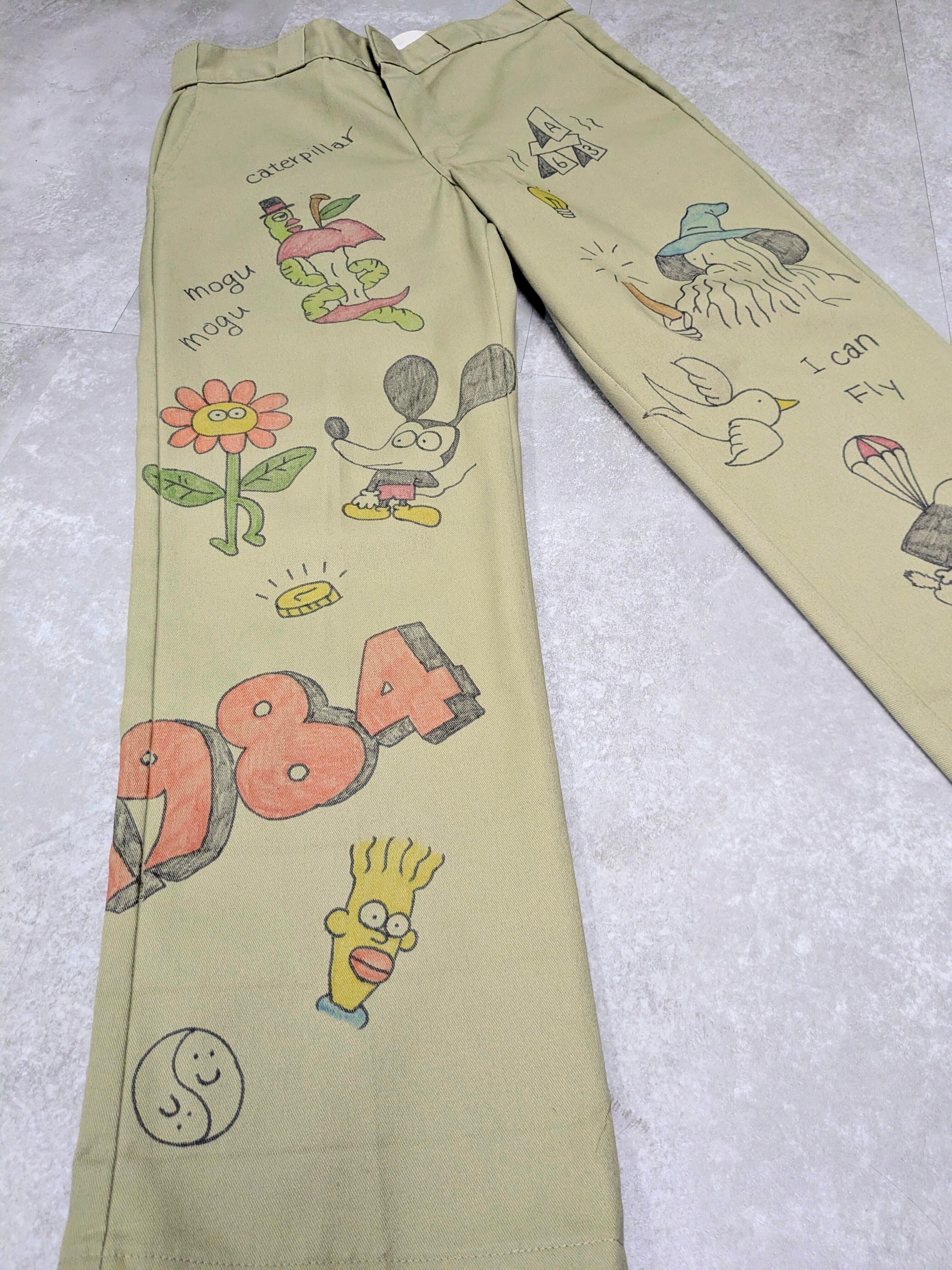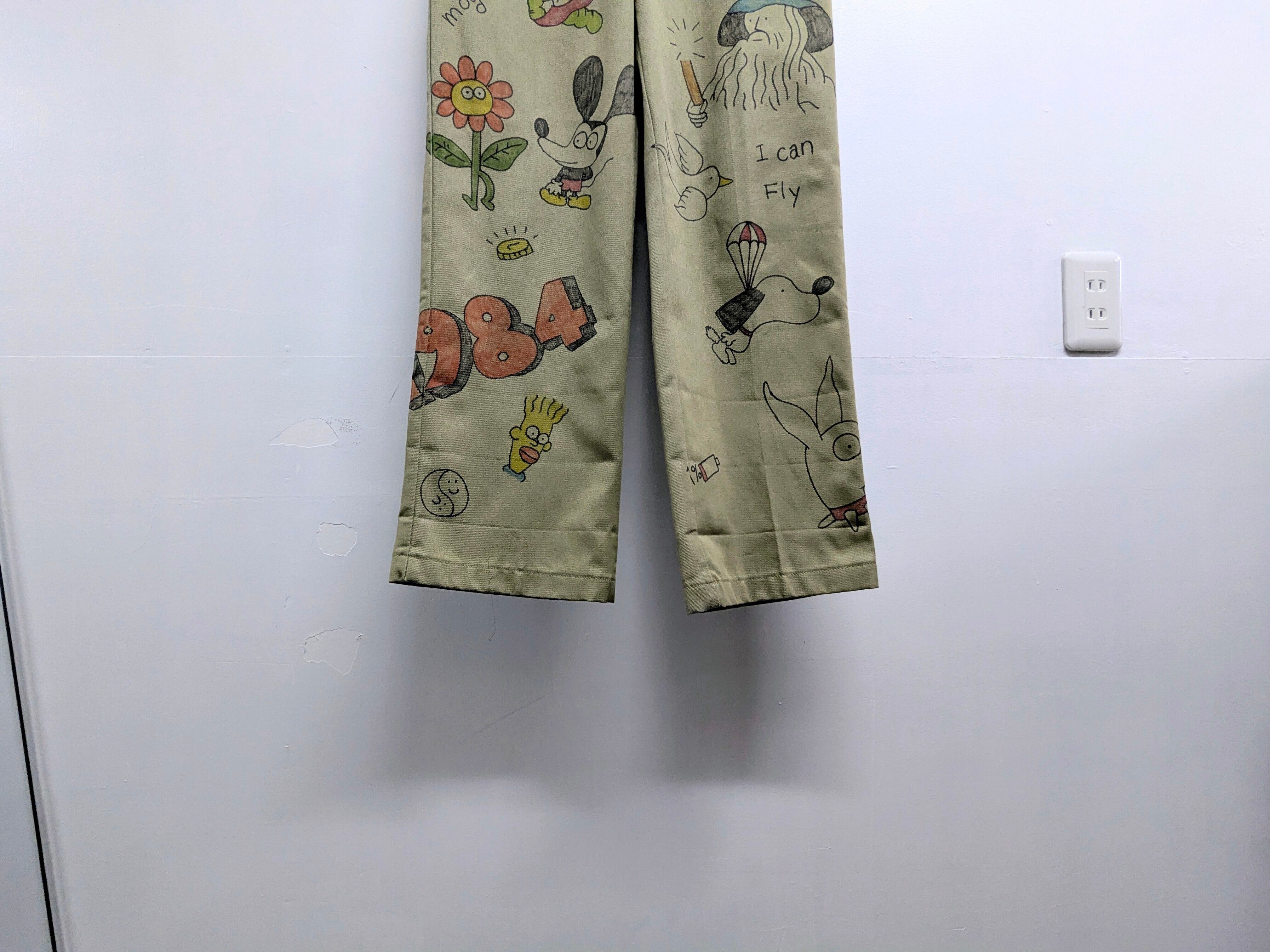 90's〜Dickiesのチノパンを使用しています。元々の汚れ、キズあり。メモリアル要素もありつつ、どこか見たことあるようなキャラクターがいたりととても可愛いアイテム。手描きのため唯一無二、一点物となります。