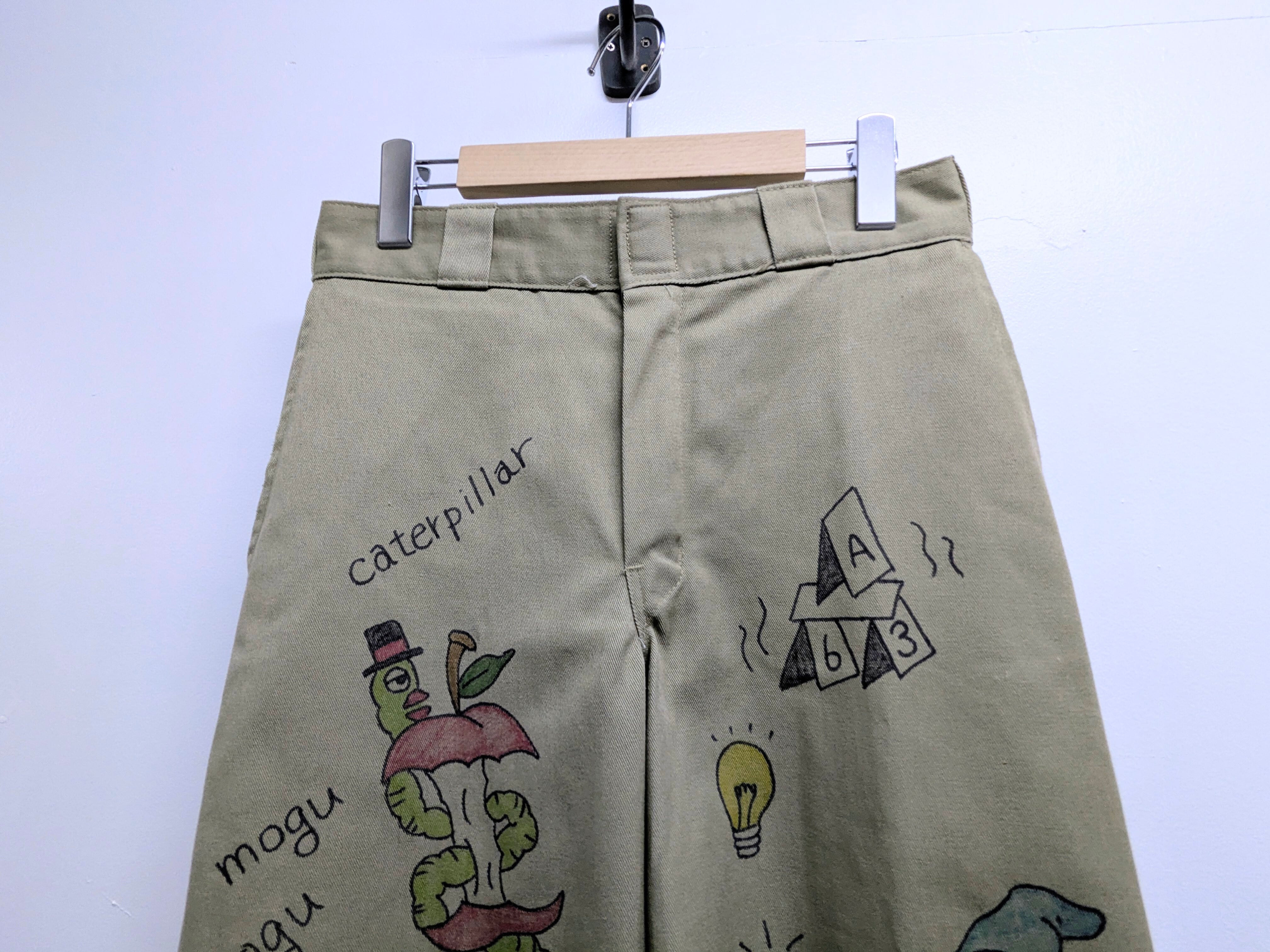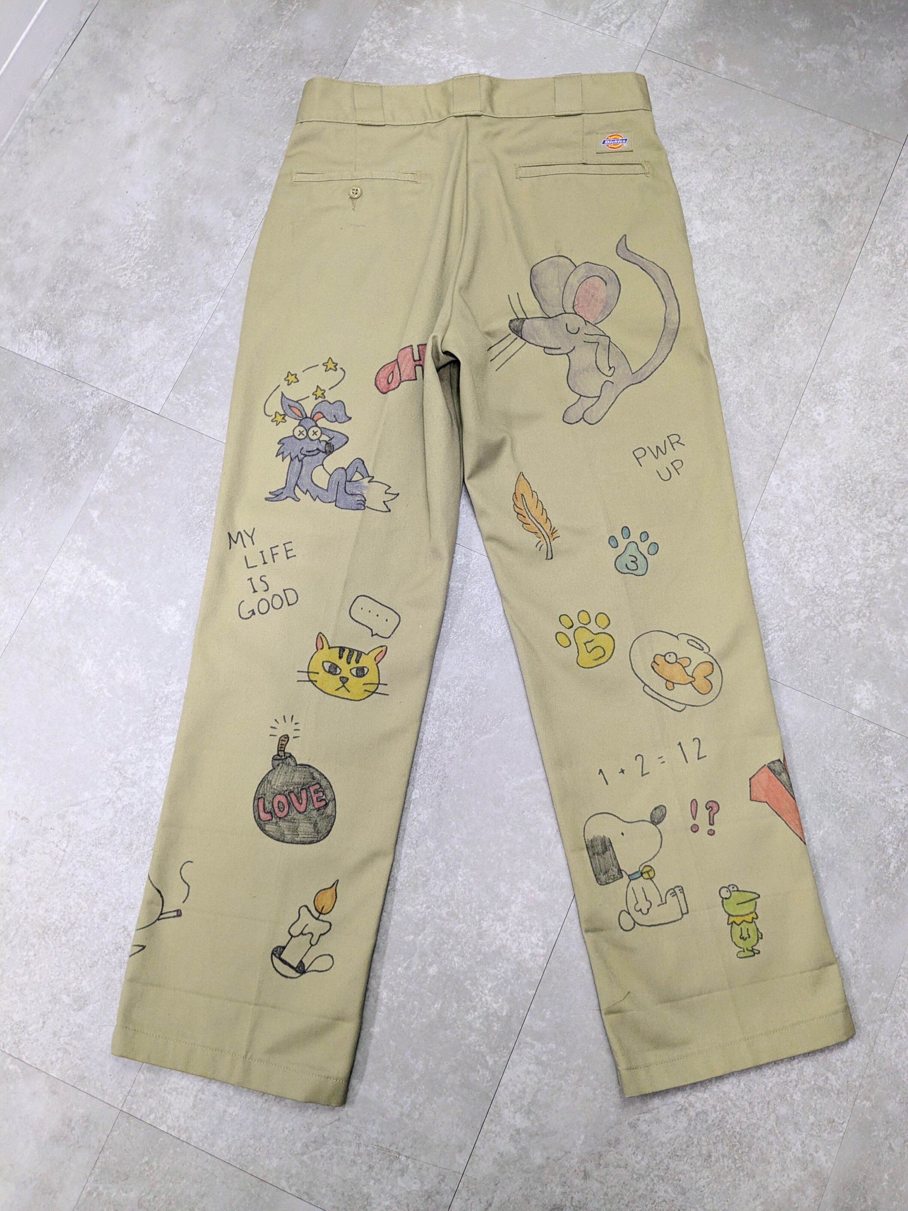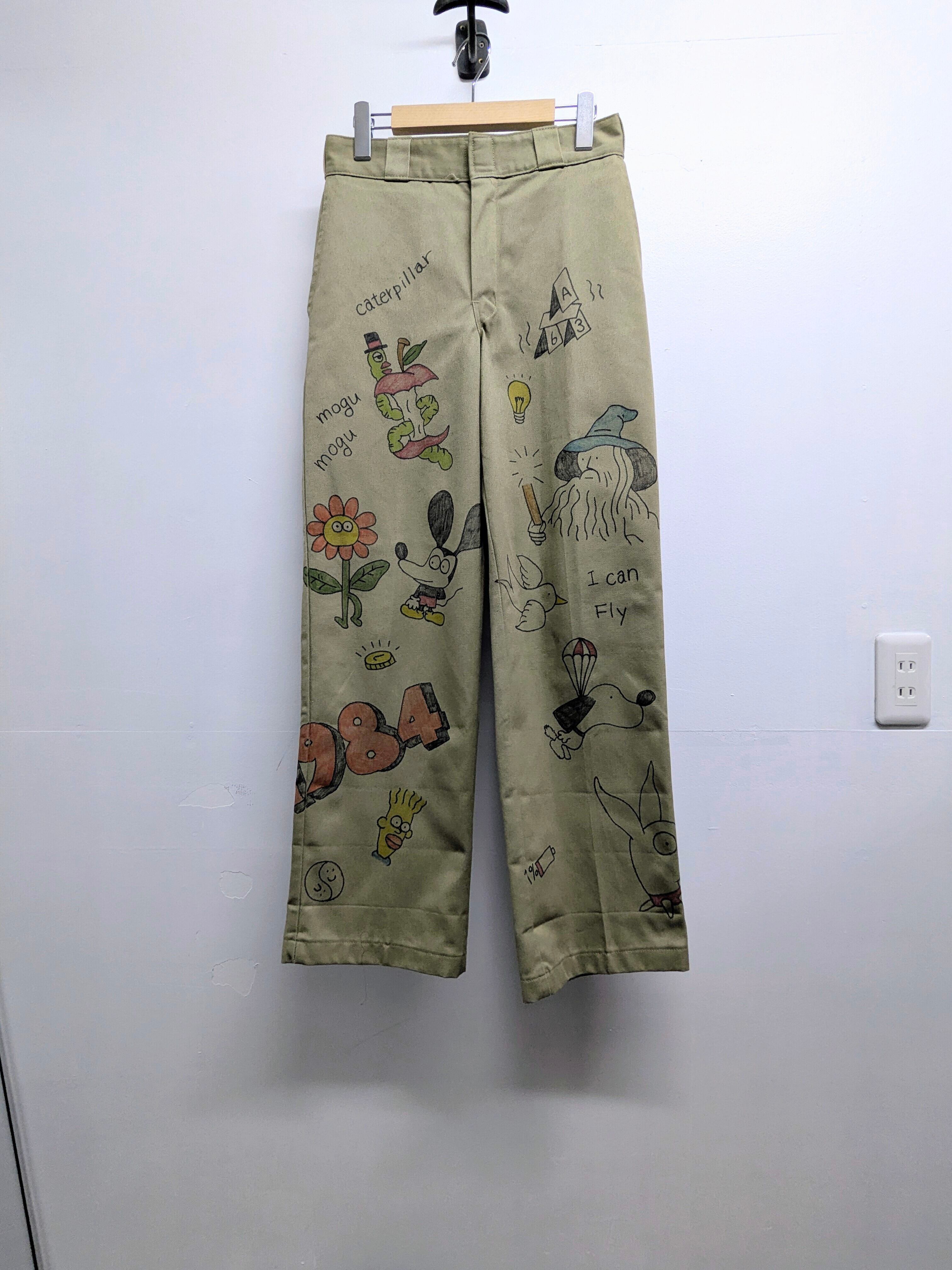 90's〜Dickiesのチノパンを使用しています。元々の汚れ、キズあり。メモリアル要素もありつつ、どこか見たことあるようなキャラクターがいたりととても可愛いアイテム。手描きのため唯一無二、一点物となります。