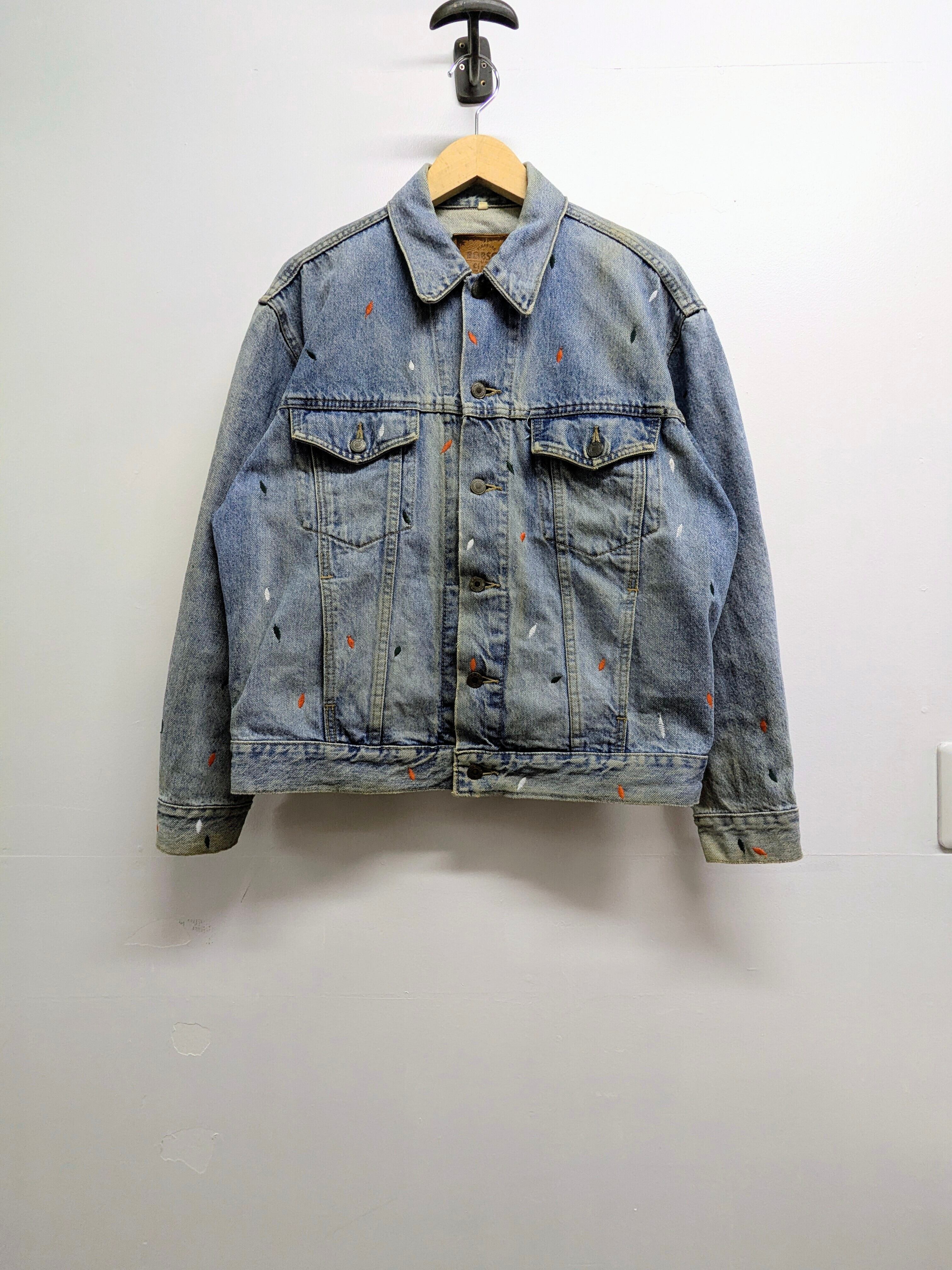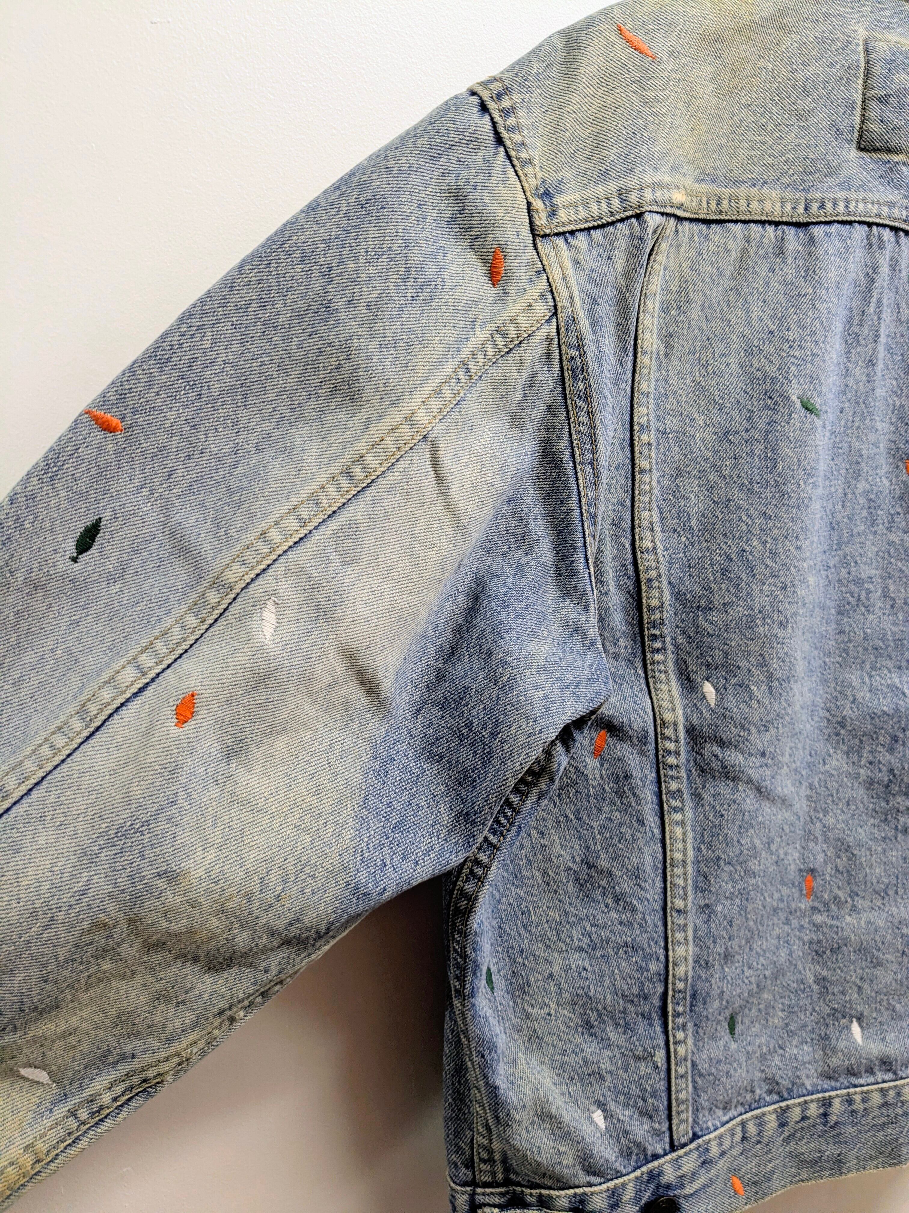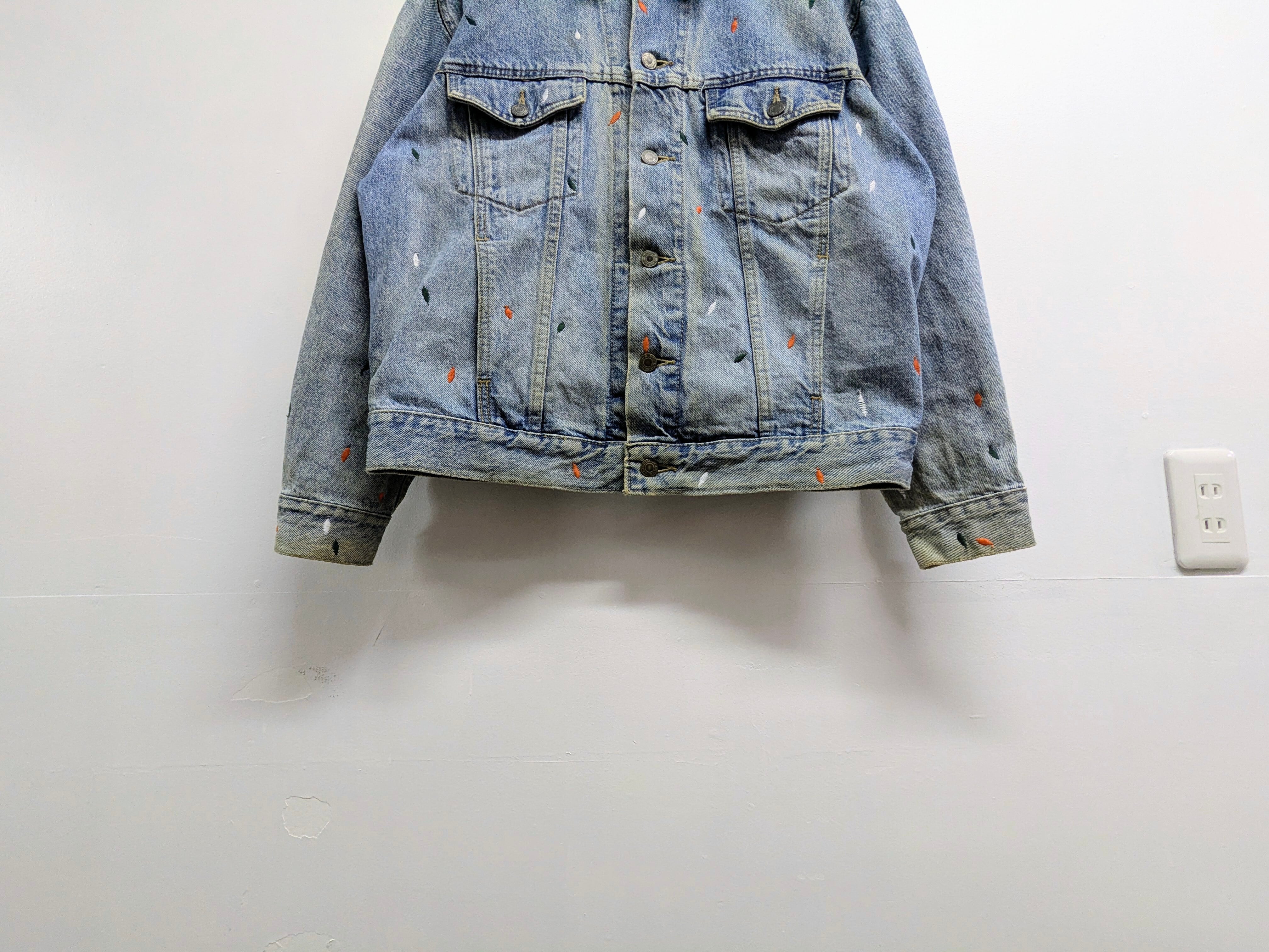ペンキを飛ばしたようなデザインですが、よく見ると全て刺繍でデザインされています。やりすぎてないデザインがありそうでなかったかと。また程よいデザインなので、スタイリングとしてもポイントになるアイテム。シルエットふまえおすすめ。フェード、ダメージなどは元々のボディのもの。