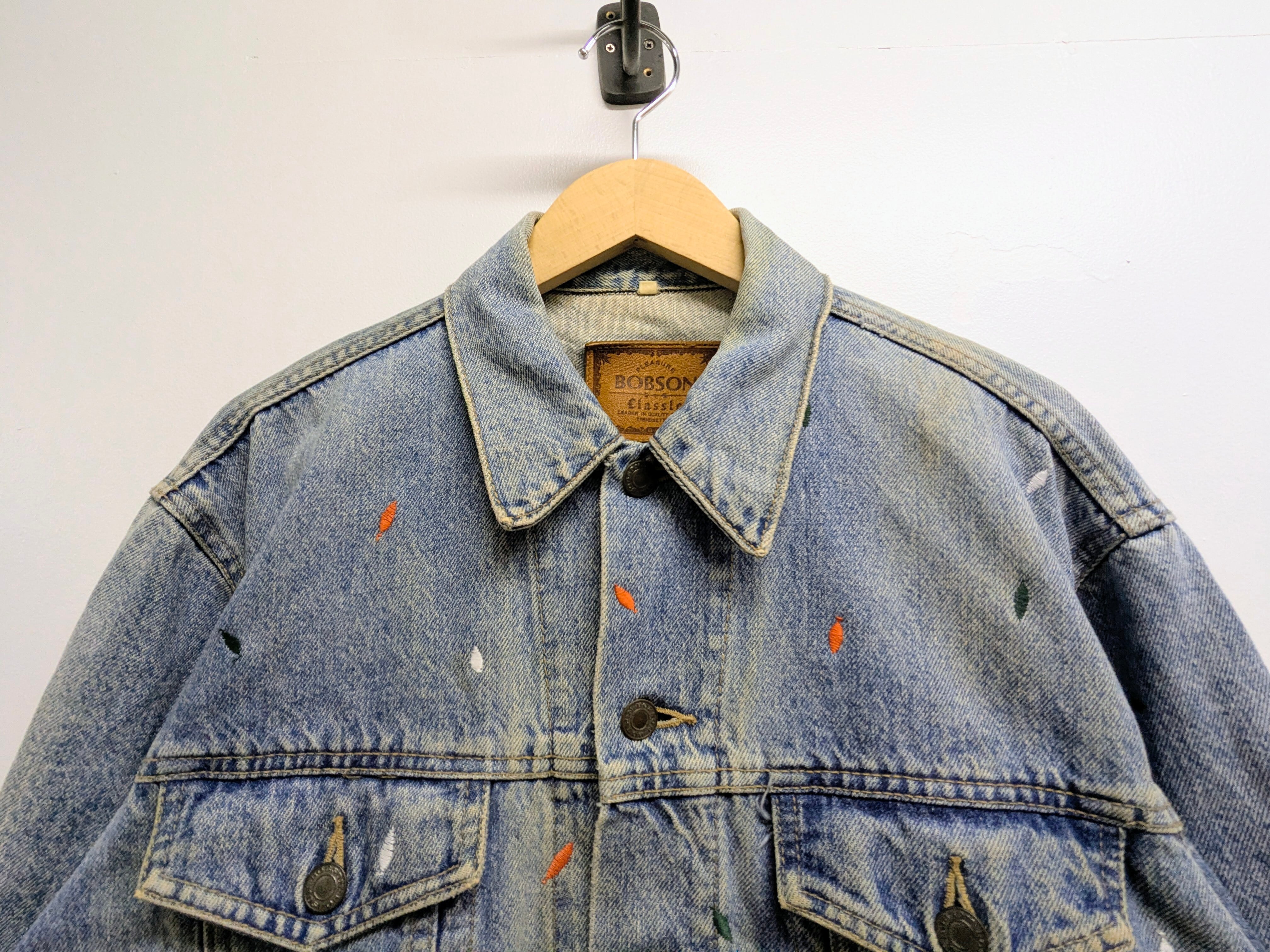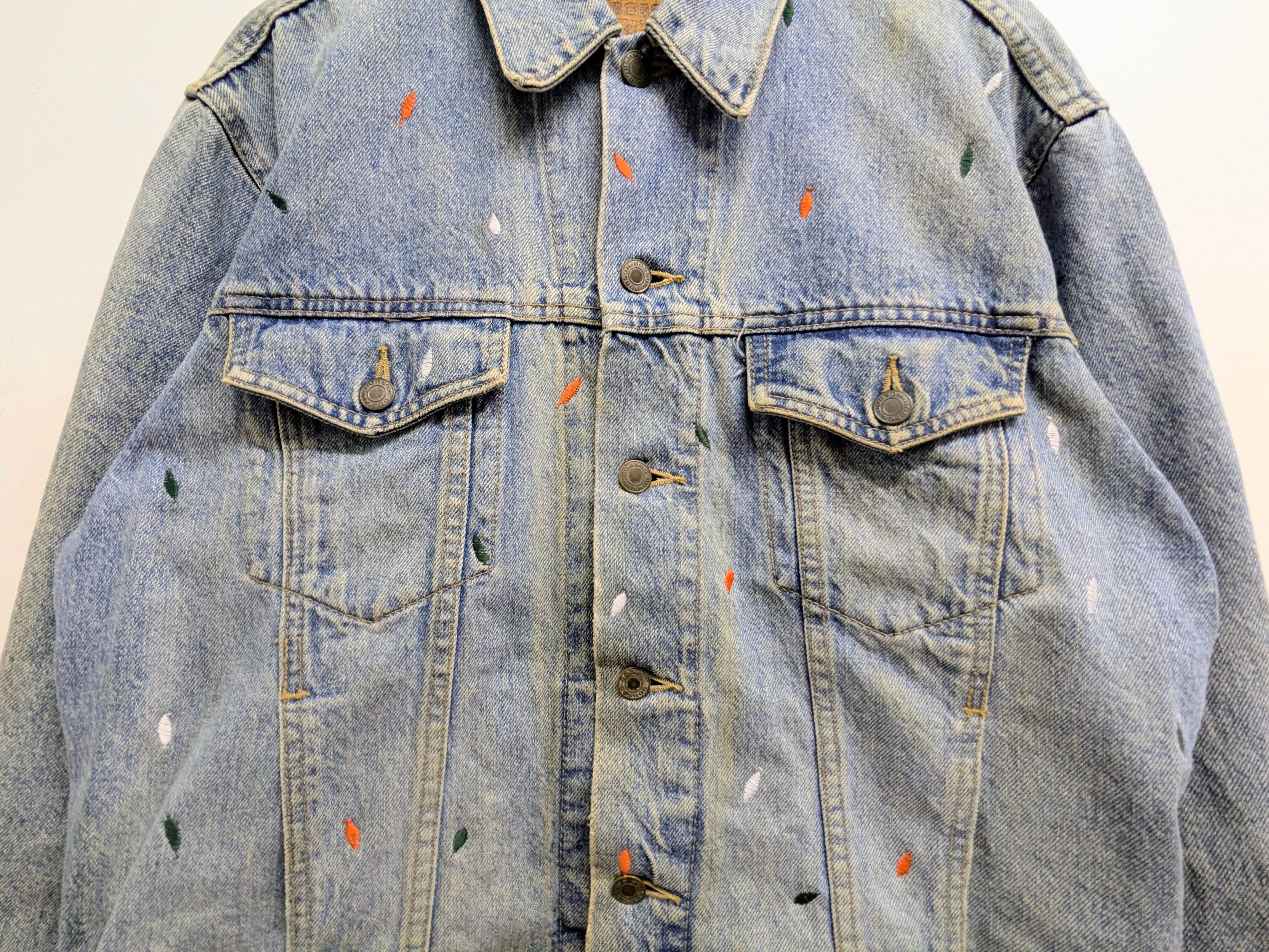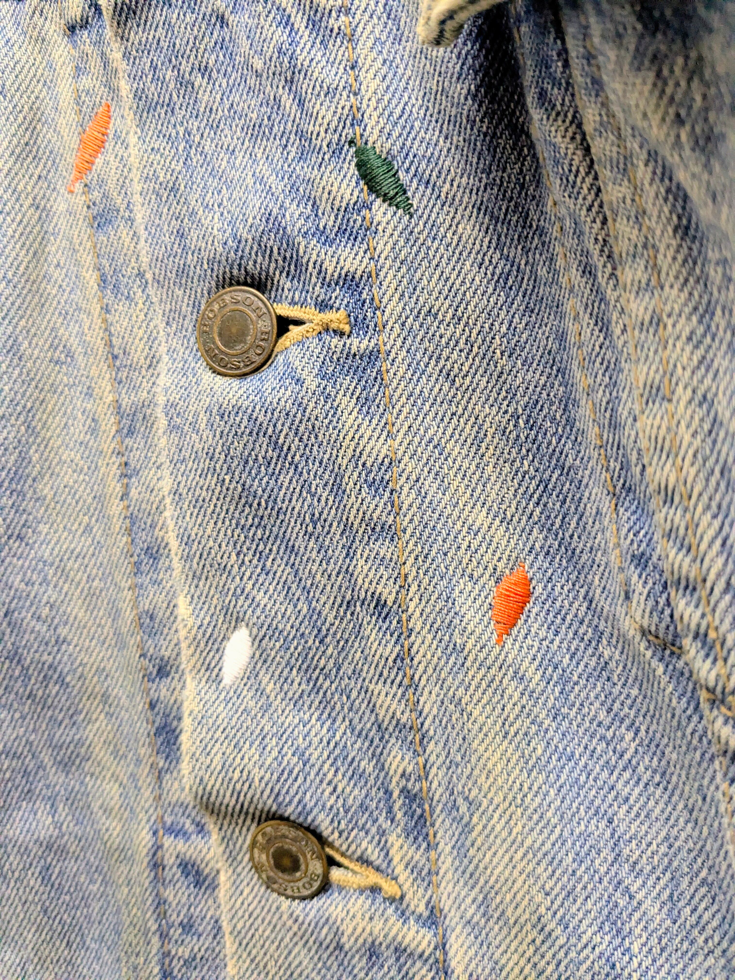 ペンキを飛ばしたようなデザインですが、よく見ると全て刺繍でデザインされています。やりすぎてないデザインがありそうでなかったかと。また程よいデザインなので、スタイリングとしてもポイントになるアイテム。シルエットふまえおすすめ。フェード、ダメージなどは元々のボディのもの。
