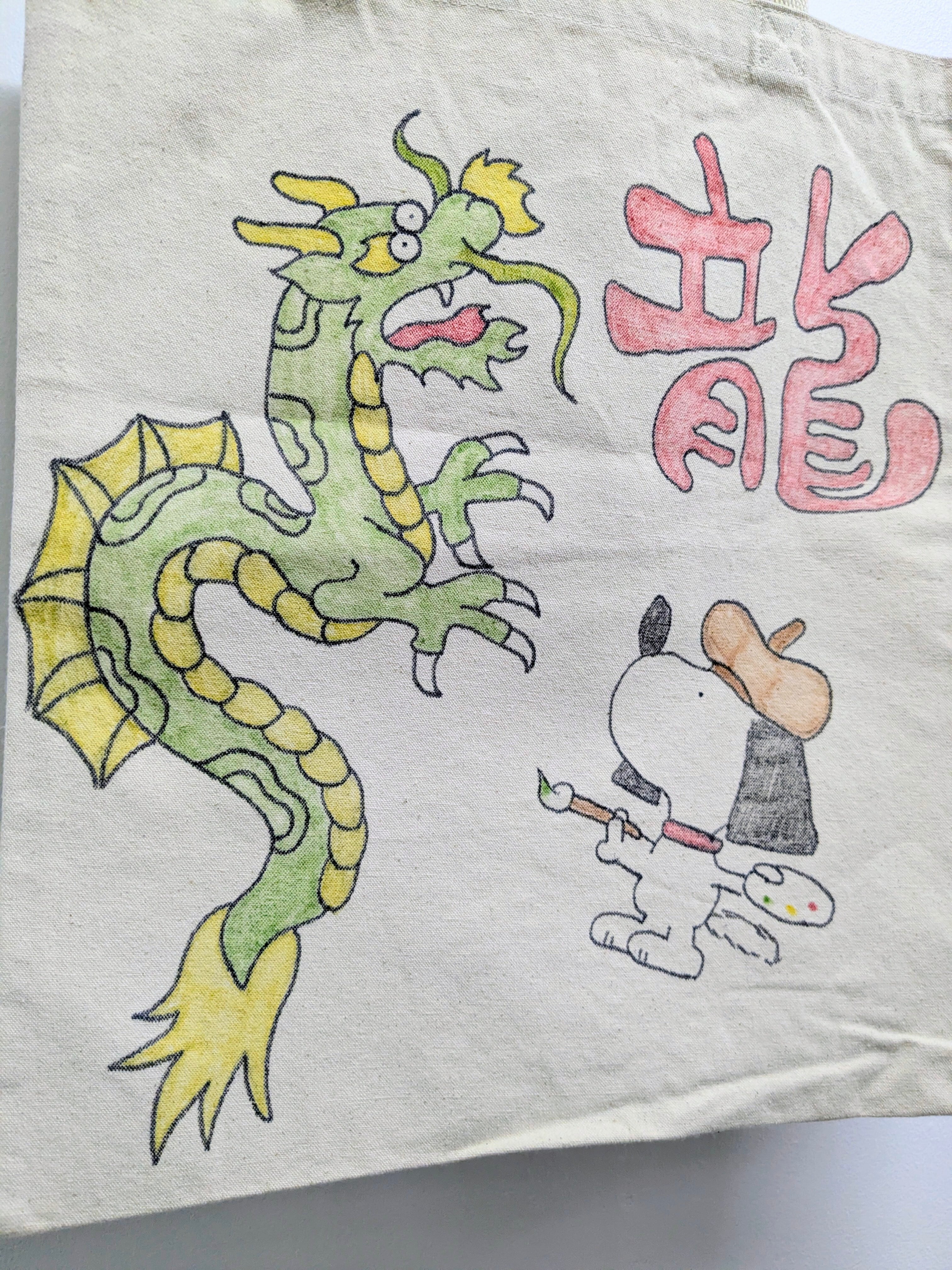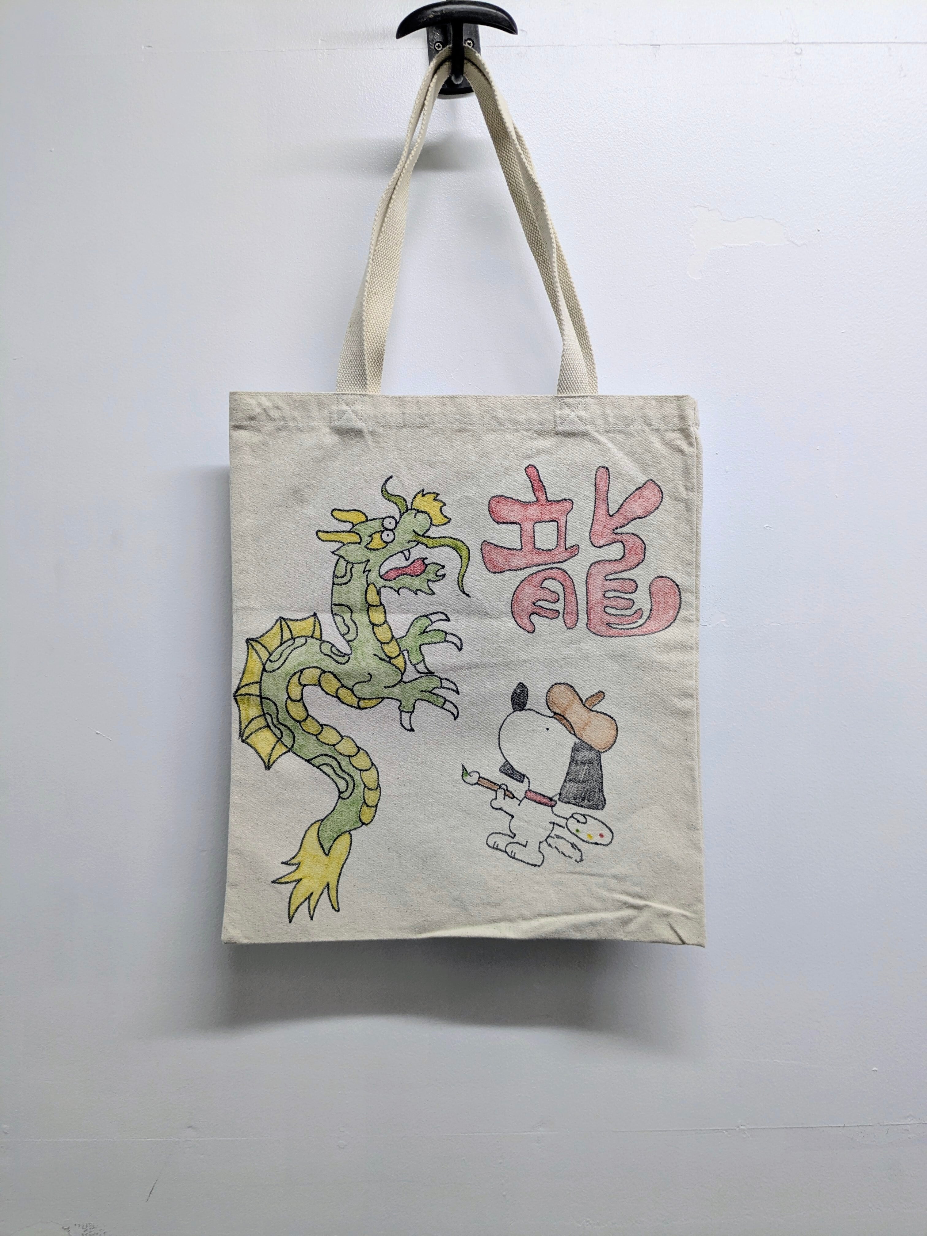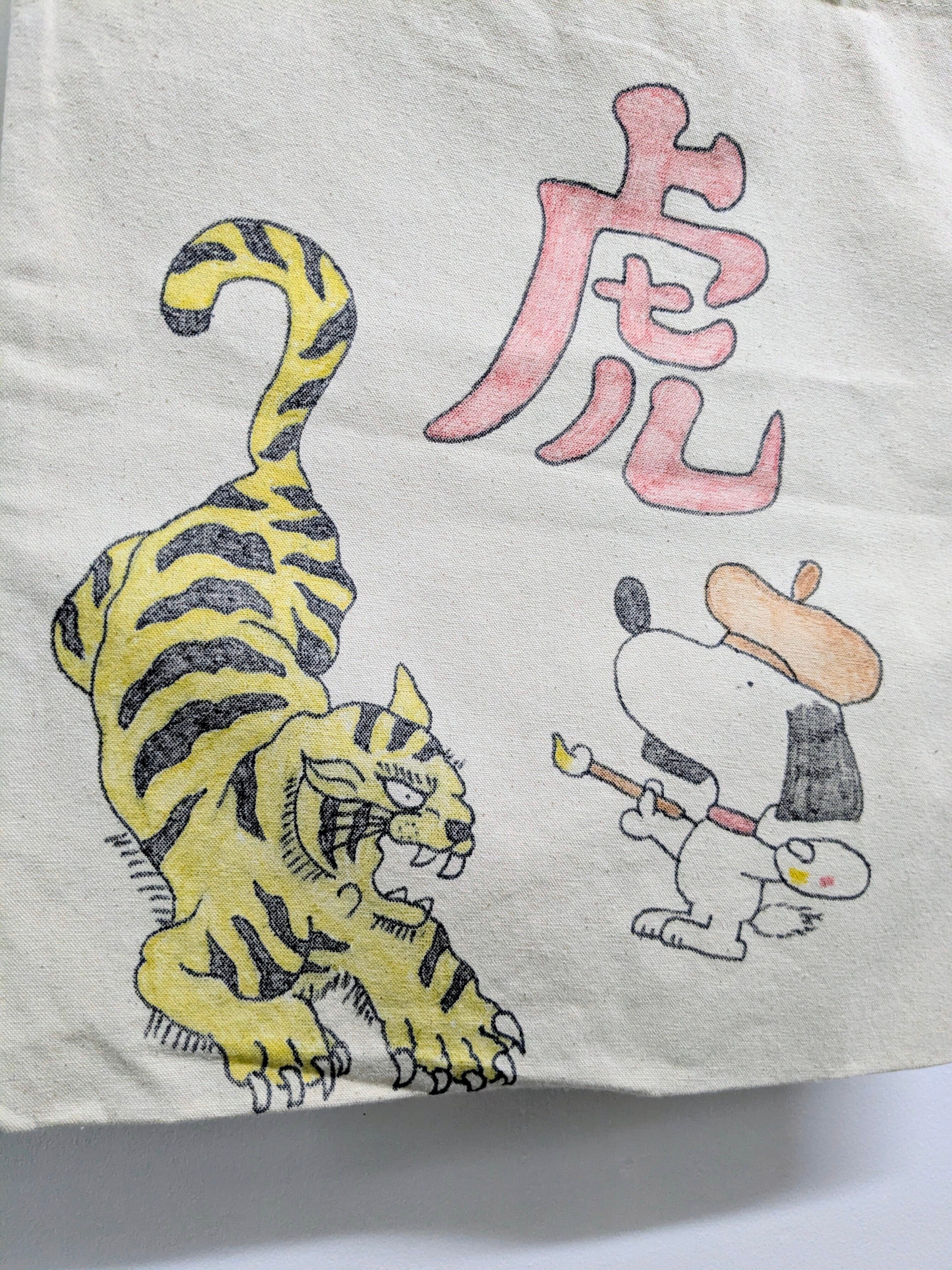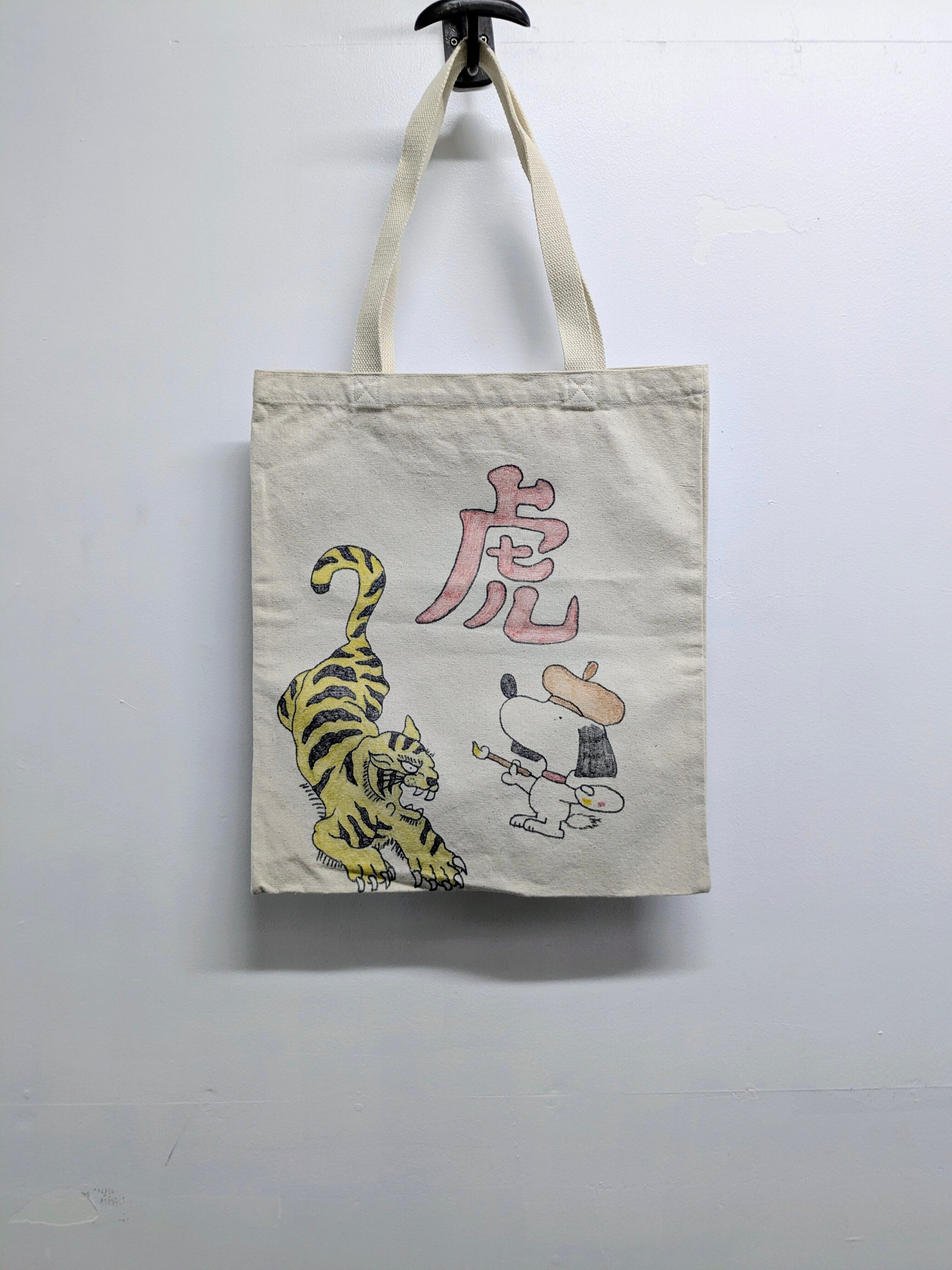 キャンバスのトートバッグにイラストを加えています。メモリアルの要素があり、どこか見たことあるキャラクターがいたりと、とにかく可愛いアイテム。全て手作業になるので、唯一無二の一点物となります。