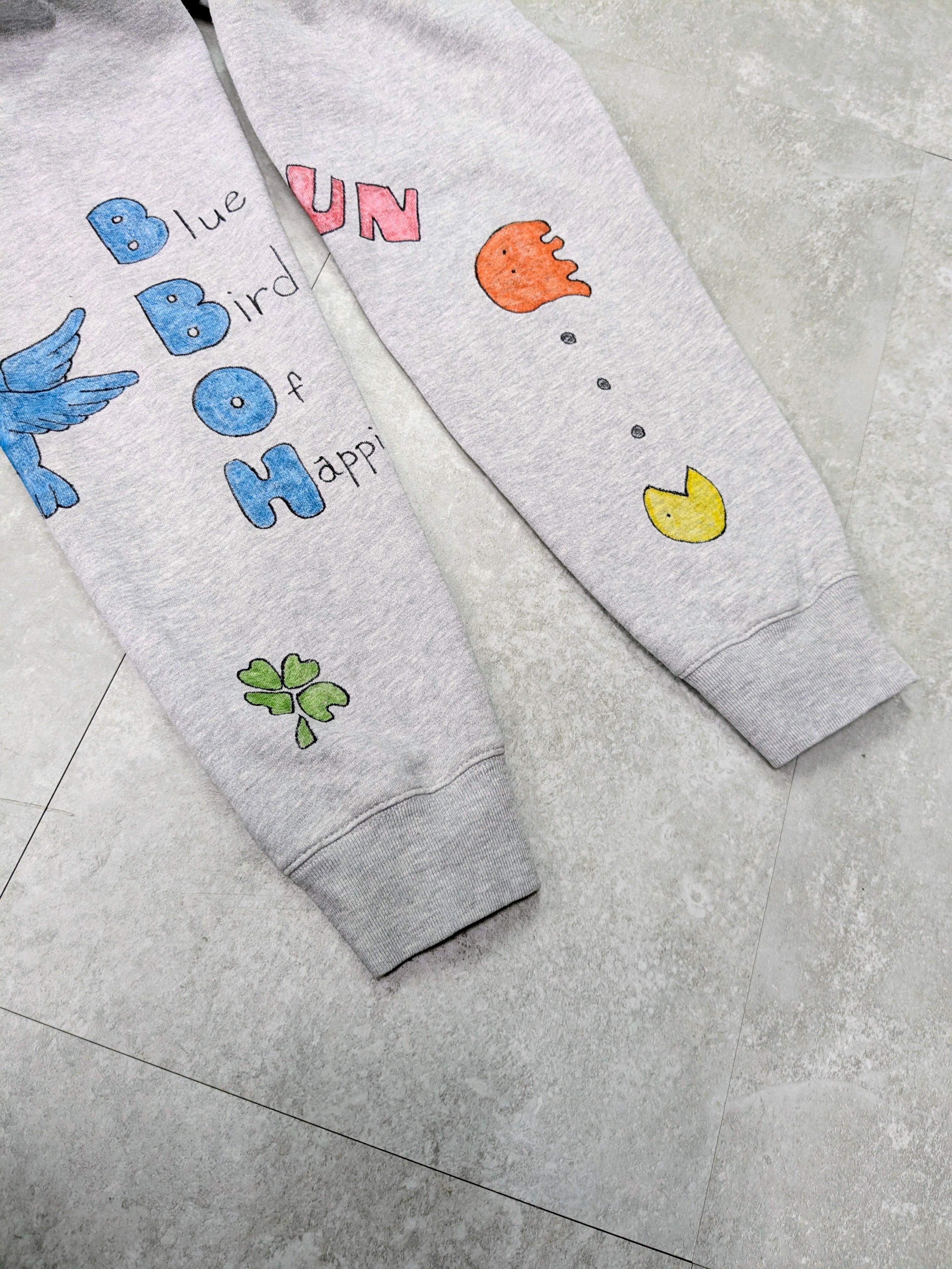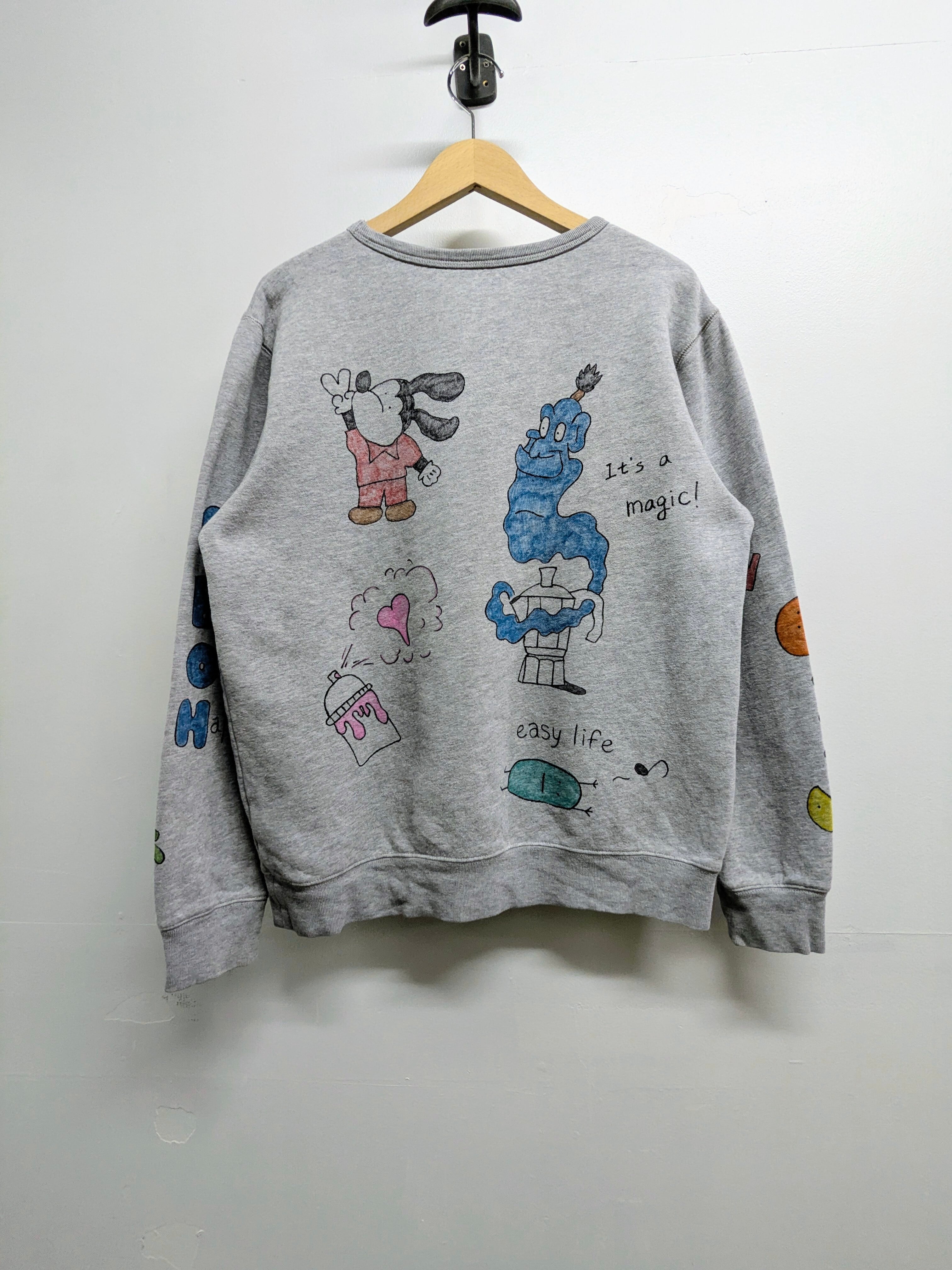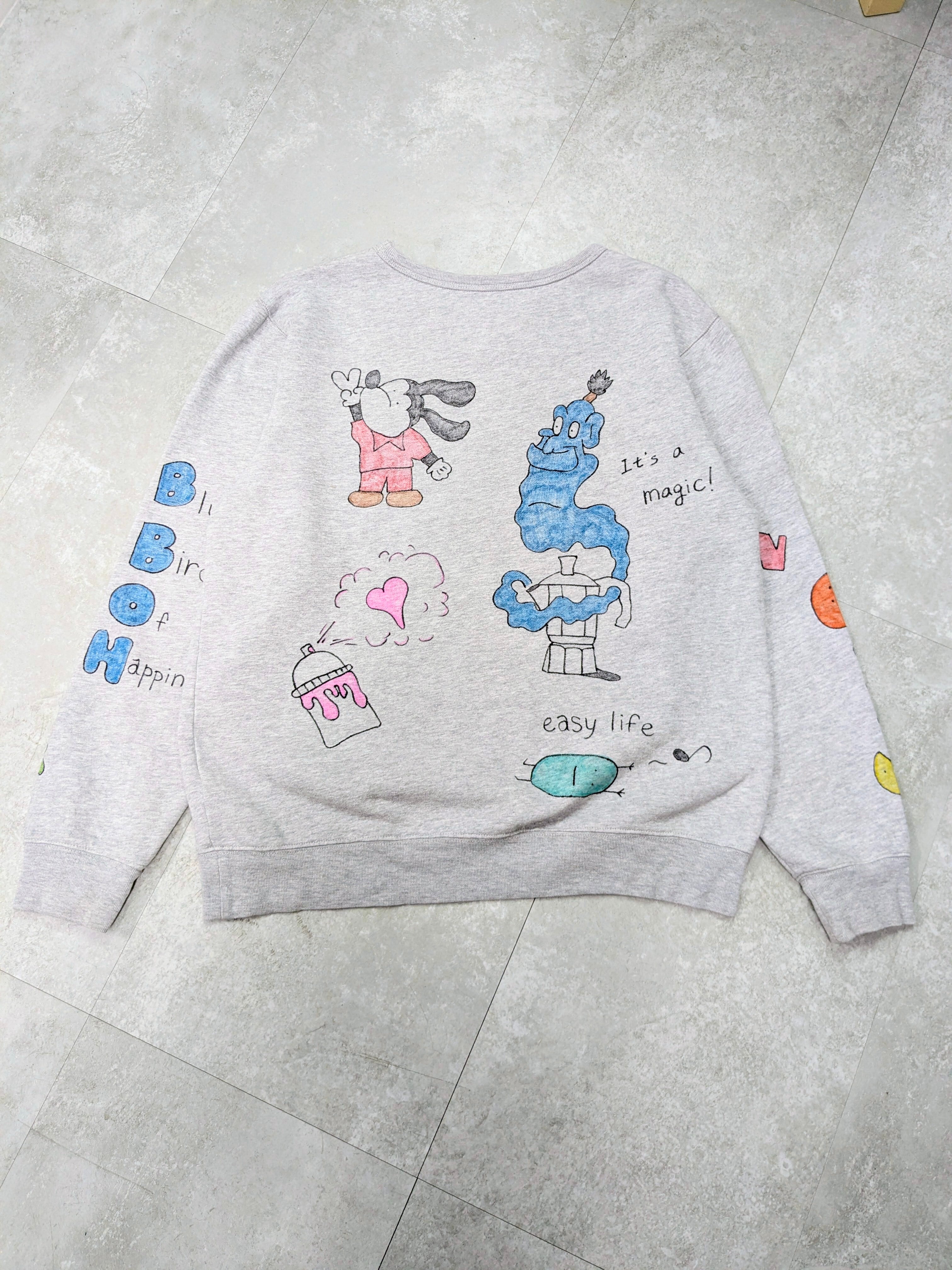 ユーズドのスウェットシャツにイラストを加えてあります。色鮮やかなカラーイラストが、メモリアル要素もありつつ、どこか見たことあるようなキャラクターがいたりと可愛いアイテムとなっています。全て手描きのため唯一無二の一点物となります。