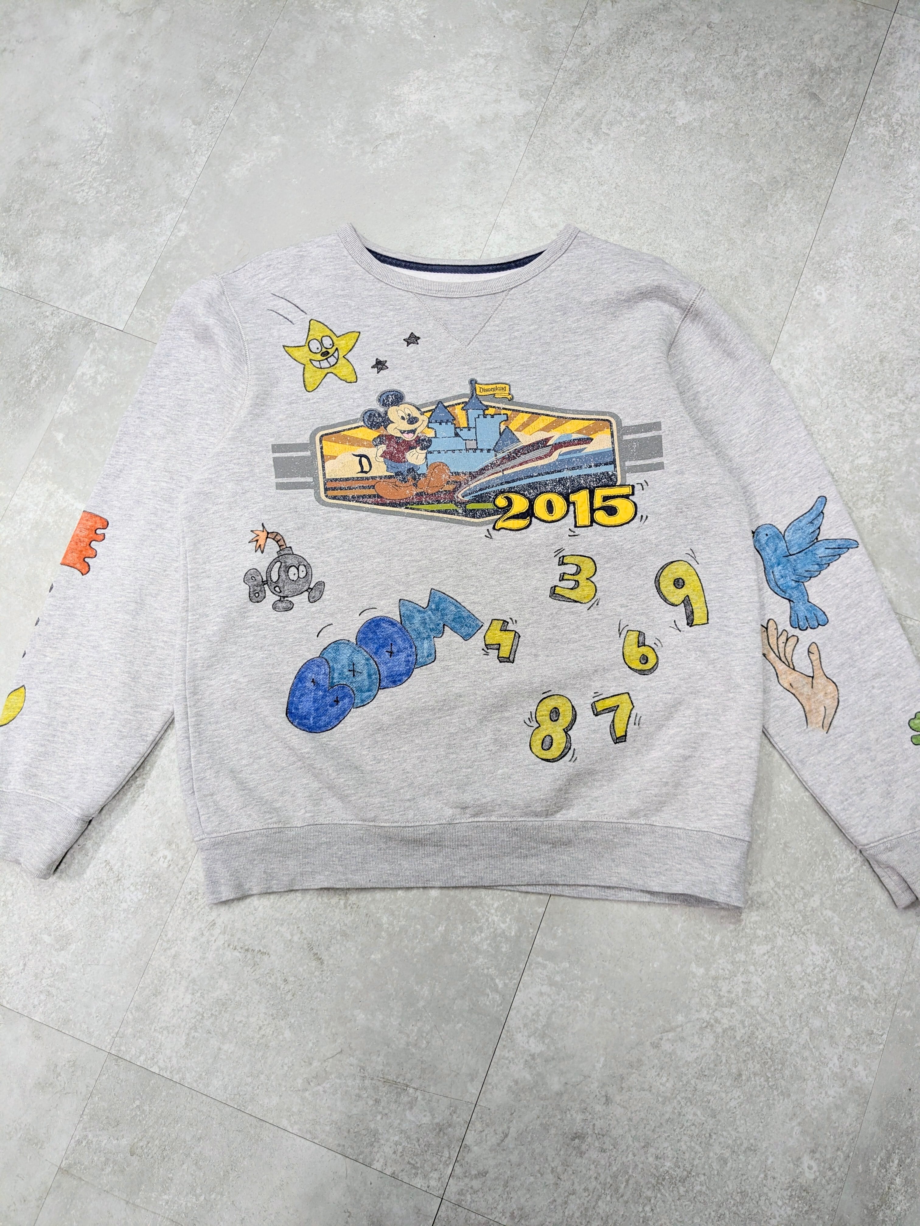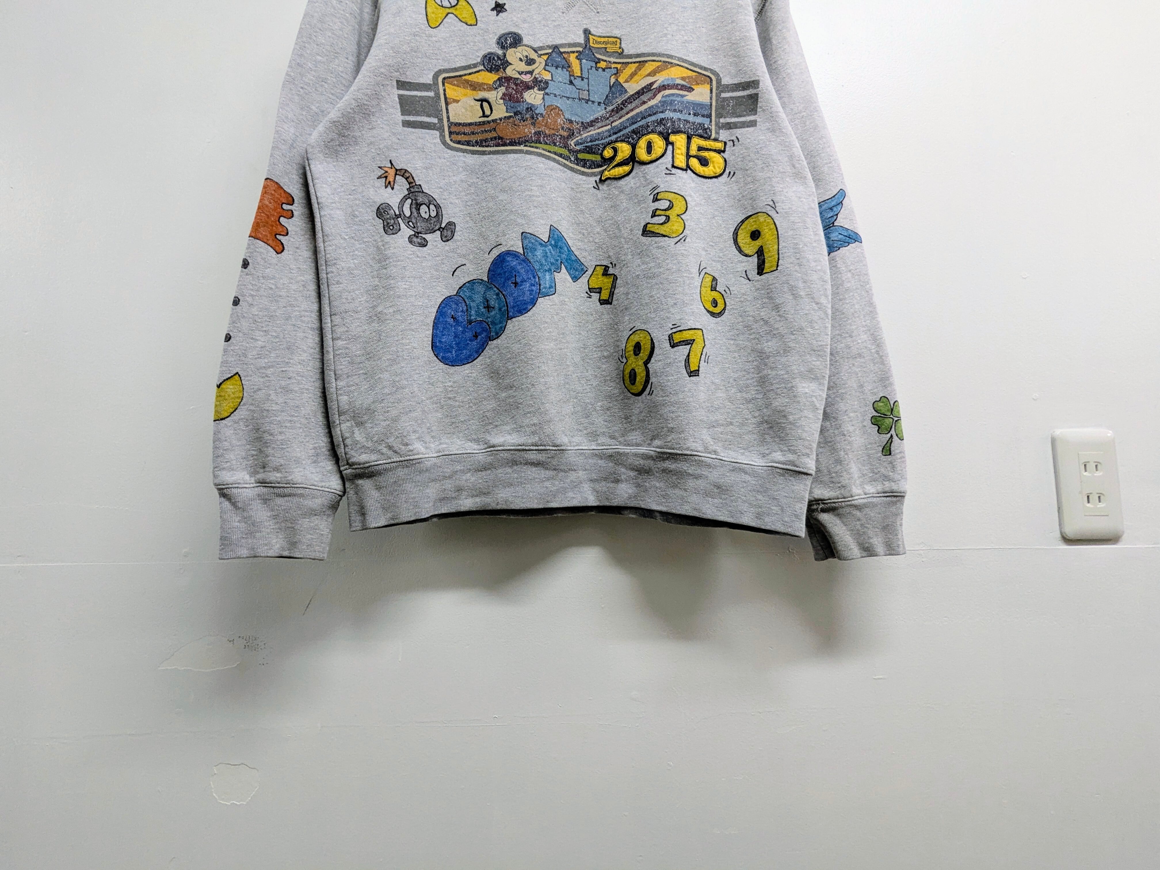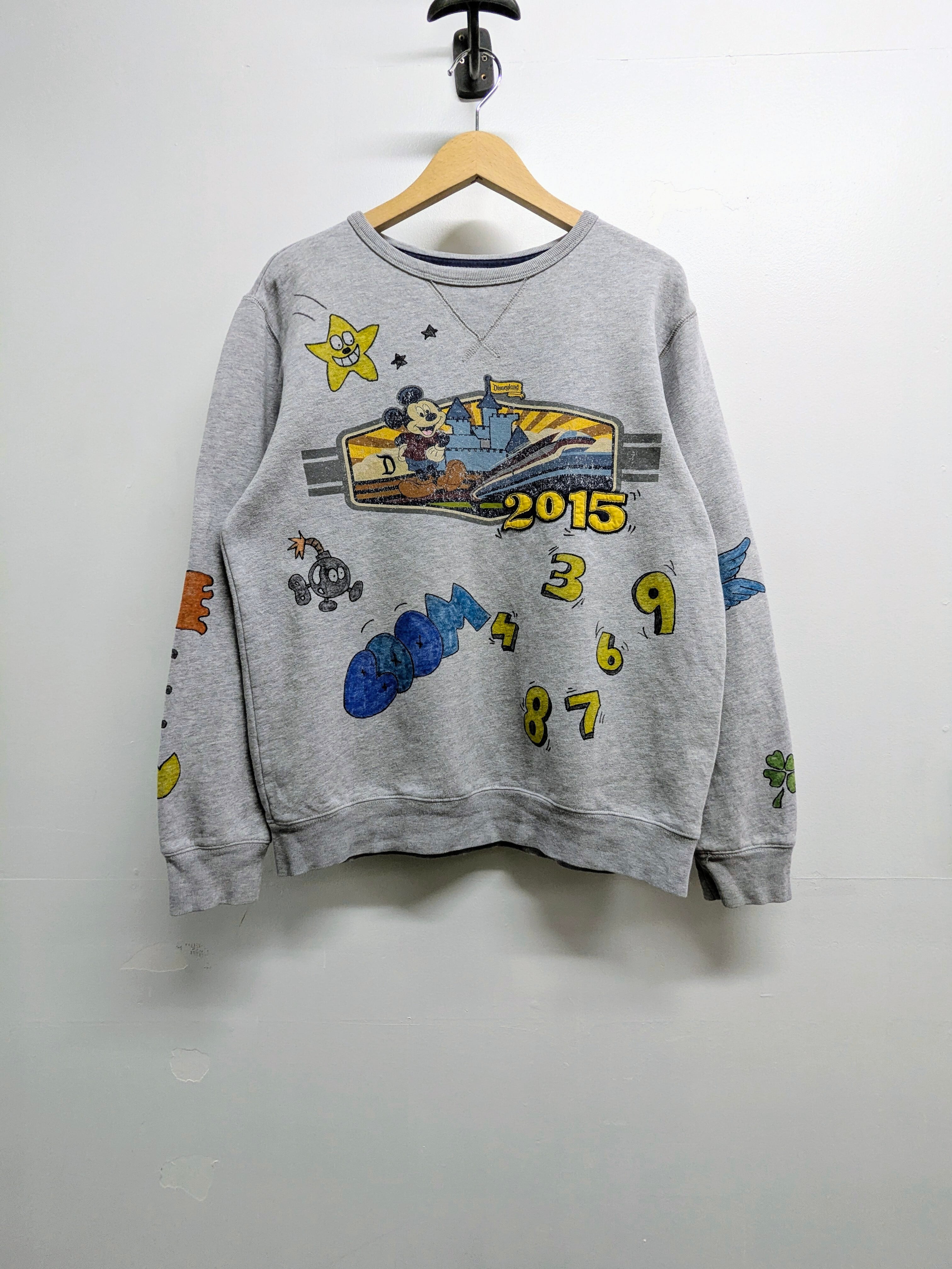 ユーズドのスウェットシャツにイラストを加えてあります。色鮮やかなカラーイラストが、メモリアル要素もありつつ、どこか見たことあるようなキャラクターがいたりと可愛いアイテムとなっています。全て手描きのため唯一無二の一点物となります。