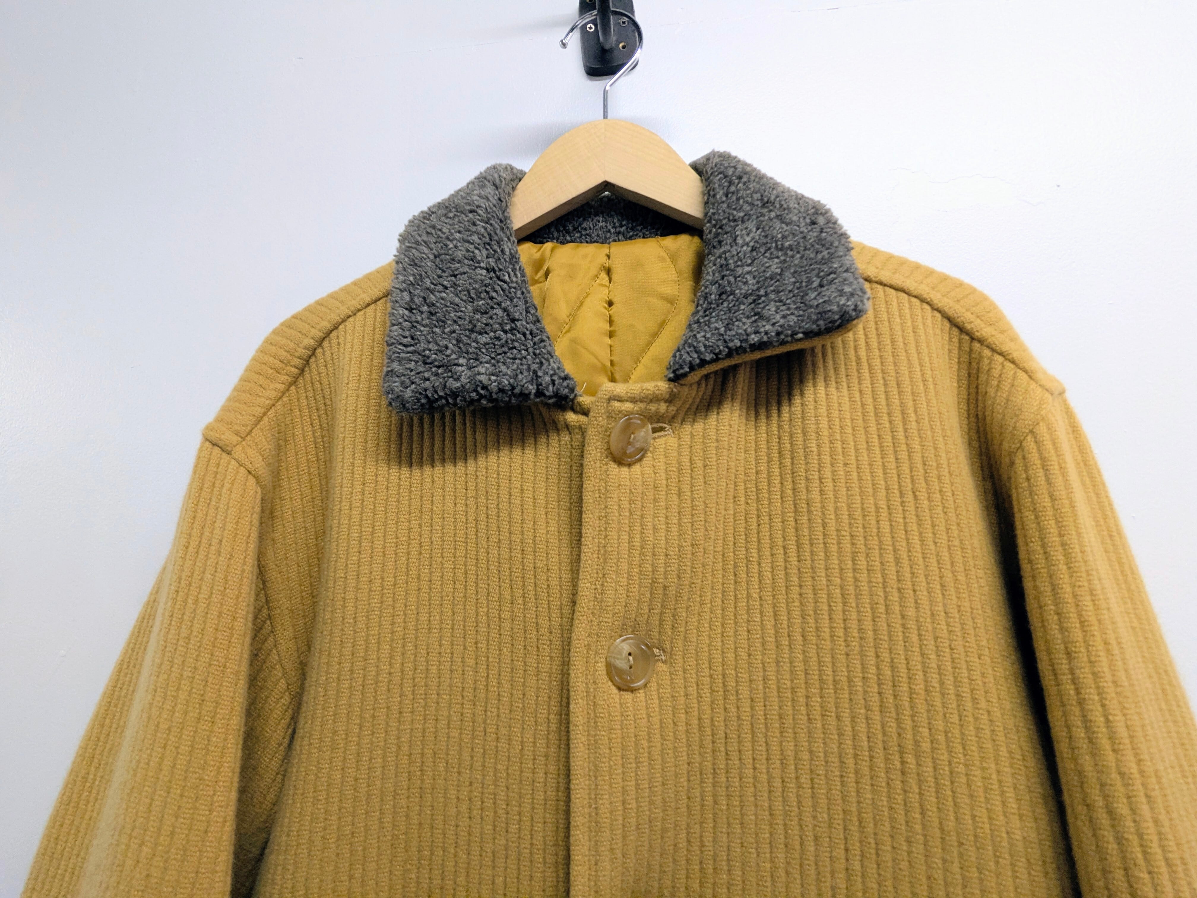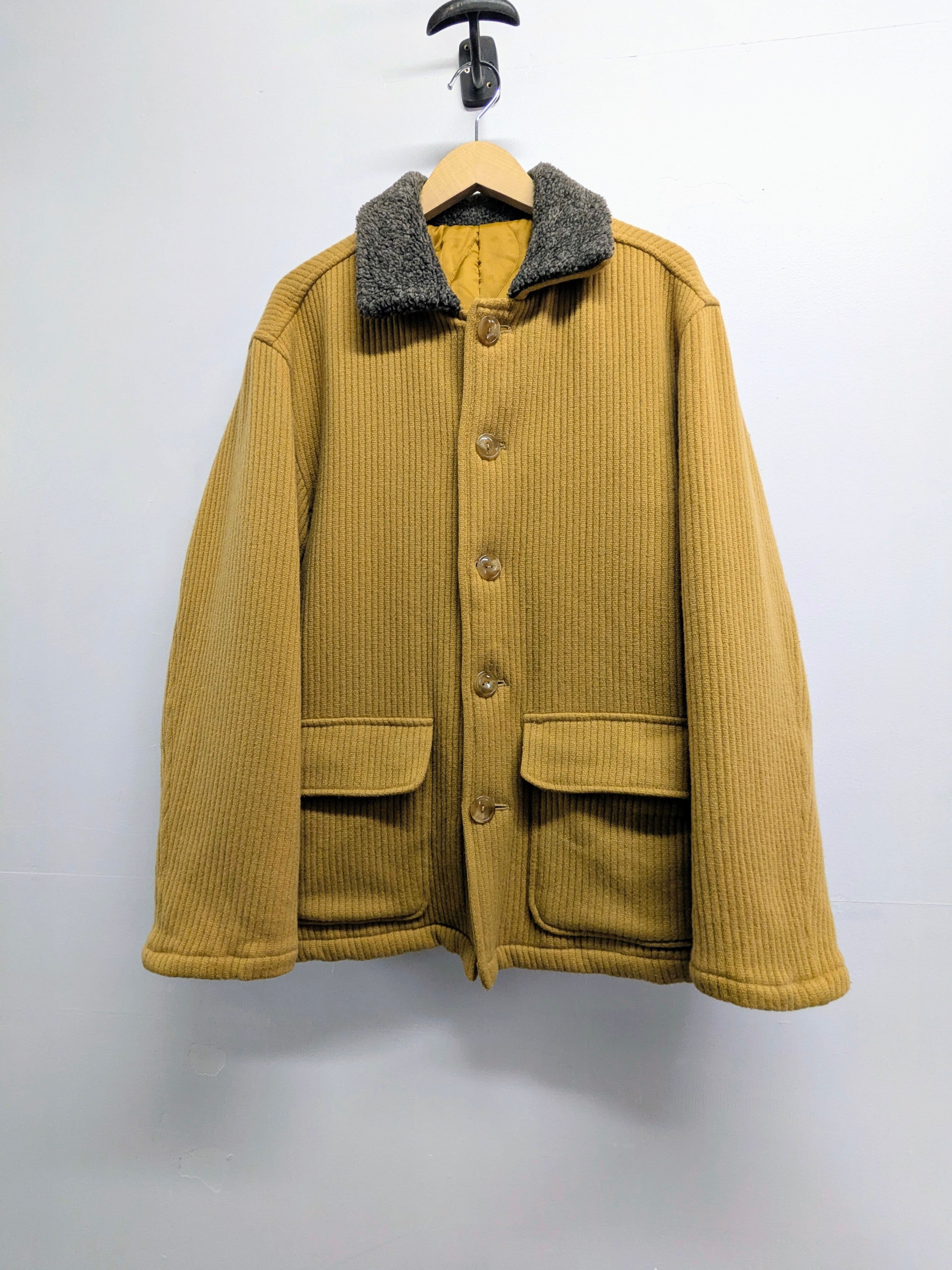 素材はコーデュロイ特有のゴワつきはなく、柔らかく着やすくなっています。カバーオールのようなディティールで、襟はボアに切り替わっています。ルーズなシルエットでインナーも選ばず羽織っていただけます。