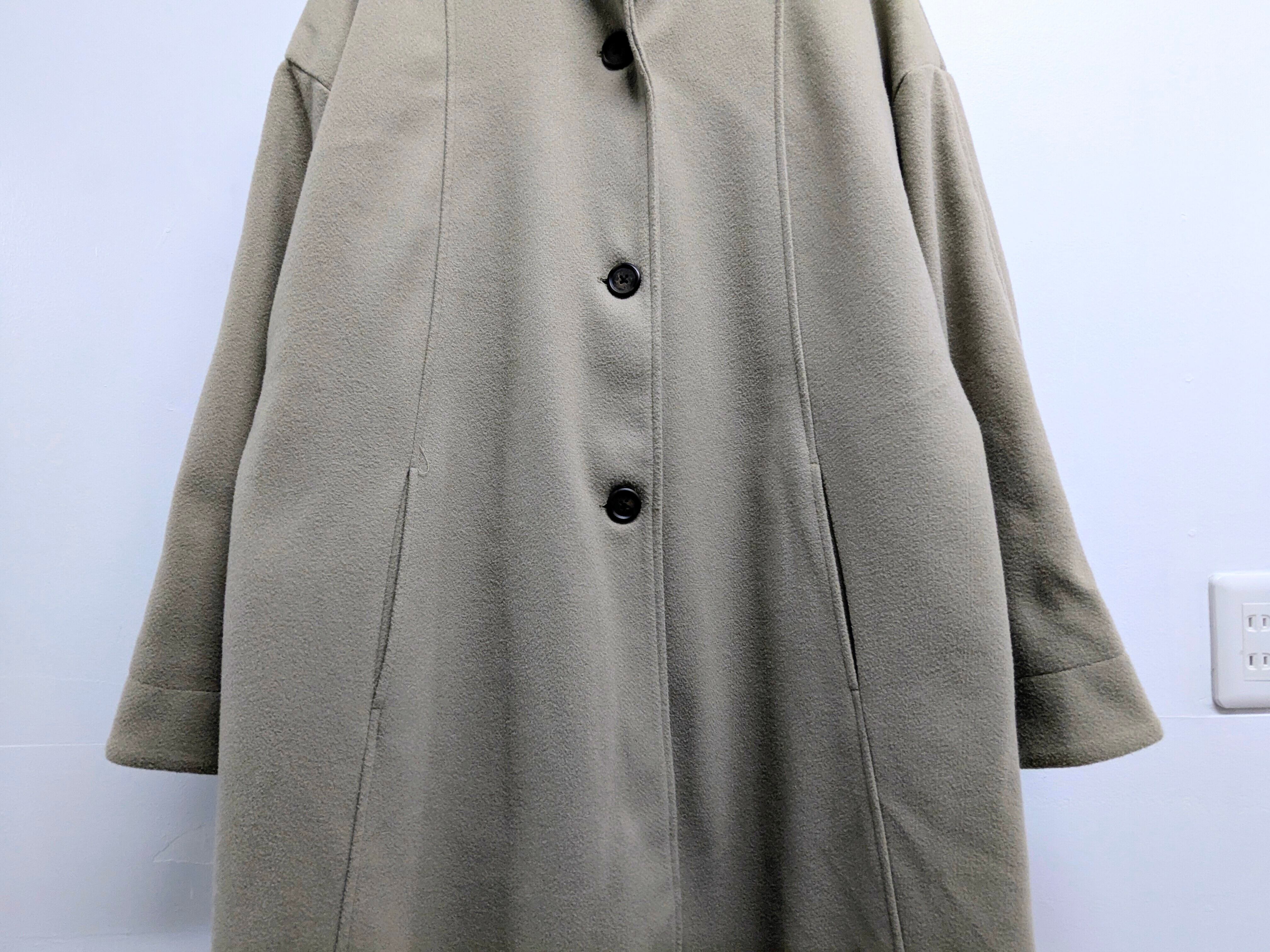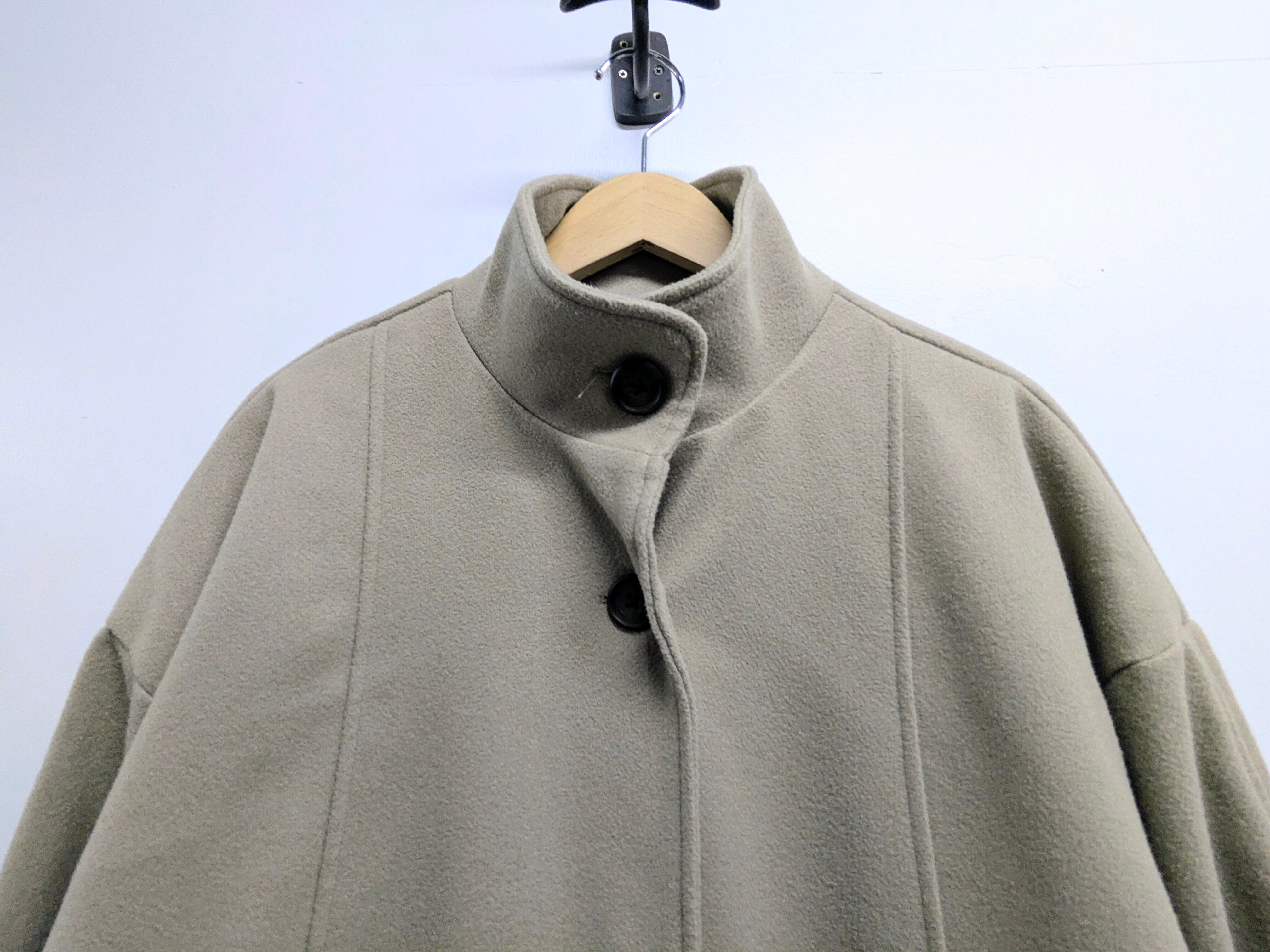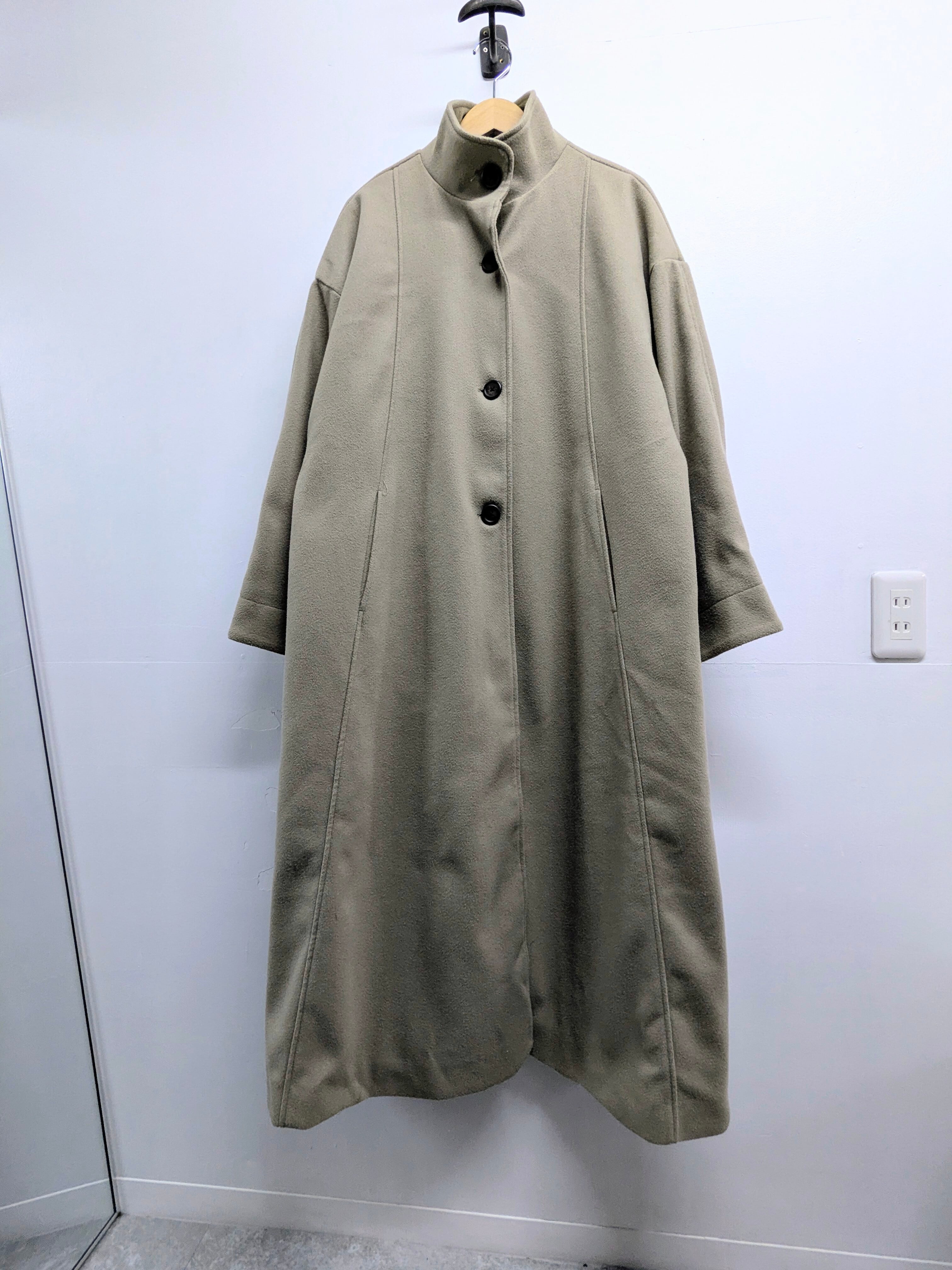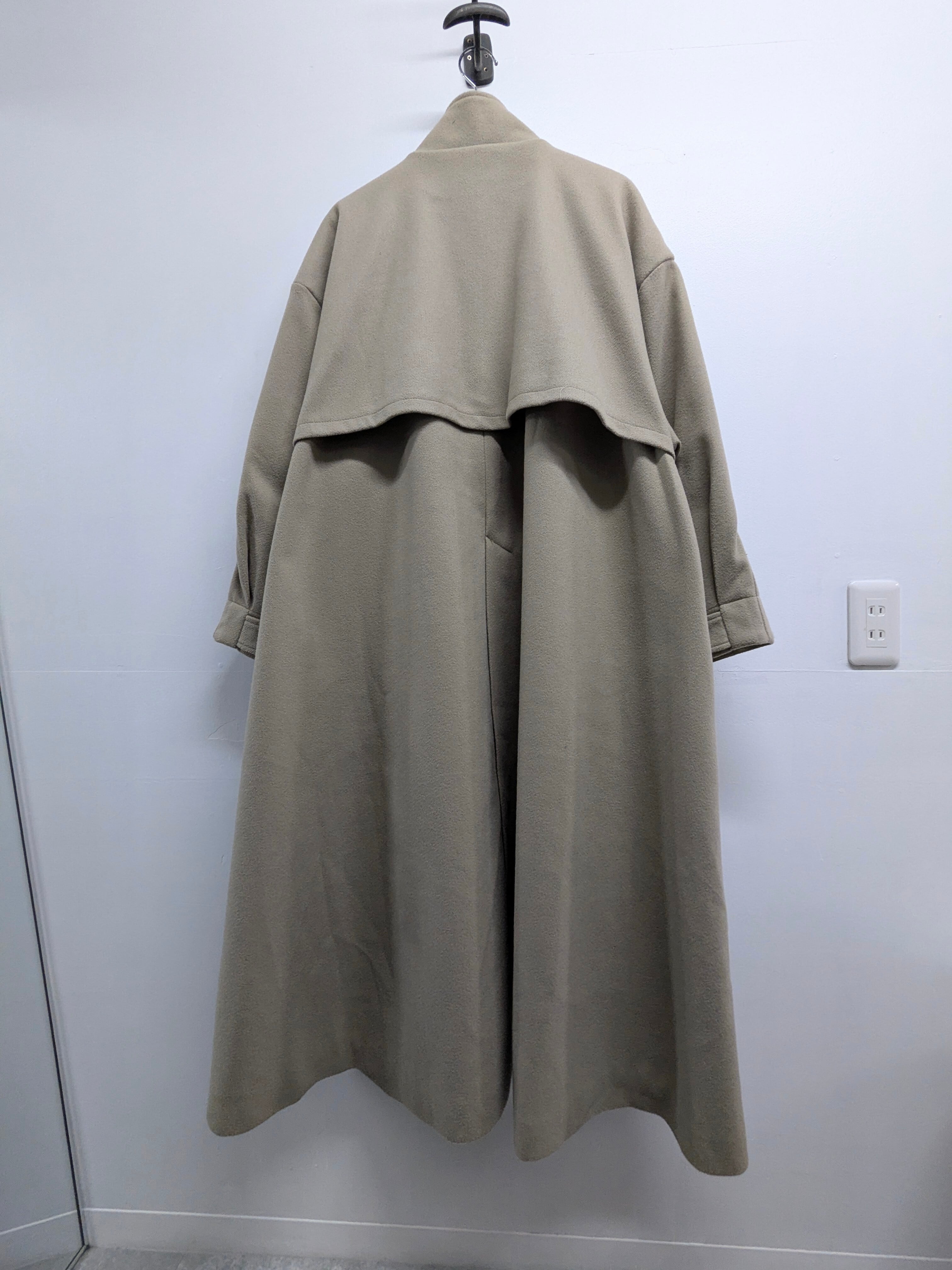ロング、ワイドのスーパーオーバーサイズのコート。ボタンの合わせは右前ですが、男性でもかなりゆったりと着ていただけます。後ろに深めに入ったスリットが足さばきしやすくなっています。グレージュのような色味がとても上品な面感となっています。