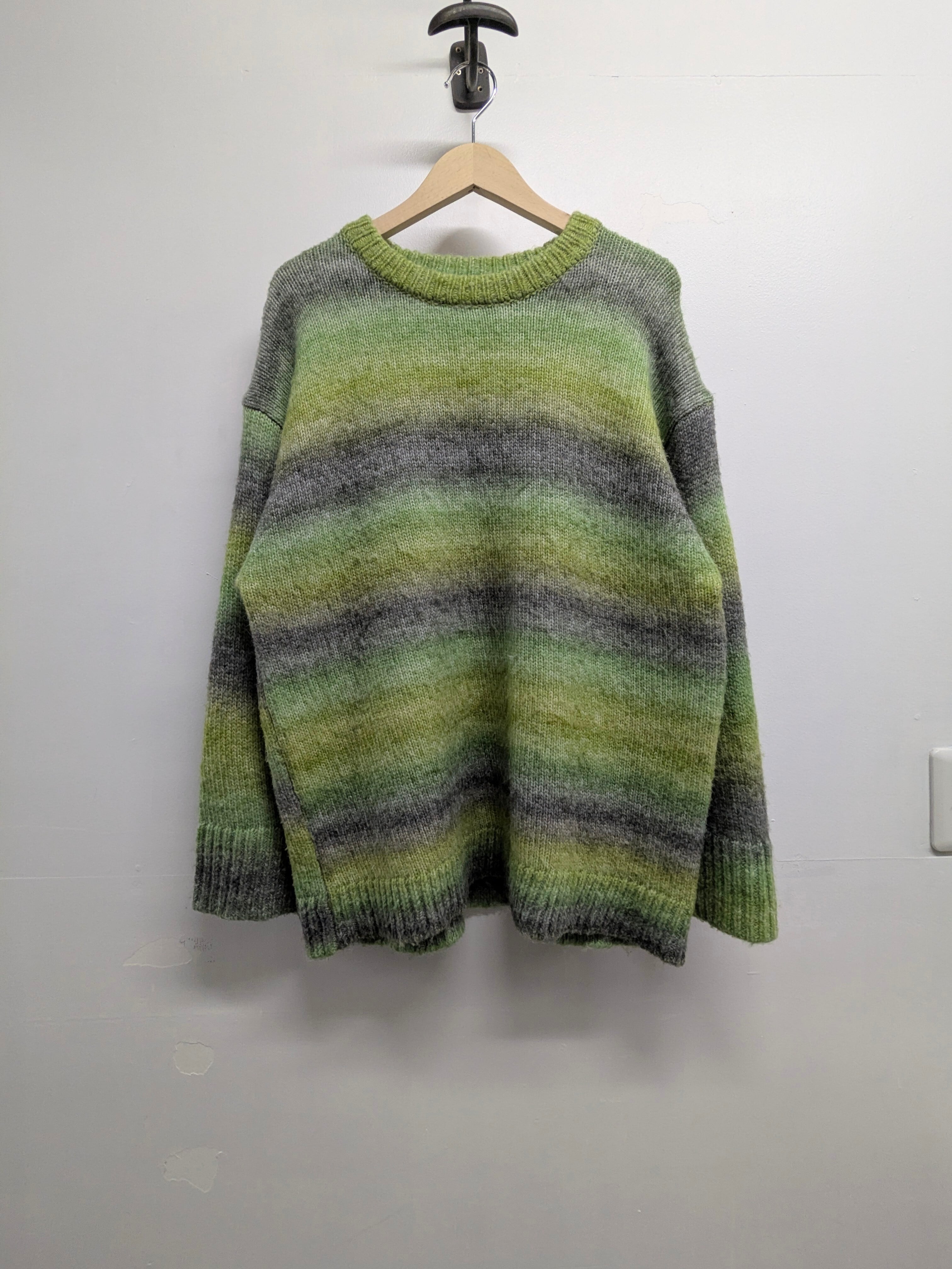 淡い色味が合わせやすく、可愛いアイテム。グリーン系も淡色でなくグラデーションとなっているのも目を引きます。シルエットもゆったりめで今の気分にちょうどいい一着。