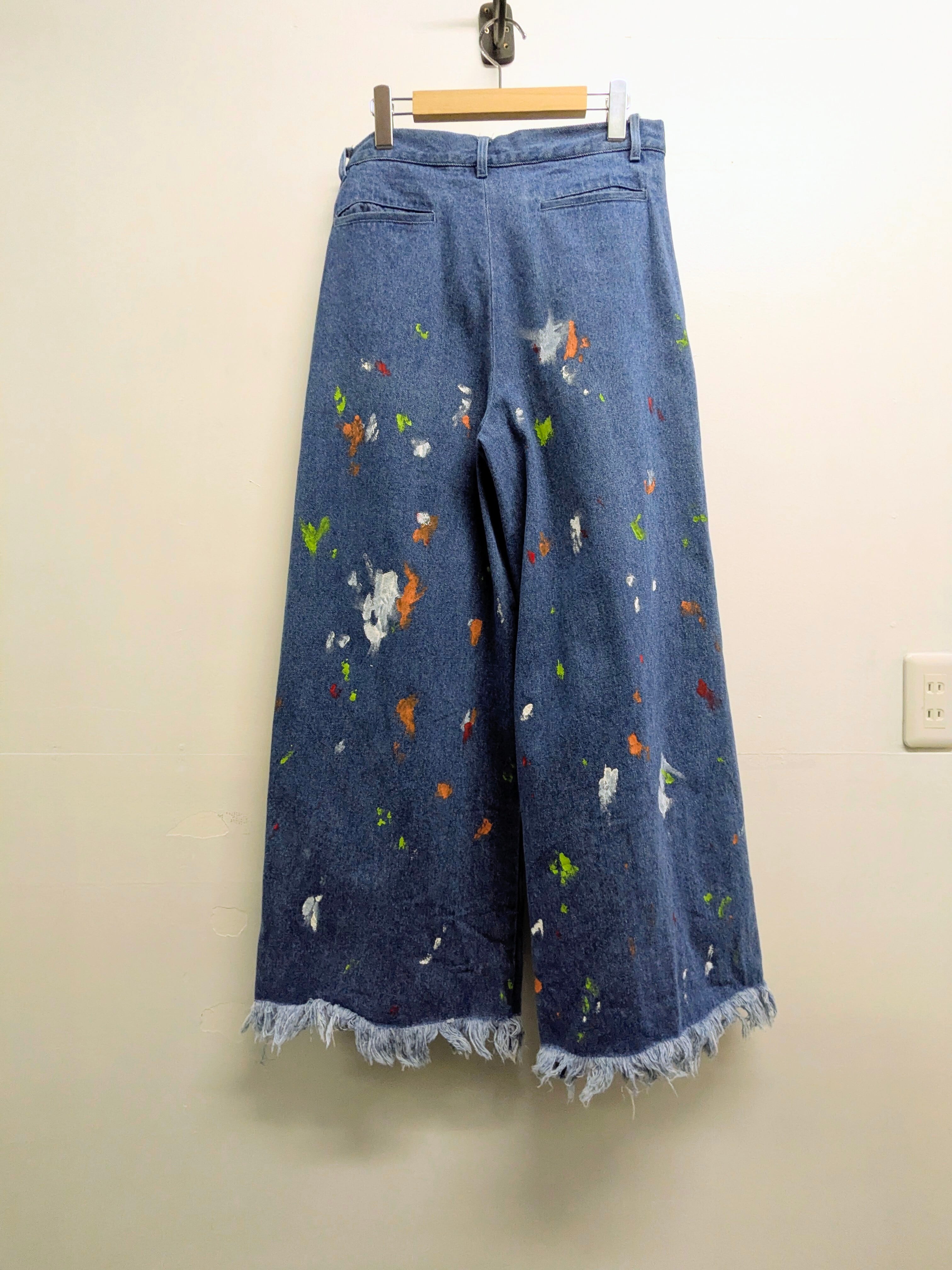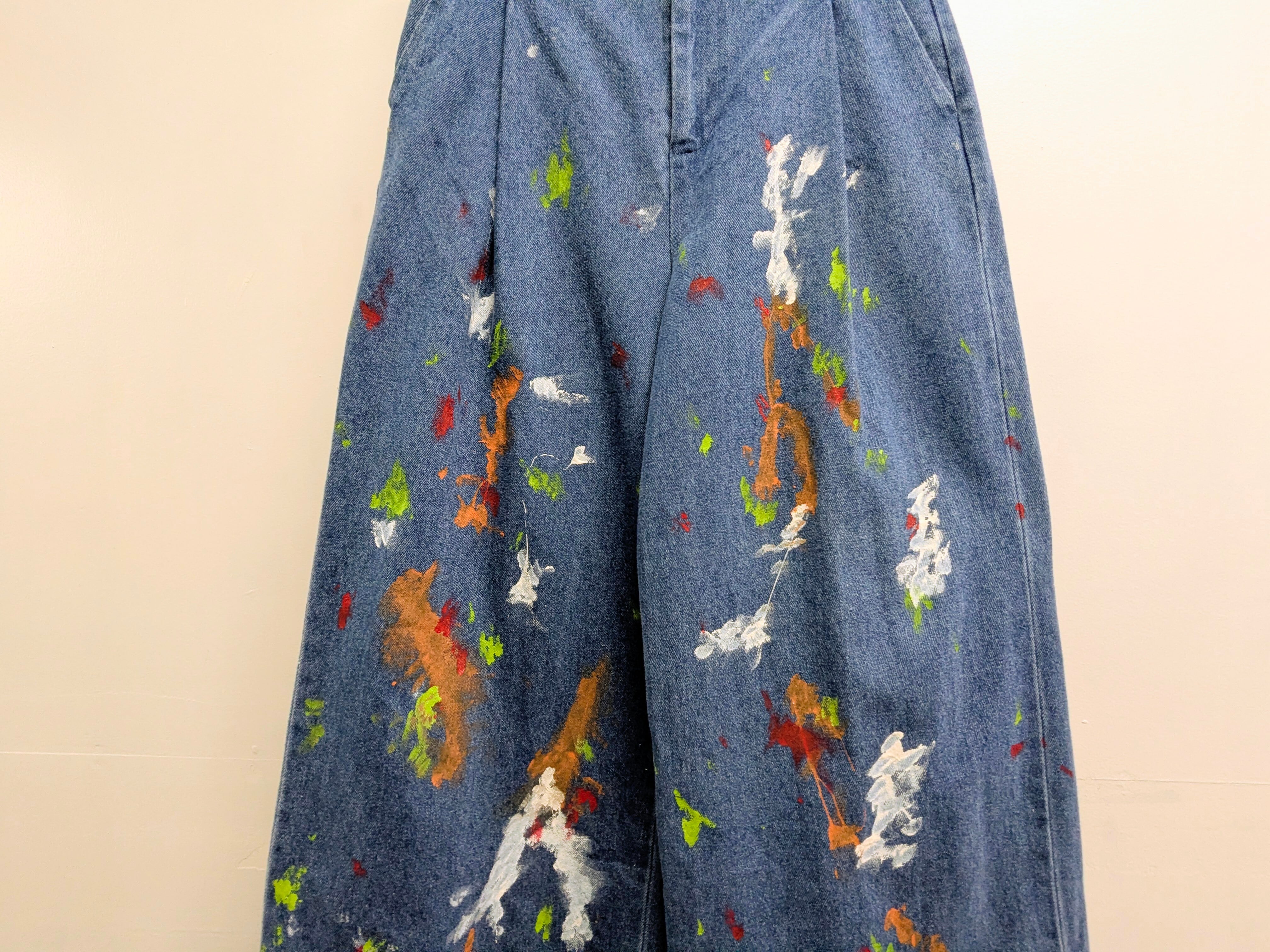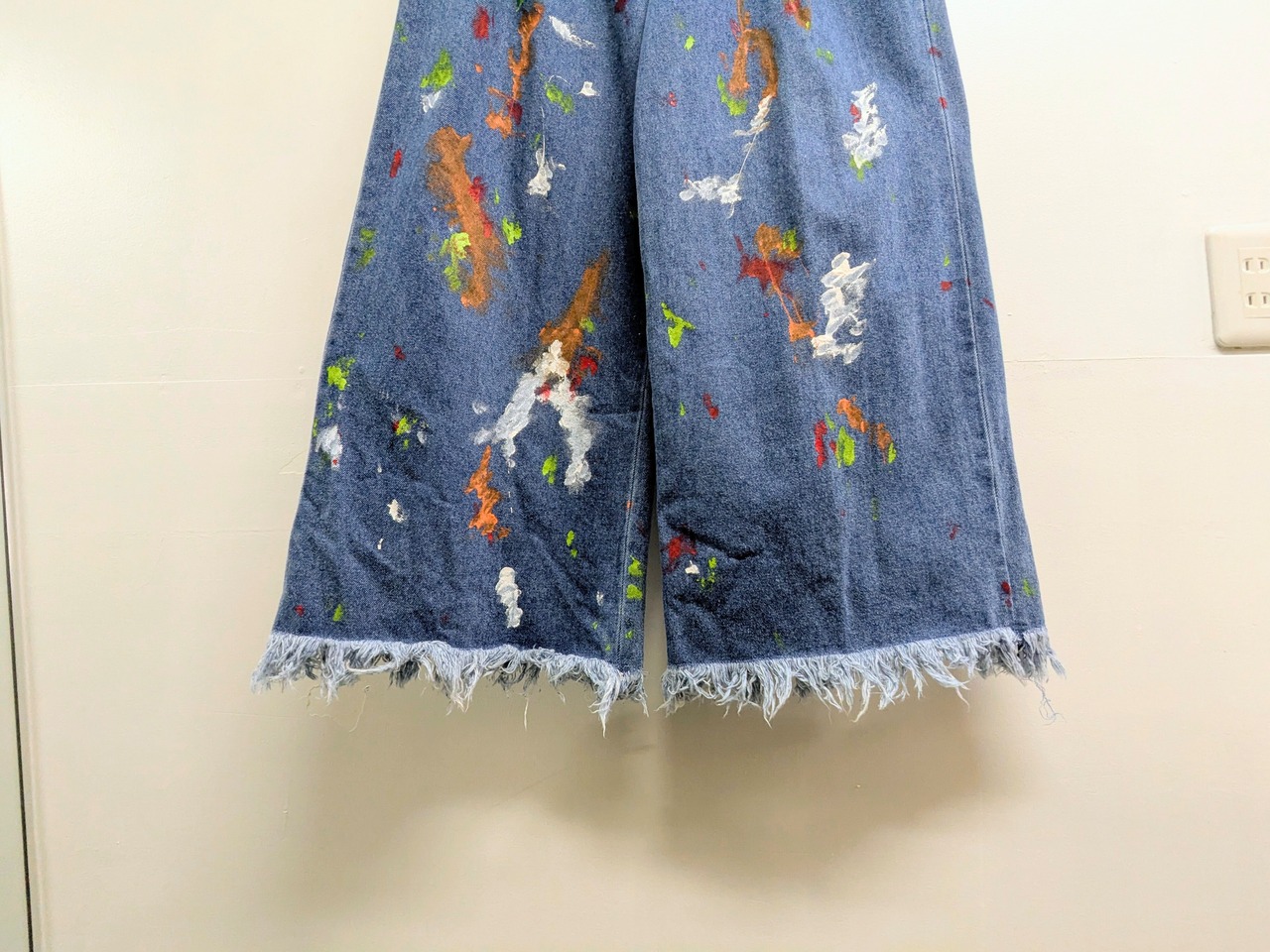 かなりワイドなシルエットなデニムにペイントをしたアイテム。リアルワークではつかなそうなアーティスティックなデザインとなっています。フリンジのようになっていますが、縫ってあるのでそこからほつれないようになっています。こちら、ユーズドのボディに、手作業でペイントをしてあり、唯一無二の一点物となります。