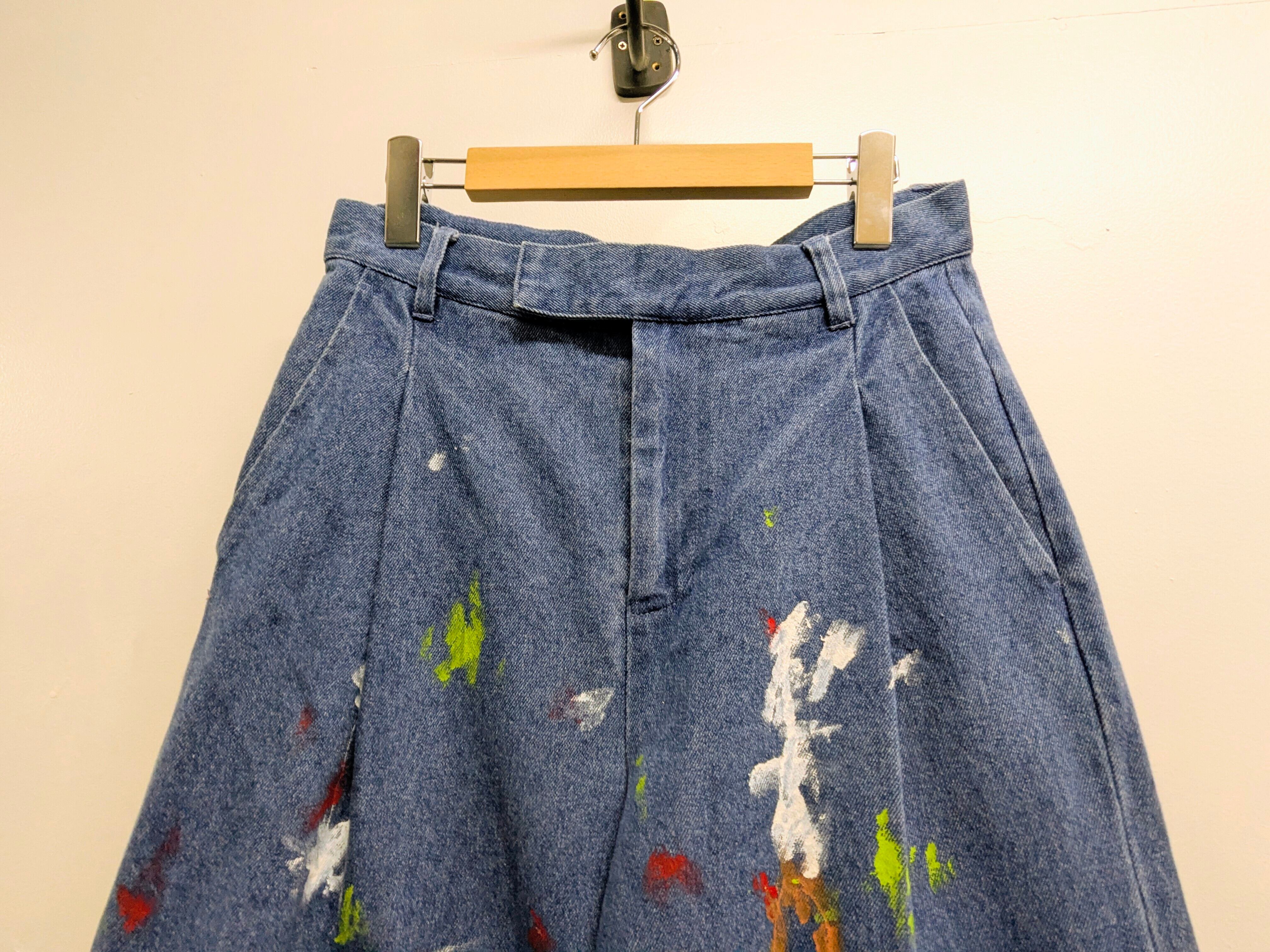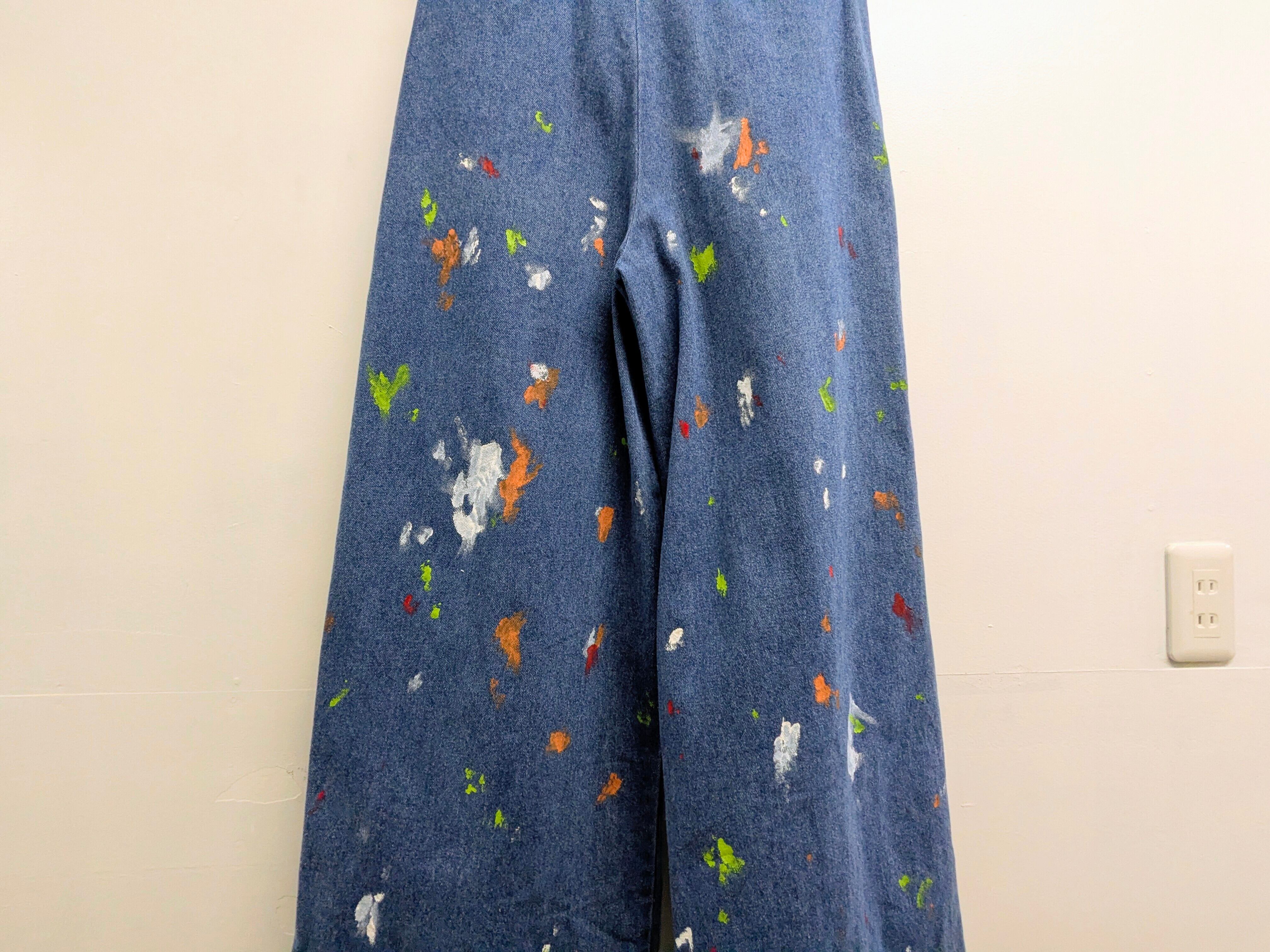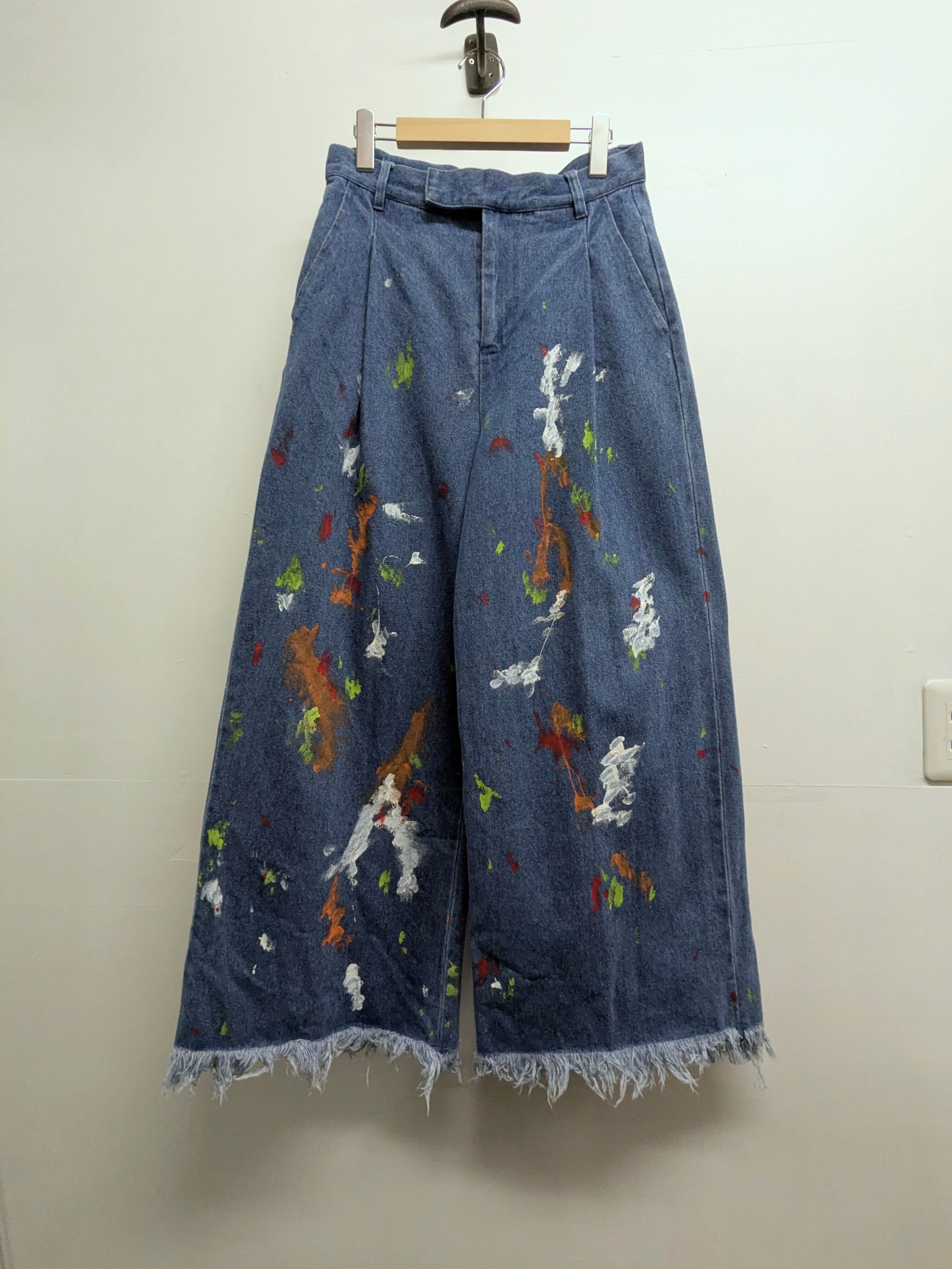 かなりワイドなシルエットなデニムにペイントをしたアイテム。リアルワークではつかなそうなアーティスティックなデザインとなっています。フリンジのようになっていますが、縫ってあるのでそこからほつれないようになっています。こちら、ユーズドのボディに、手作業でペイントをしてあり、唯一無二の一点物となります。