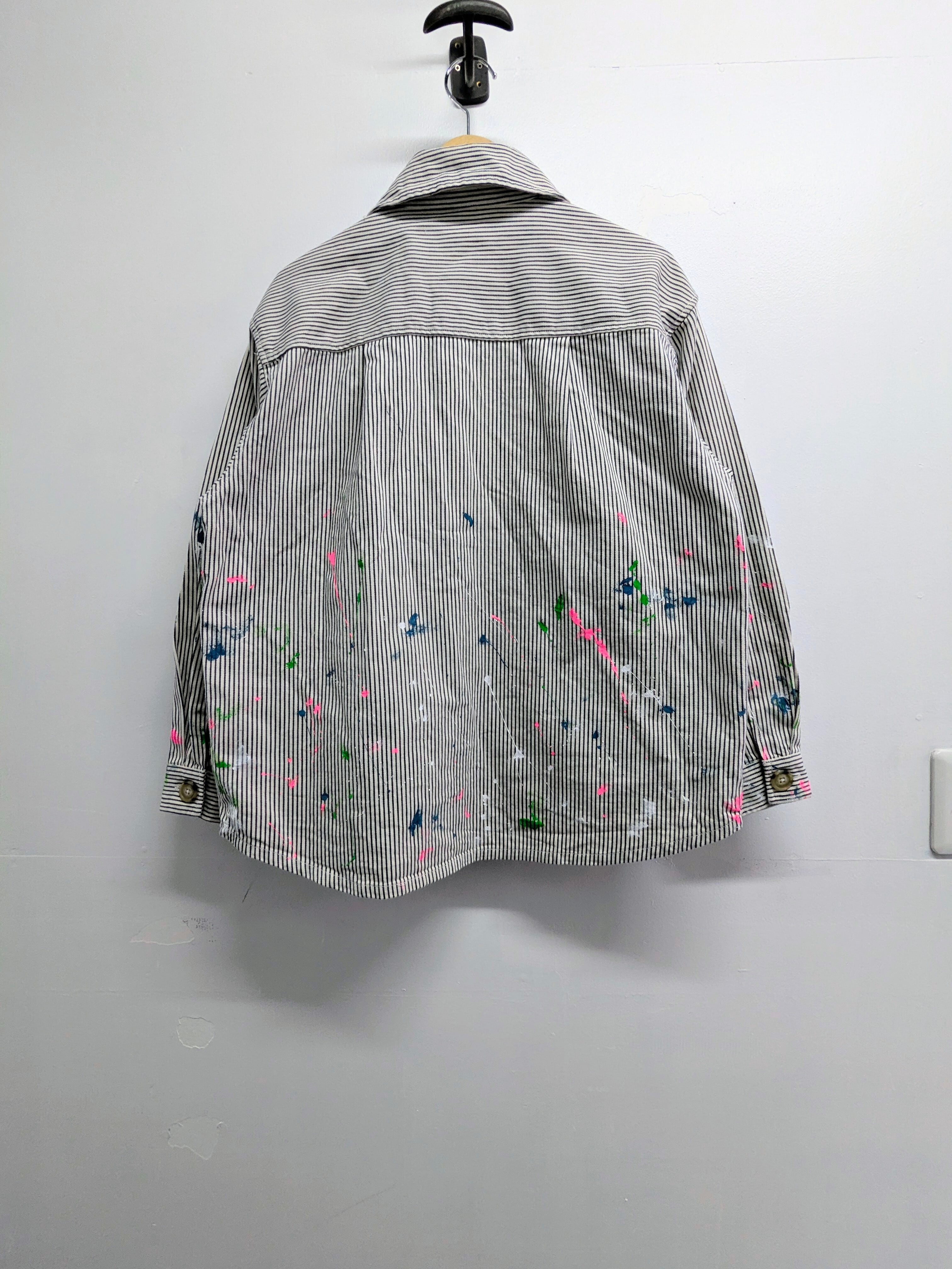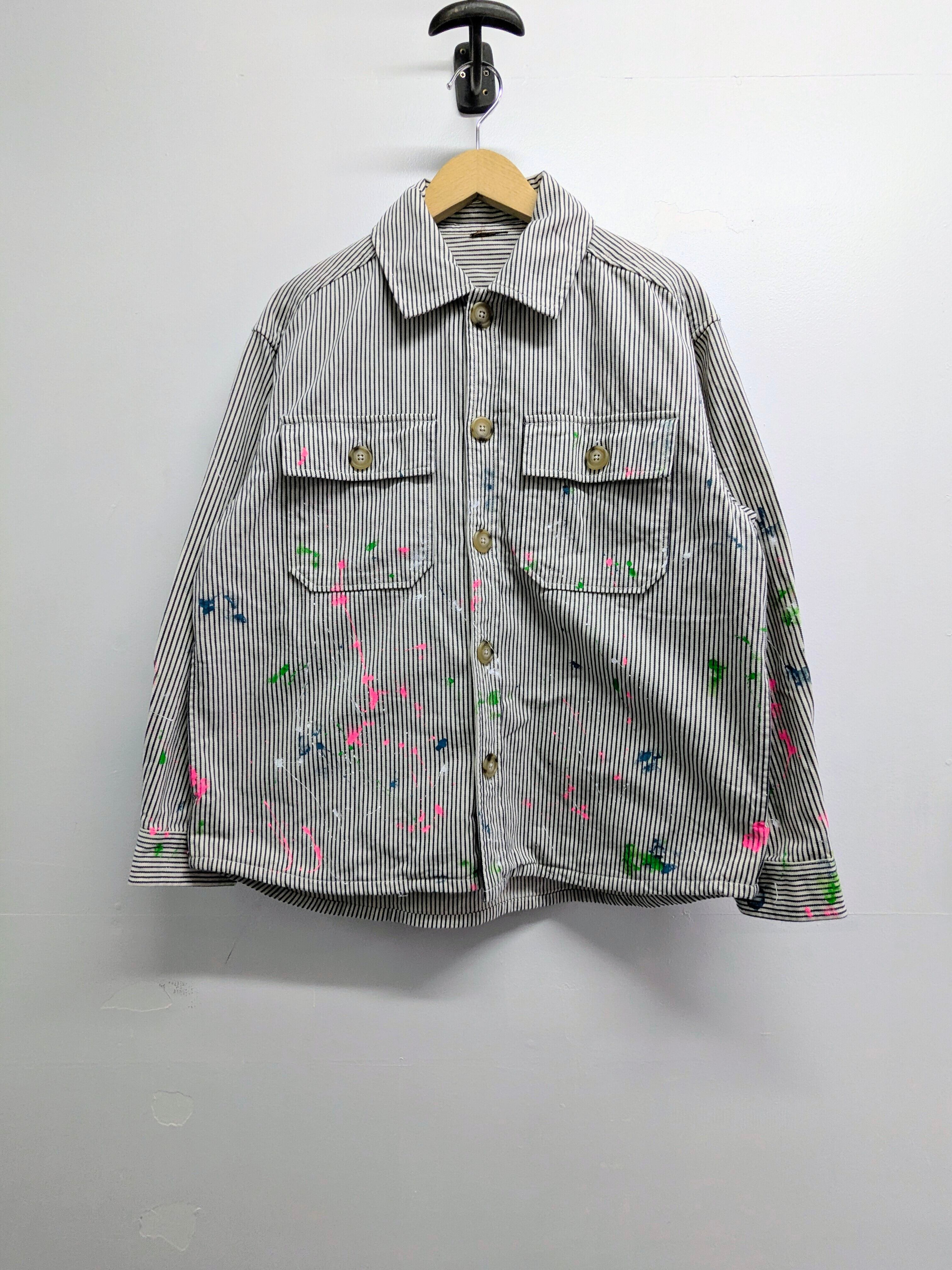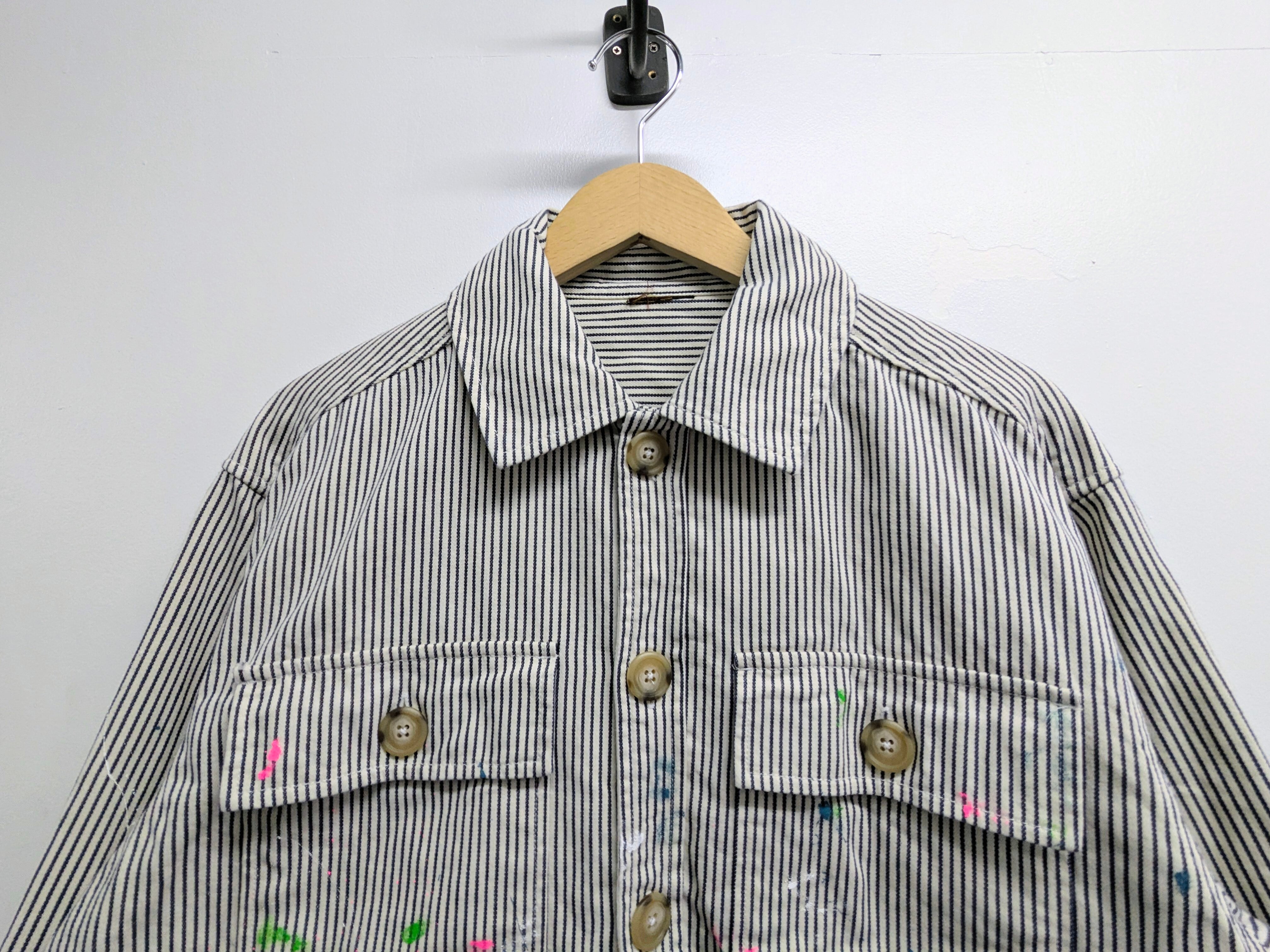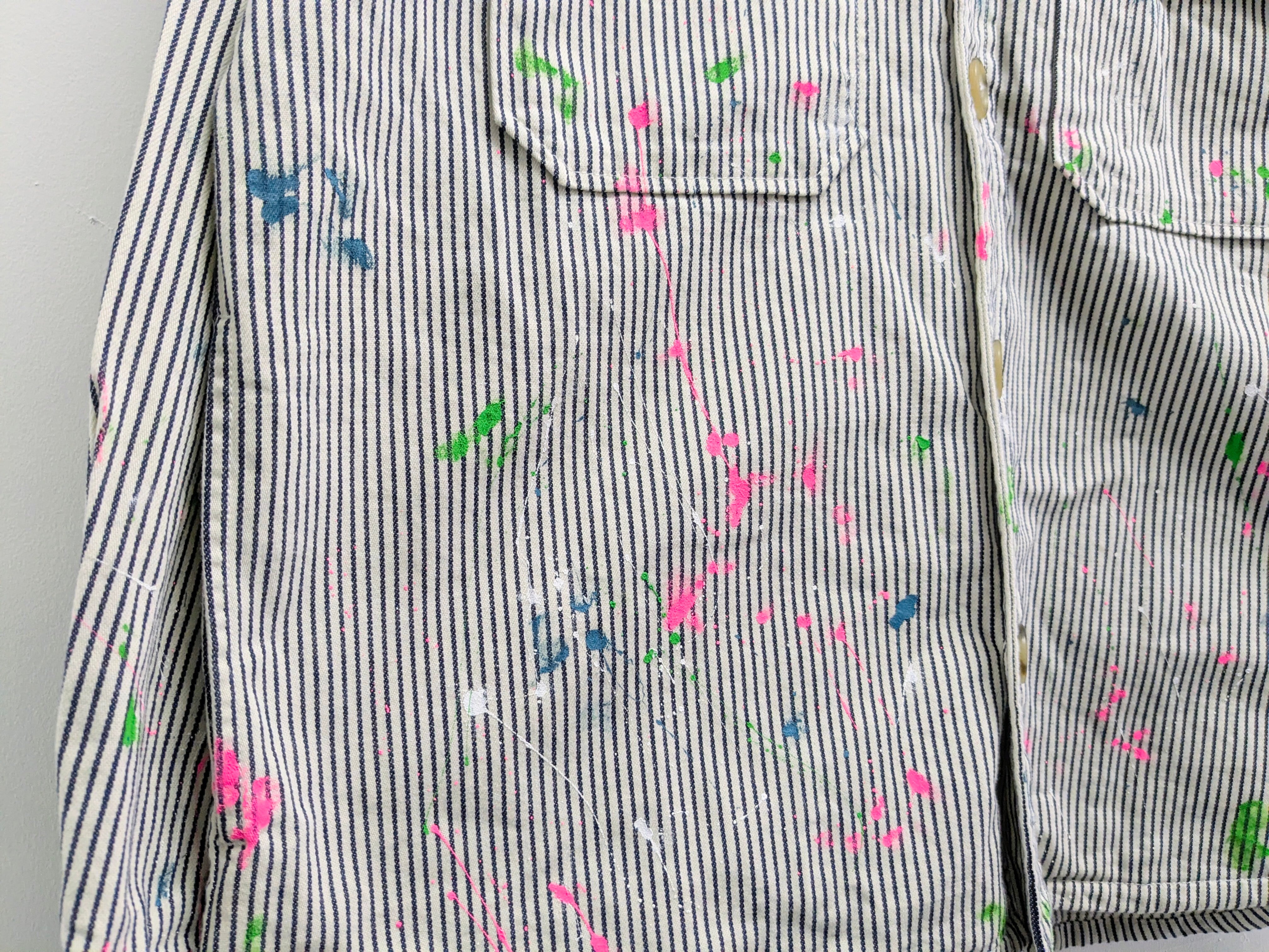 リアルワークで汚れたようなデザイン。でも、色は明るめの色がとんでおり、もはやアートのような仕上がりの一着。色使いなど目を引くアイテム。