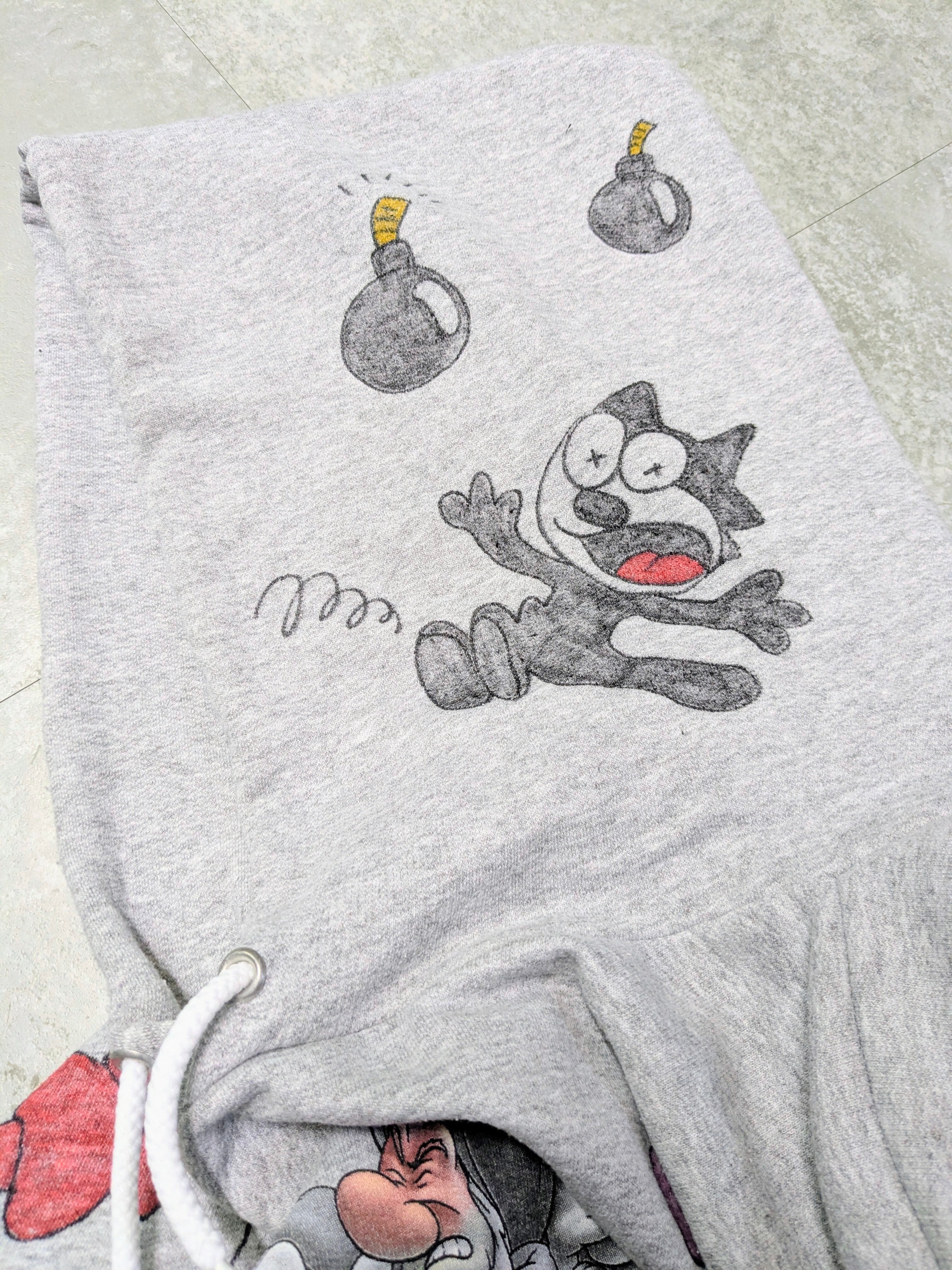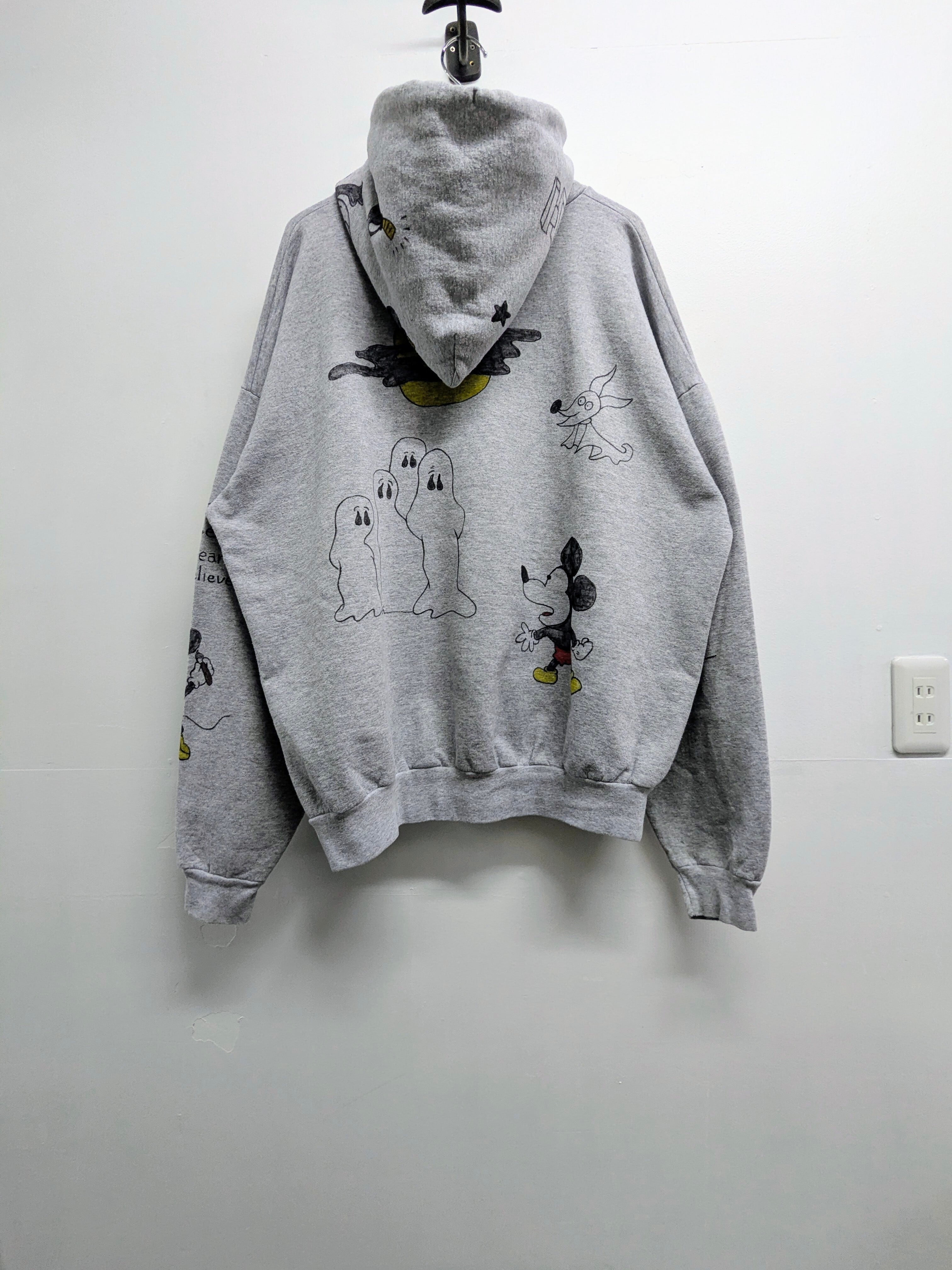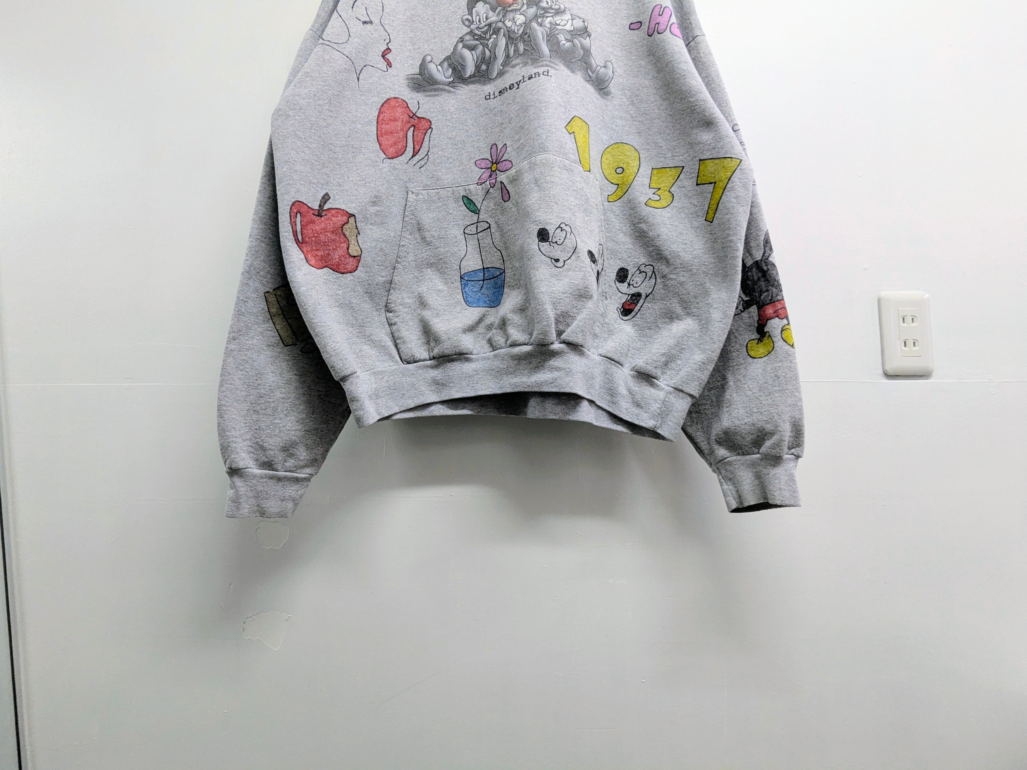 ユーズドのキャラクタースウェットを使用しています。表は元々のプリントあり、バックも表面のようなイラストがあり、両A面のようなスウェット。