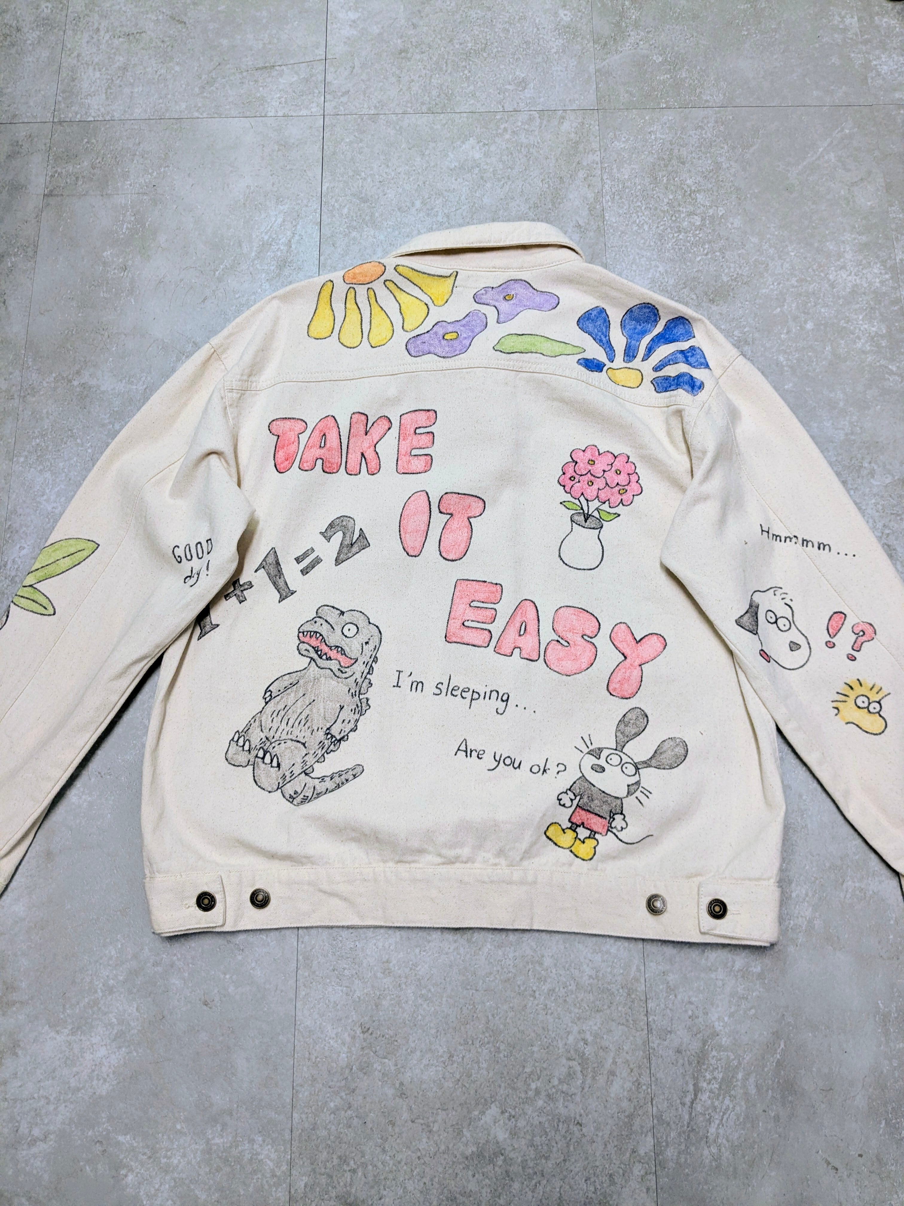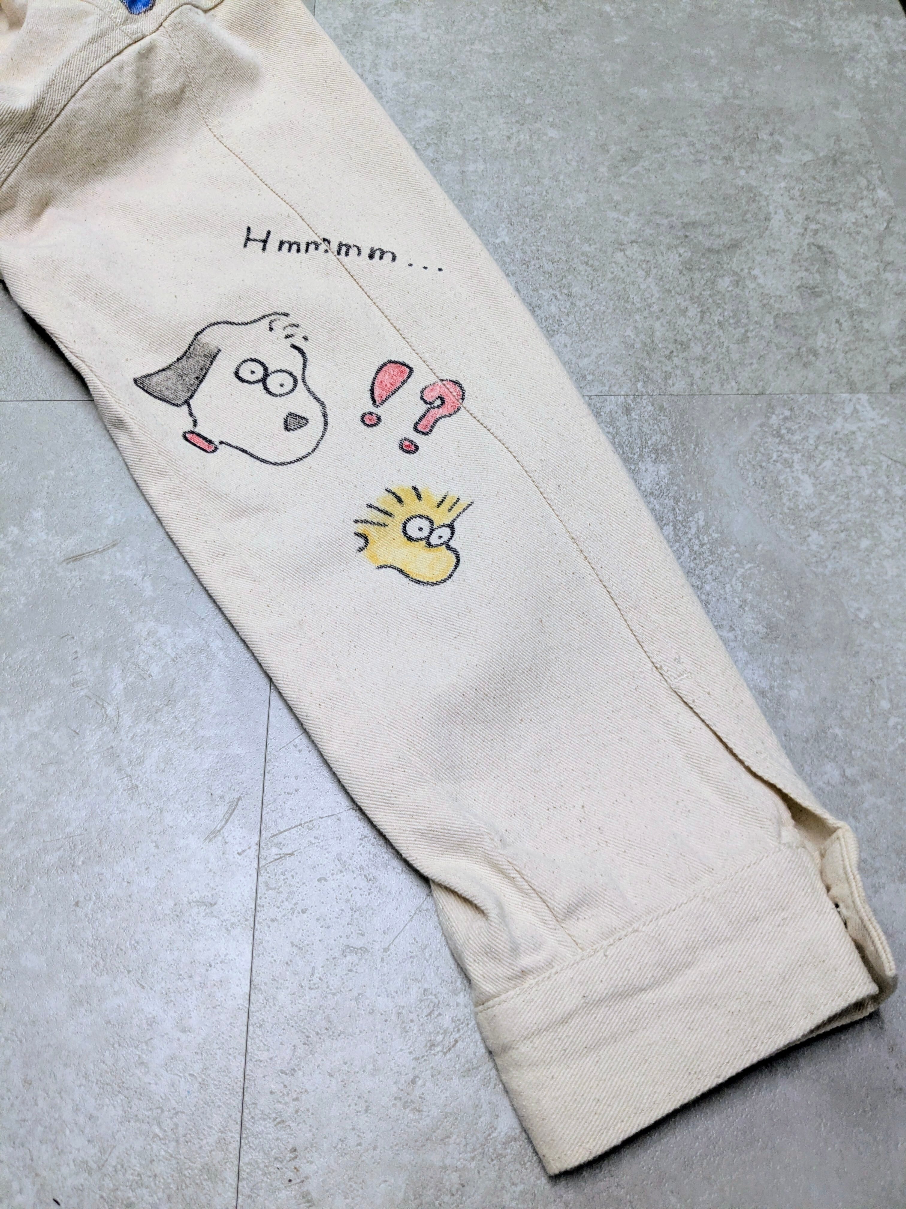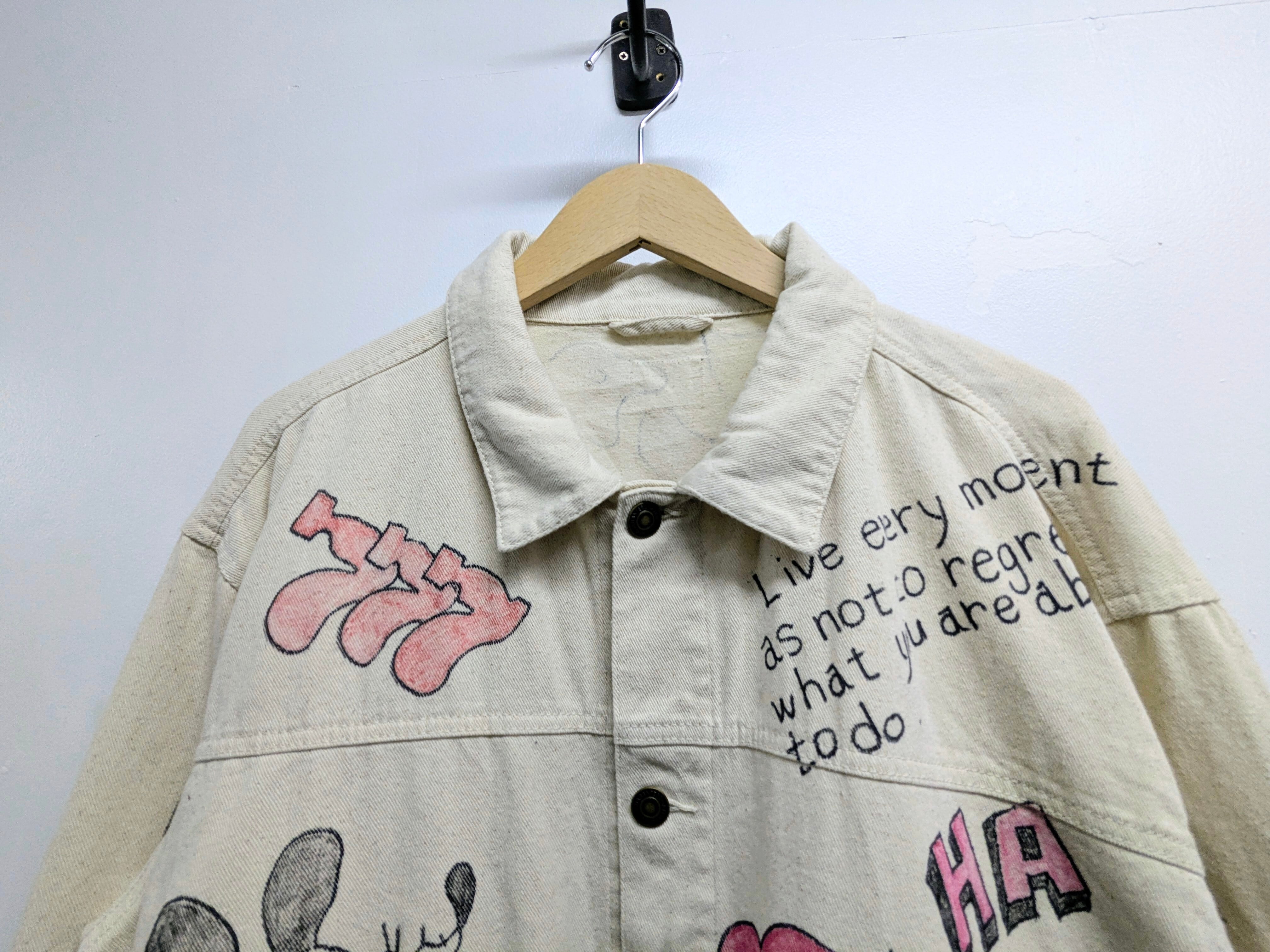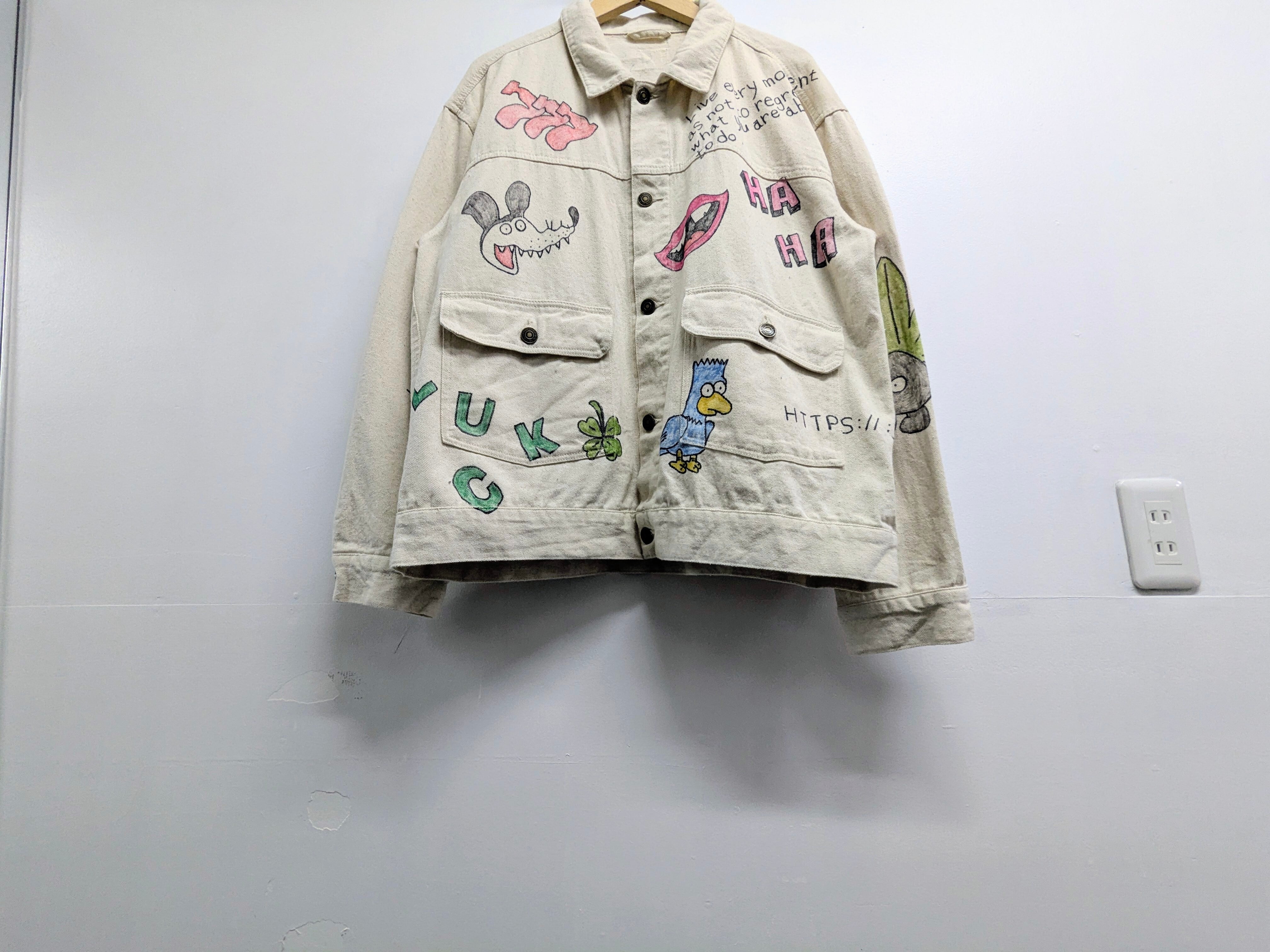ユーズドのホワイトデニムカバーオールを使用しています。メモリアル要素もありつつ、どこか見たことあるようなキャラクターがいたりととても可愛いアイテム。全て手描きのため唯一無二、一点物となります。