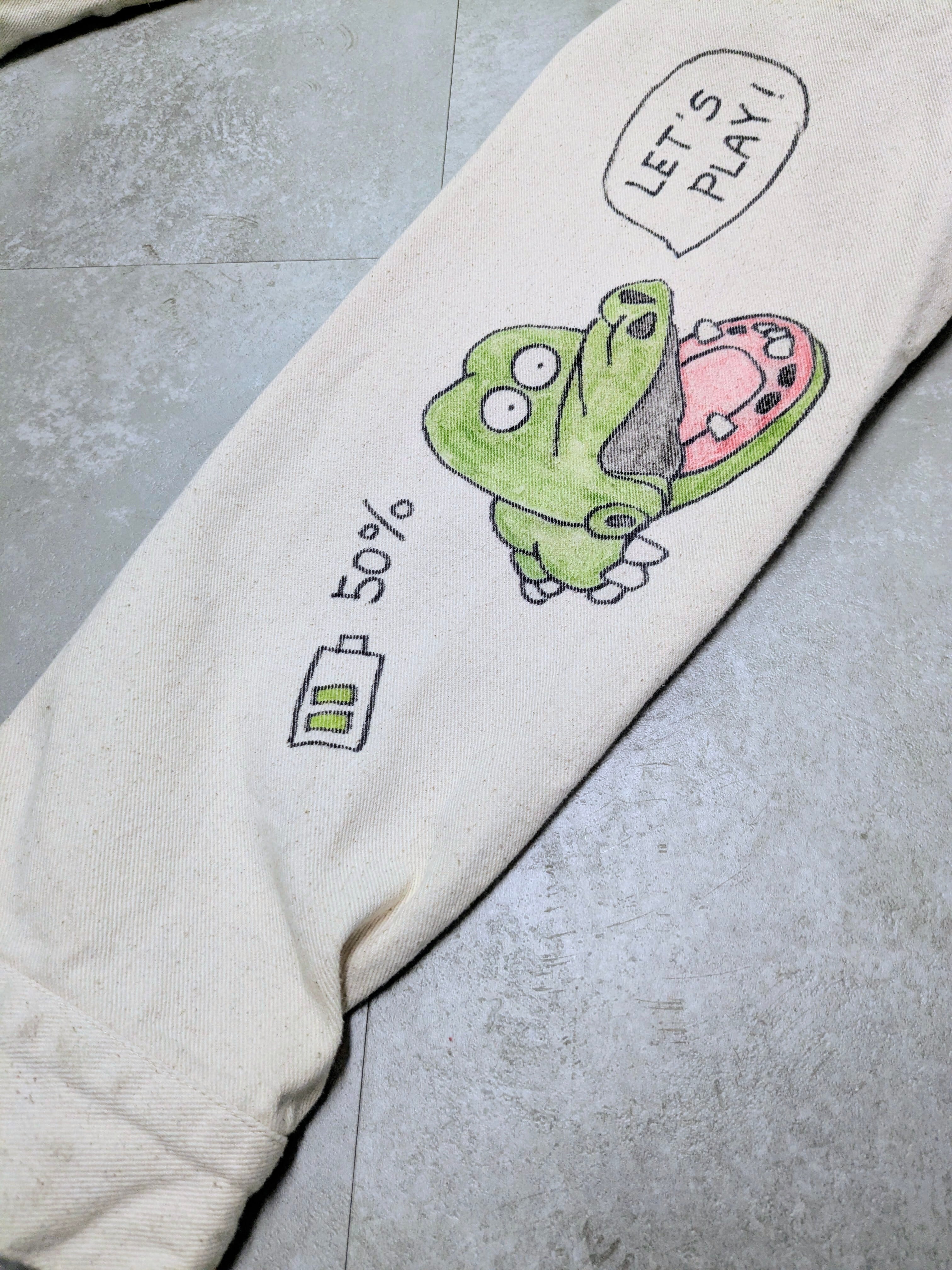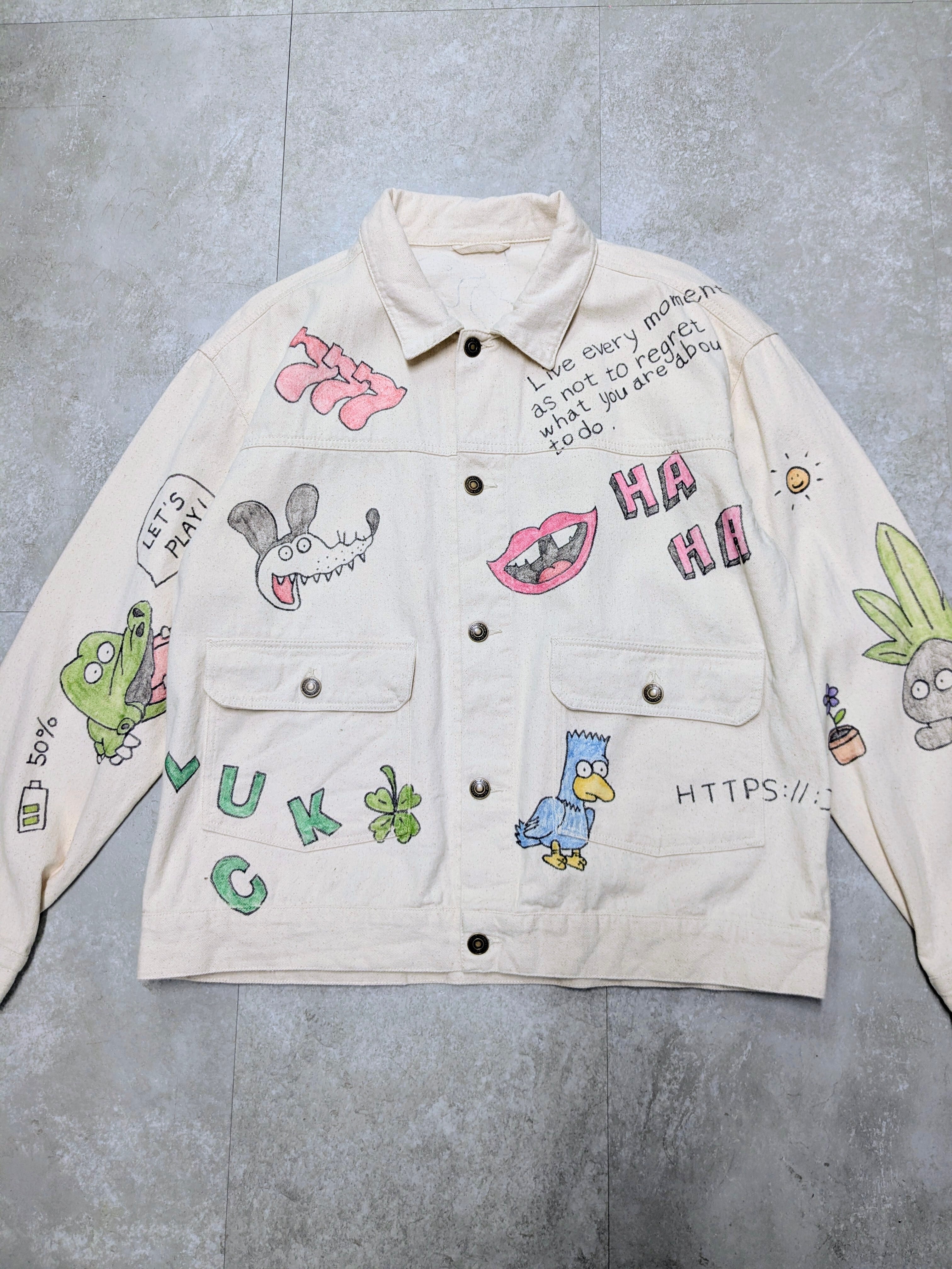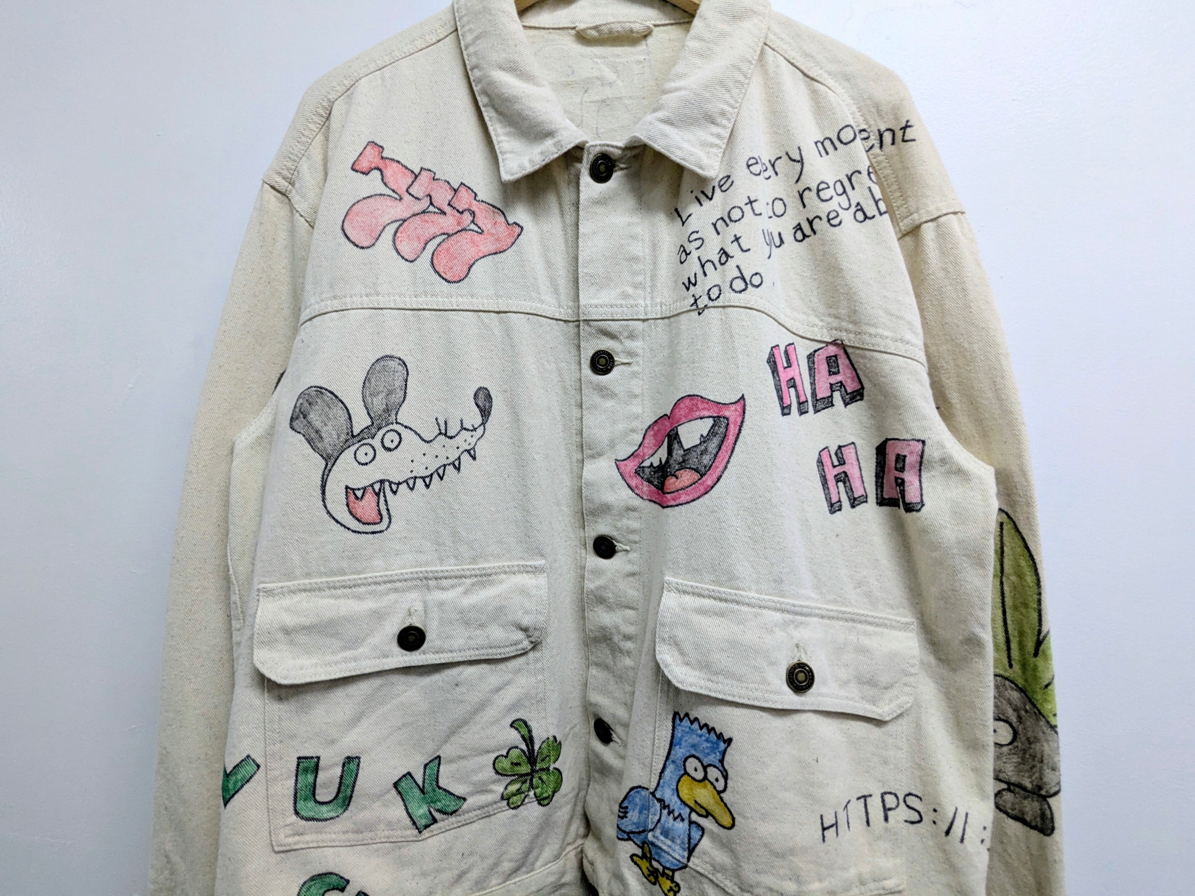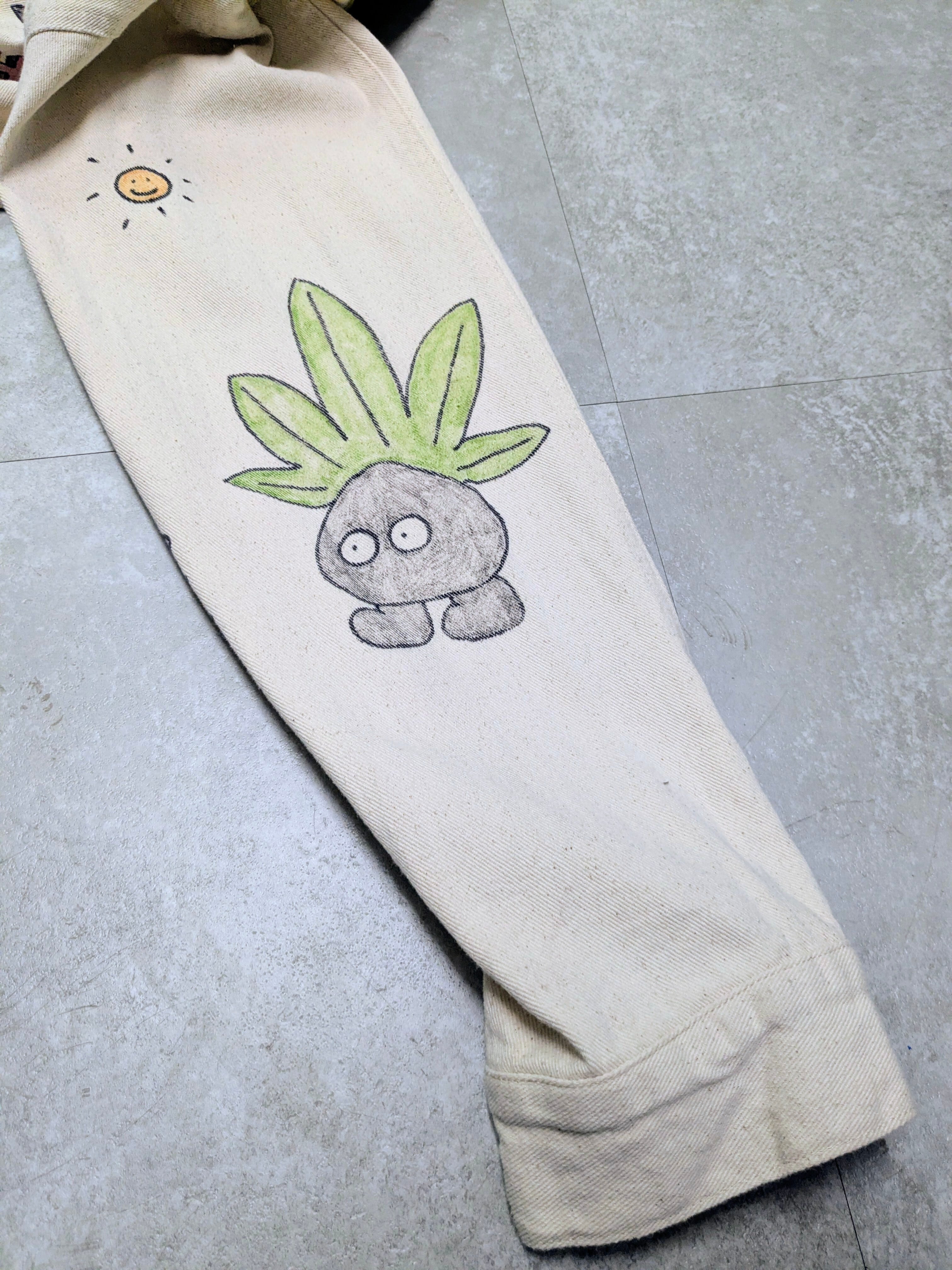 ユーズドのホワイトデニムカバーオールを使用しています。メモリアル要素もありつつ、どこか見たことあるようなキャラクターがいたりととても可愛いアイテム。全て手描きのため唯一無二、一点物となります。