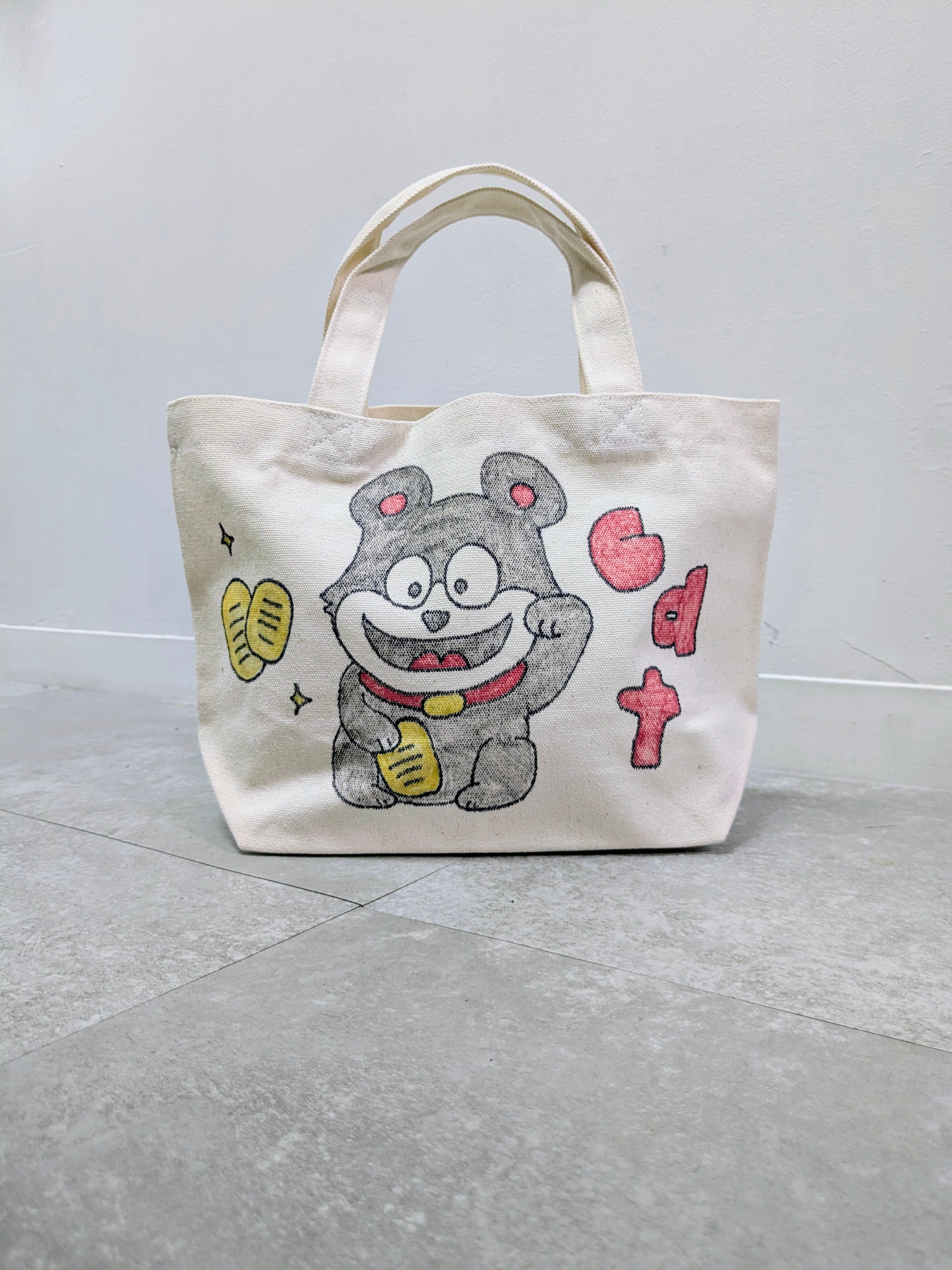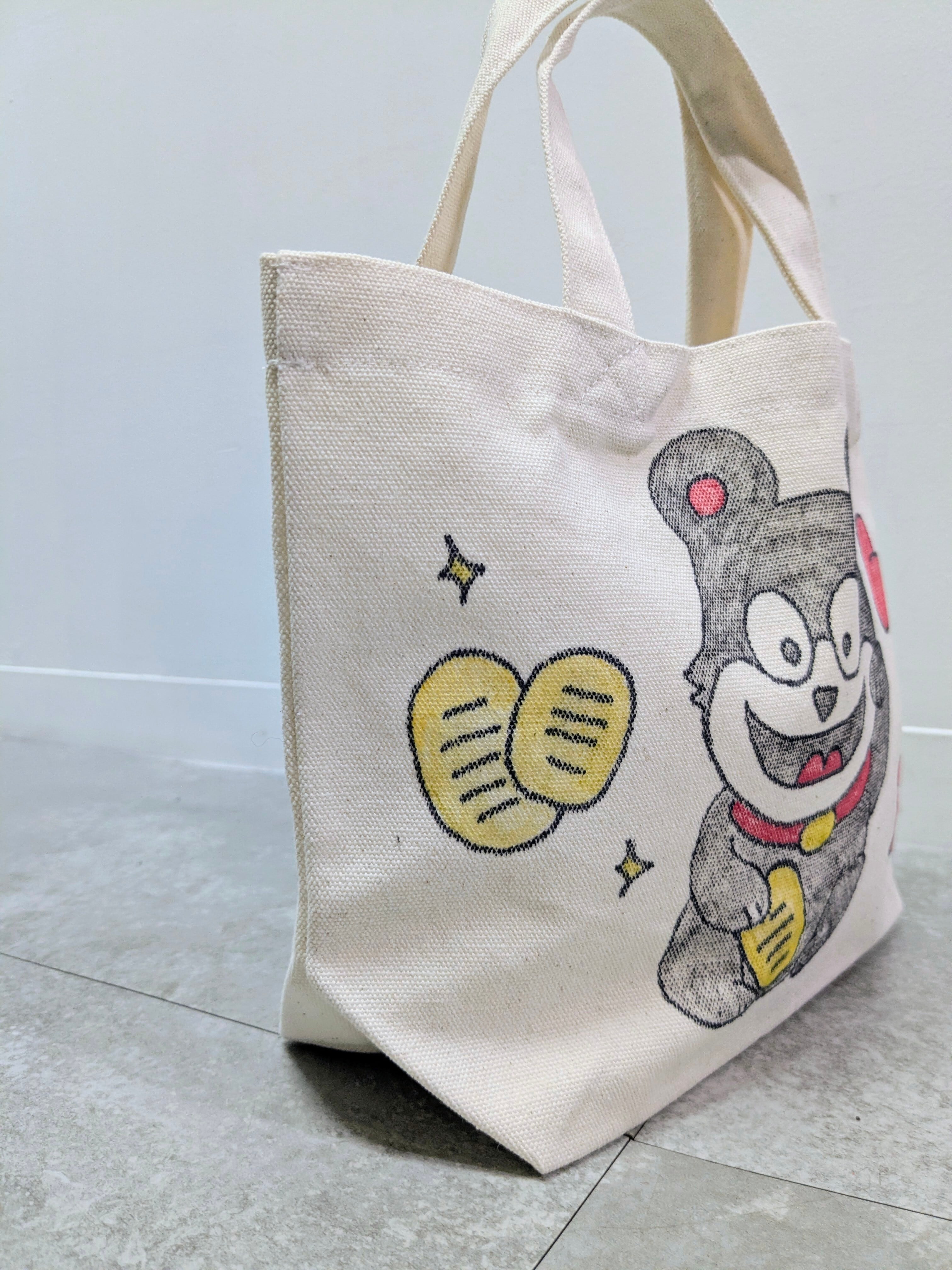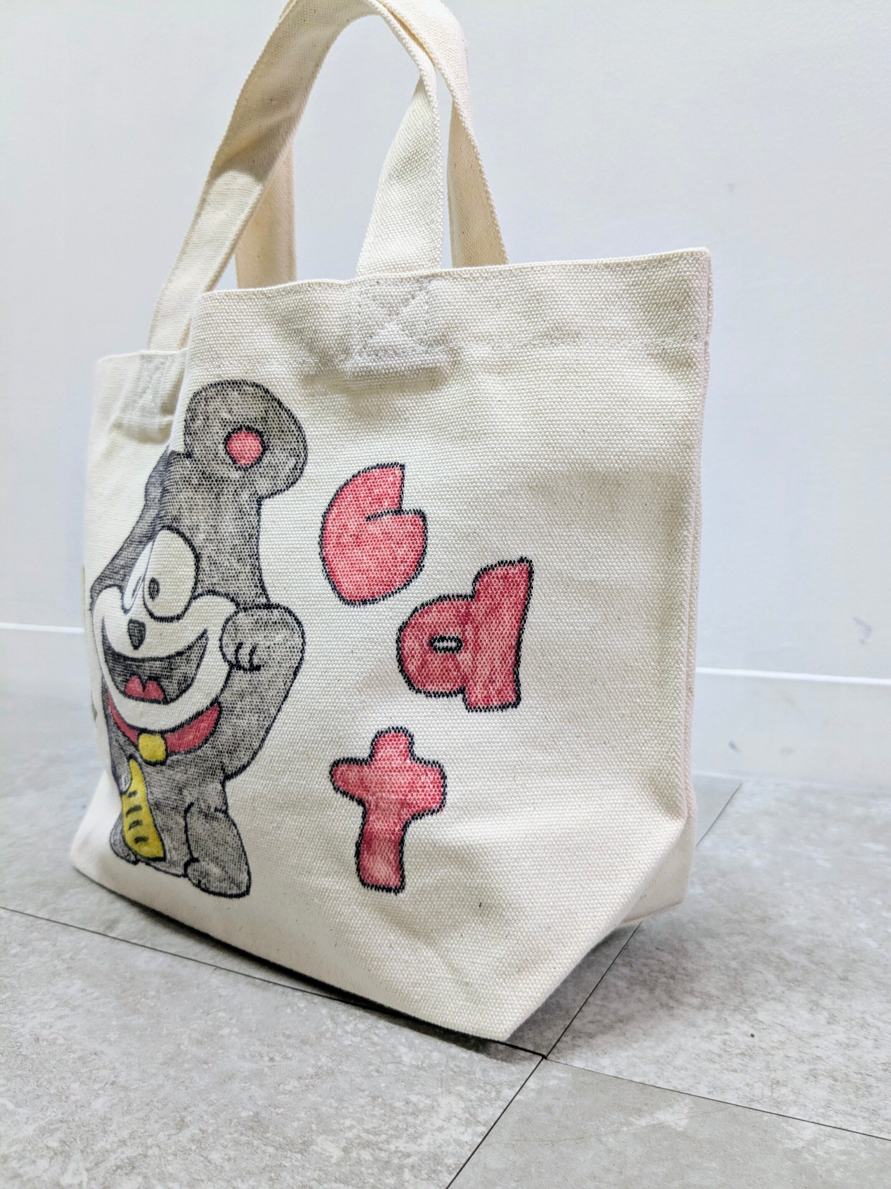 キャンバスのトートバッグにイラストを加えています。メモリアルの要素があり、どこか見たことあるキャラクターがいたりと、とにかく可愛いアイテム。全て手作業になるので、唯一無二の一点物となります。
