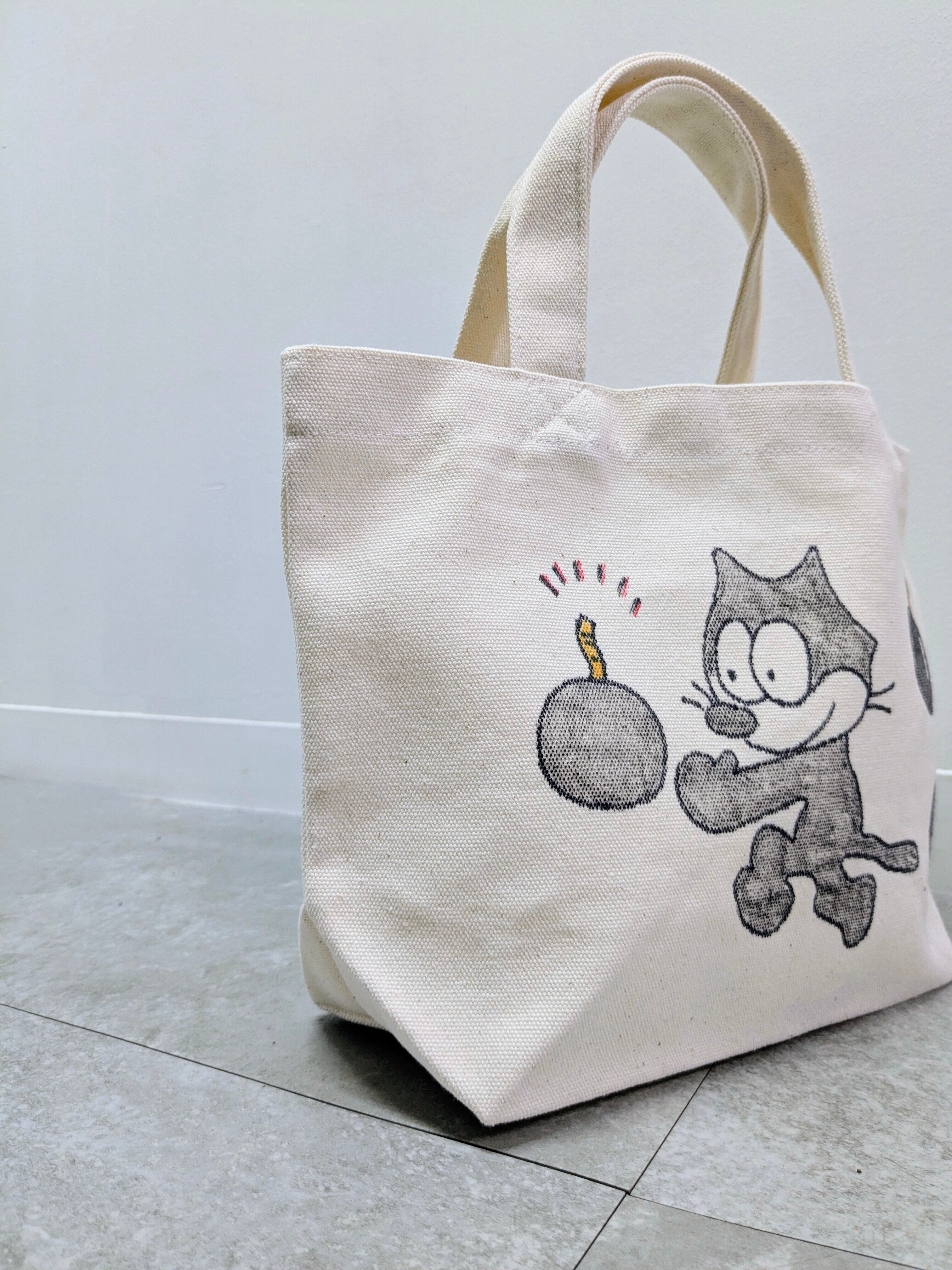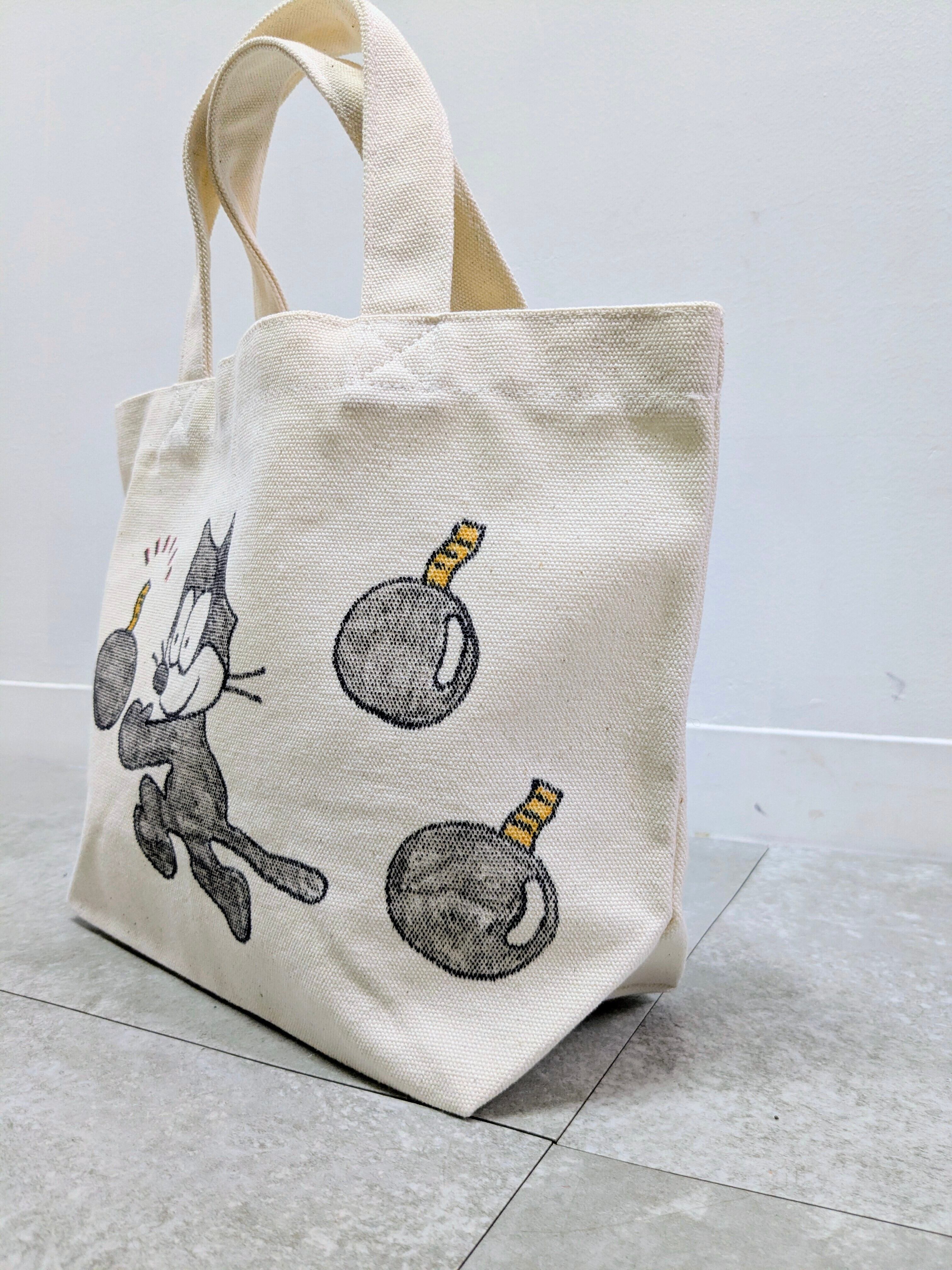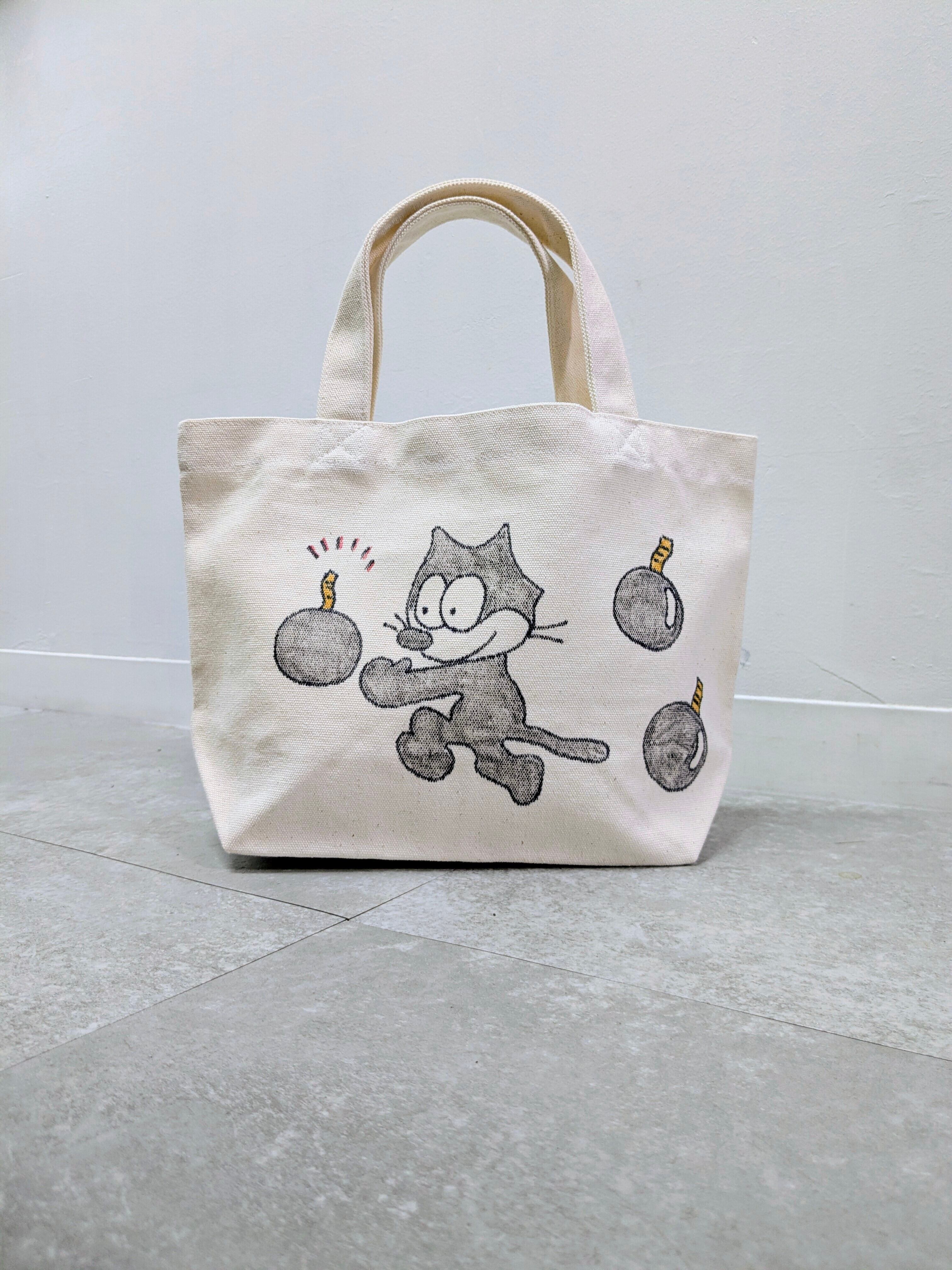 キャンバスのトートバッグにイラストを加えています。メモリアルの要素があり、どこか見たことあるキャラクターがいたりと、とにかく可愛いアイテム。全て手作業になるので、唯一無二の一点物となります。