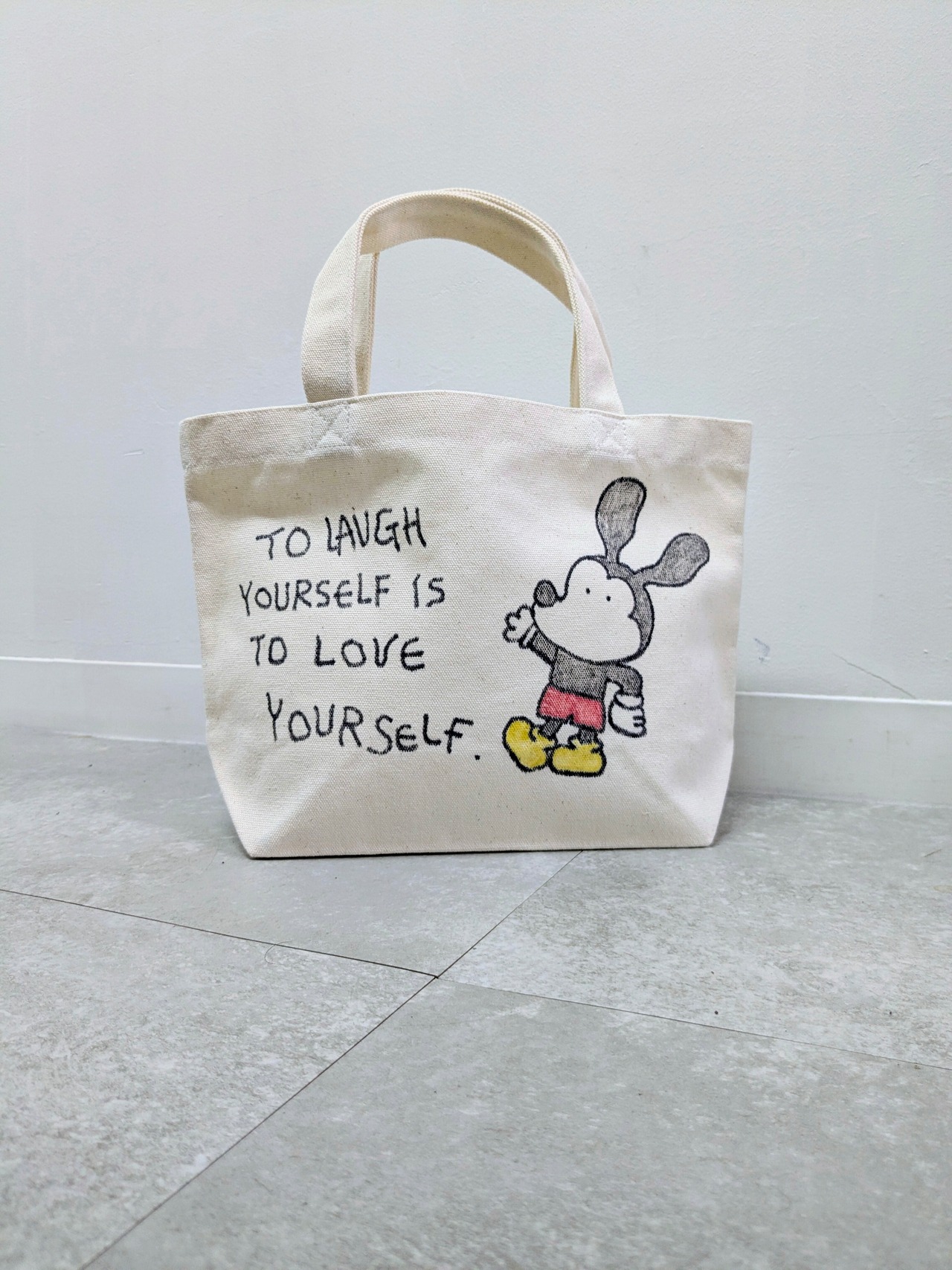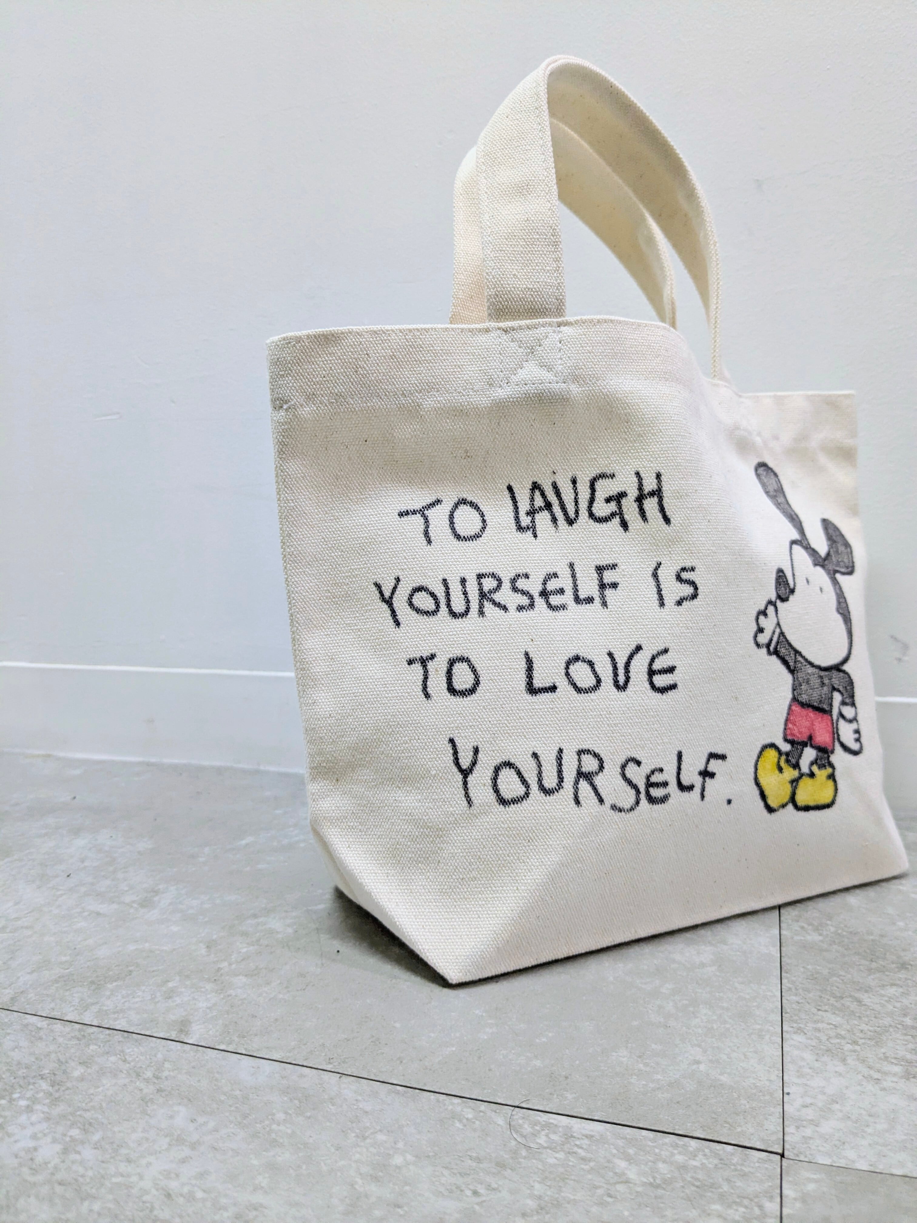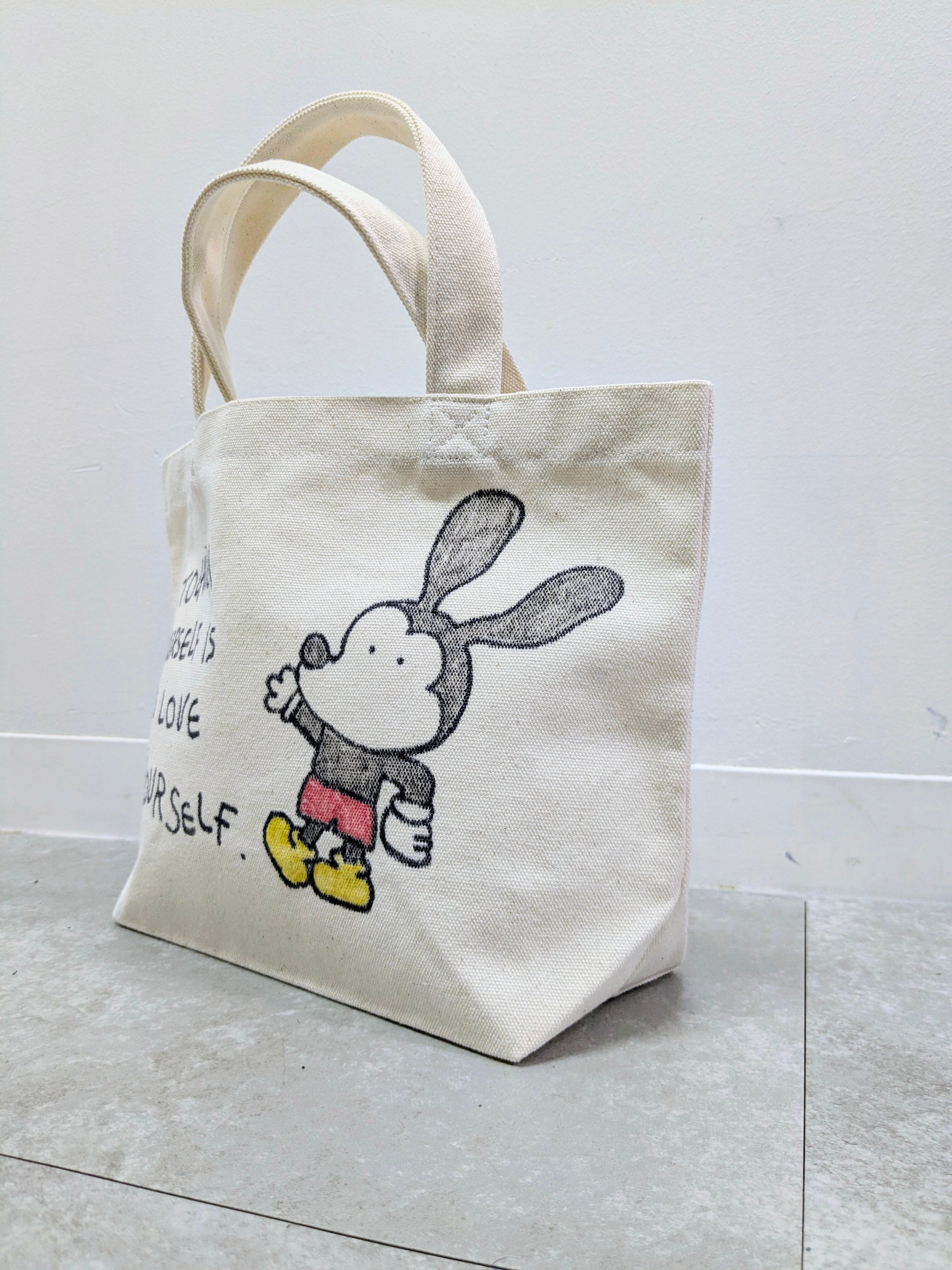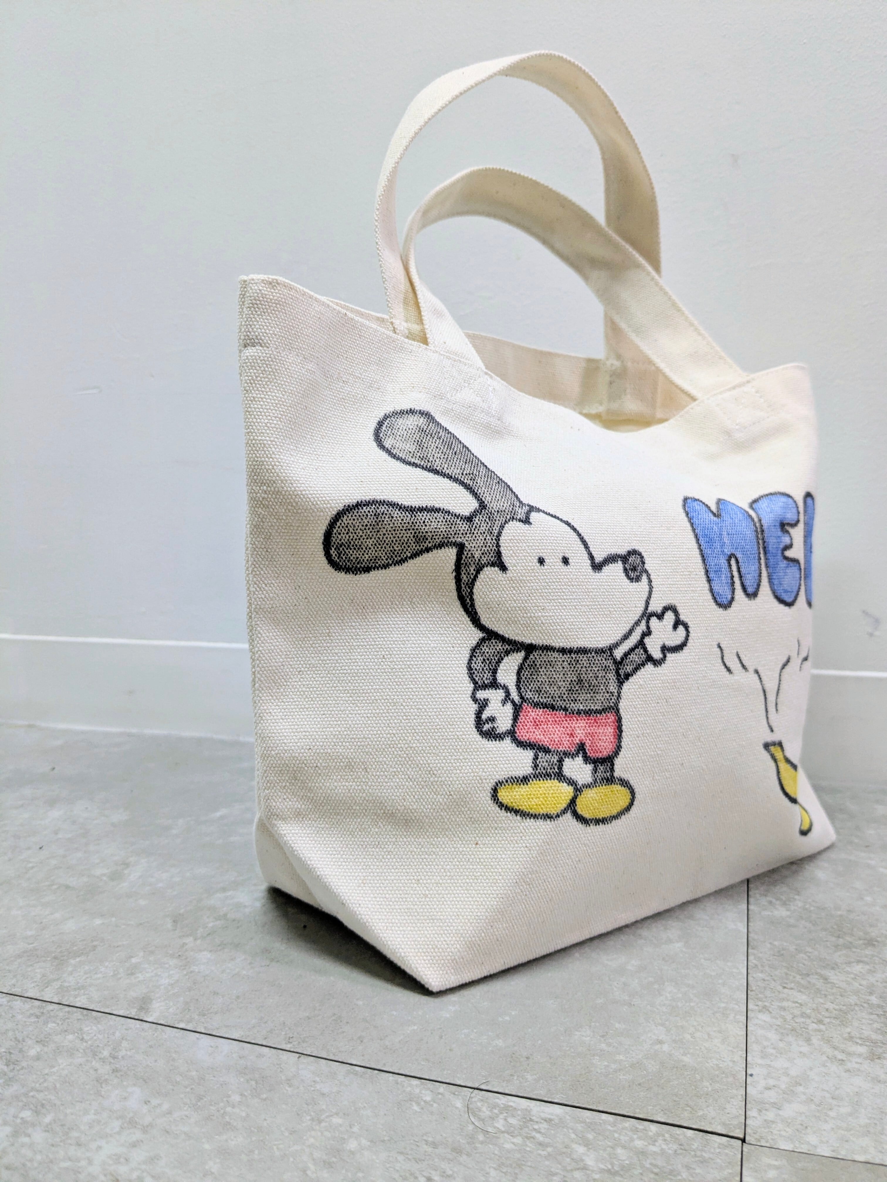 キャンバスのトートバッグにイラストを加えています。メモリアルの要素があり、どこか見たことあるキャラクターがいたりと、とにかく可愛いアイテム。全て手作業になるので、唯一無二の一点物となります。