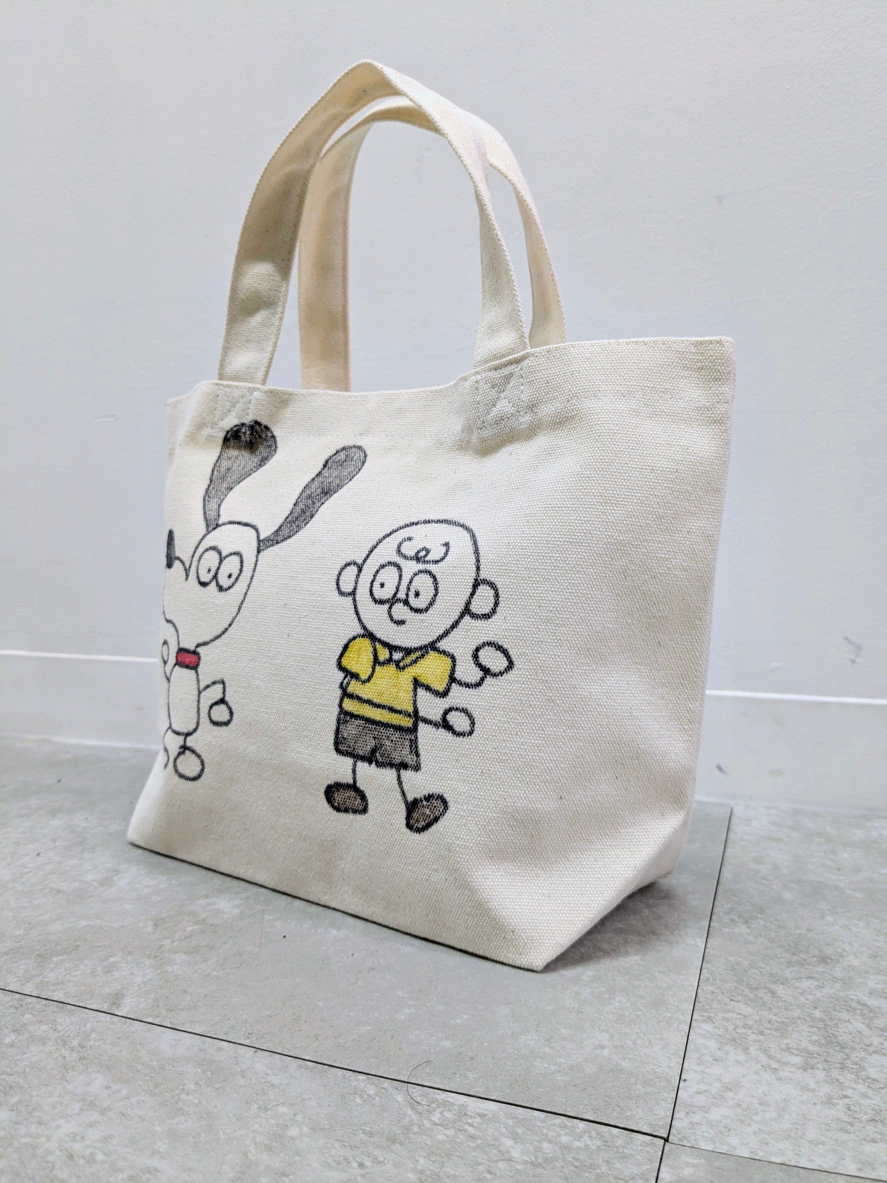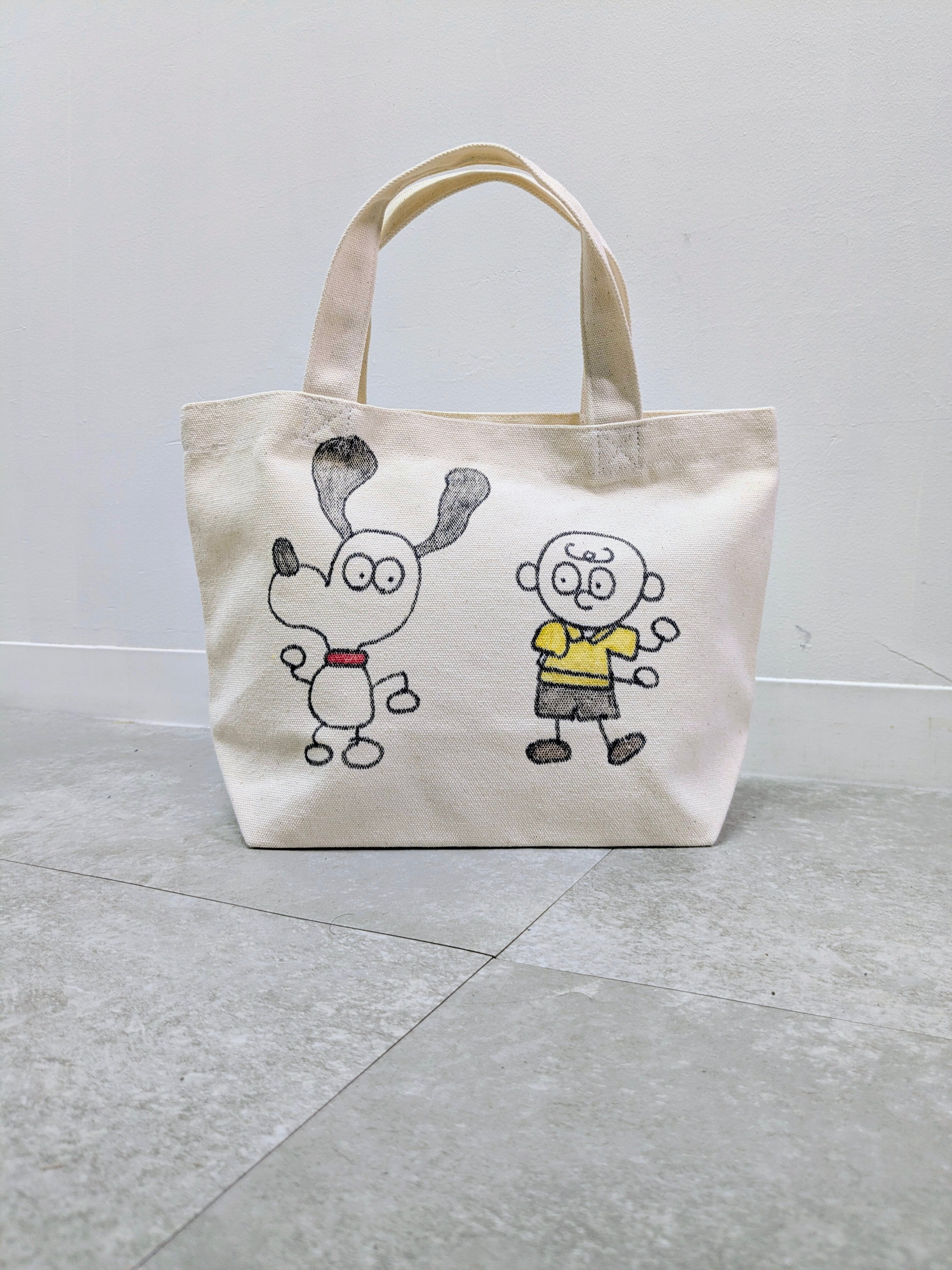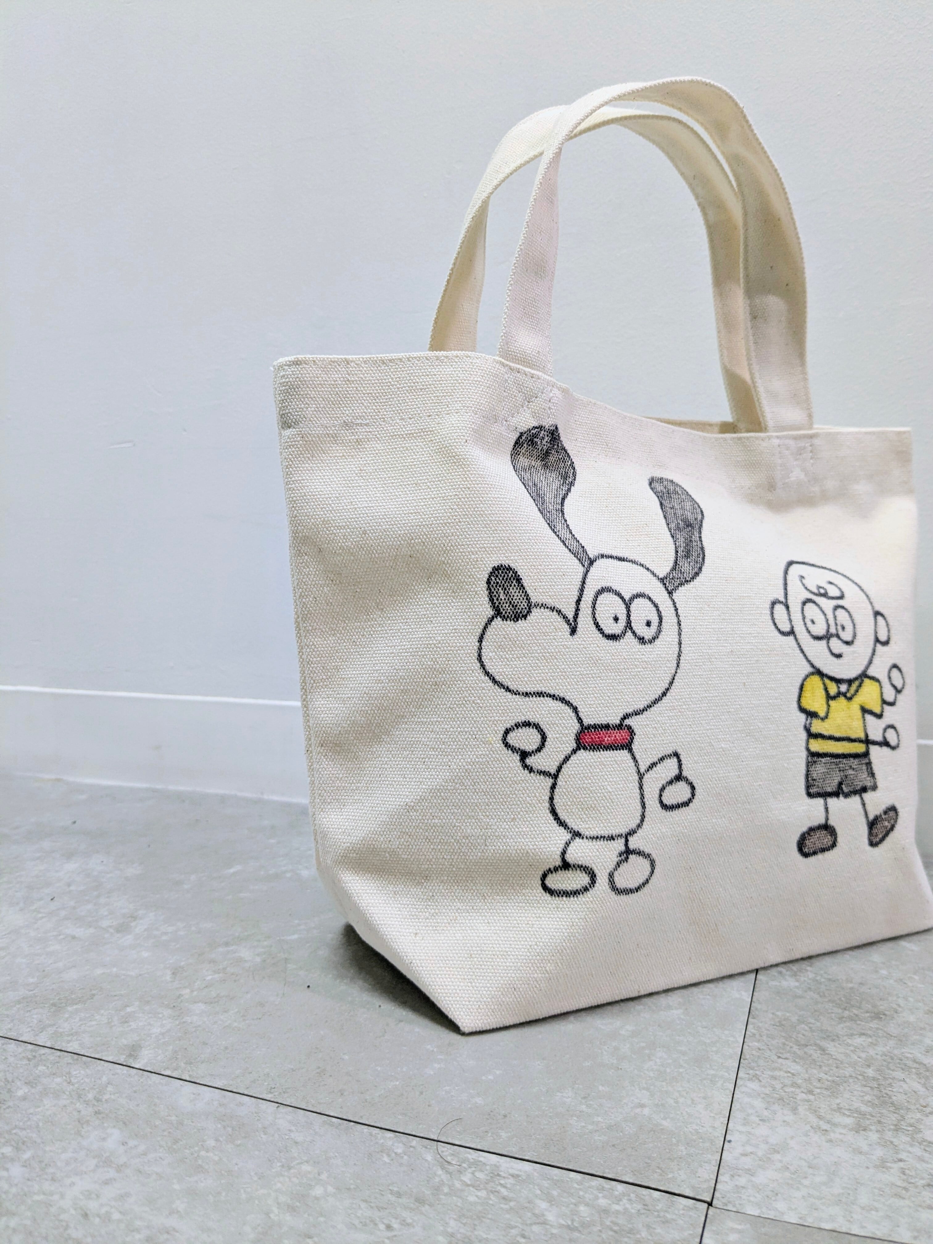 キャンバスのトートバッグにイラストを加えています。メモリアルの要素があり、どこか見たことあるキャラクターがいたりと、とにかく可愛いアイテム。全て手作業になるので、唯一無二の一点物となります。